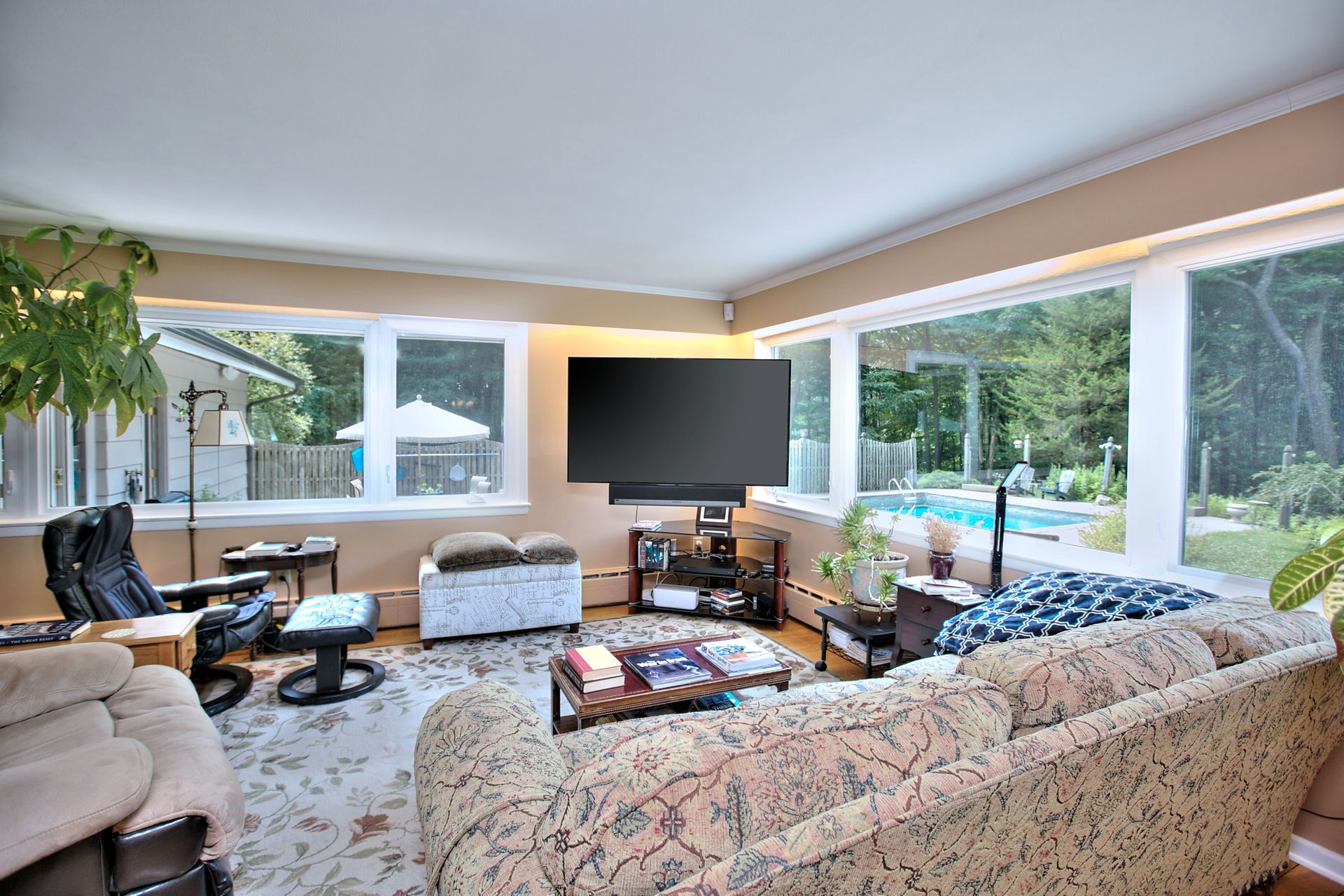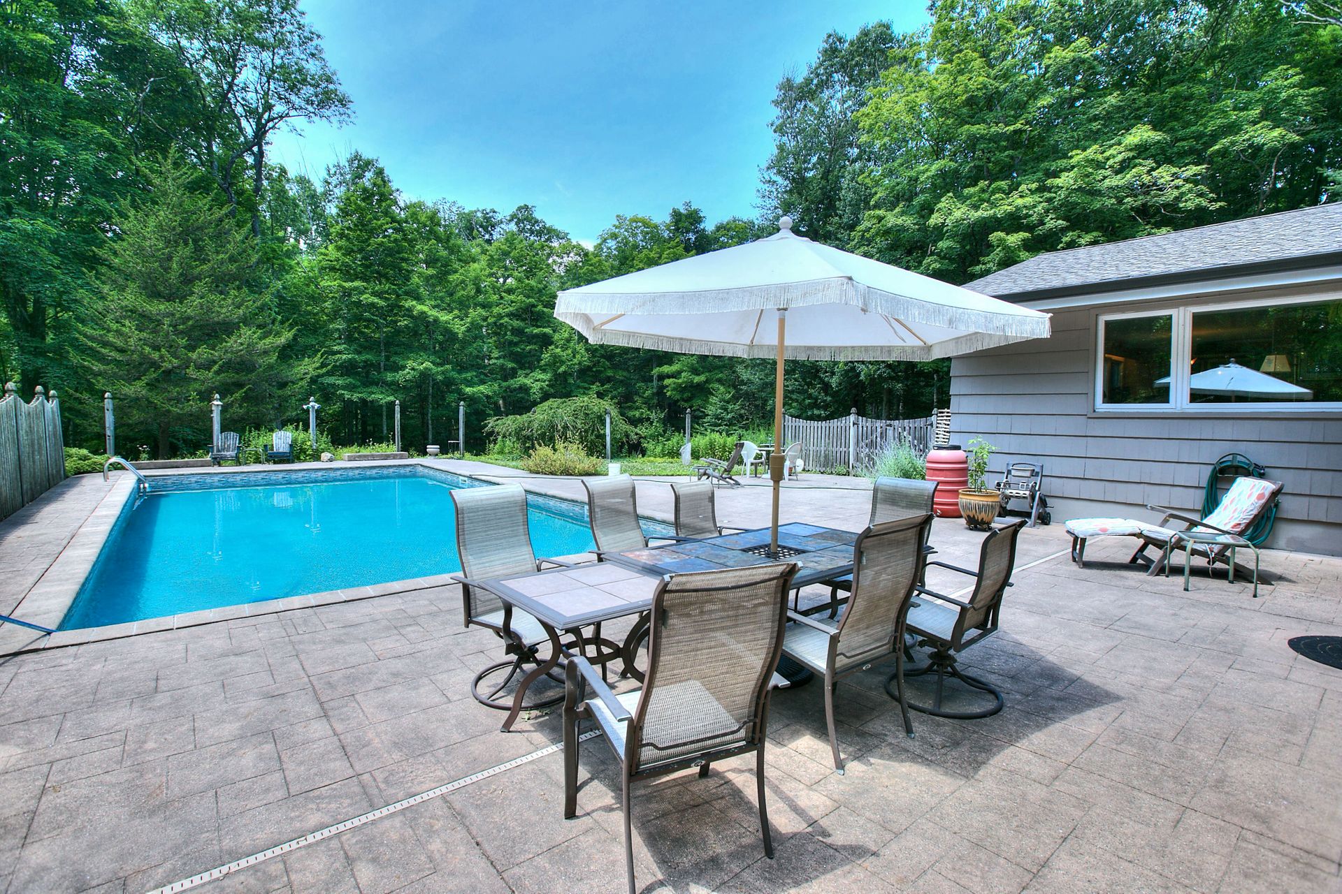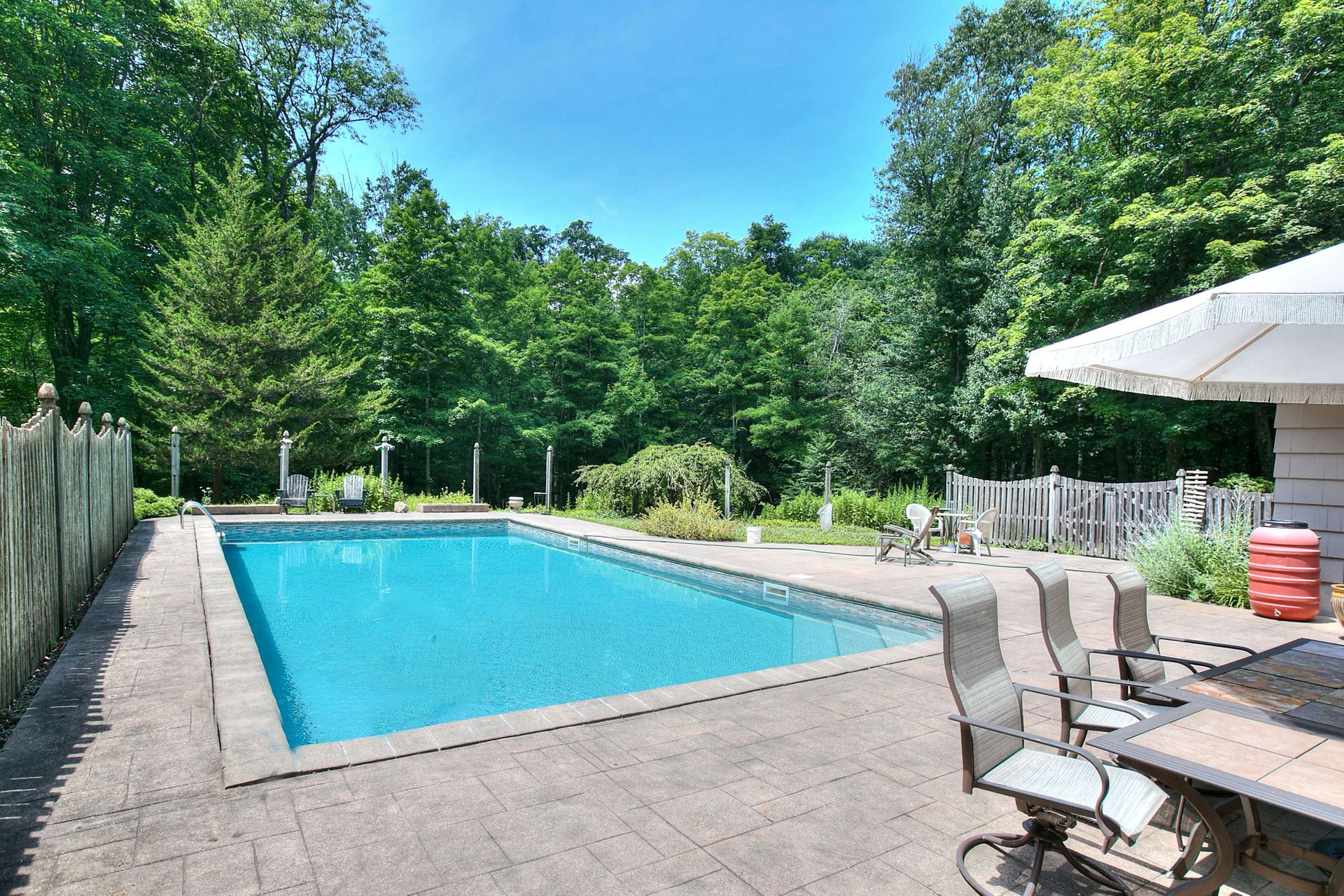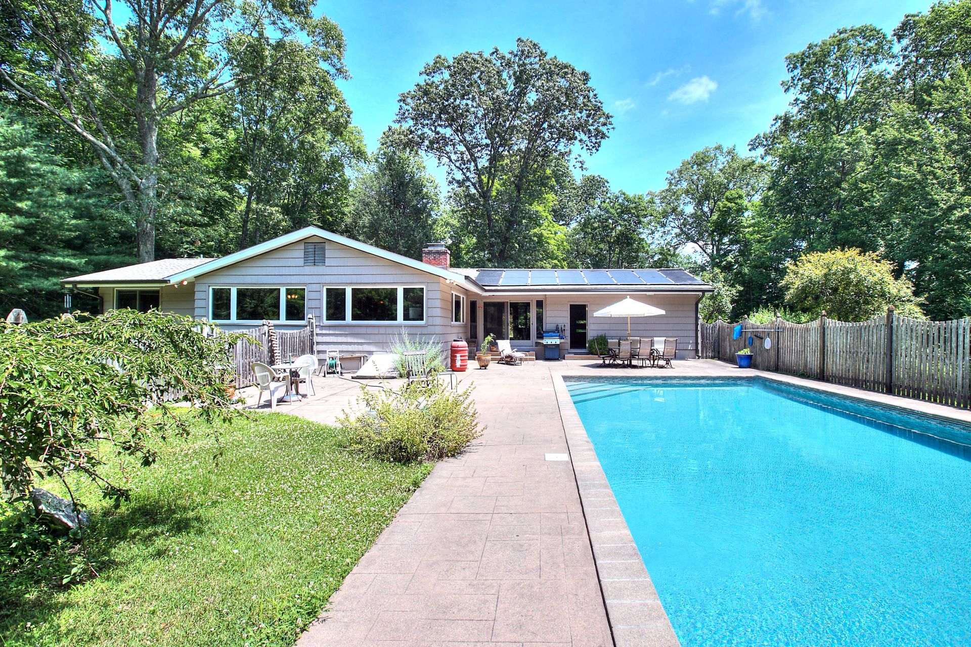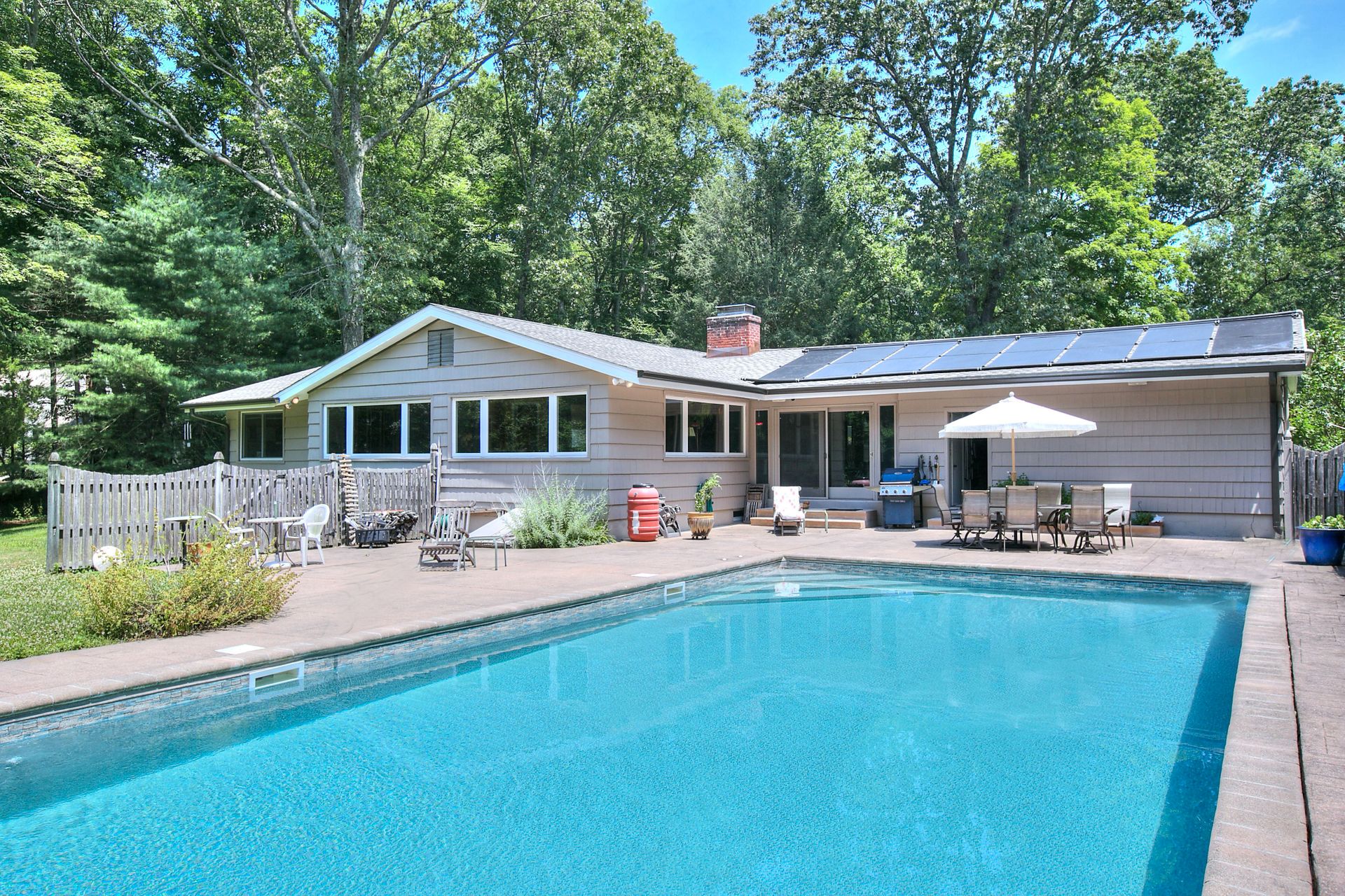 This stunning mid-century ranch-style house is a must-see! With four bedrooms and three bathrooms, this spacious home offers plenty of room. The primary bedroom is conveniently located on the main level, providing easy access and privacy. The open-concept living, dining, and family rooms offer breathtaking views of the natural landscape, making it the ideal place to relax and unwind. The large country eat-in kitchen features plenty of cabinetry and a subzero refrigerator, making meal prep a breeze. The solar-heated in-ground pool is great for sunny days and provides wooded privacy for picnics and parties. The air-conditioned home also features a mudroom, attached two-car garage, and a fourth bedroom with a private entrance and powder room, making it an ideal professional office or guest room. The huge full basement offers endless possibilities for expansion, including a movie theater, recreation room, or exercise room. Located in the desirable Aspetuck neighborhood of lower Easton, this home is just minutes from Fairfield, Westport, trains, restaurants, shops, and beaches where Easton residents can purchase a parking sticker to the local town beaches and enjoy all of their year-round events. The property is set back by a circular driveway behind a beautiful stone wall on a designated Scenic Road, providing a serene and peaceful environment. Don't miss out on this incredible opportunity to own a piece of paradise in a highly-rated, award-winning school system.