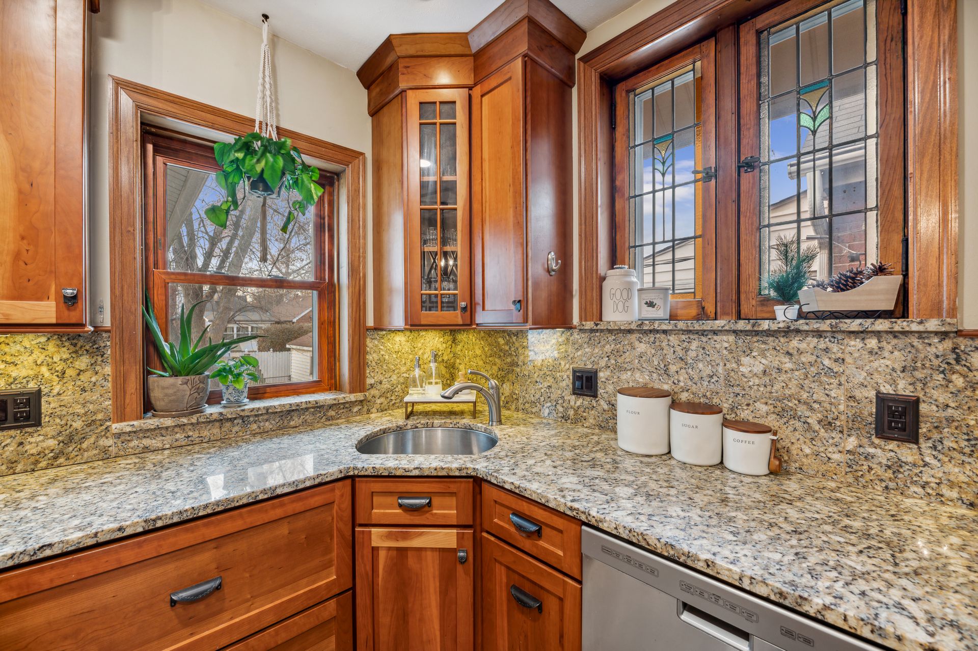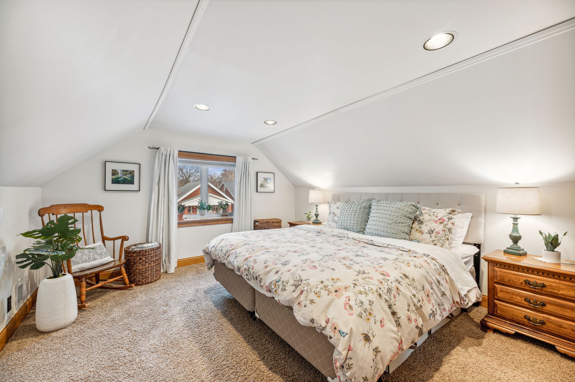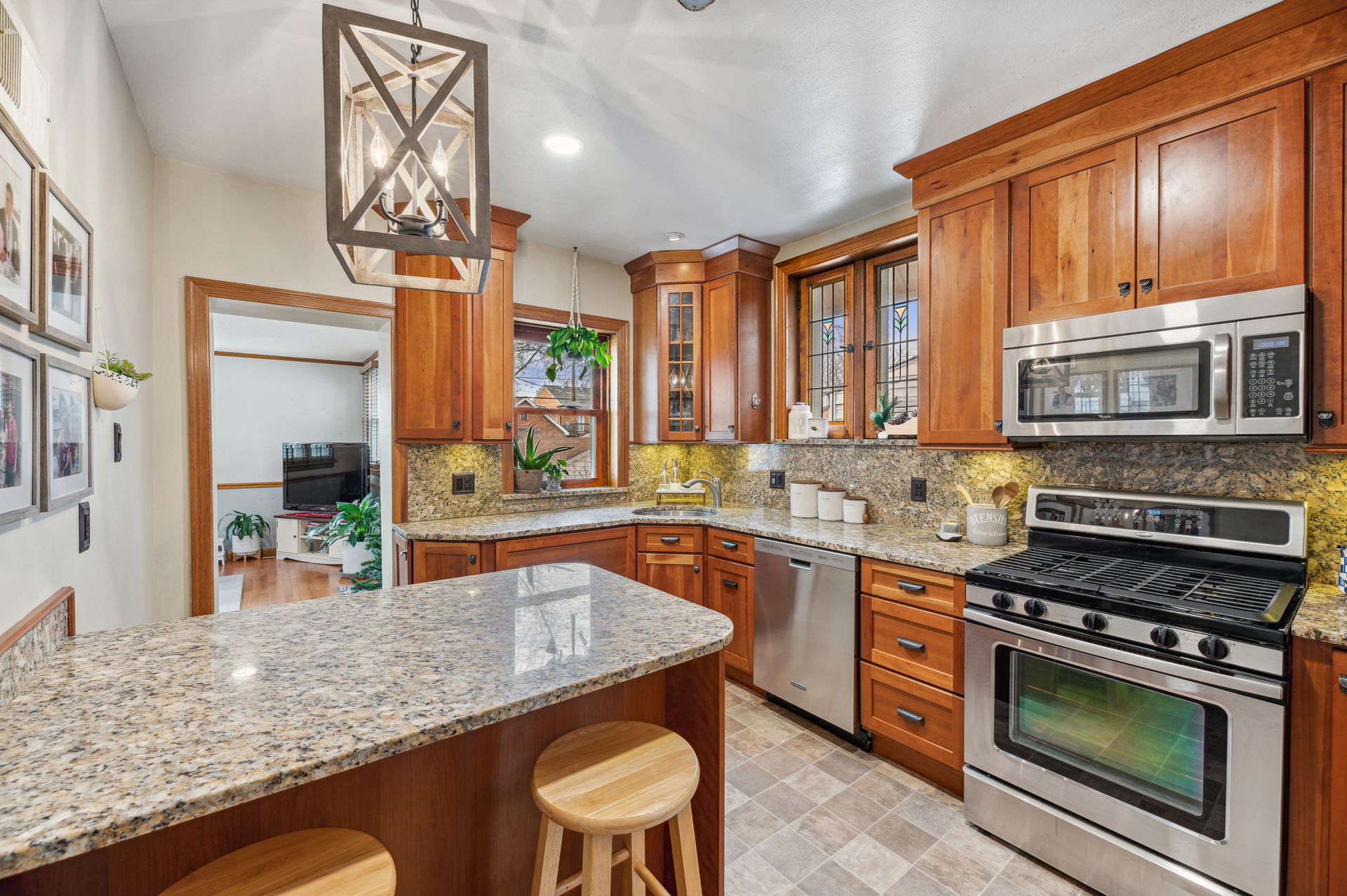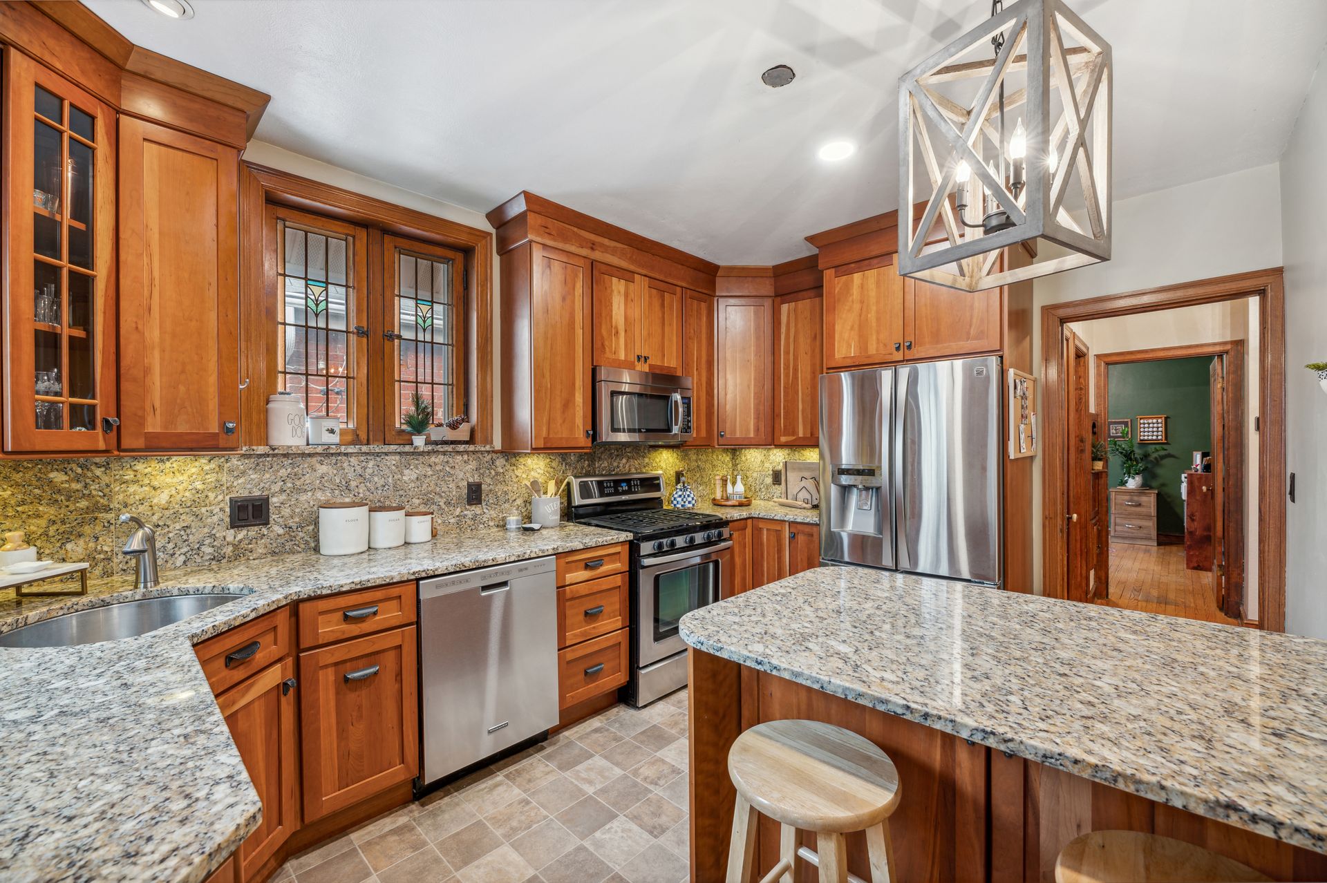 Renovated four bedroom, two bath, 1.5-story charmer in move-in condition in a sought-after location and complete with the Home Protection Plan for the buyer! Updates include a center island granite kitchen with stainless appliances, remodeled baths, a newer roof, fresh interior paint including fireplace, new light fixtures and recessed lights, new wood floor in the upstairs bedroom, a new brick patio, and new wood fencing on two sides in the level back yard. Other amenities feature stained glass windows, a skylight, a cedar-lined closet in the main floor bedroom, and a walkout lower level with two finished rooms with updated vinyl flooring. Attractive floor plan with two bedrooms and one bath on both the first and second floors. Super size, condition, and value!