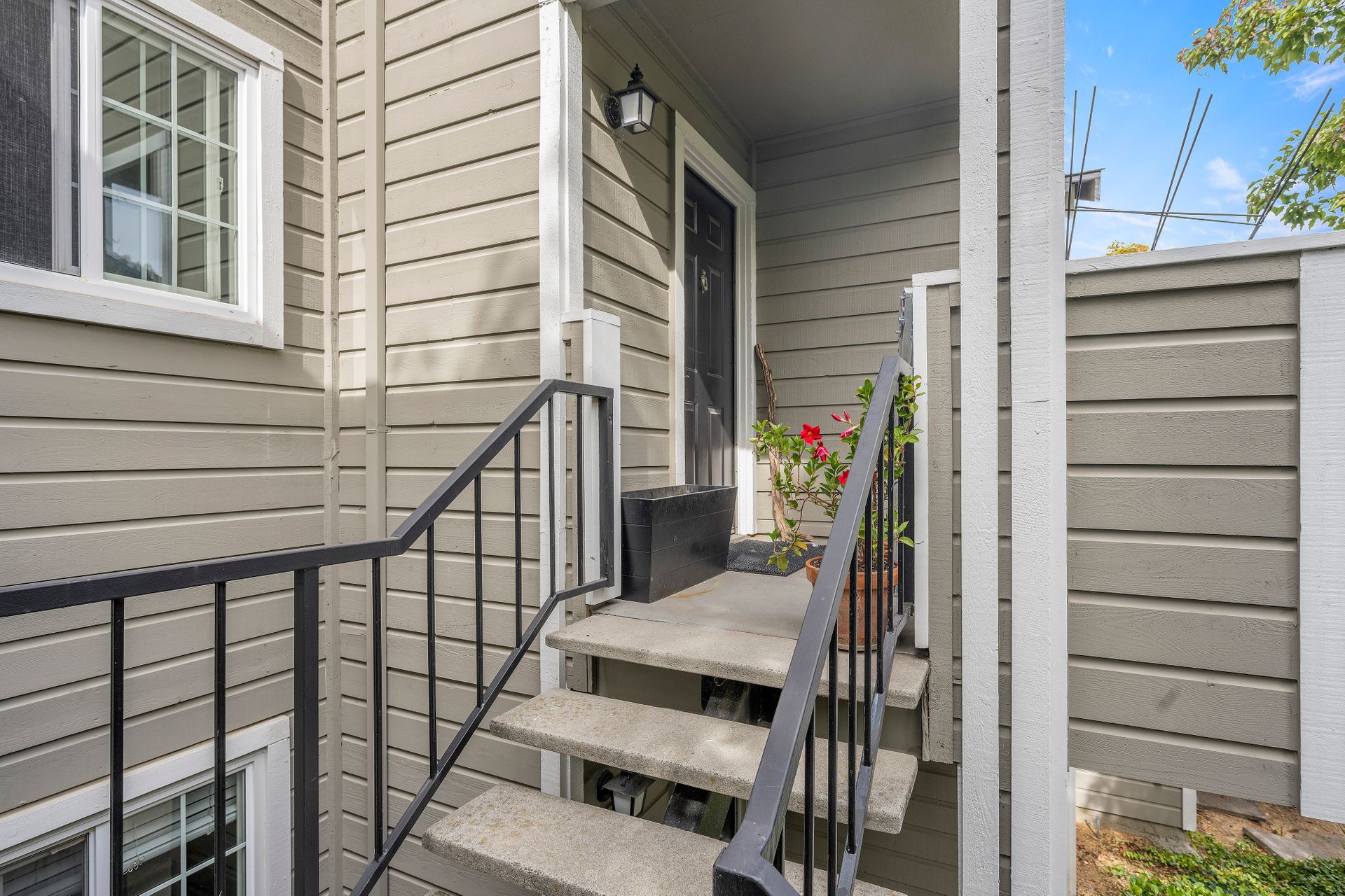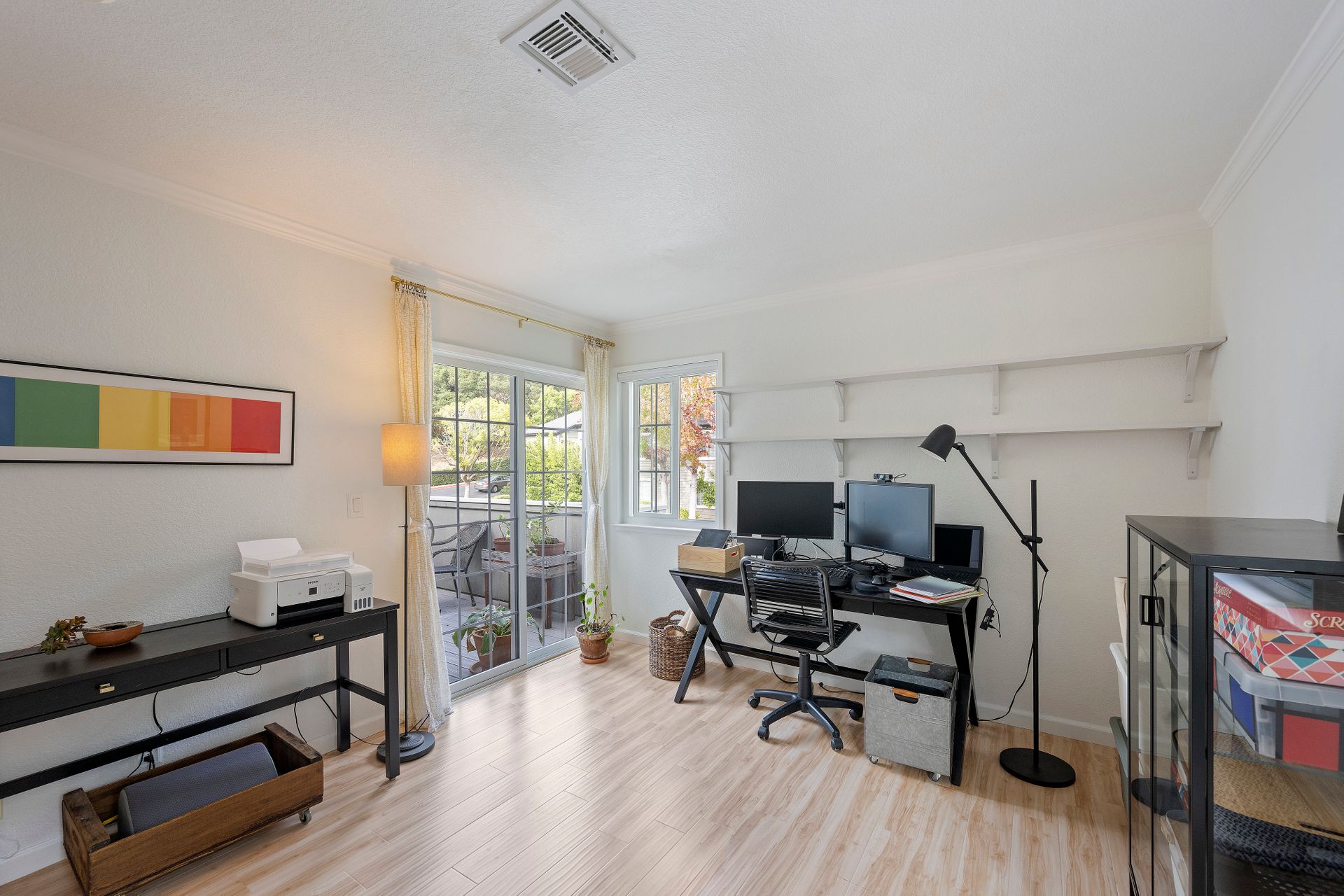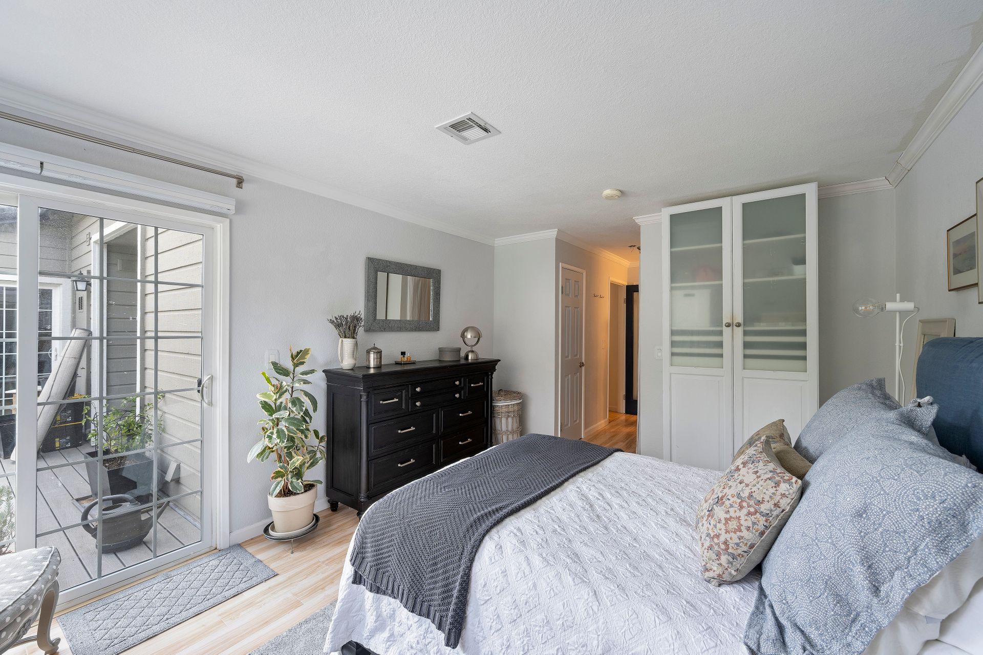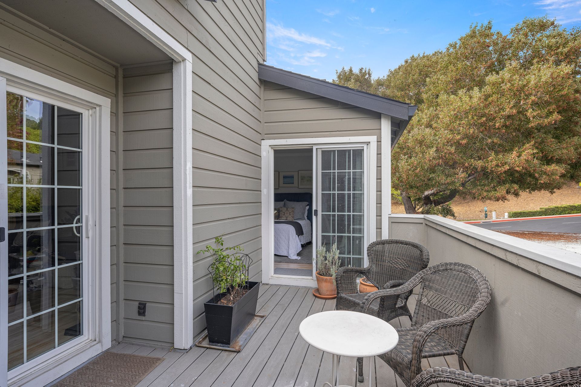 The laundry room is thoughtfully equipped with a top-of-the-line washer and dryer and ample storage space for all your needs. Architectural brilliance shines through with three sliding doors adorned with divided lites, providing exclusive access to a sprawling patio for the main bedroom, living room and guest bedroom.
