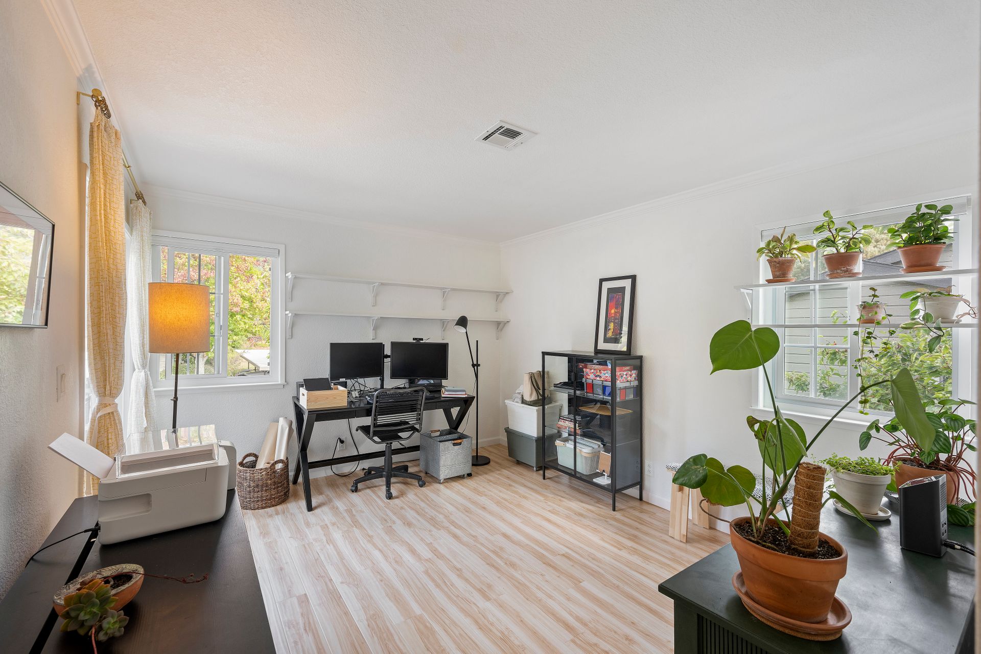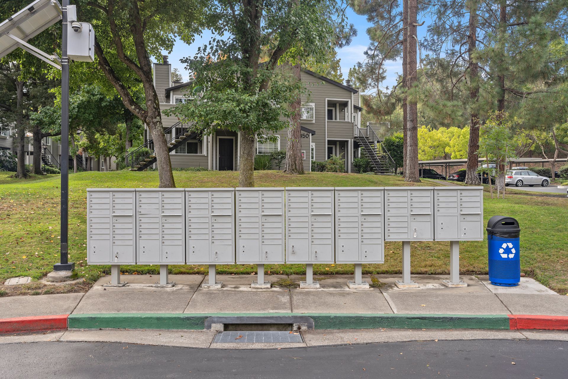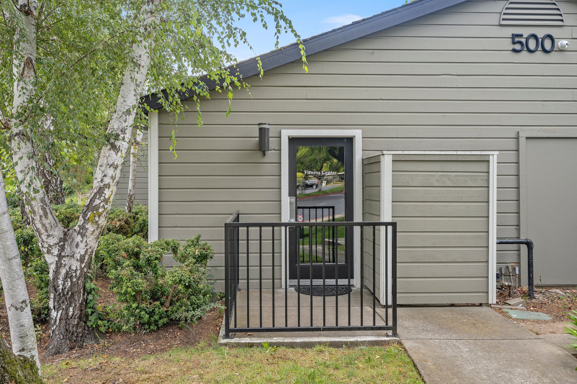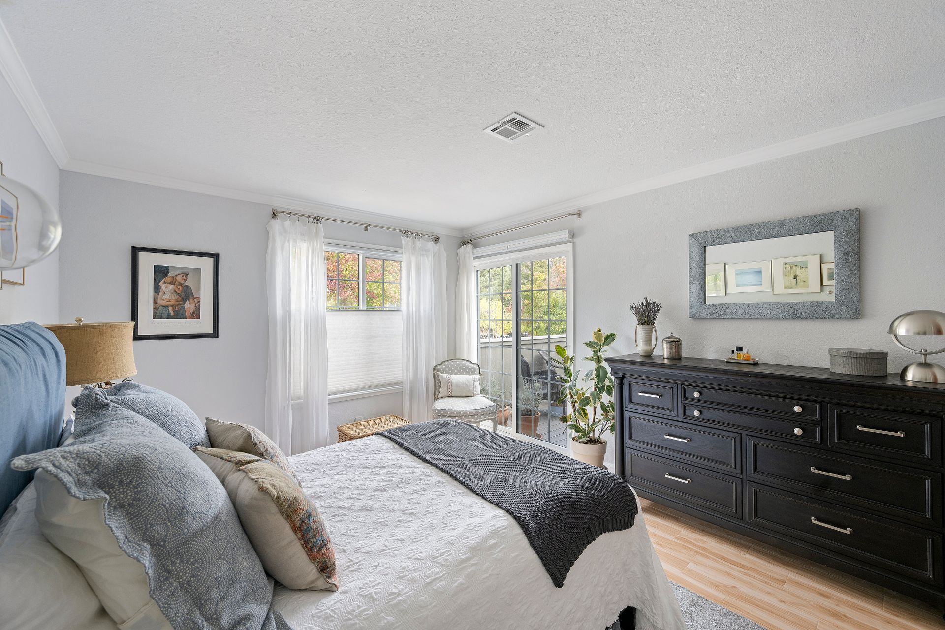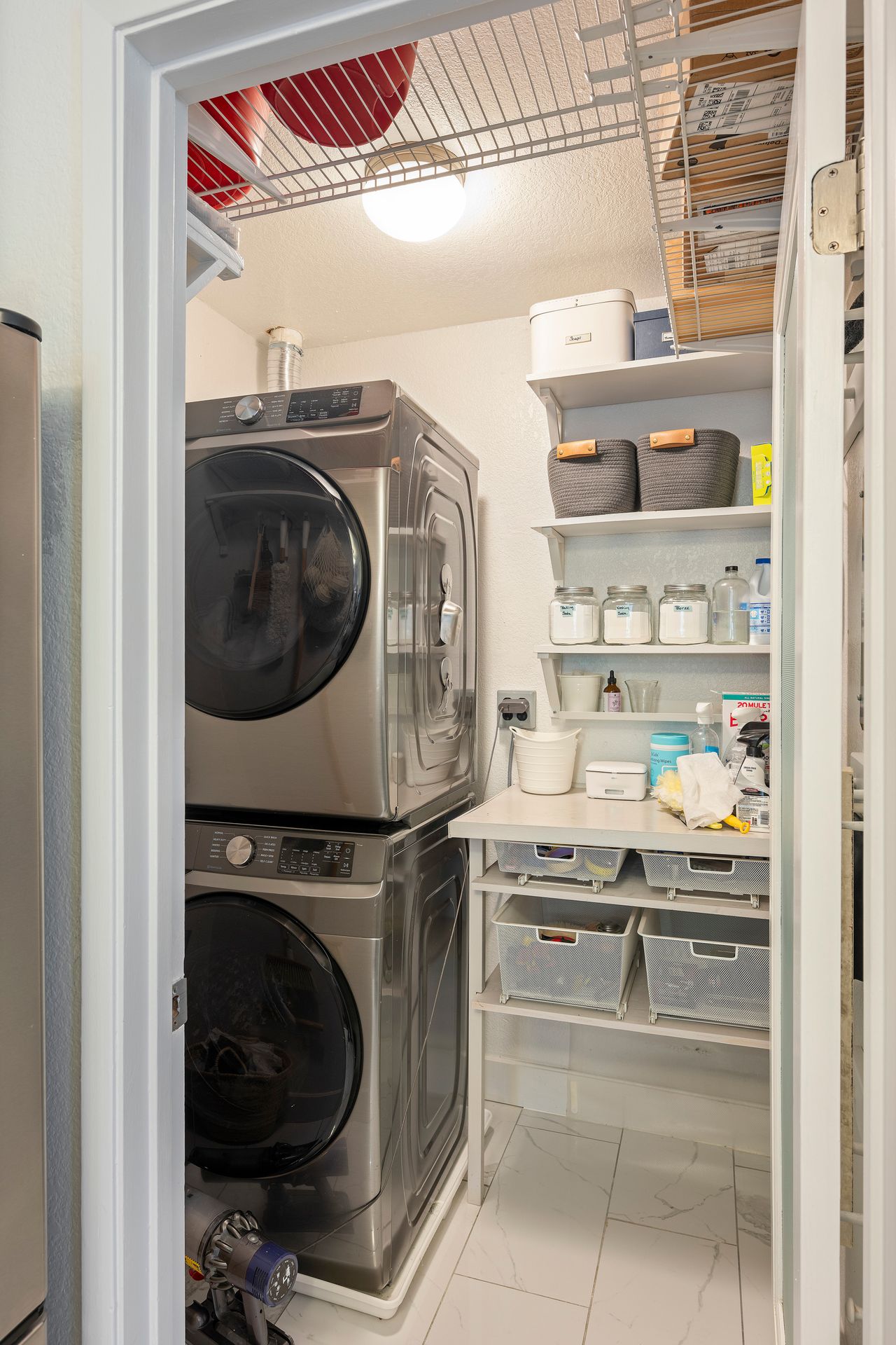The laundry room is thoughtfully equipped with a top-of-the-line washer and dryer and ample storage space for all your needs. Architectural brilliance shines through with three sliding doors adorned with divided lites, providing exclusive access to a sprawling patio for the main bedroom, living room and guest bedroom.