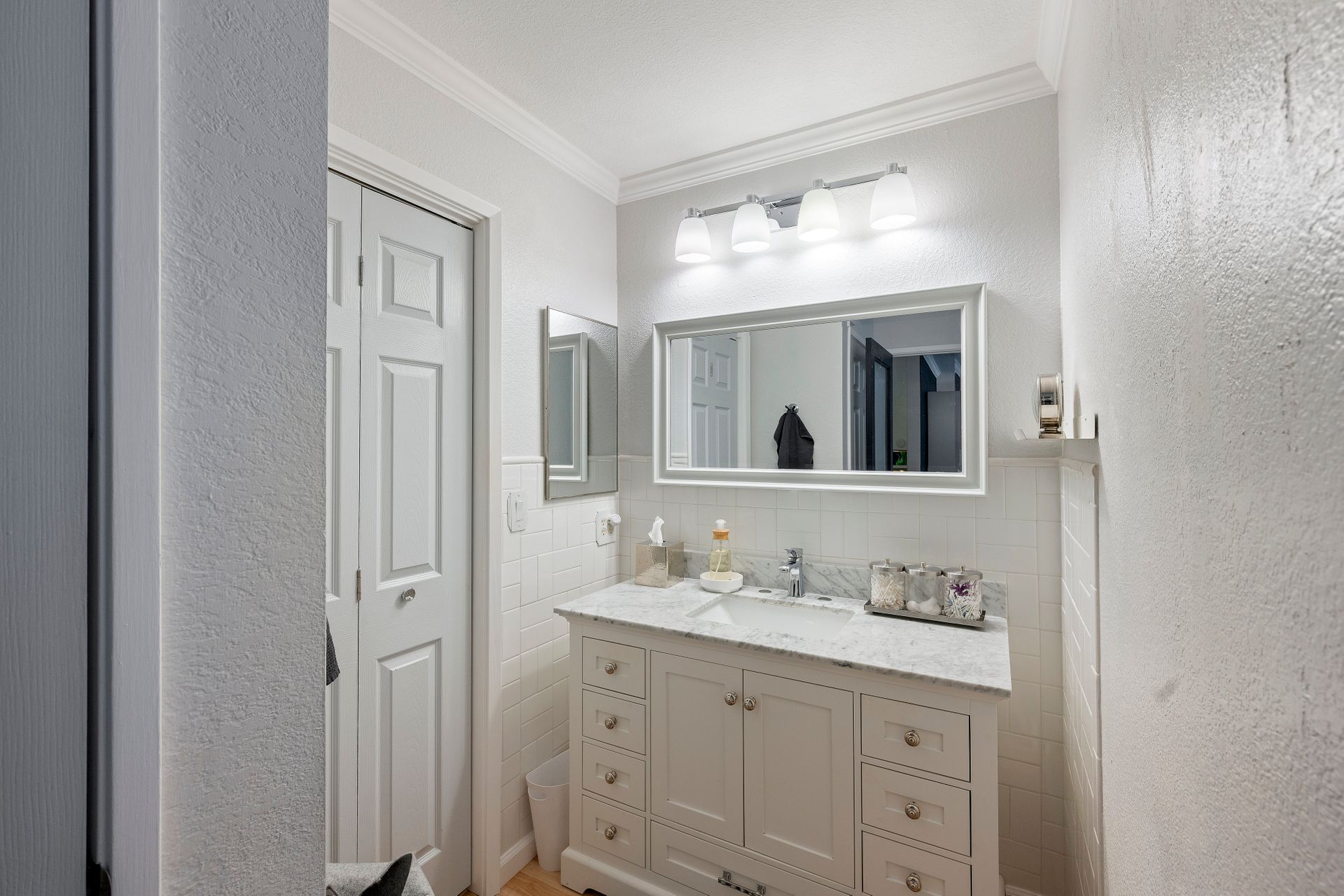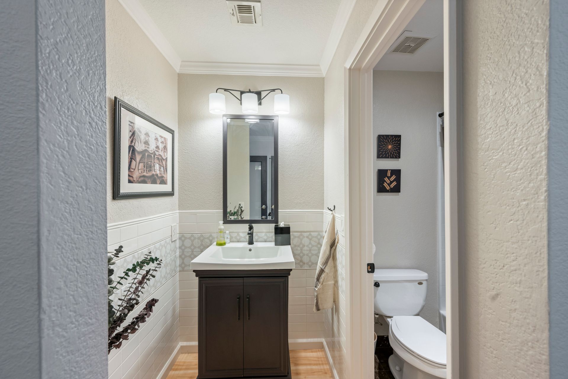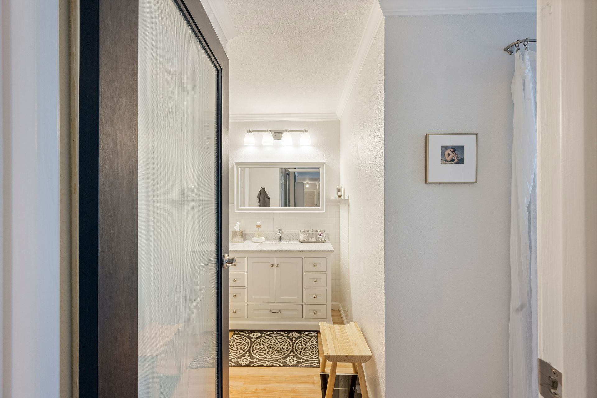 This beautiful home features not one but two primary suites. Each bedroom can be accessed through elegant, frosted glass doors. These private retreats are designed to indulge your senses, with expansive walk-in closets and luxurious en suite bathrooms. One of the bedrooms boasts a captivating marble vanity countertop, making your daily rituals feel like sheer luxury.