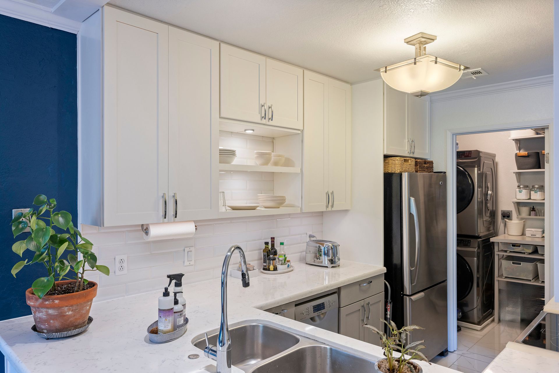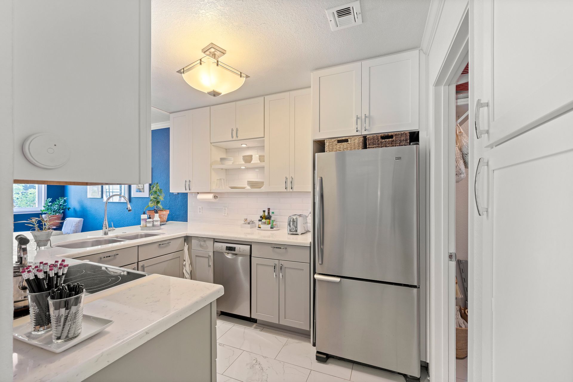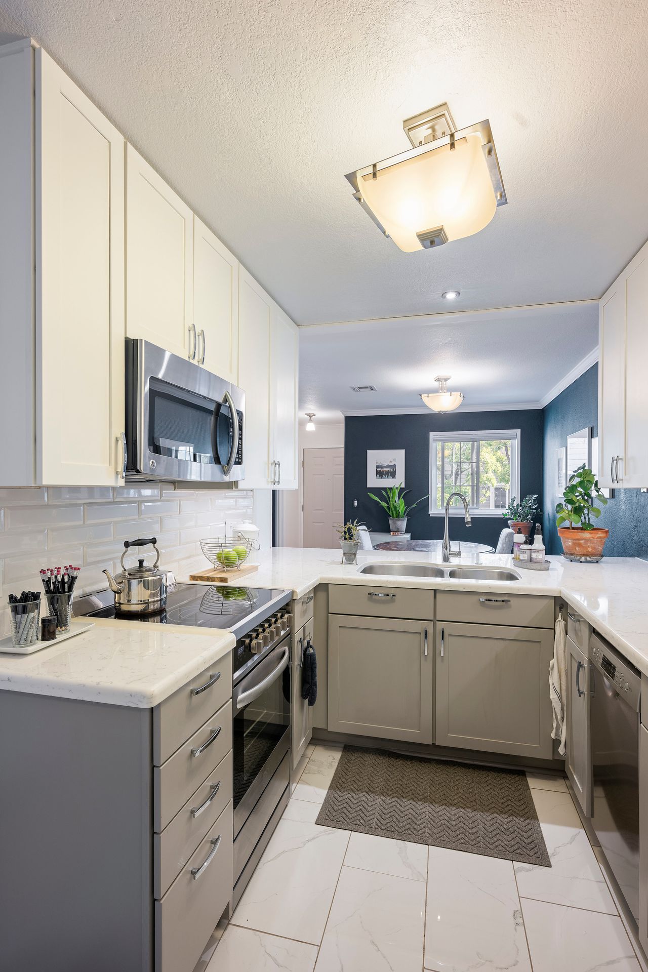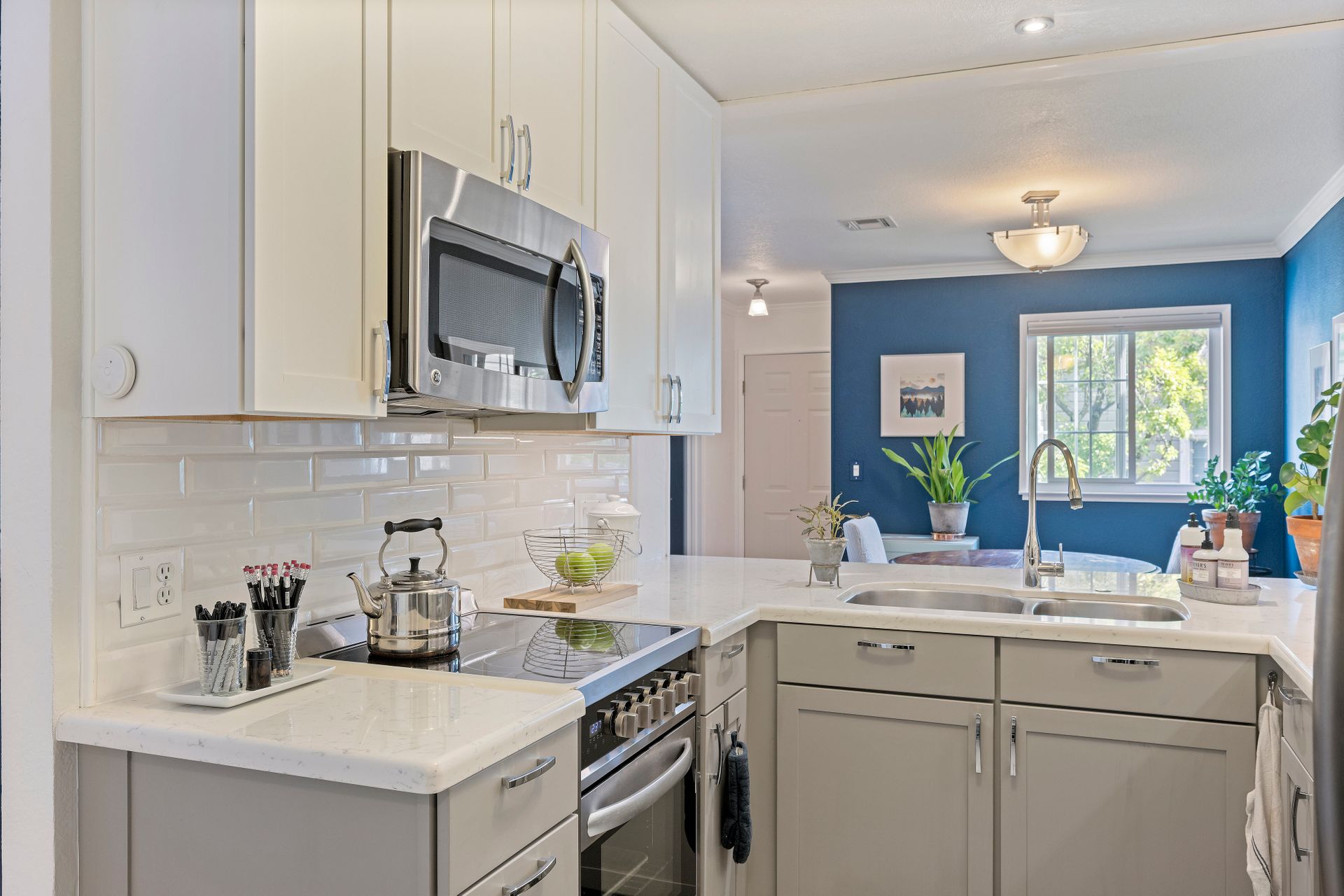 The contemporary kitchen is a culinary haven with premium stainless steel appliances, including an electric stove, dishwasher and refrigerator. Abundant cabinet space, radiant quartz countertops and a stylish subway-tiled backsplash create a culinary masterpiece that seamlessly transitions into a charming dining area - ideal for daily meals and hosting guests.