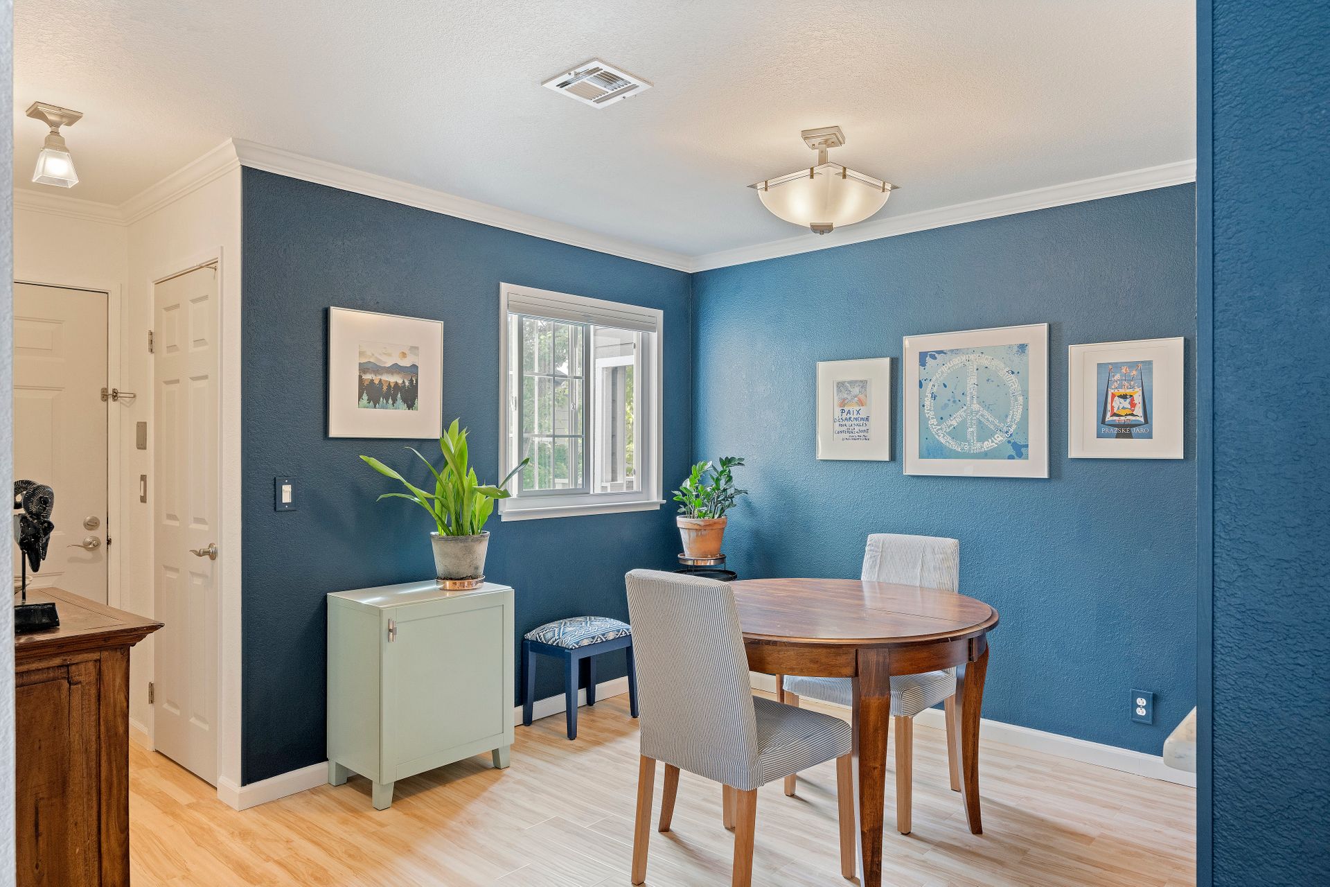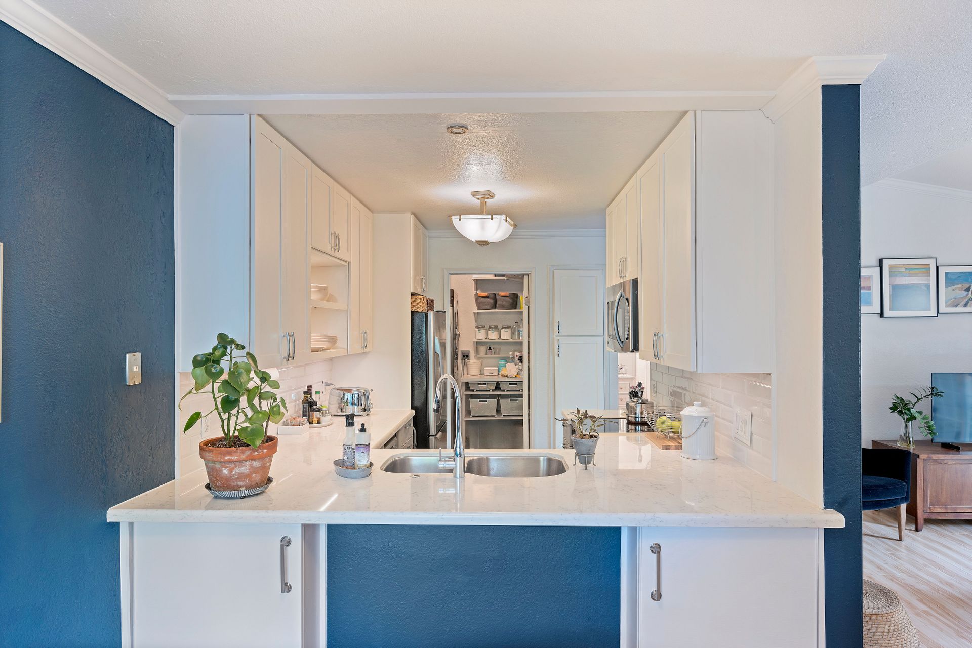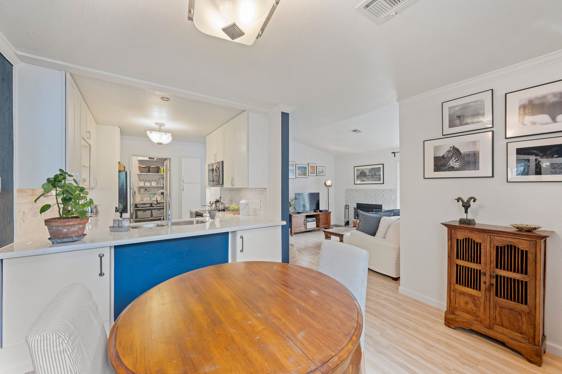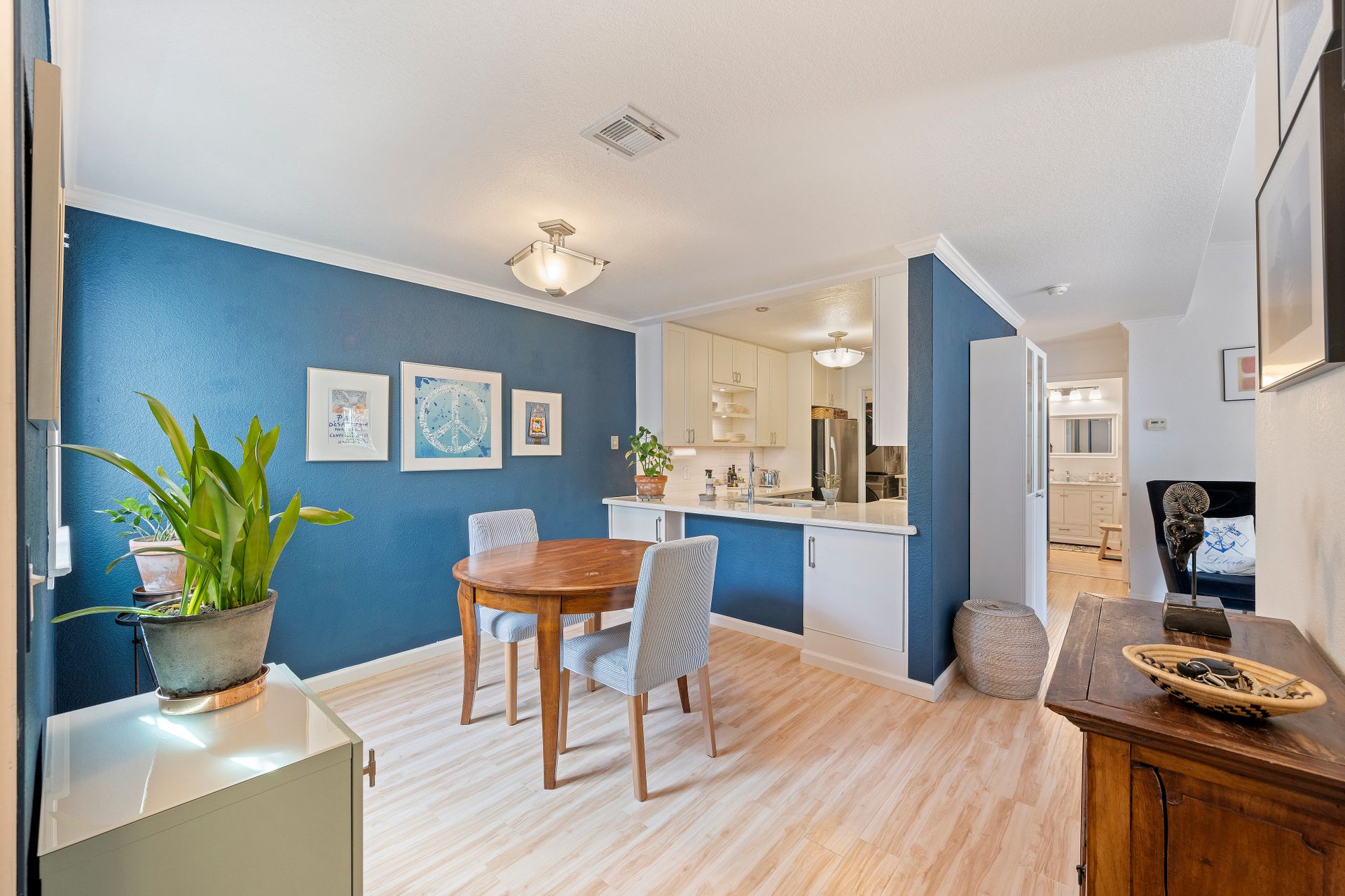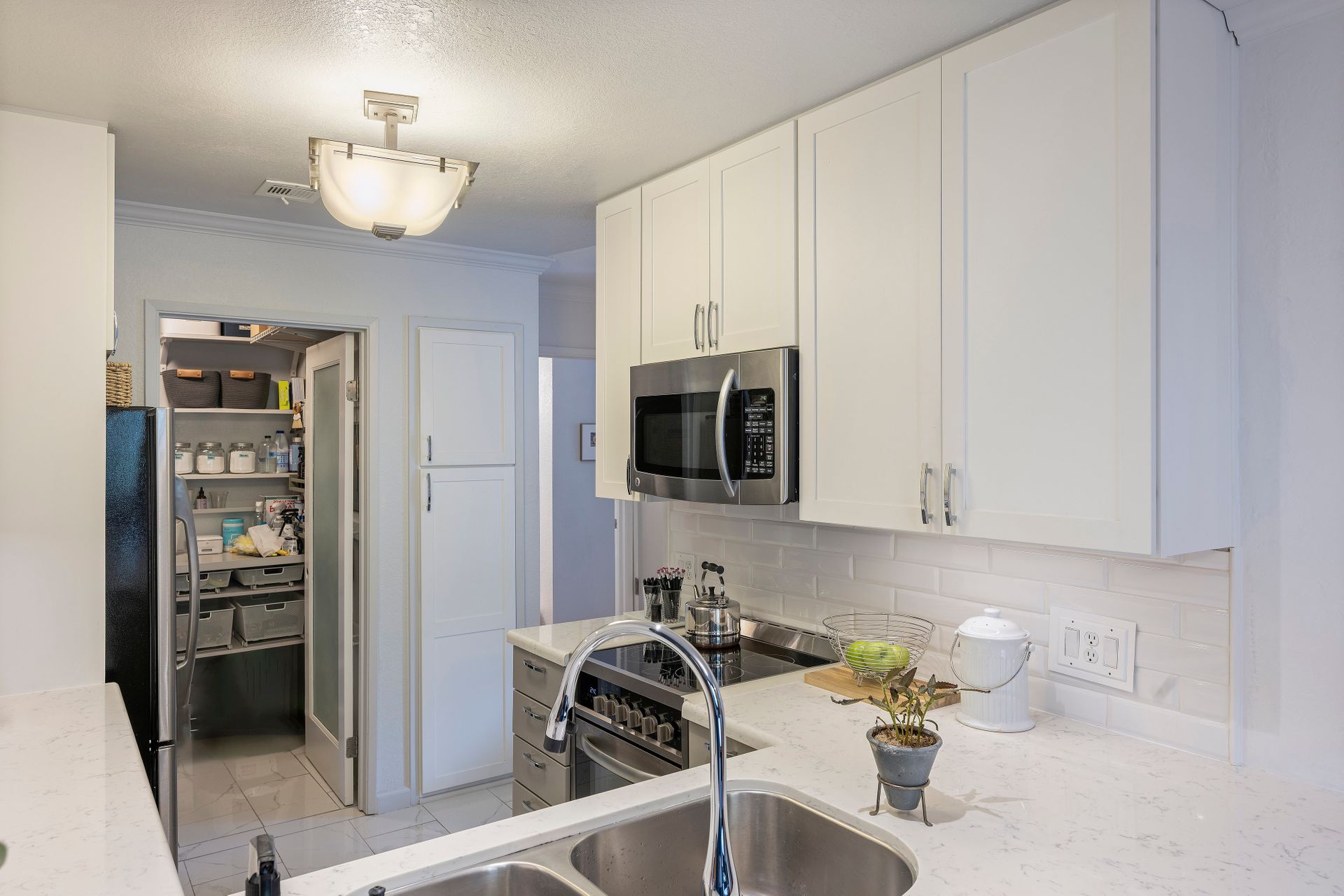 The contemporary kitchen is a culinary haven with premium stainless steel appliances, including an electric stove, dishwasher and refrigerator. Abundant cabinet space, radiant quartz countertops and a stylish subway-tiled backsplash create a culinary masterpiece that seamlessly transitions into a charming dining area - ideal for daily meals and hosting guests.
