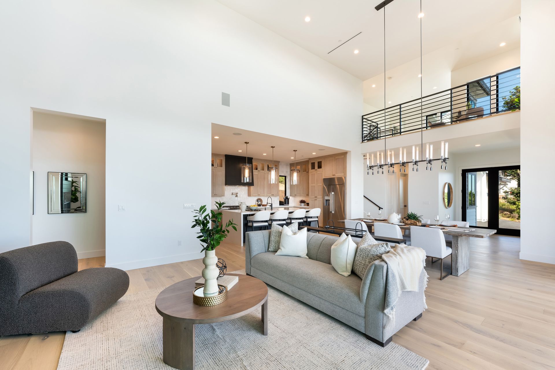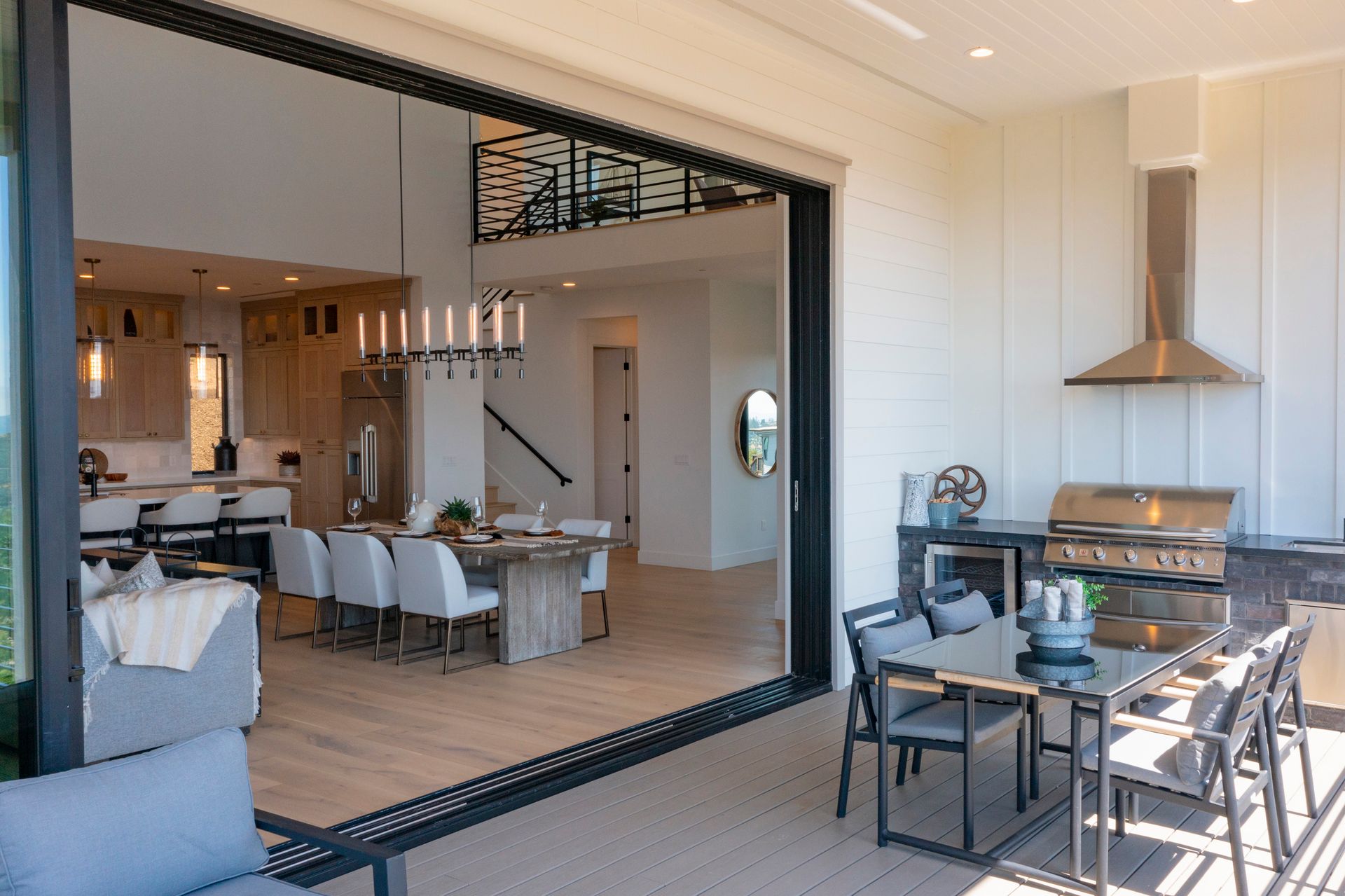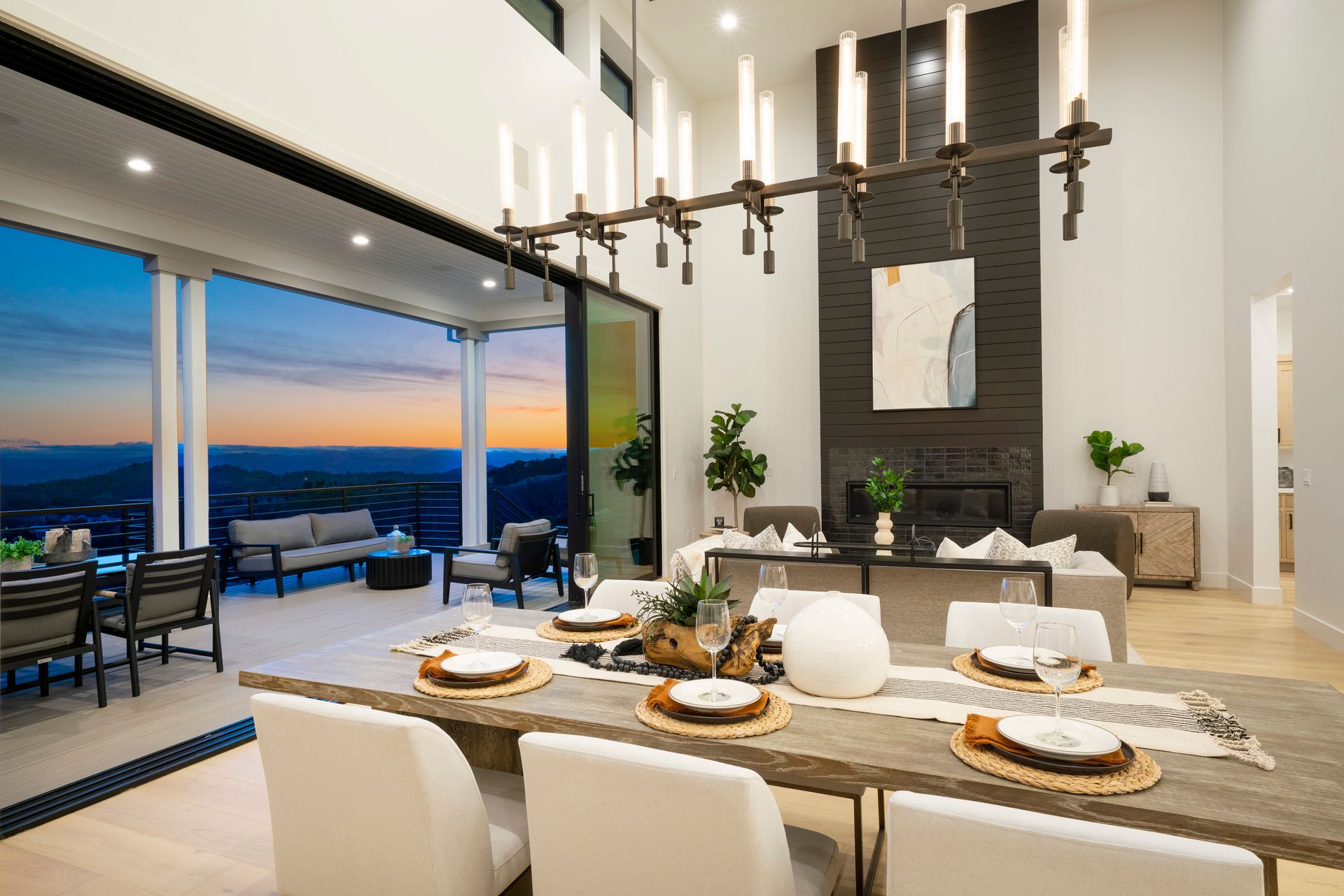 Open floor plan designed for comfort and convenience with great room featuring 19’ ceiling, a gas fireplace set in a floor to ceiling accent wall, Milgard 20’ wide by 10’ tall stacking sliders to the view deck