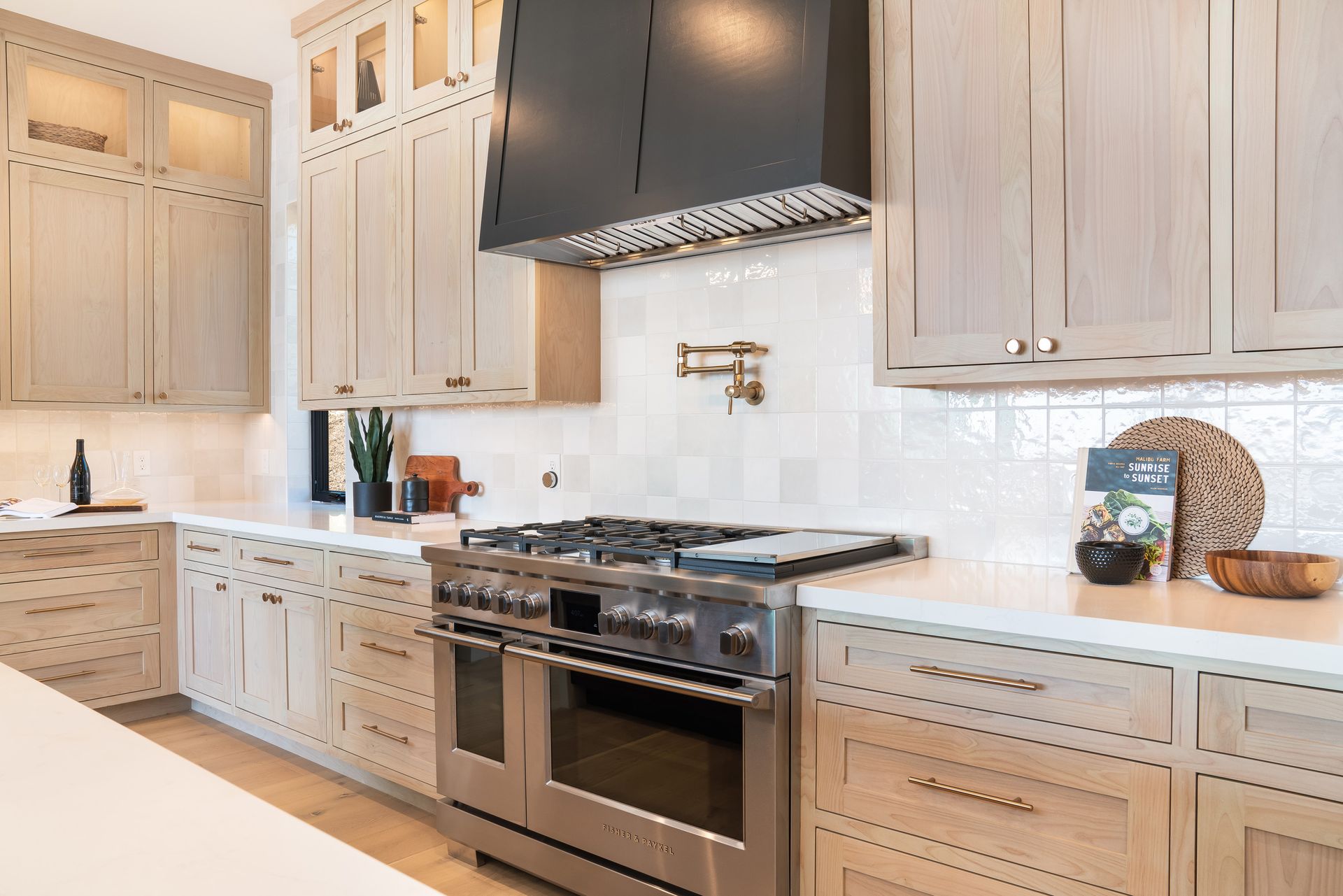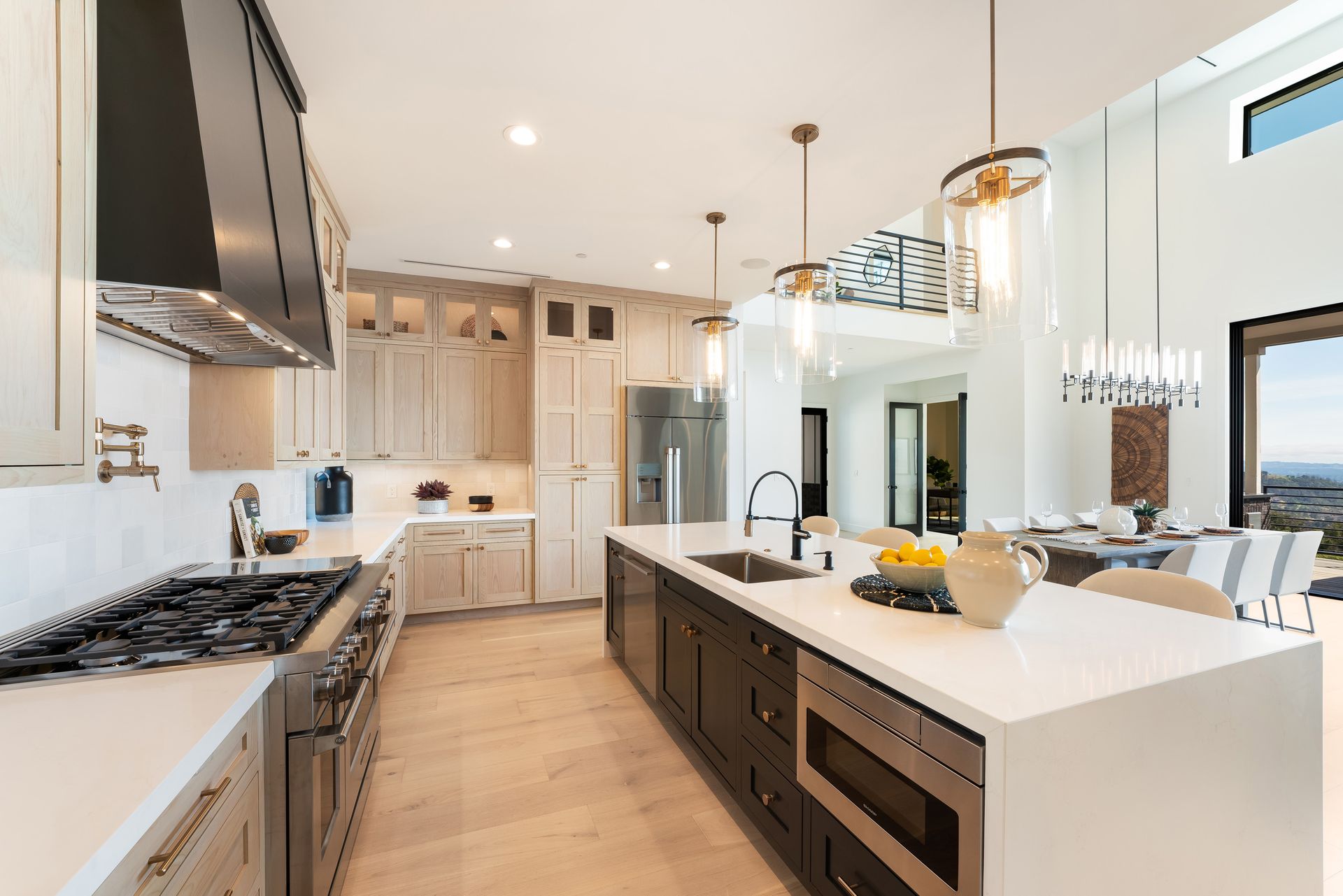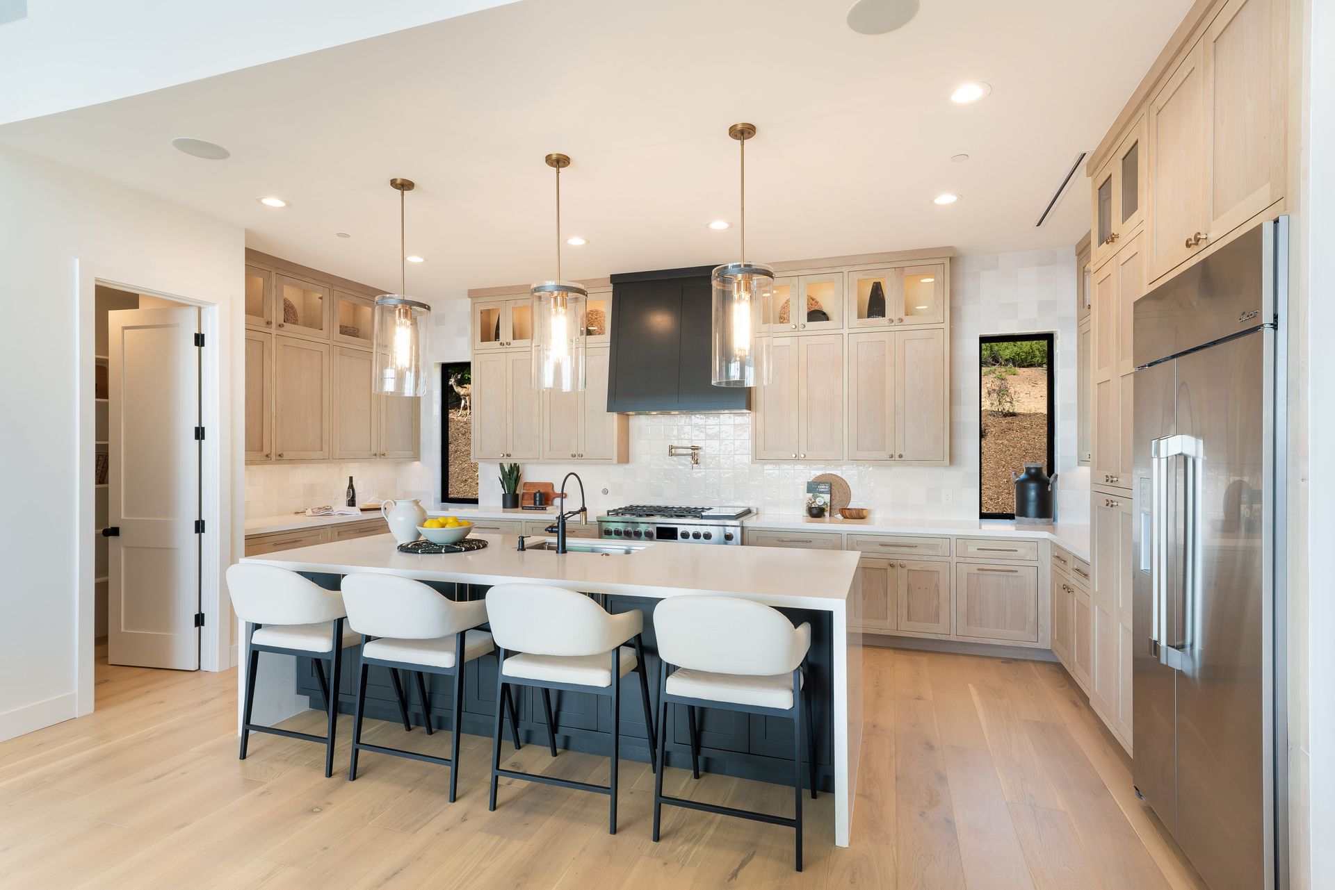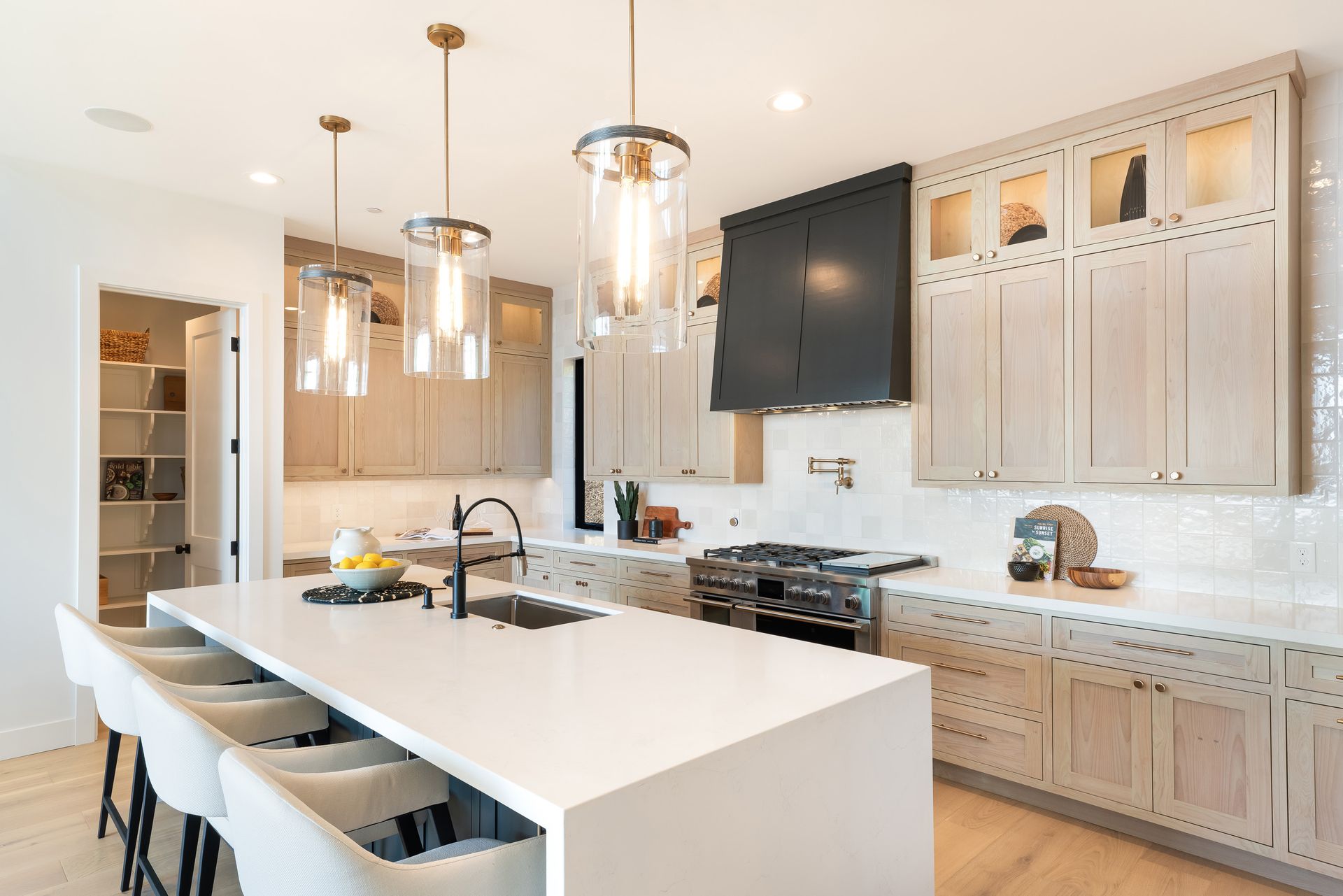 Kitchen features waterfall edge quartz center island with sink and bar seating, Fisher & Paykel 6 burner gas range with griddle, double ovens, dishwasher, microwave drawer, built-in Dacor refrigerator/freezer, pot filler faucet, hood over range, soft close cabinets, walk-in pantry, custom Alder cabinetry that extends to the ceiling including glass panel doors for display