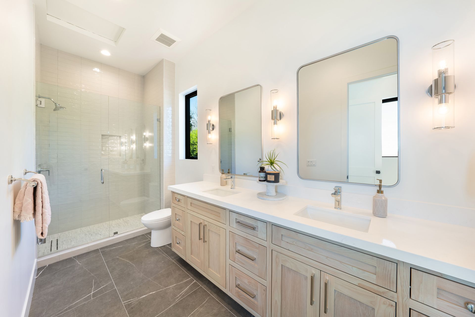 Primary bath includes dual sinks, quartz vanity, soaking tub, large shower stall