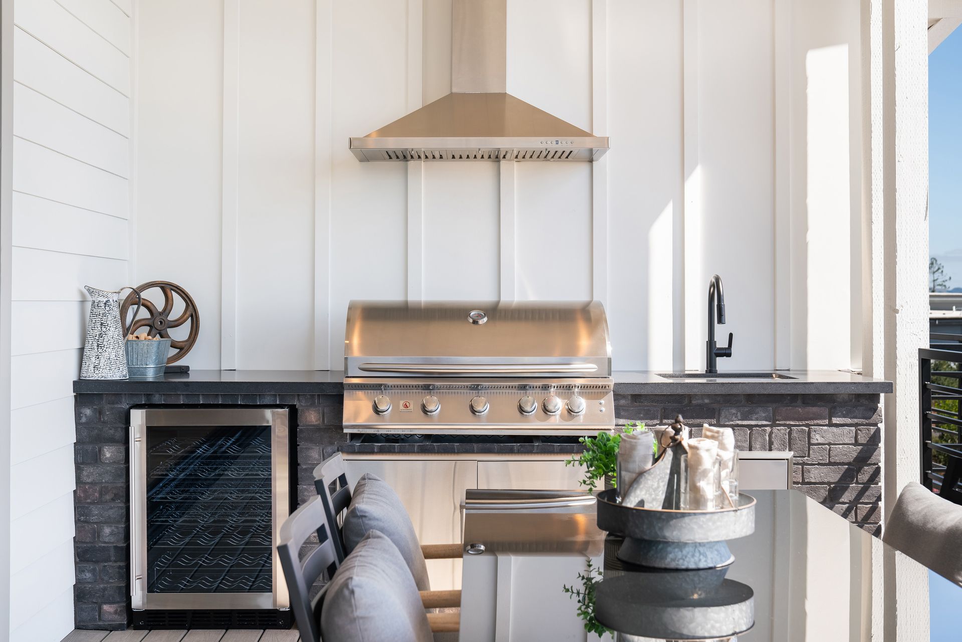 Covered outdoor kitchen with built-in Summerset grill, sink and beverage refrigerator