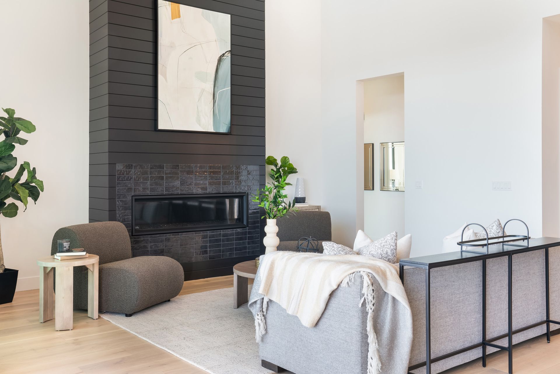 Open floor plan designed for comfort and convenience with great room featuring 19’ ceiling, a gas fireplace set in a floor to ceiling accent wall, Milgard 20’ wide by 10’ tall stacking sliders to the view deck