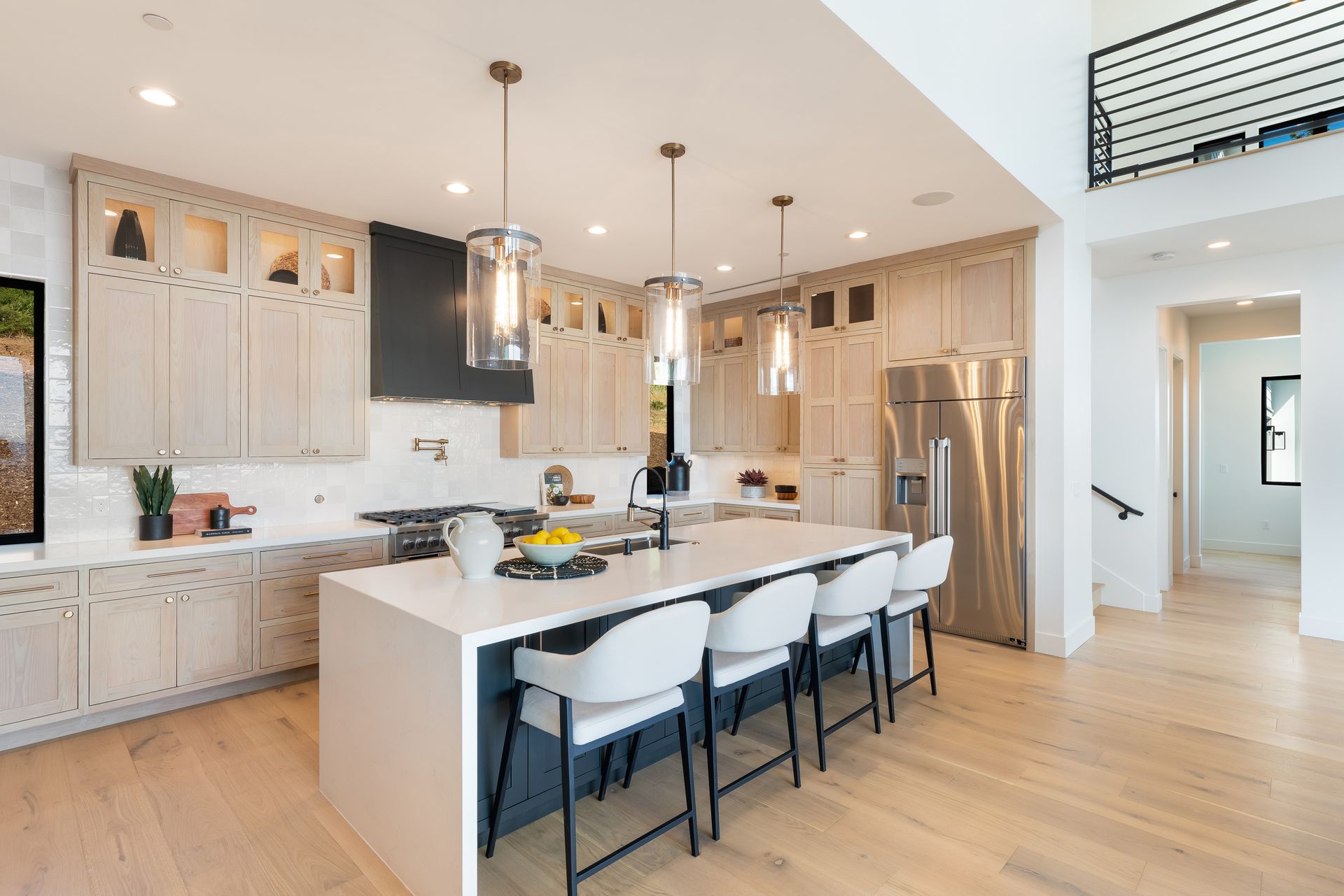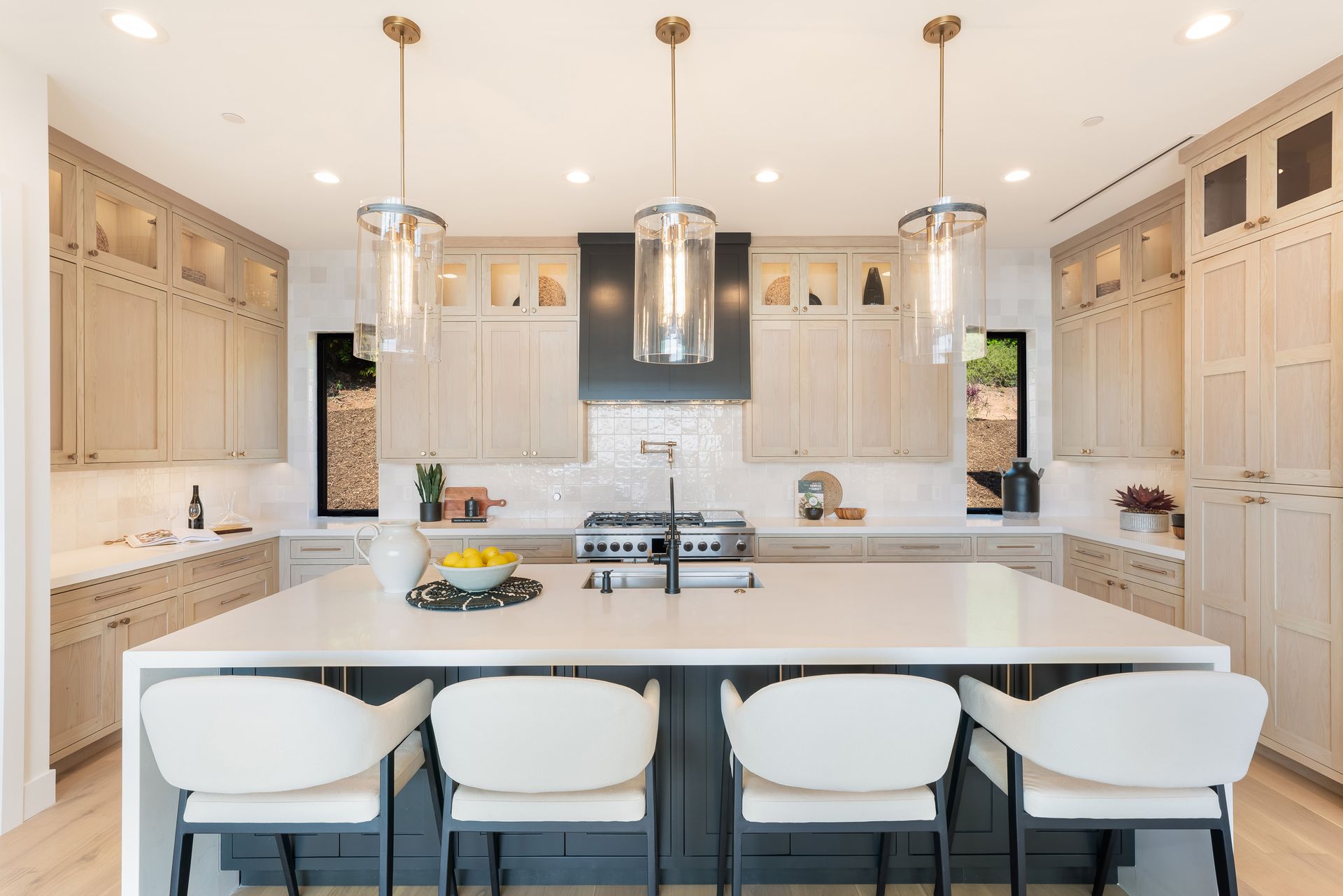 Kitchen features waterfall edge quartz center island with sink and bar seating, Fisher & Paykel 6 burner gas range with griddle, double ovens, dishwasher, microwave drawer, built-in Dacor refrigerator/freezer, pot filler faucet, hood over range, soft close cabinets, walk-in pantry, custom Alder cabinetry that extends to the ceiling including glass panel doors for display