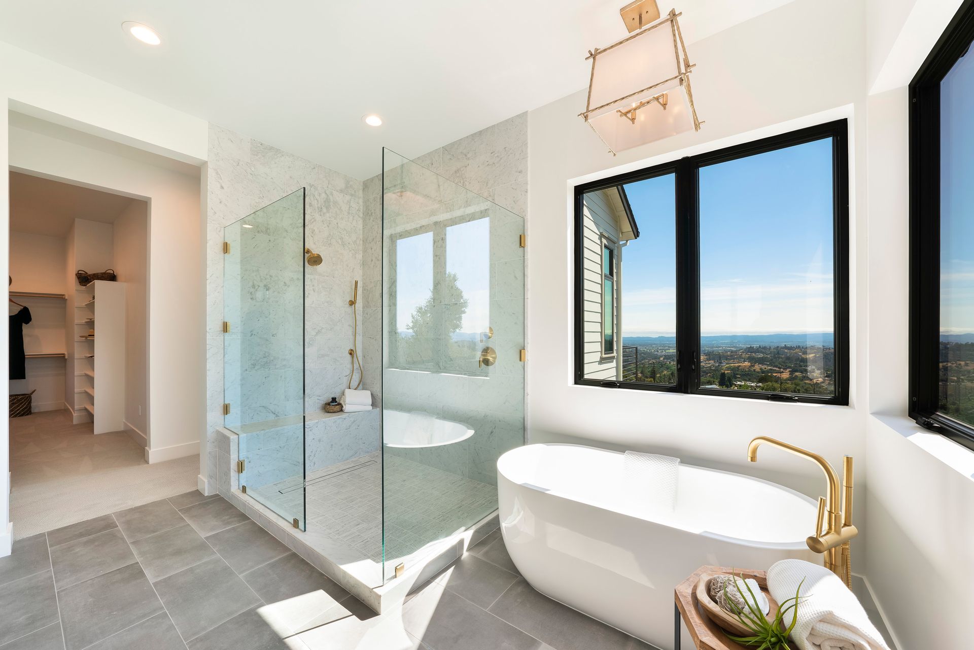Primary bath includes dual sinks, quartz vanity, soaking tub, large shower stall