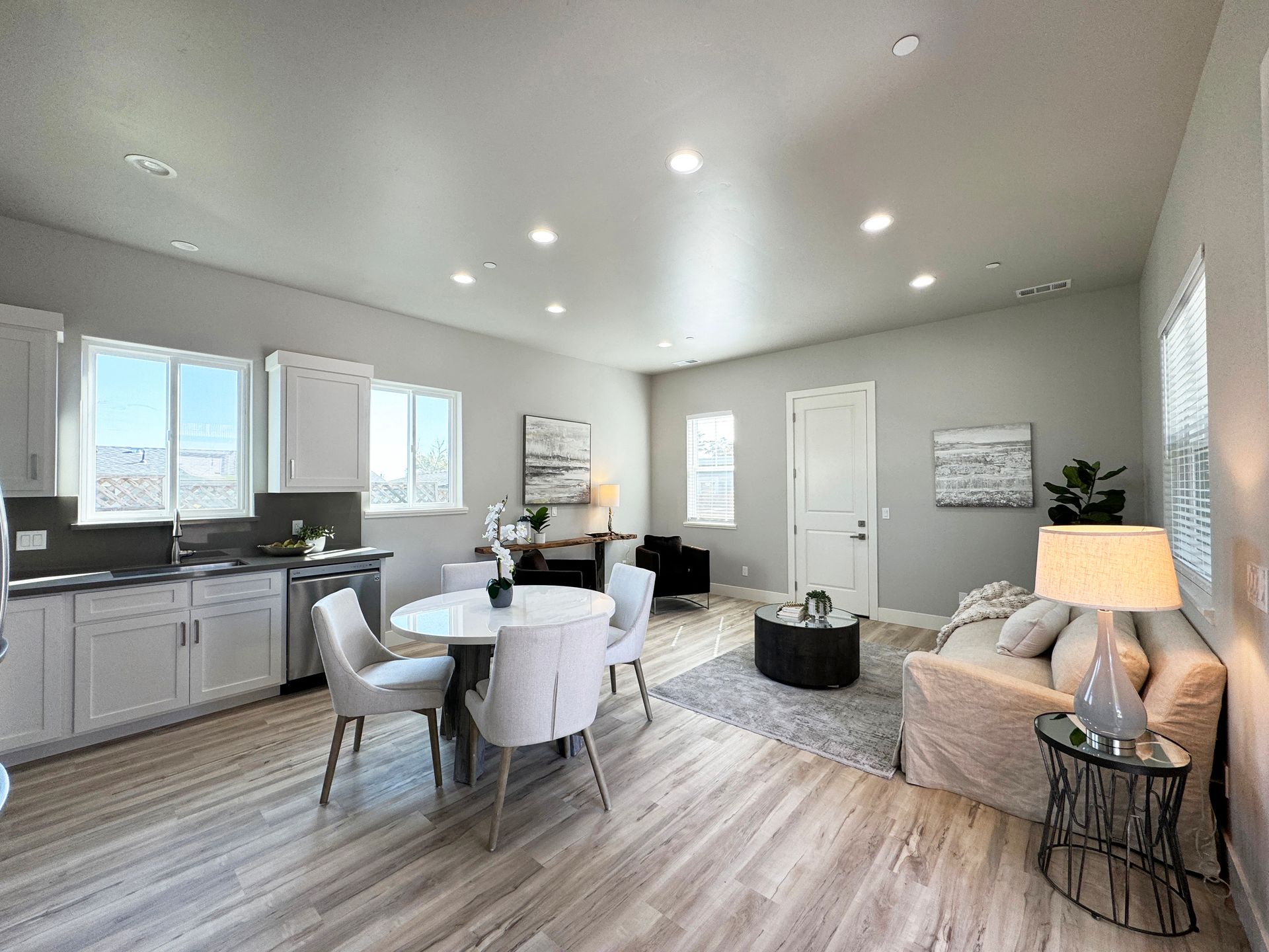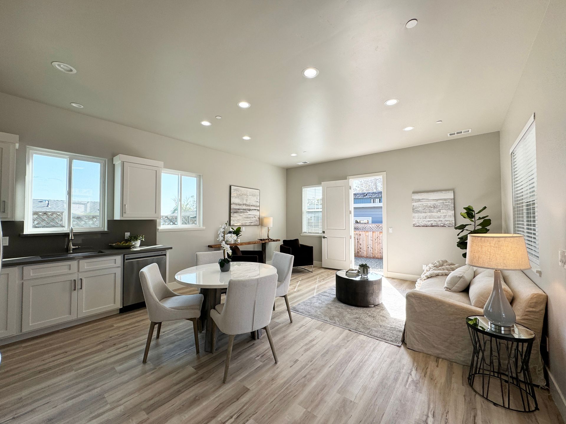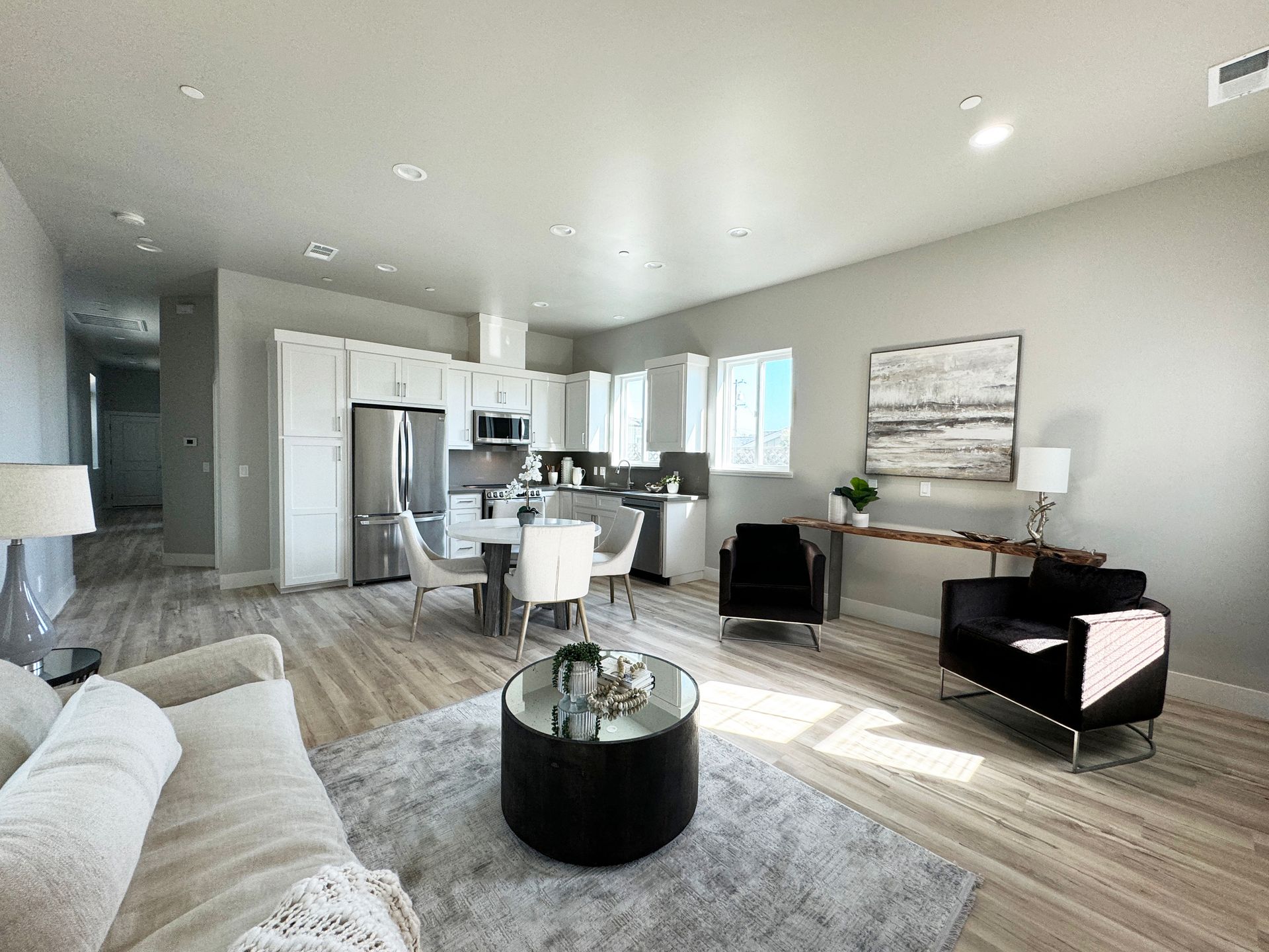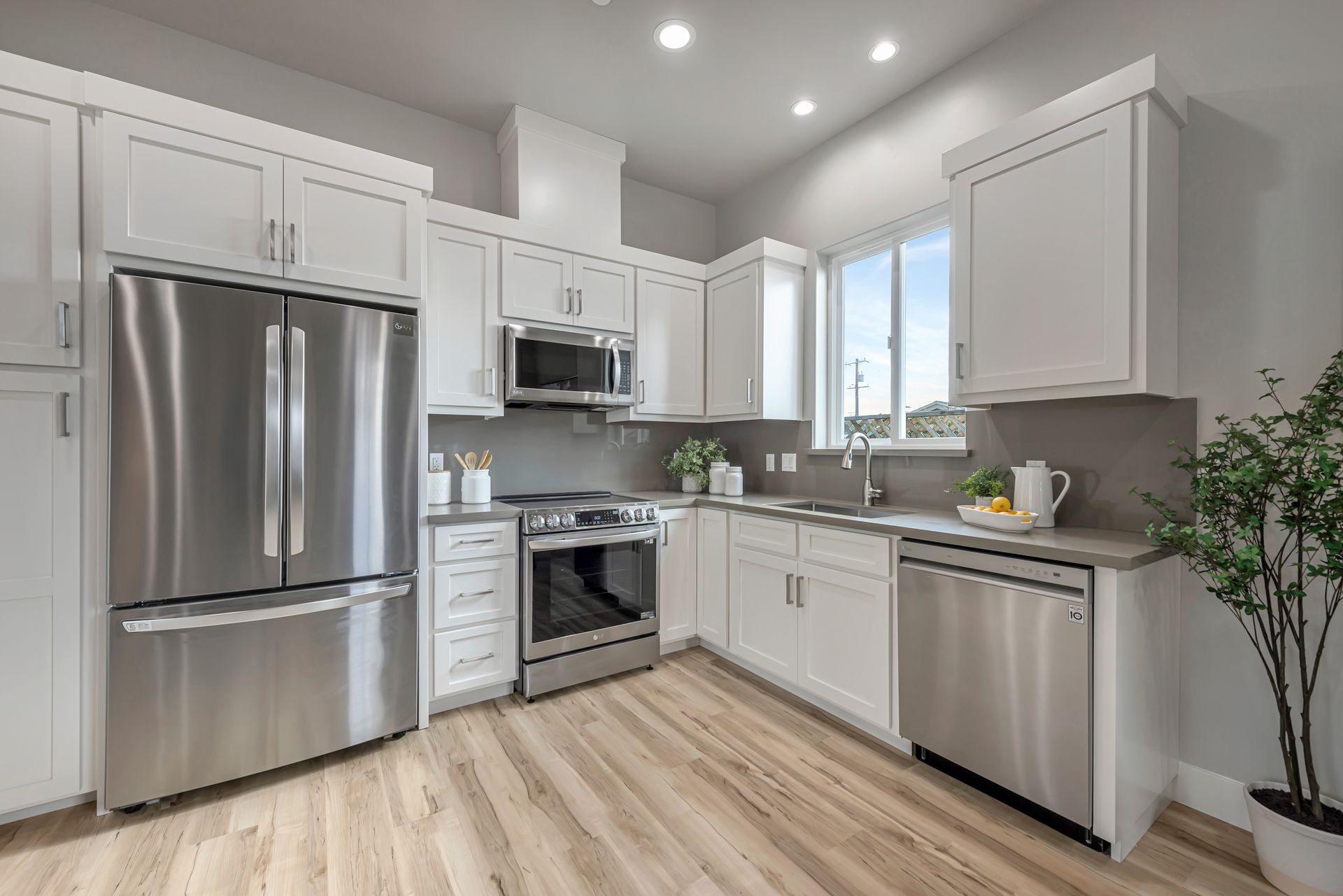 Open concept floorplan with beautiful kitchen, living and dining area. Custom-made cabinetry, Quartz countertops and backsplash in warm designer tones; LG appliances, refrigerator, electric range, and dishwasher, Milgard windows and Luxury Vinyl Plank flooring, super-efficient electric heat pump (for heat and A/C) and electric heat exchange water heater.