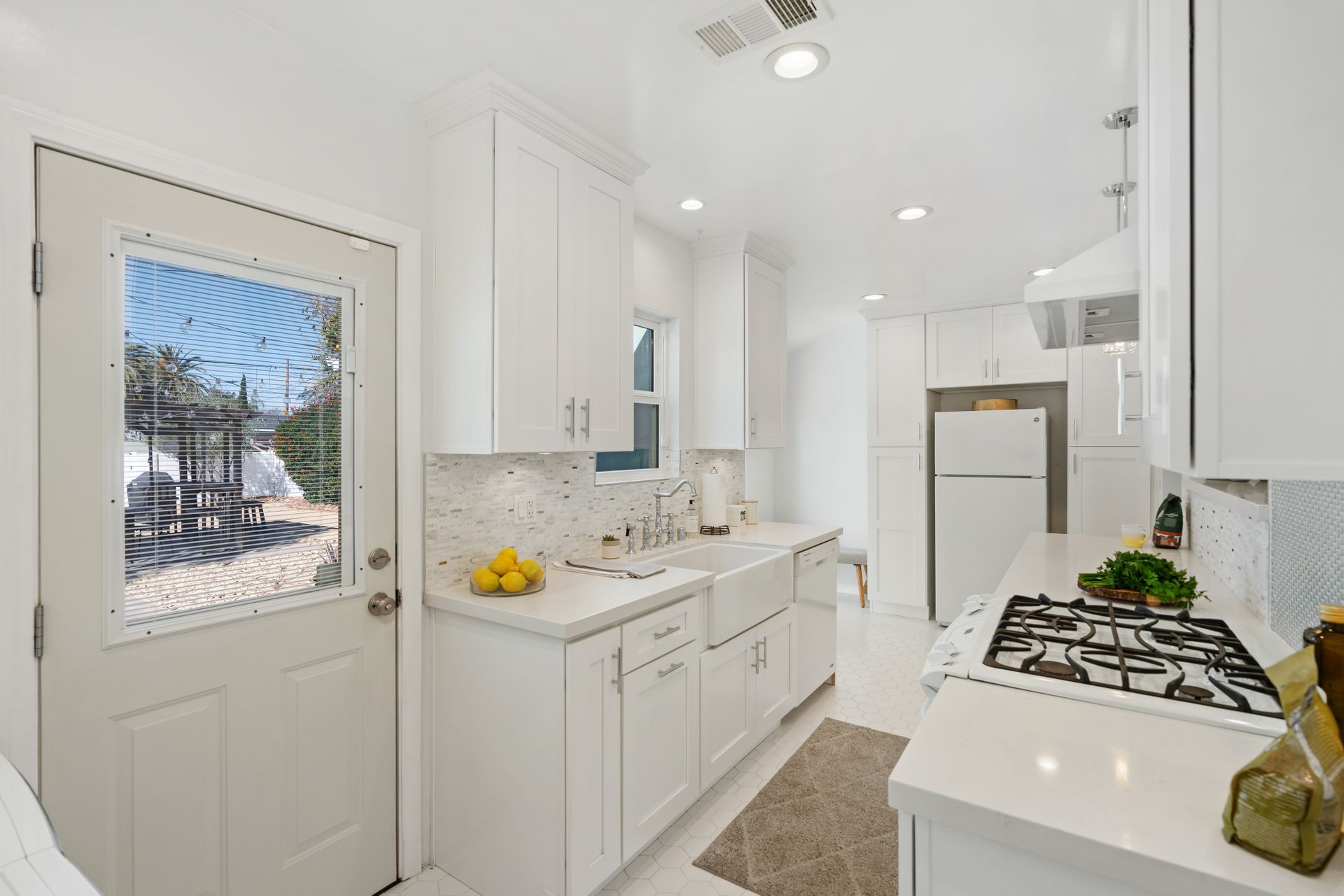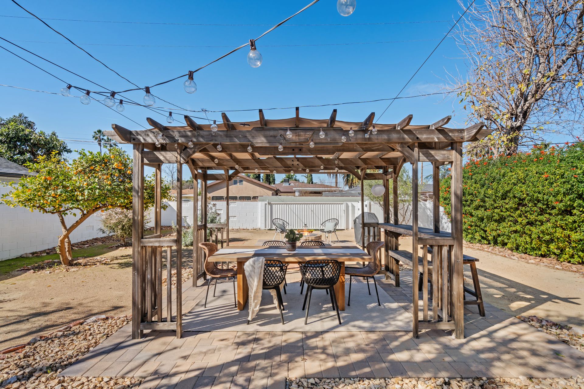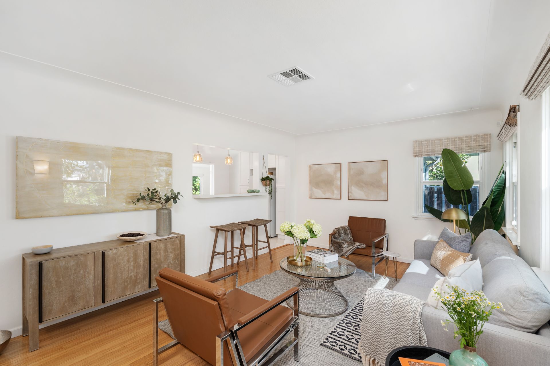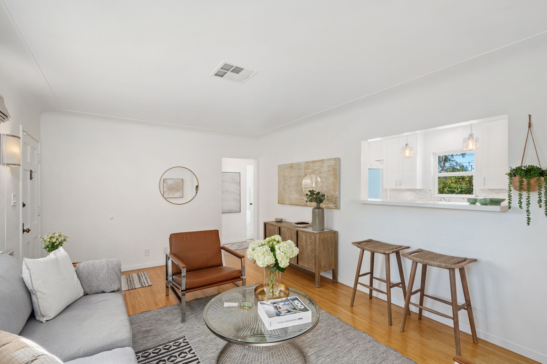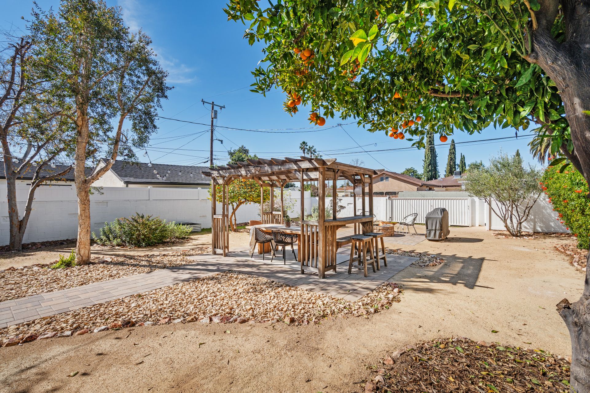 Less than a mile from the heart of NoHo, this stylishly updated North Hollywood gem blends classic charm with fresh, modern vibes! Sitting pretty on a tree-lined street of single-family homes, this bright and inviting home boasts a spacious yard, ideal for entertaining or just soaking up the SoCal sun. The real showstopper? The sleek, renovated kitchen—decked out with quartzite countertops, crisp cabinetry, white appliances (yes, a four-burner gas stove!), and a chic pass-through dining counter that connects seamlessly to the living room. Speaking of the living space, it’s got that ideal mix of cozy and cool with its hardwood floors, coved ceilings, and newer double-pane windows for extra peace and tranquility. Need a home office, creative studio, or even a third bedroom? The oversized den off the kitchen has you covered with direct access to the backyard for the ultimate indoor-outdoor flow. The two bedrooms are fresh, airy, and stylish, while the updated bathroom stuns with a custom design of hand-laid tiles. Directly off the kitchen, you can exit outside to your private backyard oasis, designed for laid-back California living. Two distinct seating areas—one under a gazebo, the other around a firepit—set the scene for epic hangouts. The yard is dotted with fruit trees, drought-tolerant landscaping, a custom hidden trash enclosure and even a gated rear access road. The attached one-car garage offers extra storage or optional future expansion (with city approval, of course). With newer central air and heat, updated electrical, copper plumbing, in-home laundry (washer and dryer included!), ABS sewer line, and more, this home is totally move-in ready. Plus, the location is unbeatable—just two blocks from Whitnall Dog Park and minutes to NoHo, Burbank, and Toluca Lake hotspots like Trader Joe’s, Porto’s Bakery, Moby’s Organic Coffee & Tea, and more. If you’re looking for that ideal blend of classic charm and modern convenience, welcome home to your NoHo dream!