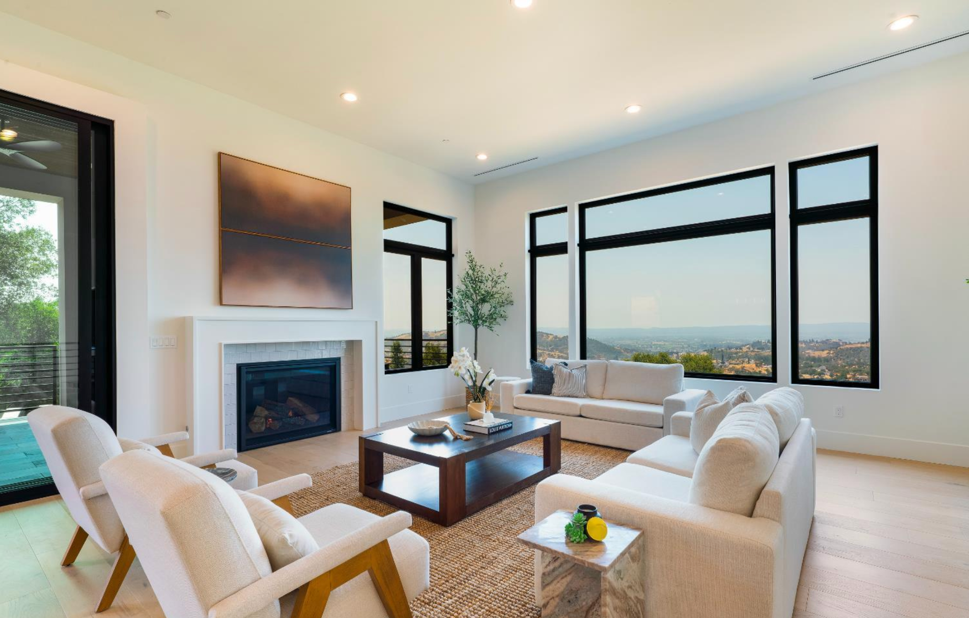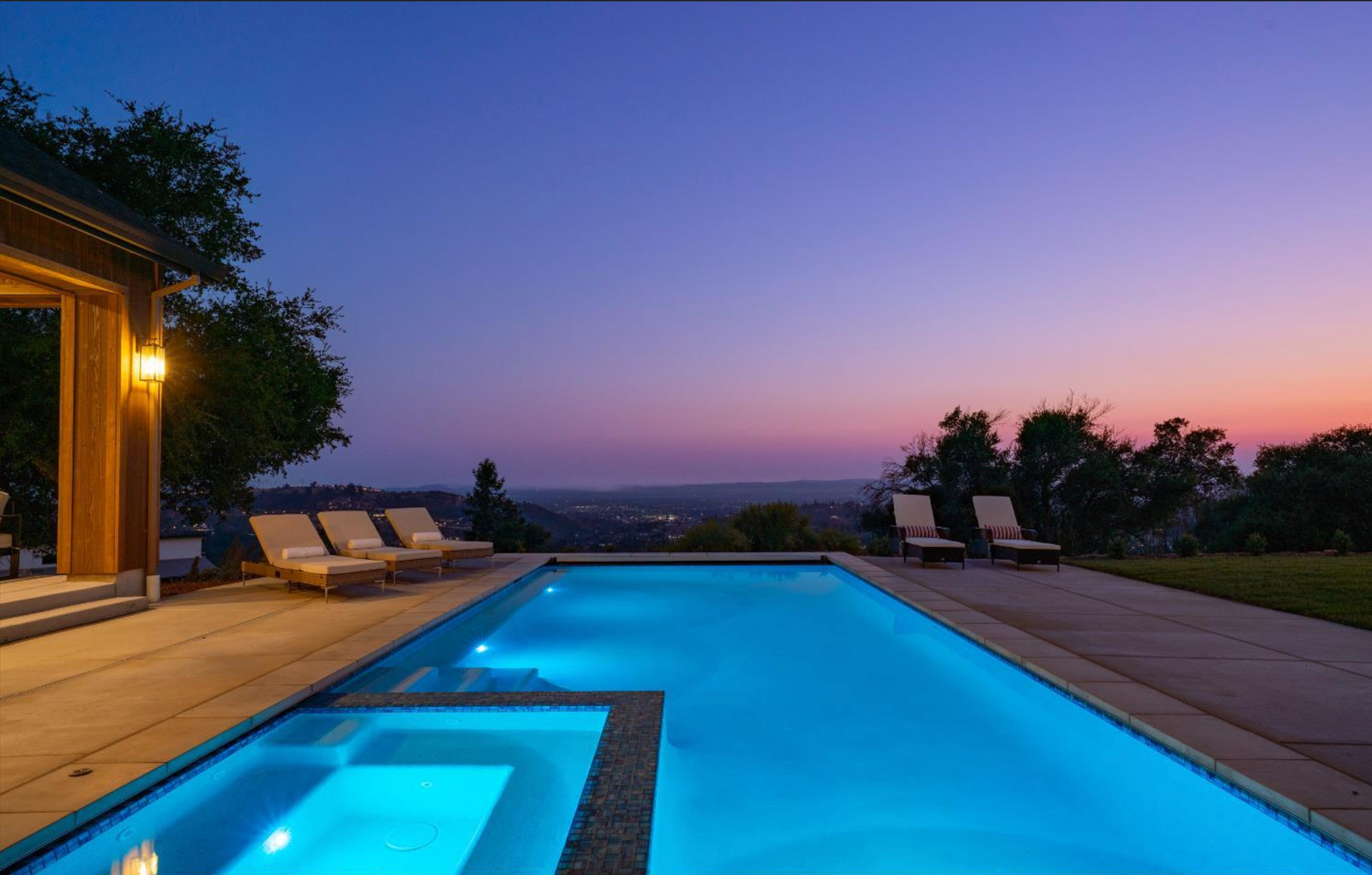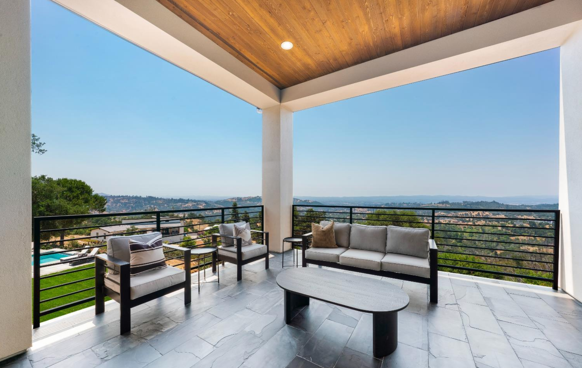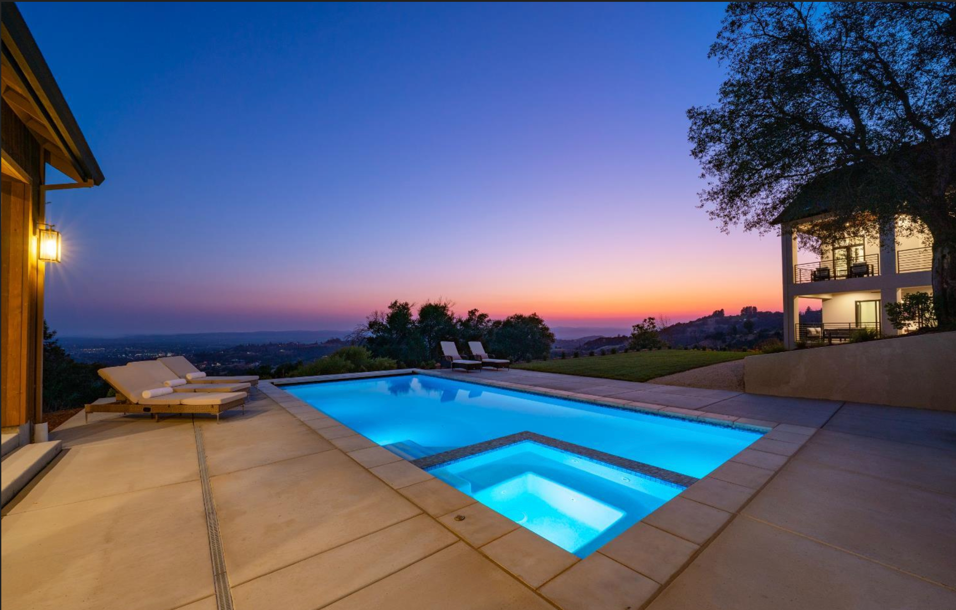 Elevated above the valley on 3.67 acres, this architecturally refined Wine Country retreat offers uninterrupted panoramic views and a lifestyle defined by seamless indoor-outdoor living. Expansive terraces, an outdoor kitchen, and a resort-style pool with custom fountain and pool house invite effortless entertaining and everyday enjoyment. 10-foot glass entry doors usher in natural light and frame captivating vistas from the moment you arrive. The great room flows into a chef's kitchen with alder cabinetry, quartz countertops, a dual-fuel range with grill and griddle and a light-filled butler's pantry with wine storage. The main level also features a guest suite, a richly paneled powder room, and a serene primary suite with a generous walk-in closet and a spa-like bath featuring a soaking tub, marble floors, and a floor-to-ceiling tiled shower. Downstairs, a spacious family/game room opens to a second view deck, accompanied by two additional bedrooms and a designer full bath with dual sinks. Above the home, a mature olive grove crowns the landscape, while the acreage offers versatility for future vision whether garden, hobby vineyard, shop, or barn.