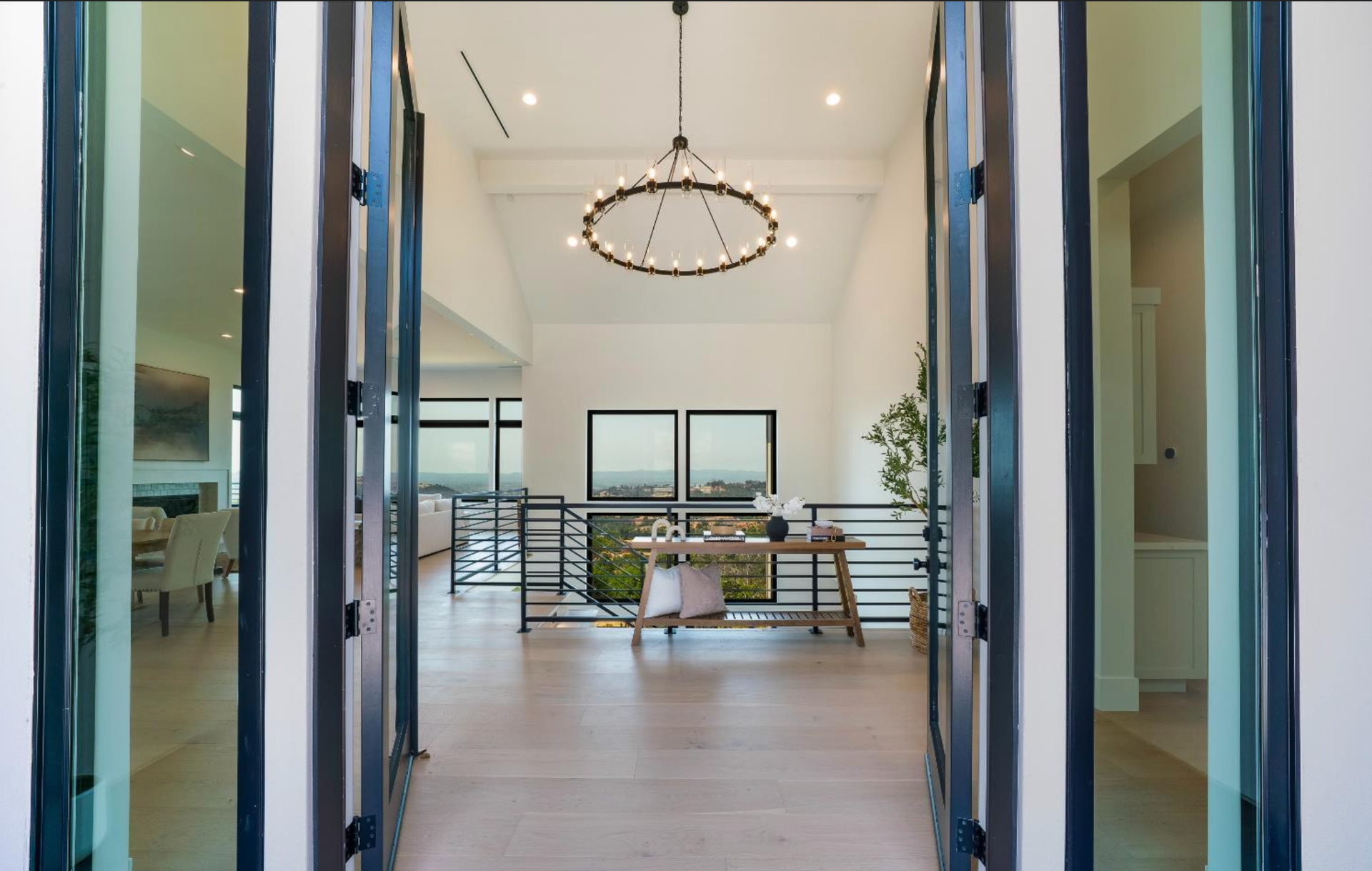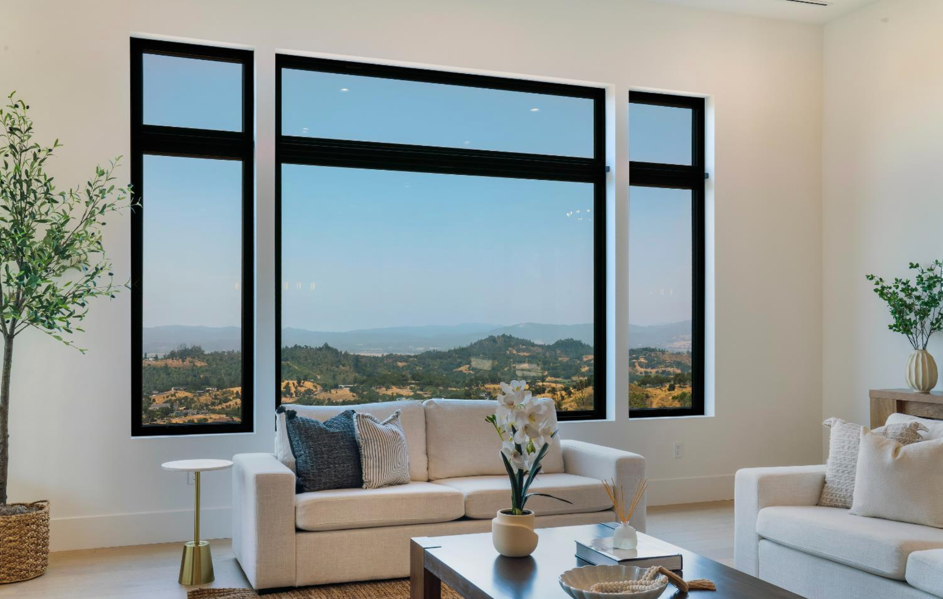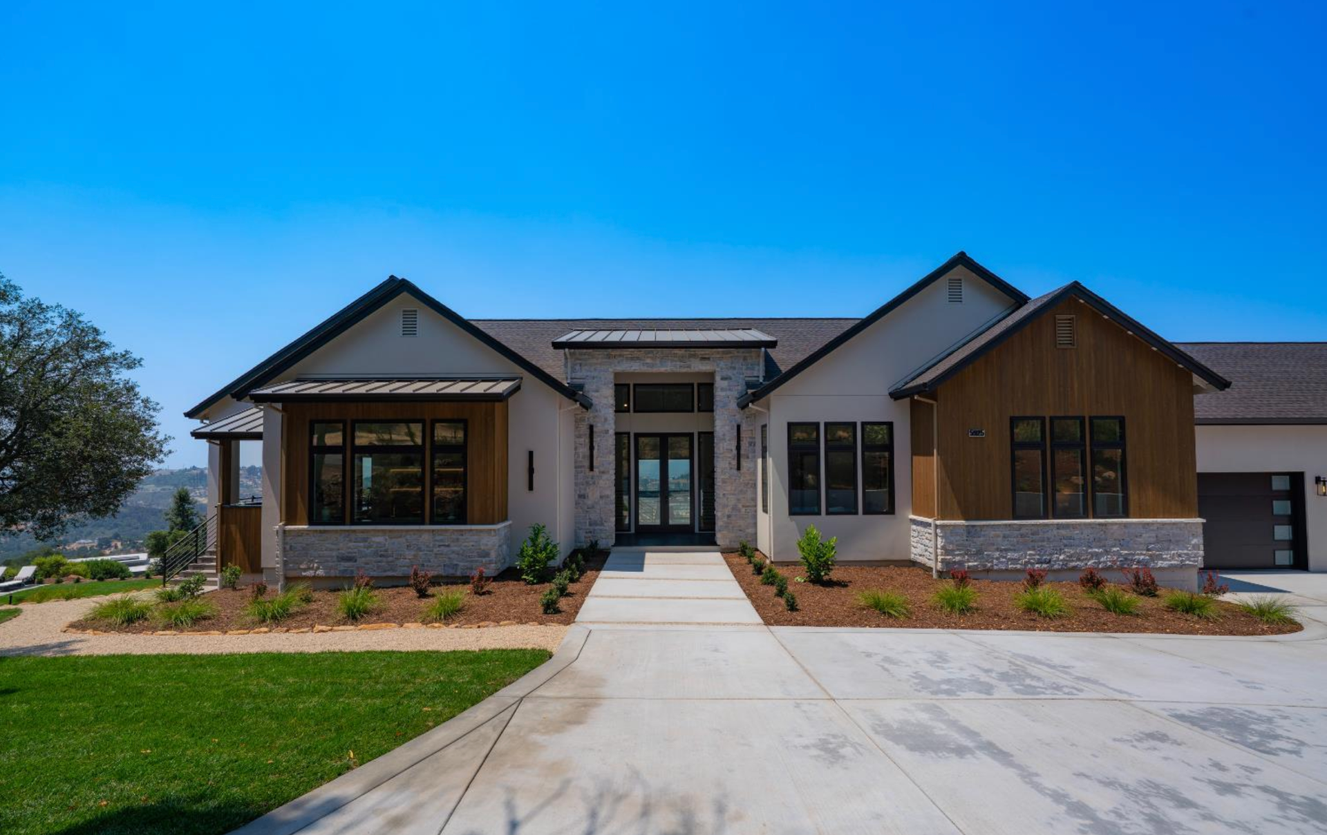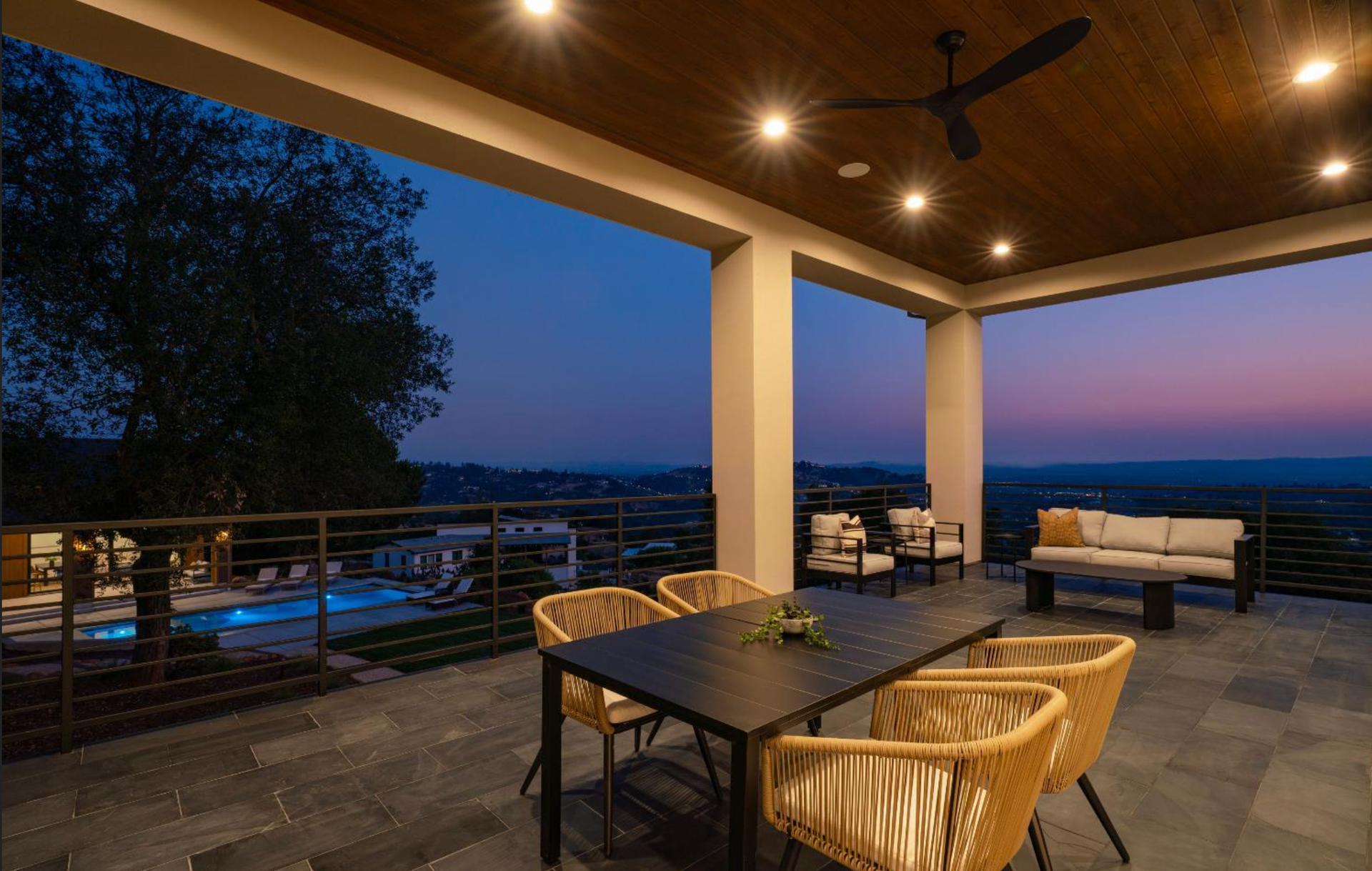 Elevated above the valley on 3.67 acres, this architecturally refined Wine Country retreat offers uninterrupted panoramic views and a lifestyle defined by seamless indoor-outdoor living. Expansive terraces, an outdoor kitchen, and a resort-style pool with custom fountain and pool house invite effortless entertaining and everyday enjoyment. 10-foot glass entry doors usher in natural light and frame captivating vistas from the moment you arrive. The great room flows into a chef's kitchen with alder cabinetry, quartz countertops, a dual-fuel range with grill and griddle and a light-filled butler's pantry with wine storage. The main level also features a guest suite, a richly paneled powder room, and a serene primary suite with a generous walk-in closet and a spa-like bath featuring a soaking tub, marble floors, and a floor-to-ceiling tiled shower. Downstairs, a spacious family/game room opens to a second view deck, accompanied by two additional bedrooms and a designer full bath with dual sinks. Above the home, a mature olive grove crowns the landscape, while the acreage offers versatility for future vision whether garden, hobby vineyard, shop, or barn.