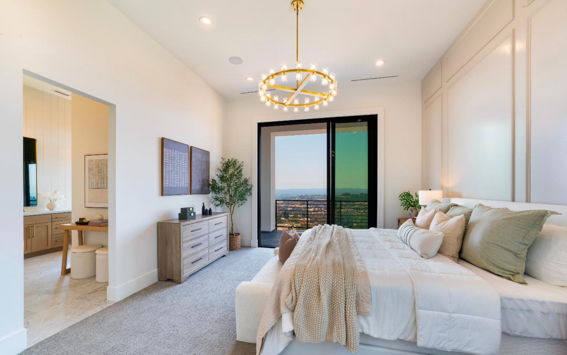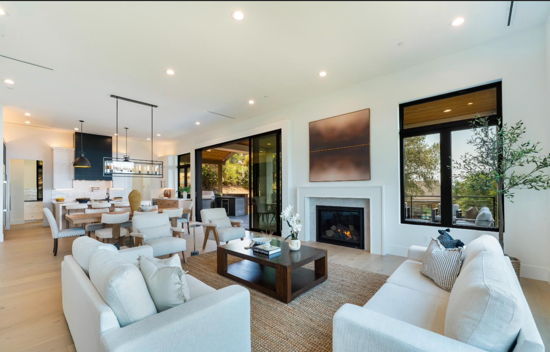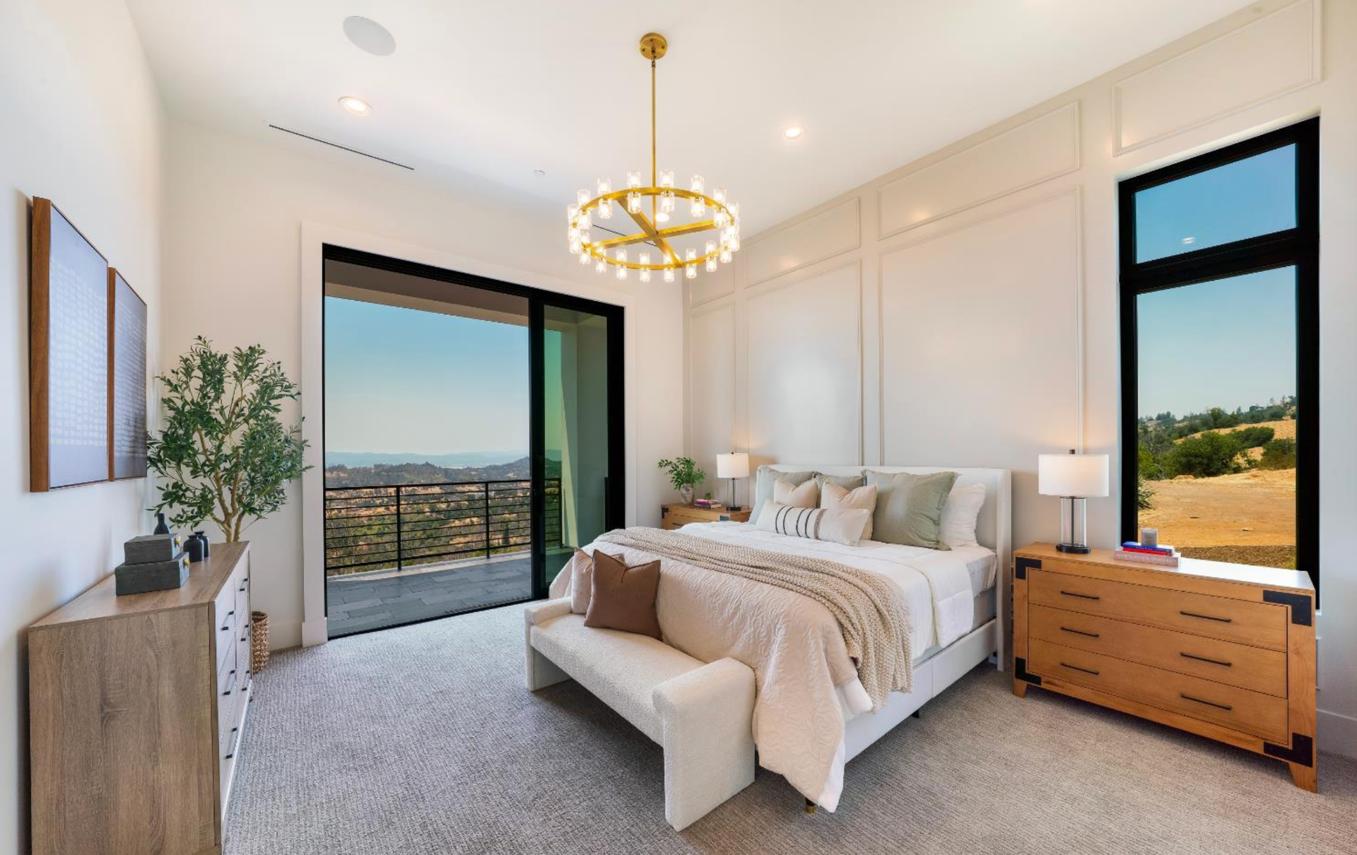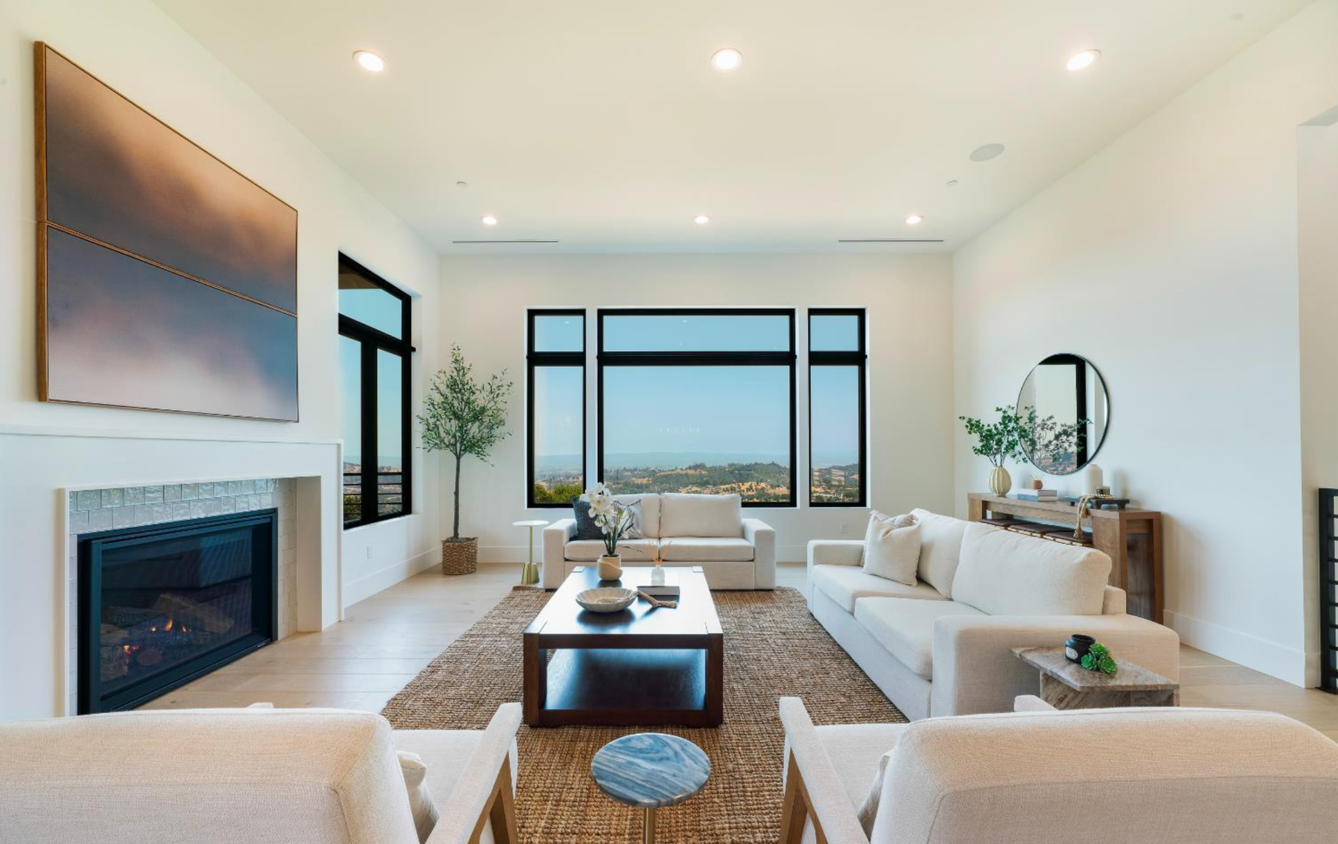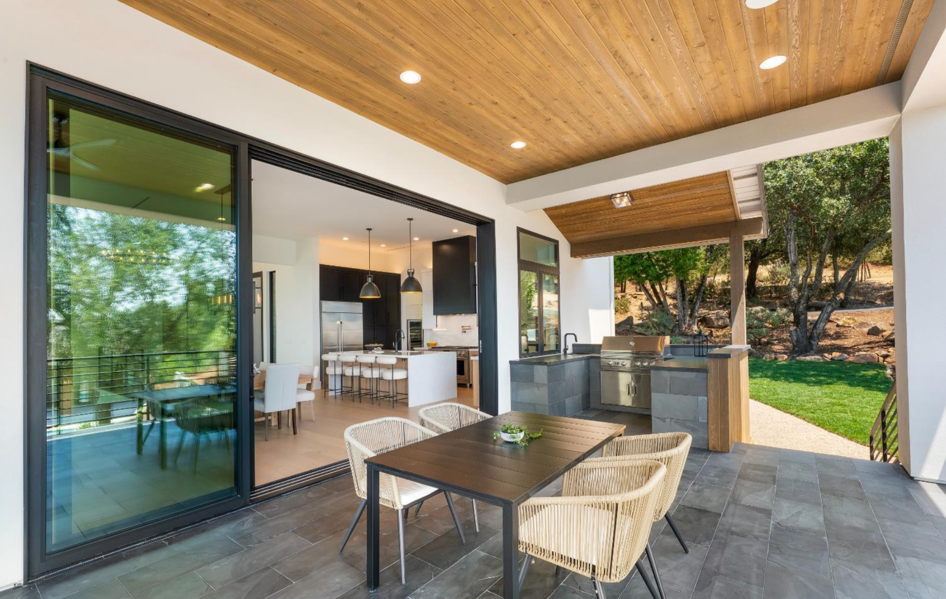 Elevated above the valley on 3.67 acres, this architecturally refined Wine Country retreat offers uninterrupted panoramic views and a lifestyle defined by seamless indoor-outdoor living. Expansive terraces, an outdoor kitchen, and a resort-style pool with custom fountain and pool house invite effortless entertaining and everyday enjoyment. 10-foot glass entry doors usher in natural light and frame captivating vistas from the moment you arrive. The great room flows into a chef's kitchen with alder cabinetry, quartz countertops, a dual-fuel range with grill and griddle and a light-filled butler's pantry with wine storage. The main level also features a guest suite, a richly paneled powder room, and a serene primary suite with a generous walk-in closet and a spa-like bath featuring a soaking tub, marble floors, and a floor-to-ceiling tiled shower. Downstairs, a spacious family/game room opens to a second view deck, accompanied by two additional bedrooms and a designer full bath with dual sinks. Above the home, a mature olive grove crowns the landscape, while the acreage offers versatility for future vision whether garden, hobby vineyard, shop, or barn.