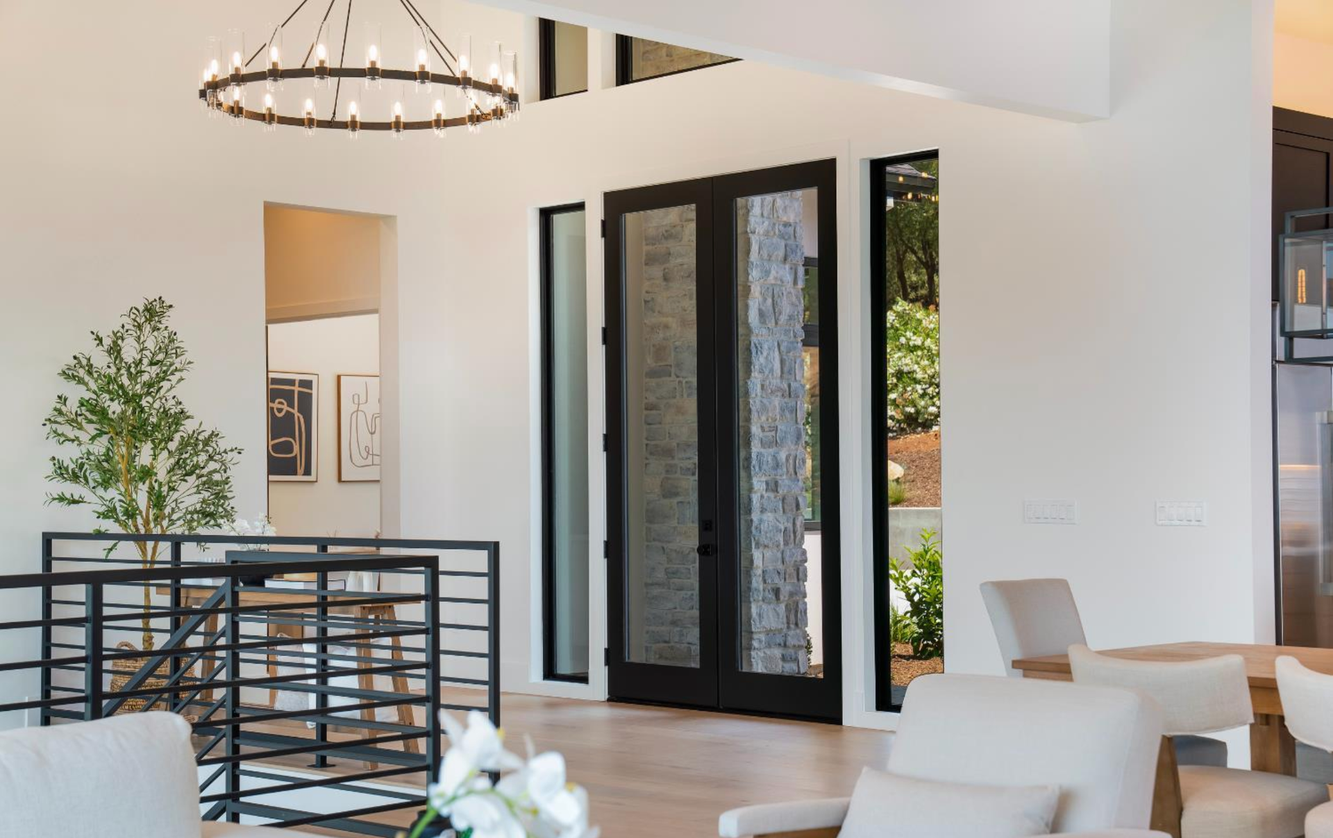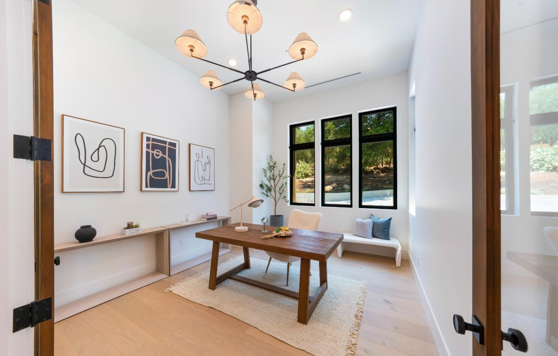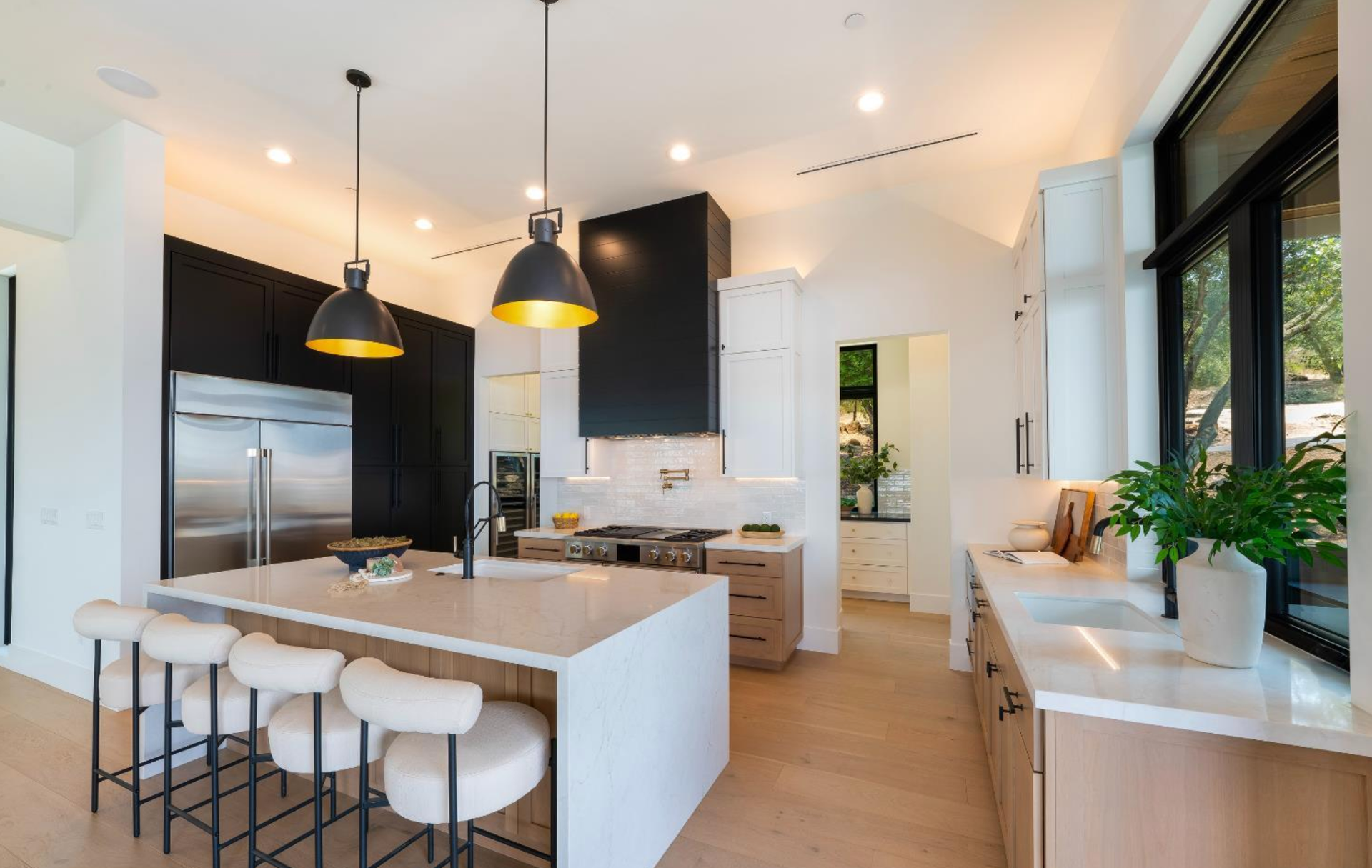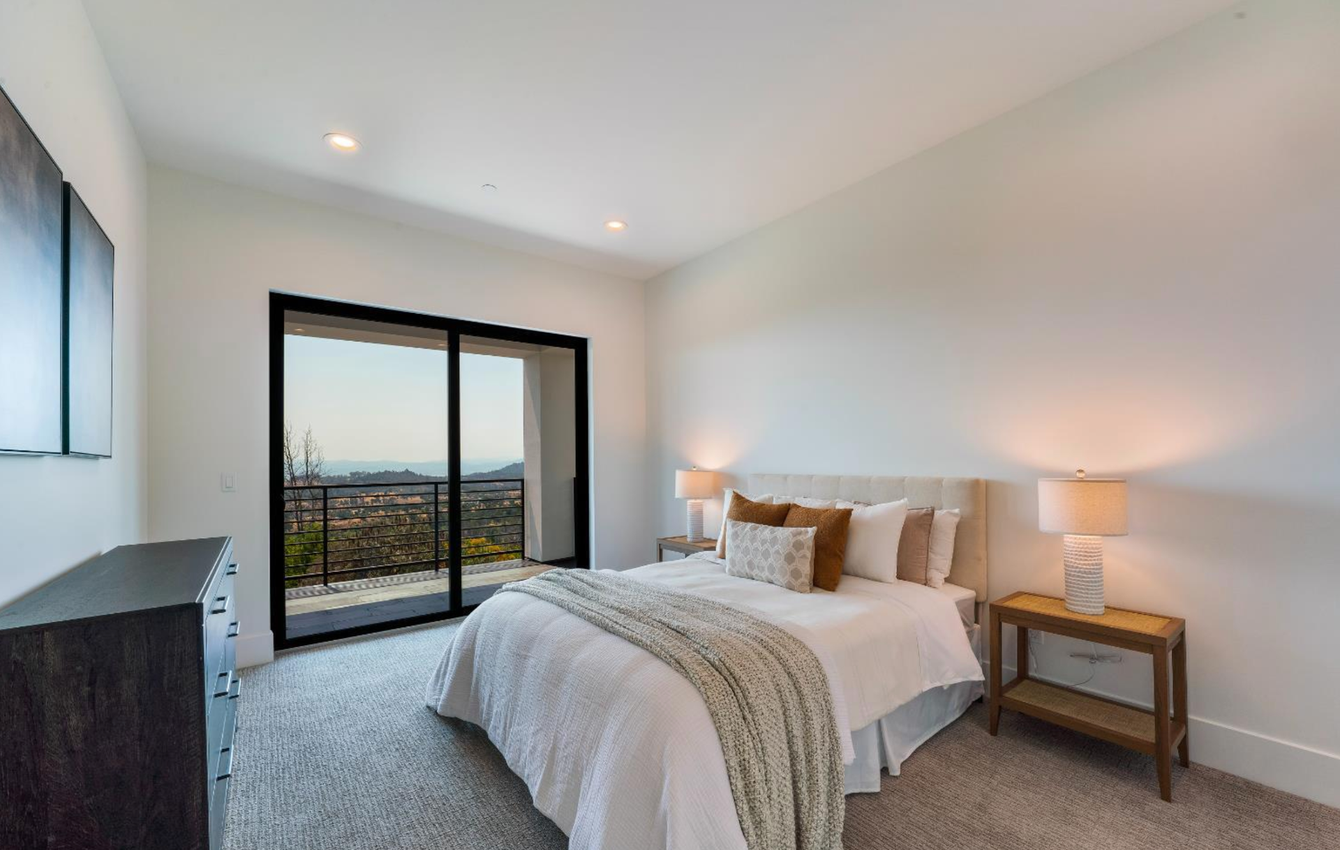 Elevated above the valley on 3.67 acres, this architecturally refined Wine Country retreat offers uninterrupted panoramic views and a lifestyle defined by seamless indoor-outdoor living. Expansive terraces, an outdoor kitchen, and a resort-style pool with custom fountain and pool house invite effortless entertaining and everyday enjoyment. 10-foot glass entry doors usher in natural light and frame captivating vistas from the moment you arrive. The great room flows into a chef's kitchen with alder cabinetry, quartz countertops, a dual-fuel range with grill and griddle and a light-filled butler's pantry with wine storage. The main level also features a guest suite, a richly paneled powder room, and a serene primary suite with a generous walk-in closet and a spa-like bath featuring a soaking tub, marble floors, and a floor-to-ceiling tiled shower. Downstairs, a spacious family/game room opens to a second view deck, accompanied by two additional bedrooms and a designer full bath with dual sinks. Above the home, a mature olive grove crowns the landscape, while the acreage offers versatility for future vision whether garden, hobby vineyard, shop, or barn.
