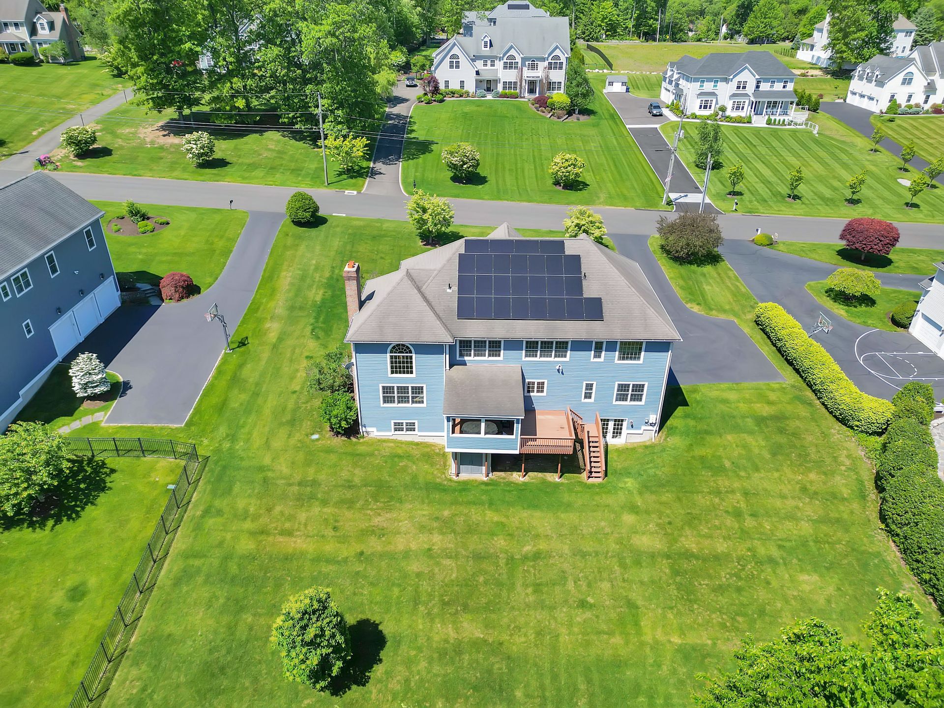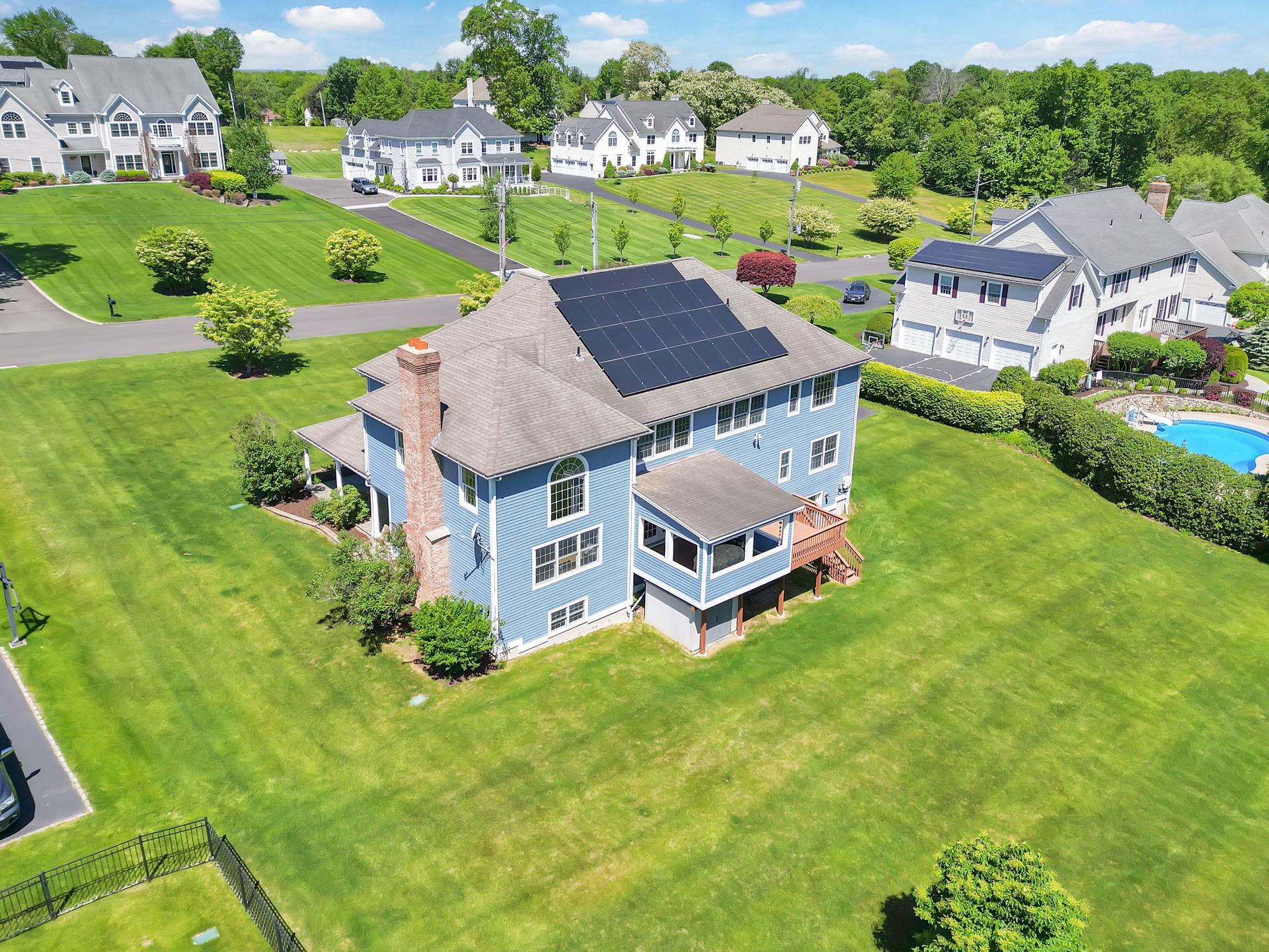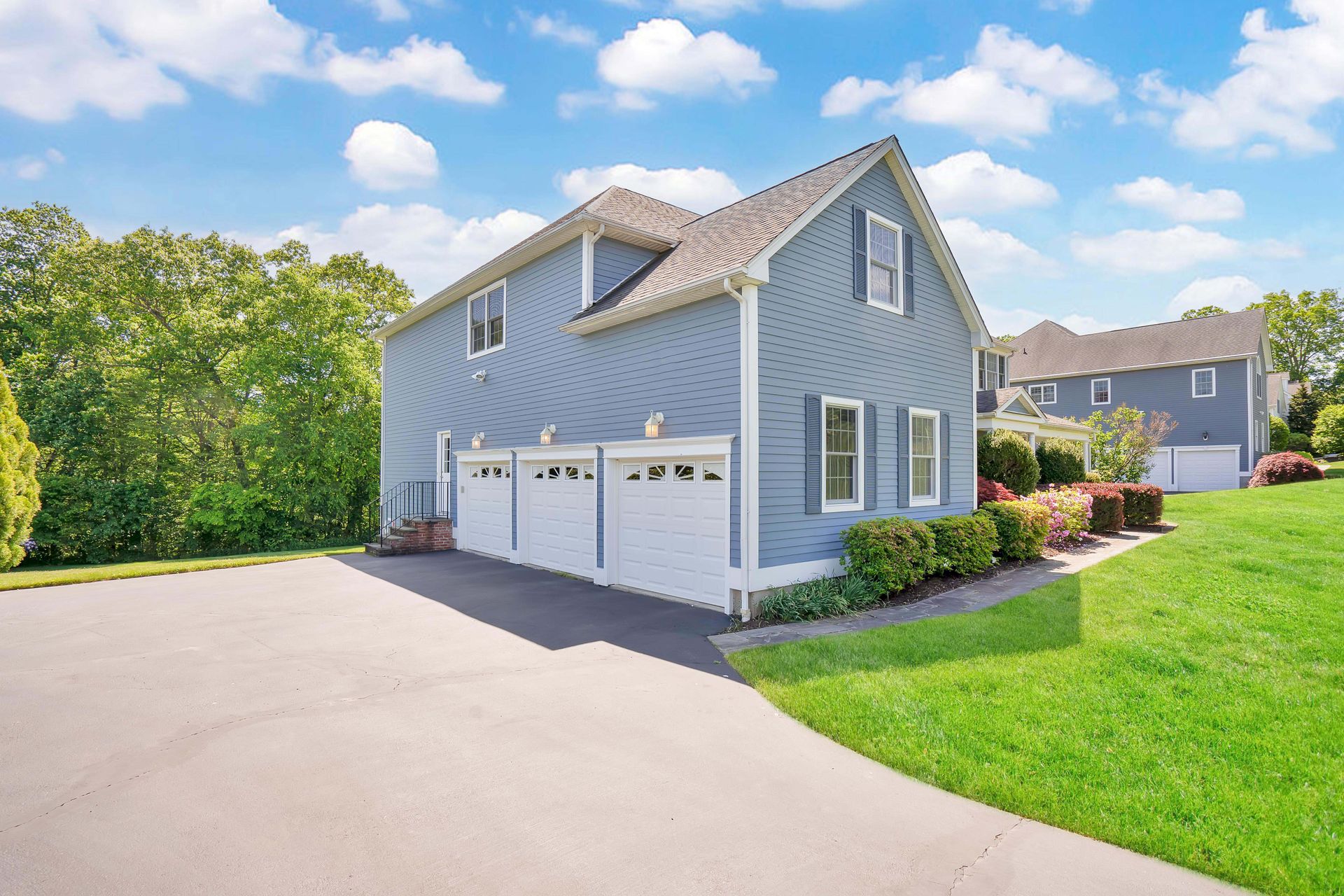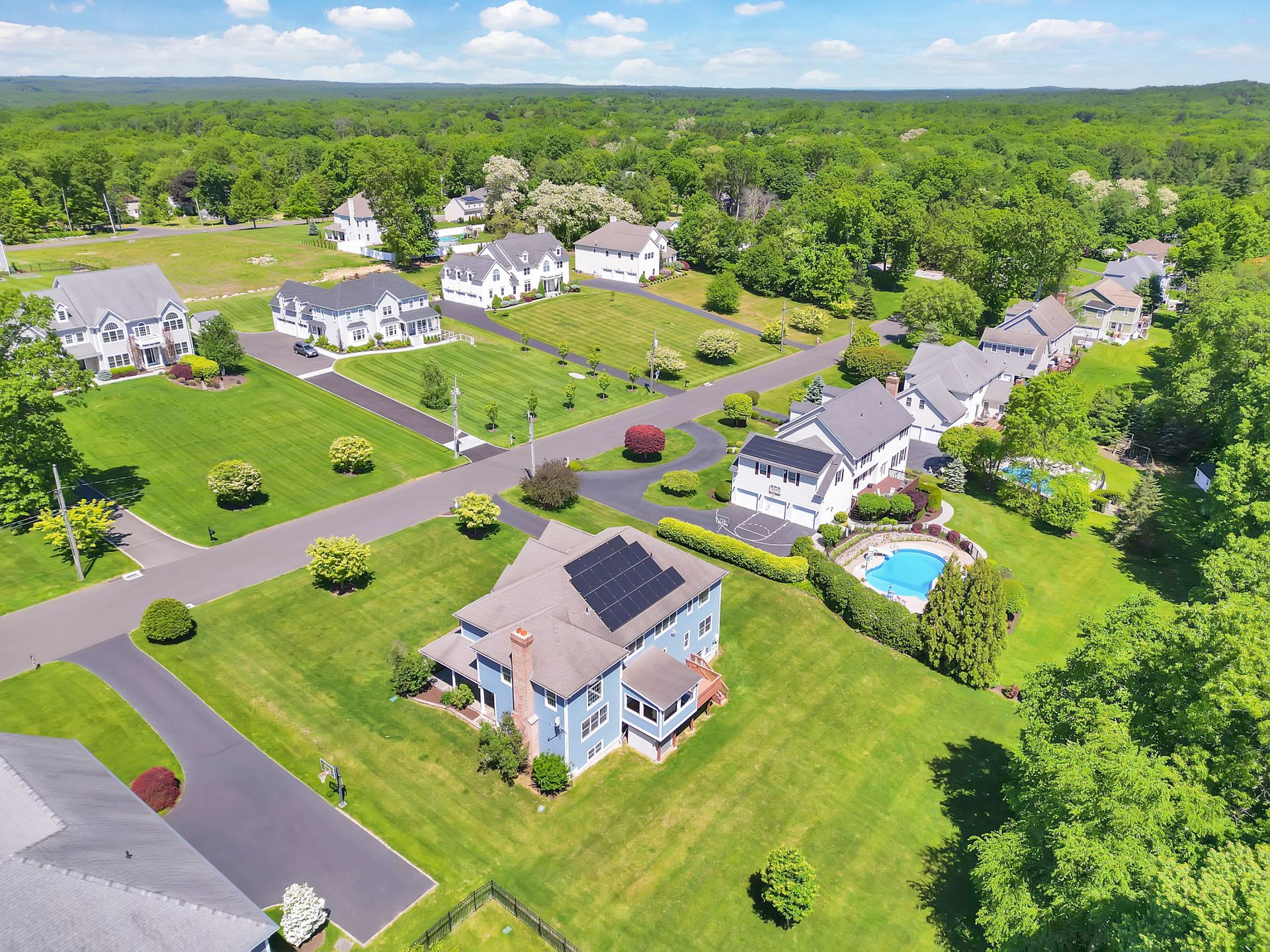 Call Fredda for a private showing of this lovely home - 203-521-0300. Showings start Friday, 06/30, and we will hold an open house on Saturday, 7/1, from 10:00 am - 12:00 pm. Come and see! You will be immediately impressed with this beautiful 2002 built almost 4,000 sf 5 br, 4.5 bath colonial featuring a delightful wrap-around front porch with natural stone floor, 3 car garage, and level .81-acre property in delightful Jenny Ridge Estates, a desirable newer community of exceptional homes. Move right into this elegant home, perfect for entertaining with a spacious kitchen with granite counters open to the delightful two-story family room with a fieldstone fireplace and a spacious covered deck. The lovely yard features many flowering plantings, an invisible fence, and irrigation providing year-round fun. The terrific ensuite main-level bedroom provides a wonderful guest or home office space. The vast lower level offers direct walk-out access to the terrific property and full-sized windows, providing many finishing options. The primary bedroom suite has a spacious sitting area, tray ceilings, a custom-built walk-in closet, and a large bathroom. Living is easy with three additional 2nd-floor bedrooms, one with an ensuite bathroom and the other two with a jack-and-jill bathroom. This sunny home features stunning architecture and space with 9-foot ceilings, a great library, and a formal dining room - all featuring many unique accents, moldings, and details. Freshly painted throughout, this lovely home features oversized windows, gleaming hardwood floors, and new carpeting. You will love the clean elegance of this unique home and all of the extras it provides. Special features include underground utilities, public sewers (without any assessment), clapboard siding, and energy-efficient solar panels. This award-winning Daniels Farm Elementary neighborhood home is near town pools, public golf, and walking/biking trails. It also enjoys easy access to shops and commuting, making this delightful home a winning option.