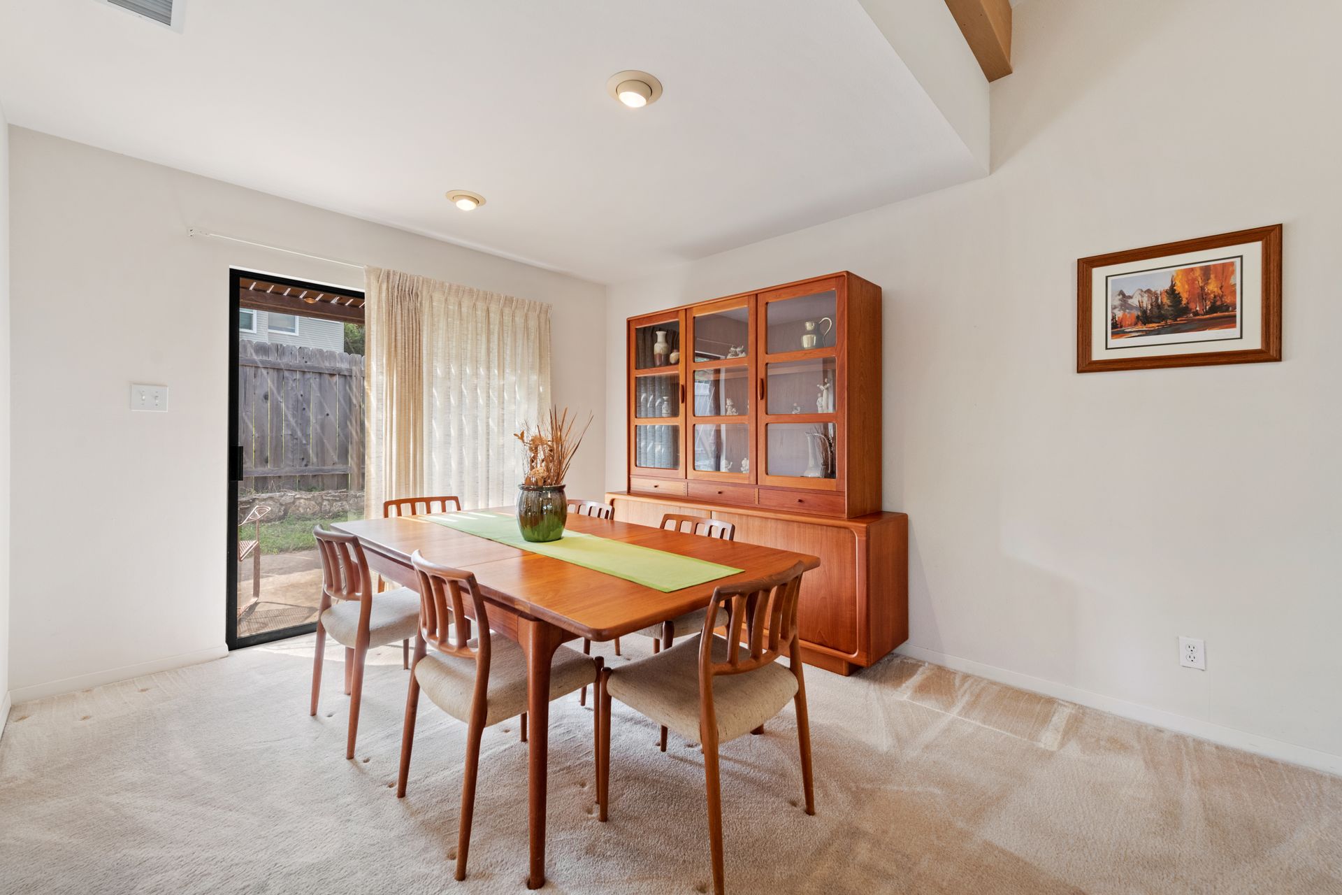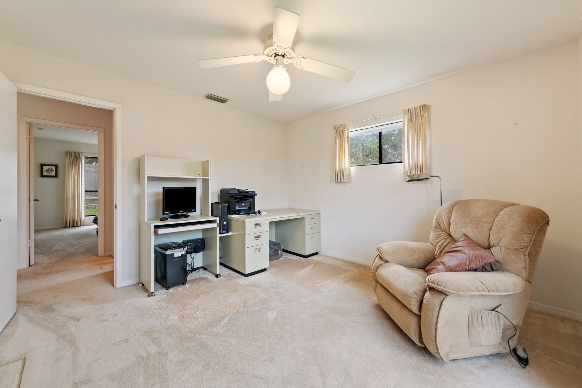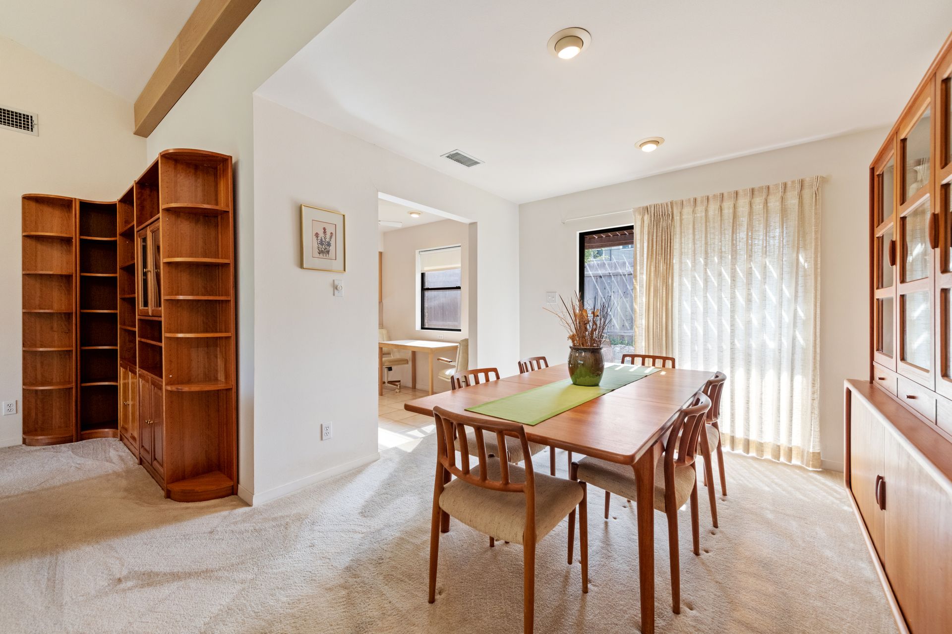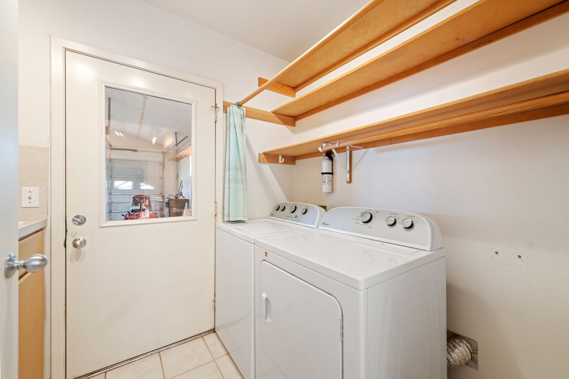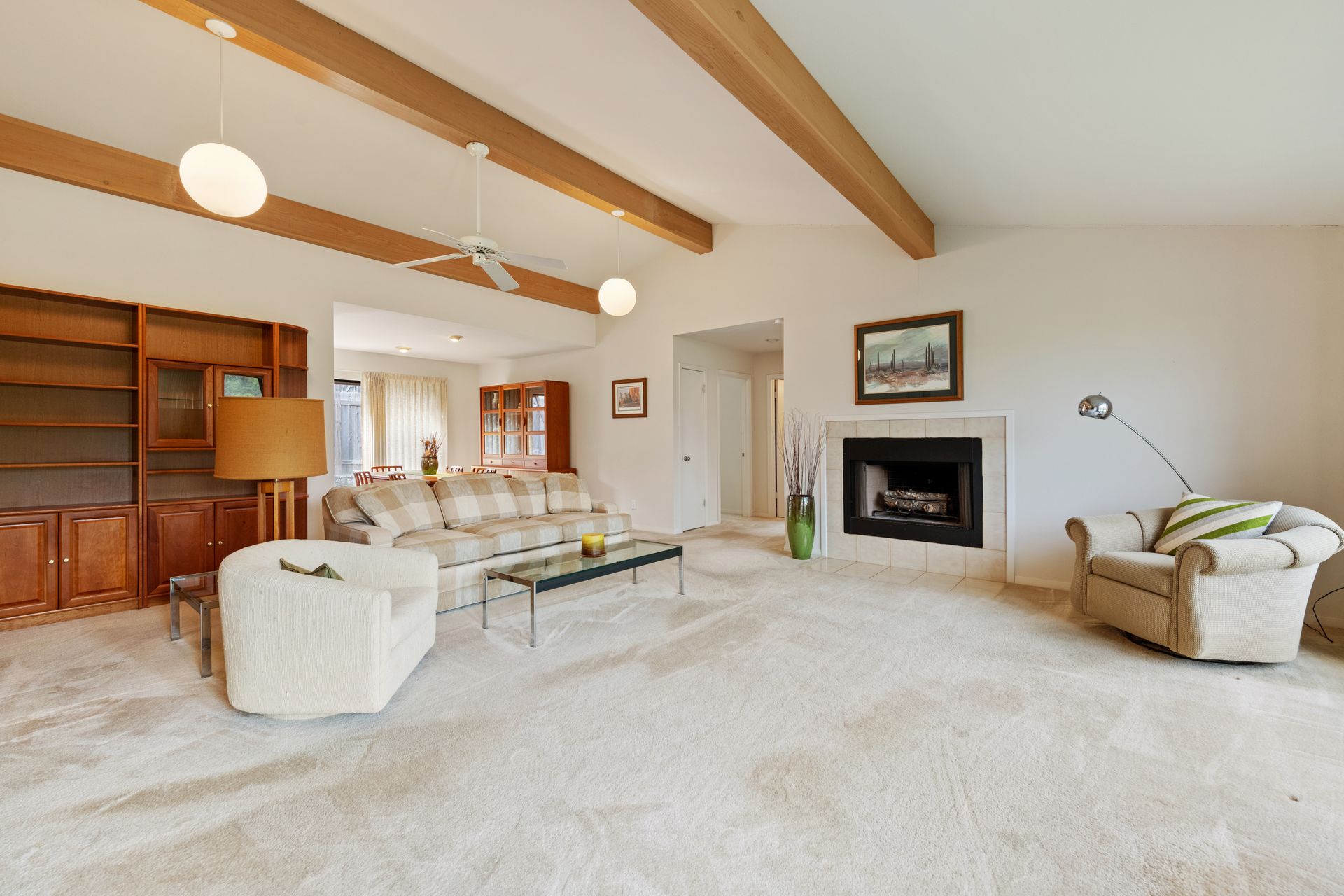 It features an open living/family room with a wood-burning fireplace and high beamed ceilings. The adjoining dining room opens to a side porch and a galley kitchen with light-colored cabinets and all GE appliances: electric stovetop, double oven and refrigerator included. The laundry room is off the kitchen (includes washer/dryer) and exits to the double garage. There are three bedrooms and two full baths. The primary bedroom has two closets (walk-in closet in the en suite bathroom). Don’t miss the enclosed porch by the front door on a private, fenced-in yard (3 sides) with a large outdoor shed at the very back of the property.