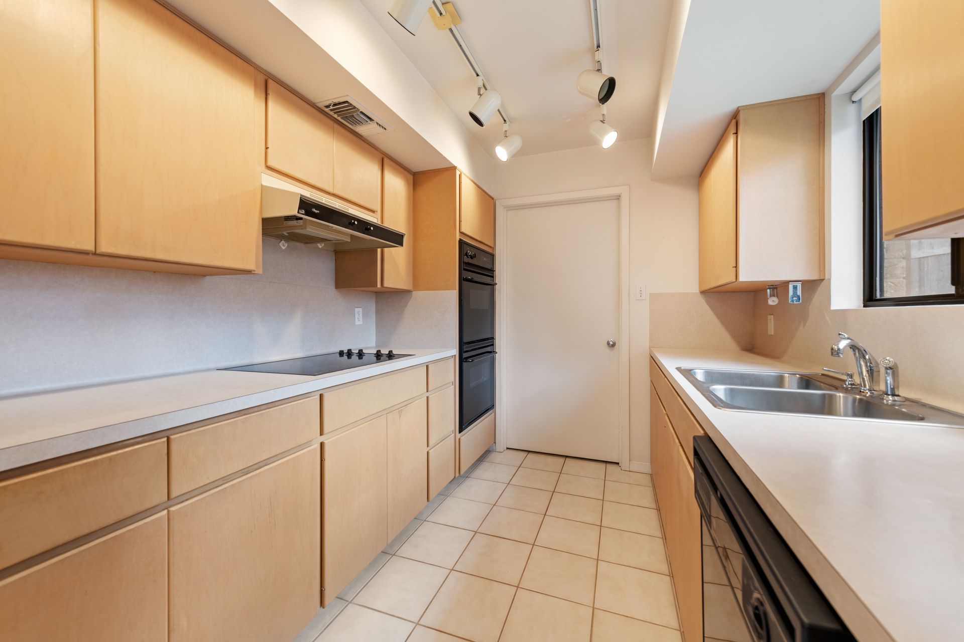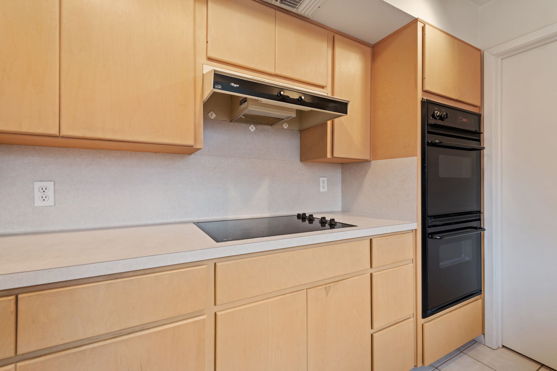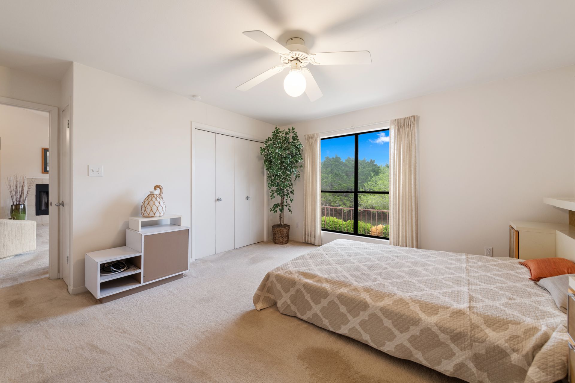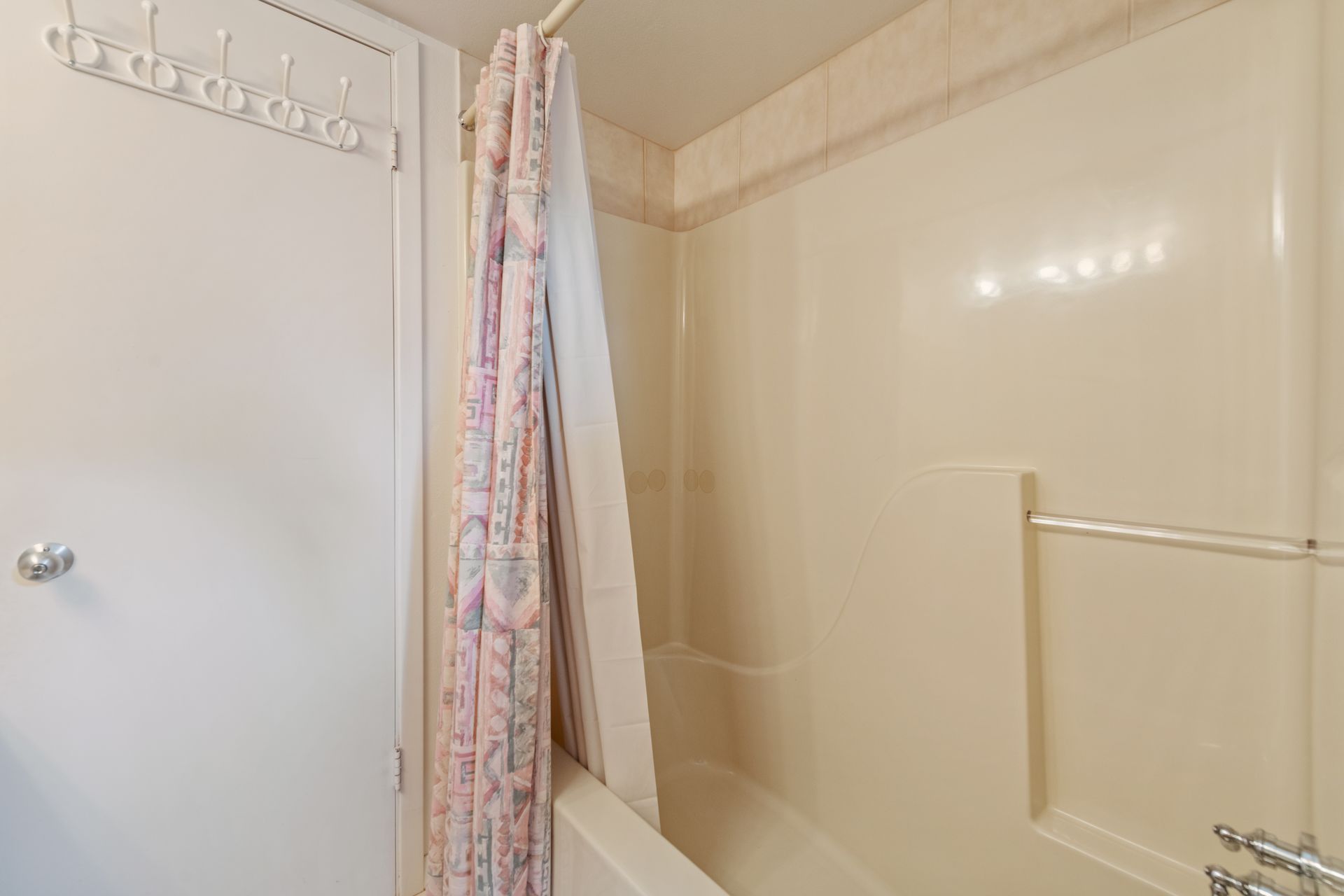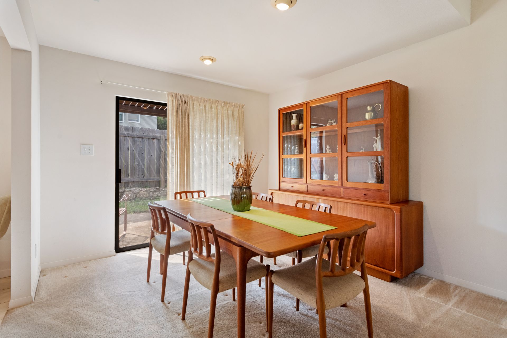 It features an open living/family room with a wood-burning fireplace and high beamed ceilings. The adjoining dining room opens to a side porch and a galley kitchen with light-colored cabinets and all GE appliances: electric stovetop, double oven and refrigerator included. The laundry room is off the kitchen (includes washer/dryer) and exits to the double garage. There are three bedrooms and two full baths. The primary bedroom has two closets (walk-in closet in the en suite bathroom). Don’t miss the enclosed porch by the front door on a private, fenced-in yard (3 sides) with a large outdoor shed at the very back of the property.