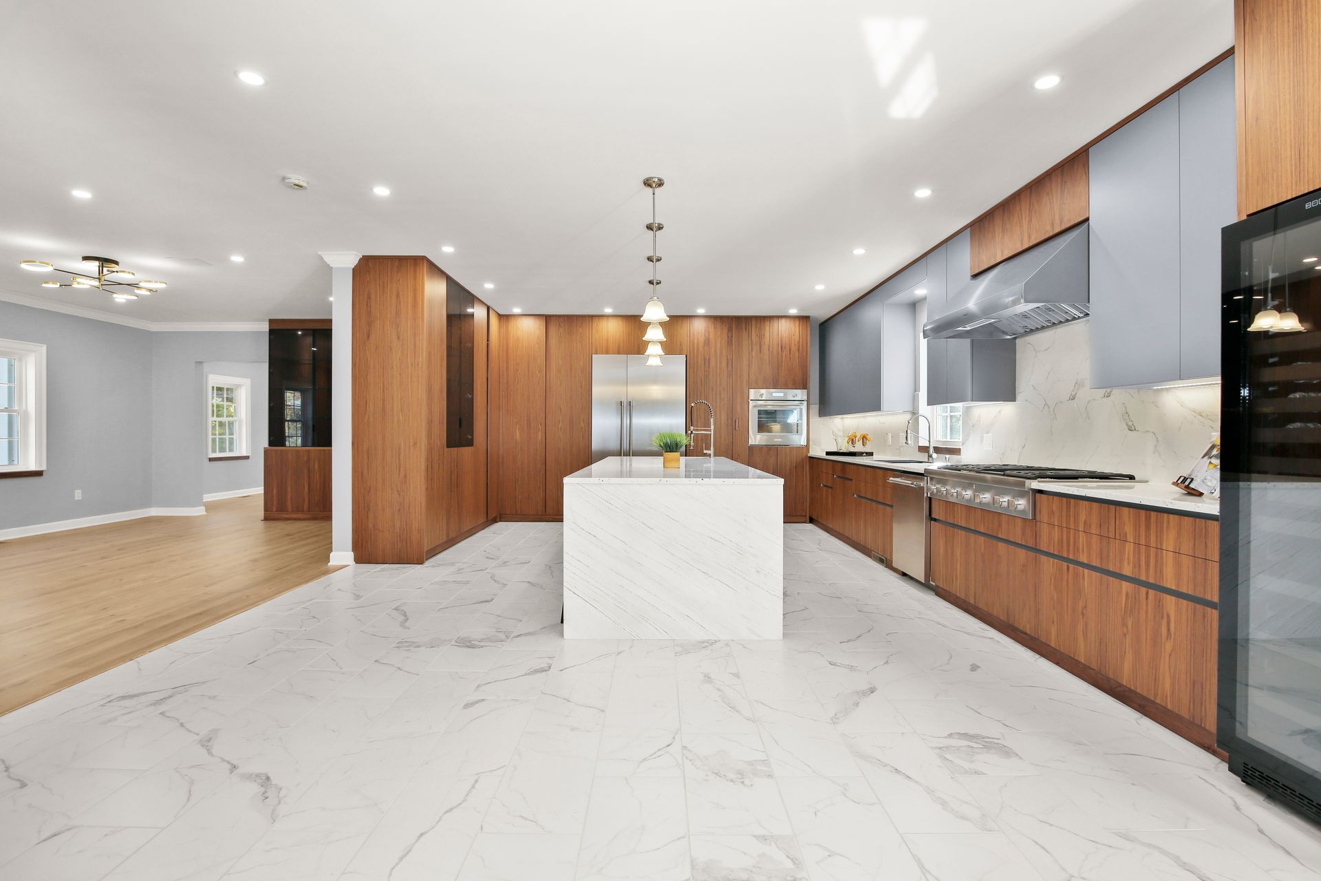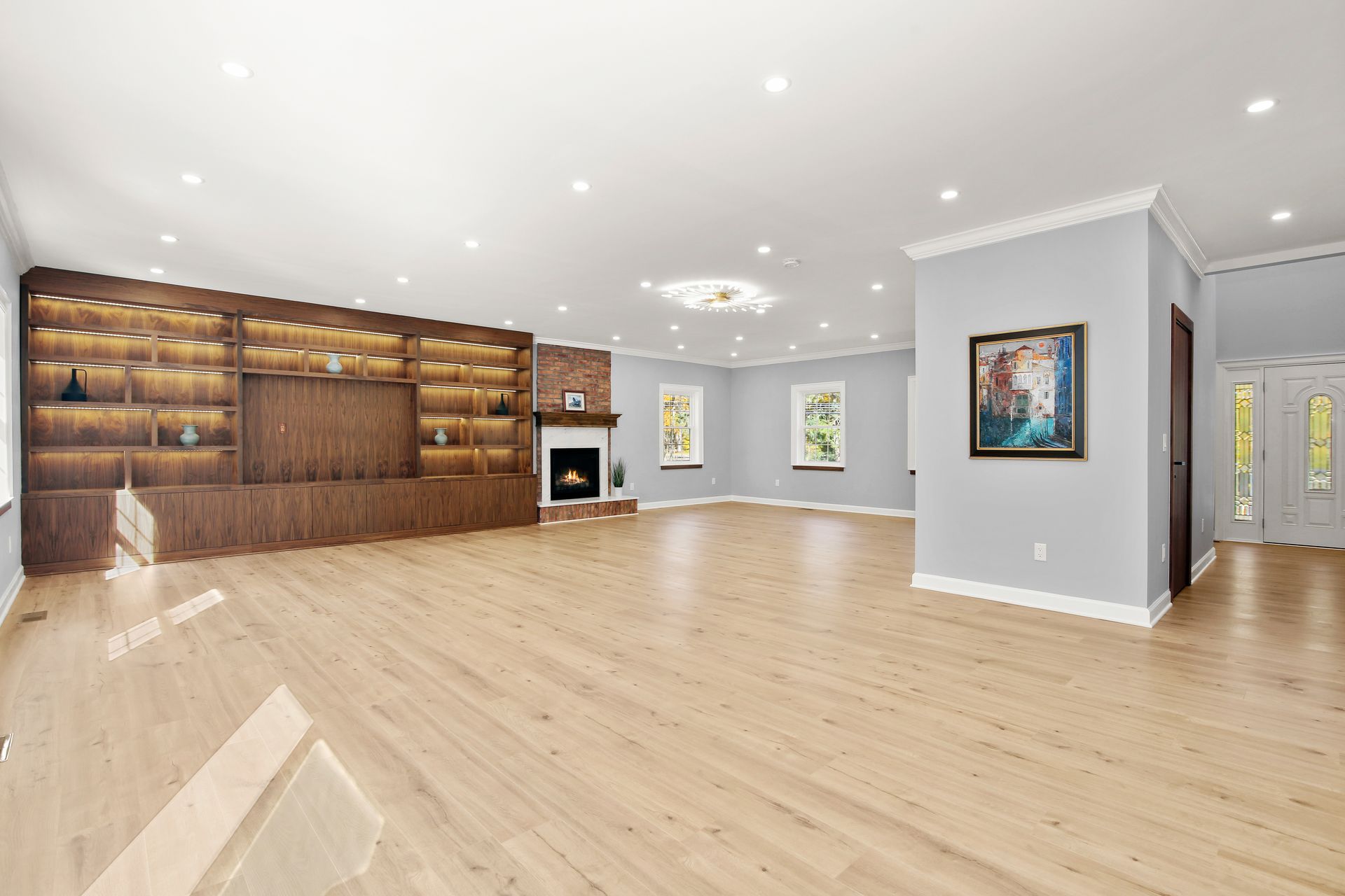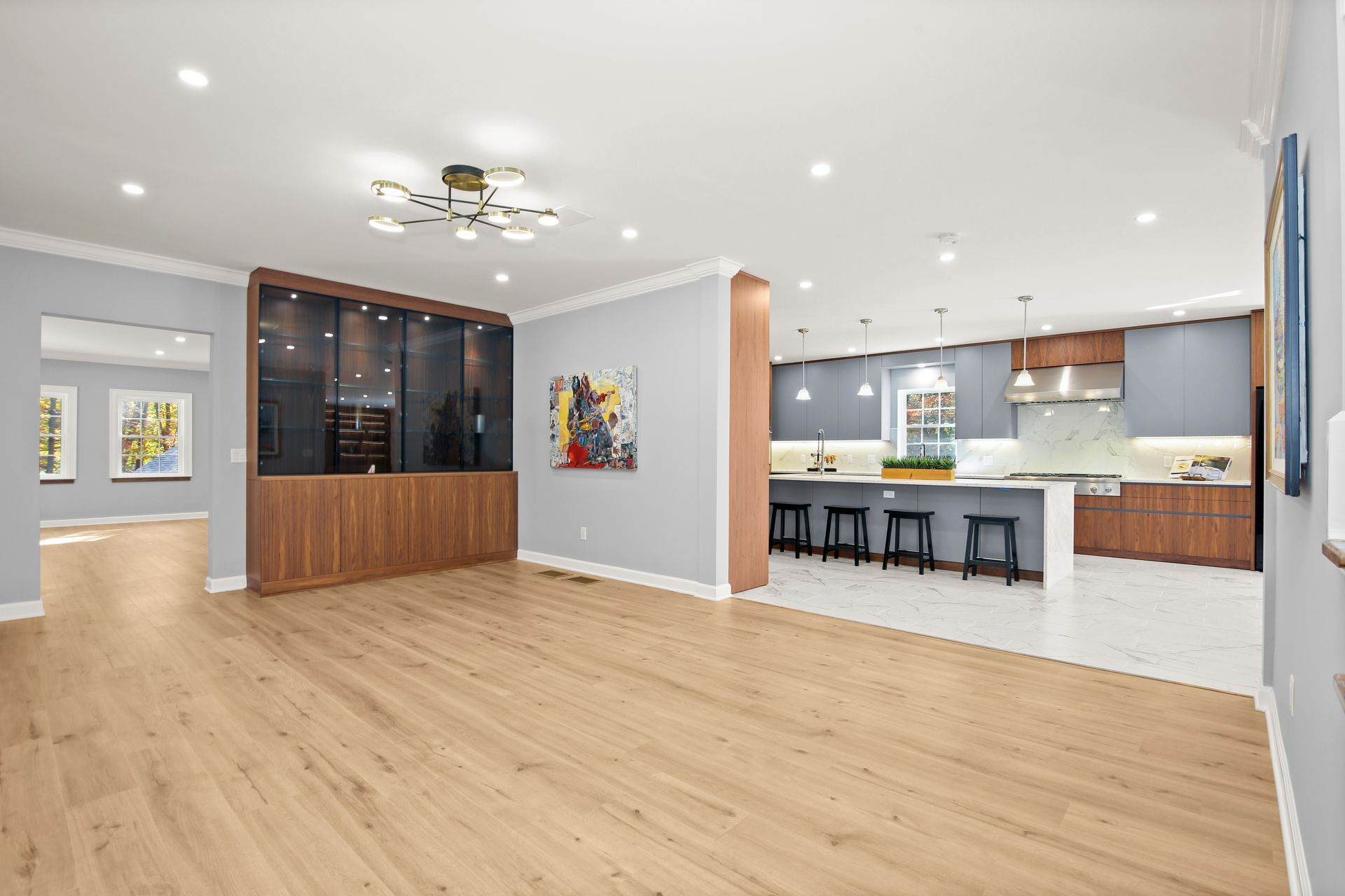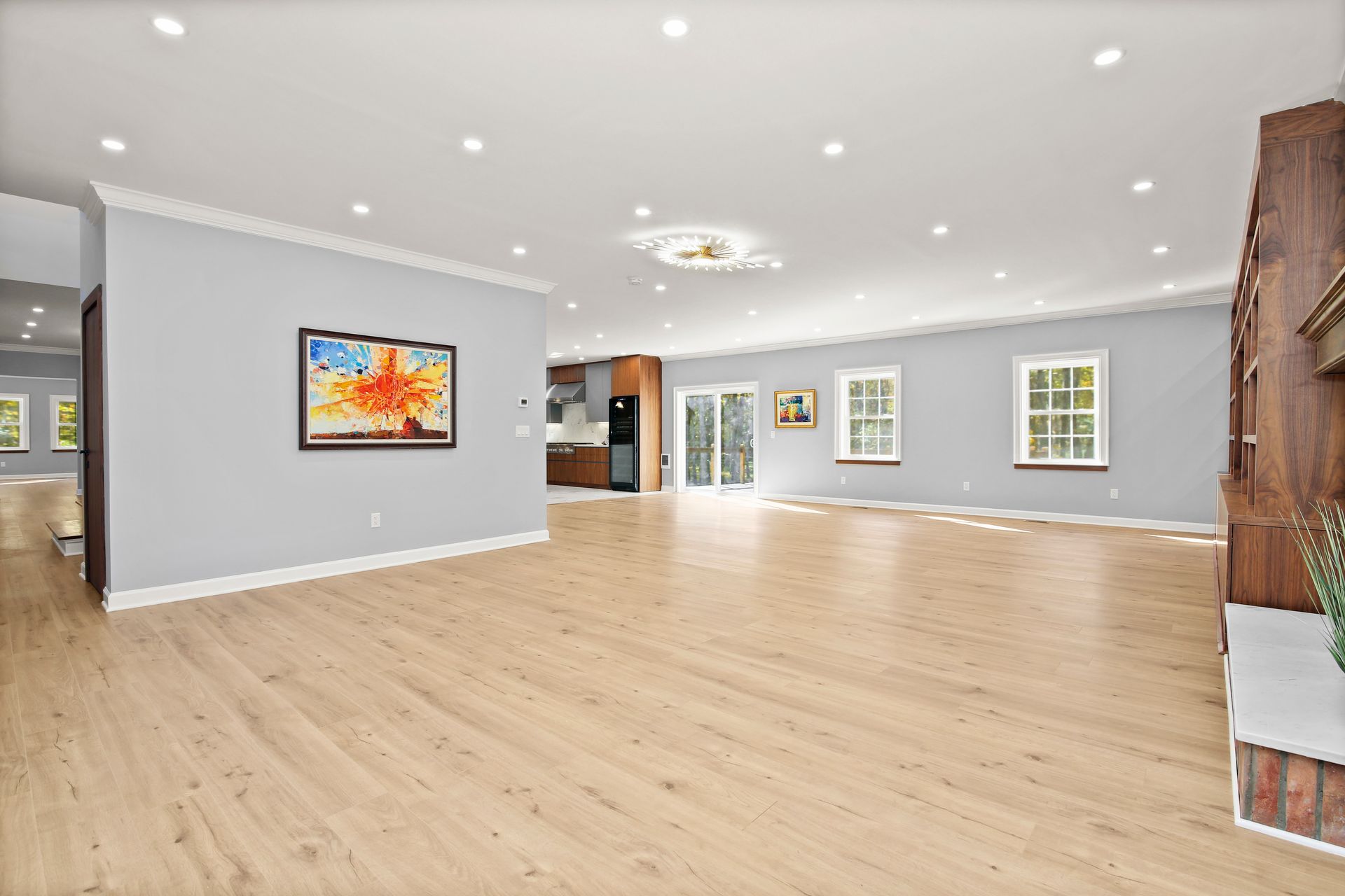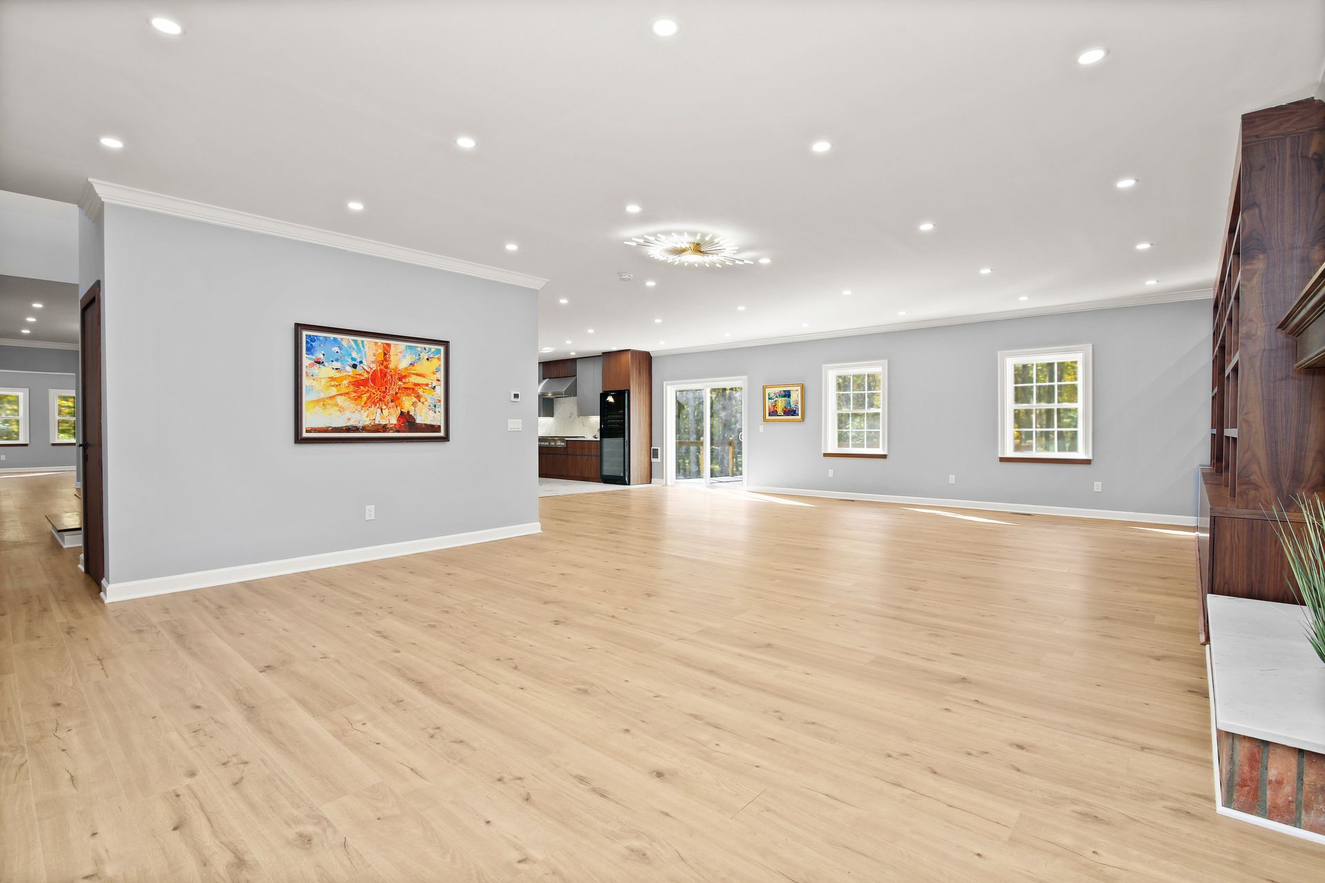 Upon arrival, the semi-circular driveway and bright 2-story foyer set the stage for the elegance within. The open living spaces are bathed in natural light, featuring European cabinetry, custom doors, and stunning built-ins. A grand great room with a fireplace, an elegant dining area, and a versatile flex room—perfect for a family room, artist studio, or home office—provide a range of possibilities. The flex room, complete with a separate entrance, fireplace, deck, and full bath, offers privacy and convenience for various lifestyle needs.