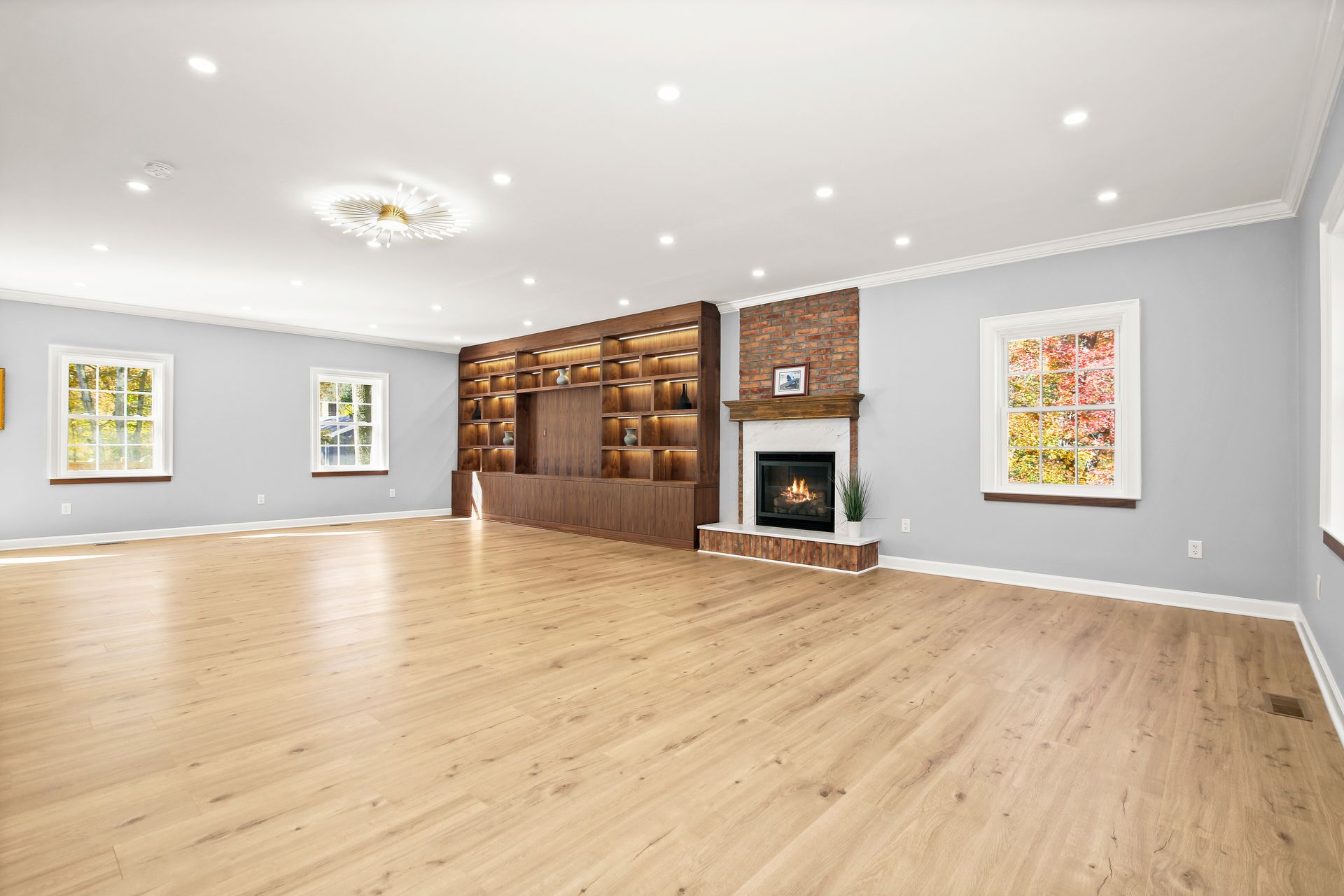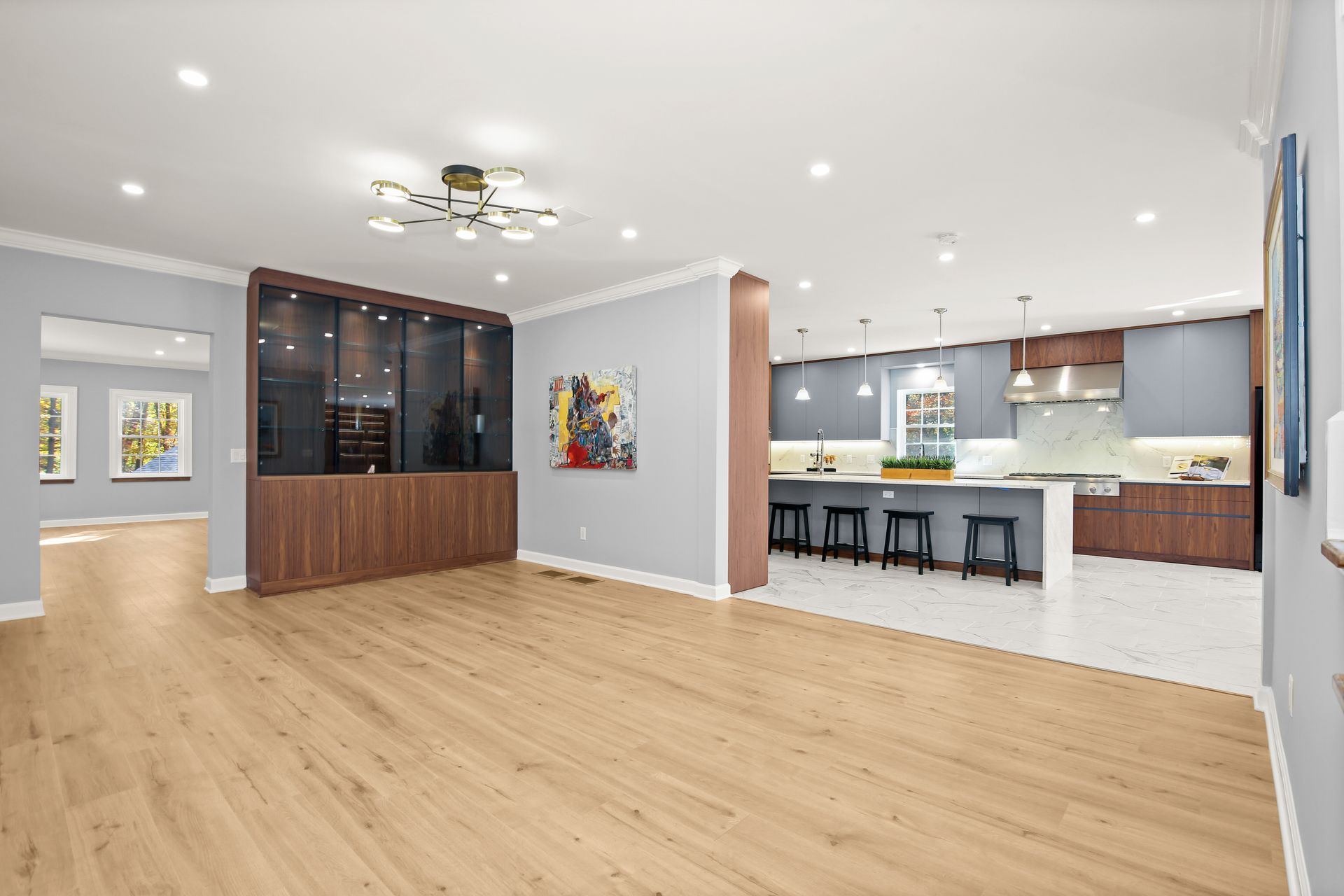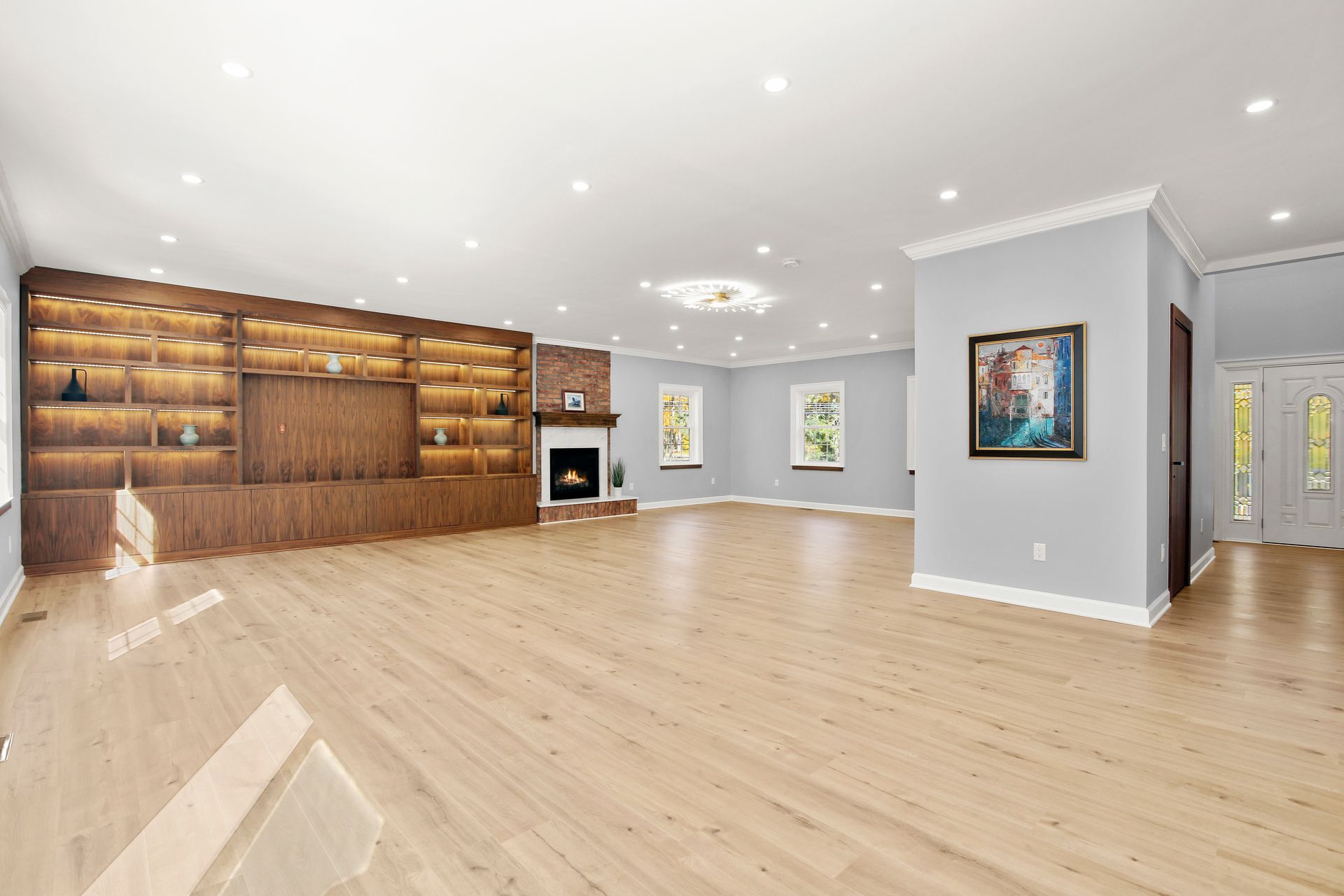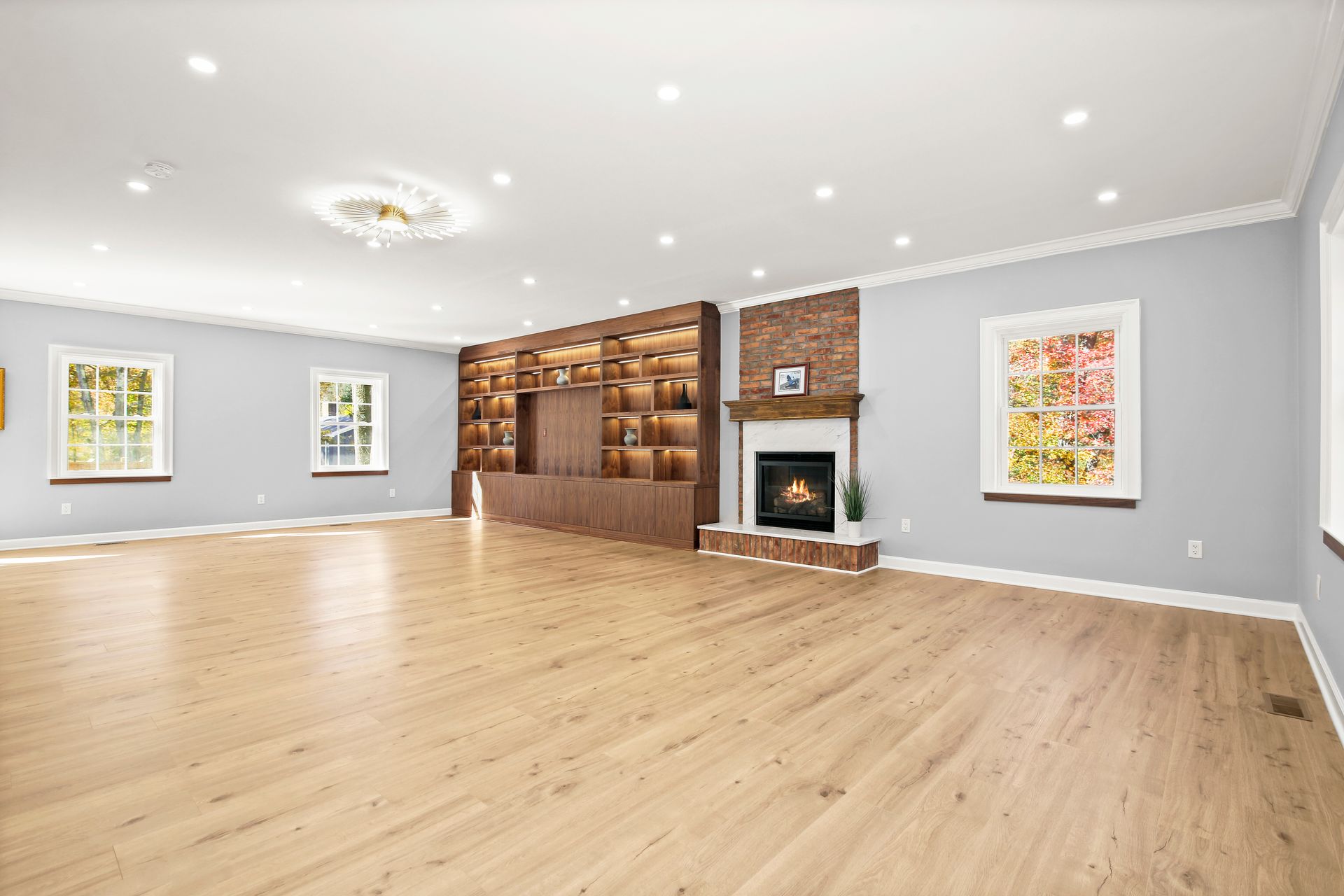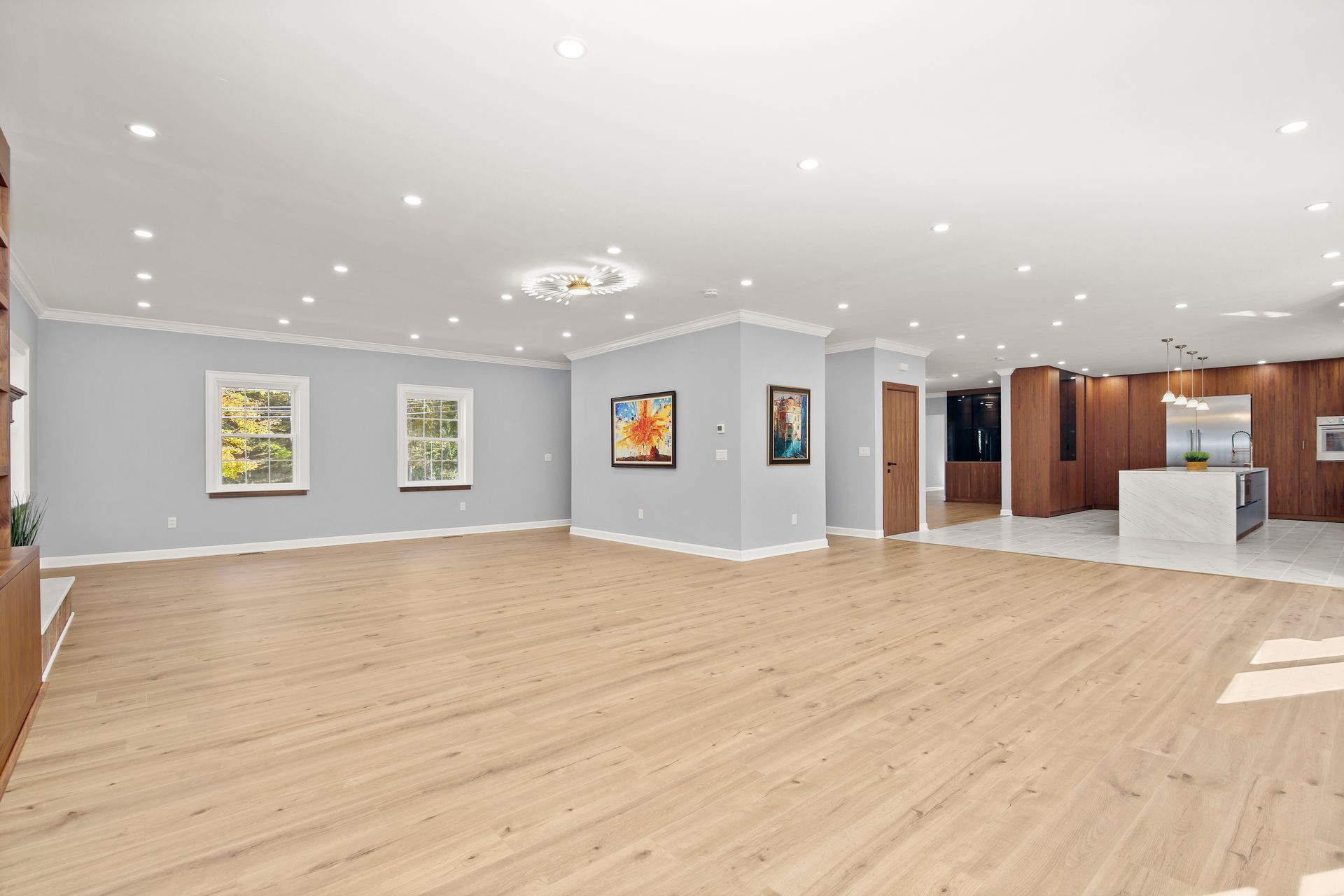 Upon arrival, the semi-circular driveway and bright 2-story foyer set the stage for the elegance within. The open living spaces are bathed in natural light, featuring European cabinetry, custom doors, and stunning built-ins. A grand great room with a fireplace, an elegant dining area, and a versatile flex room—perfect for a family room, artist studio, or home office—provide a range of possibilities. The flex room, complete with a separate entrance, fireplace, deck, and full bath, offers privacy and convenience for various lifestyle needs.