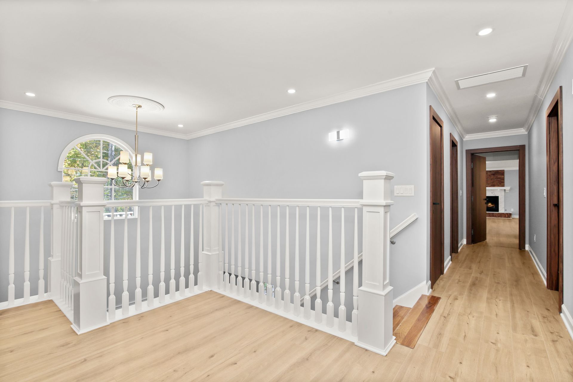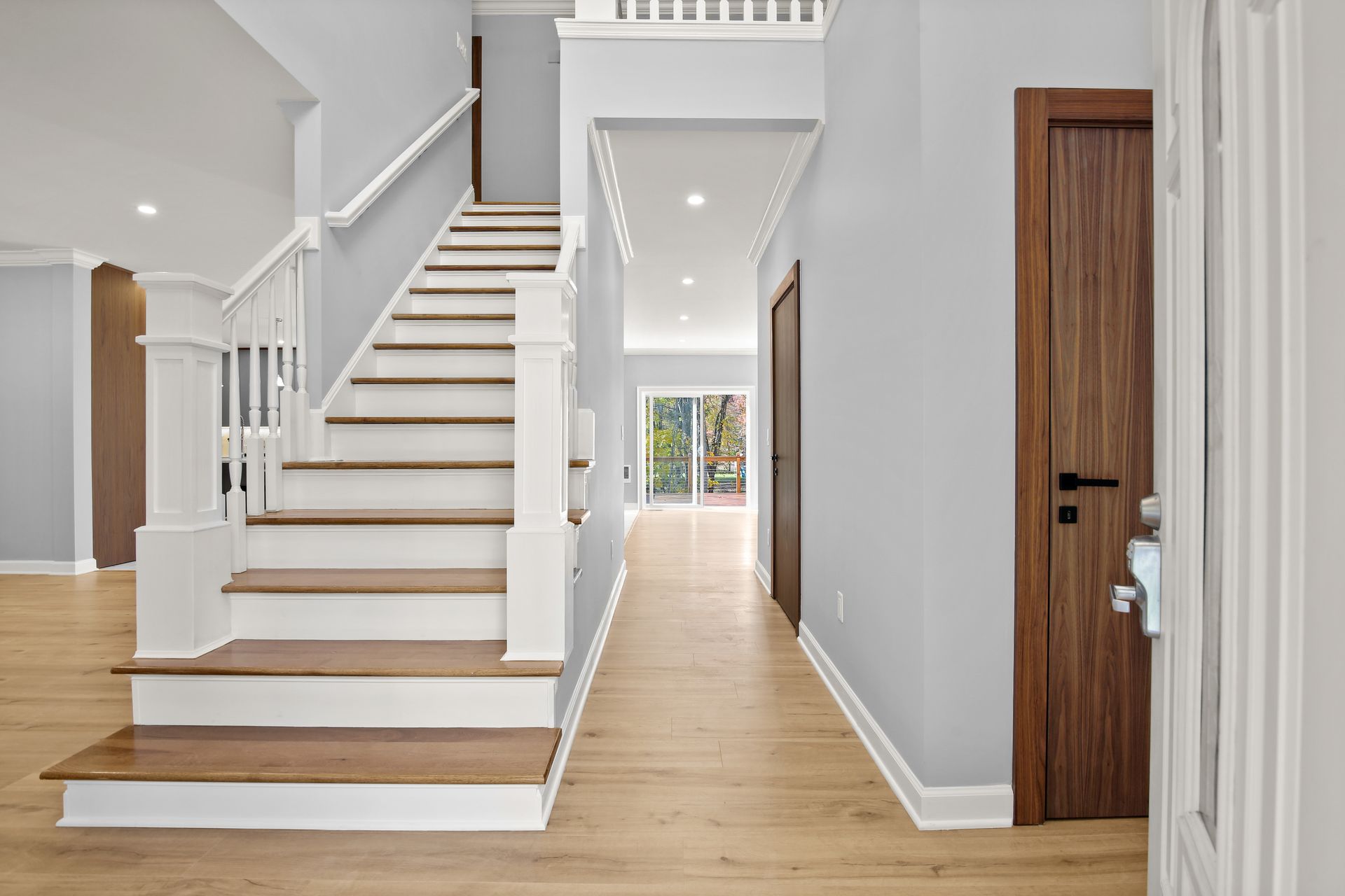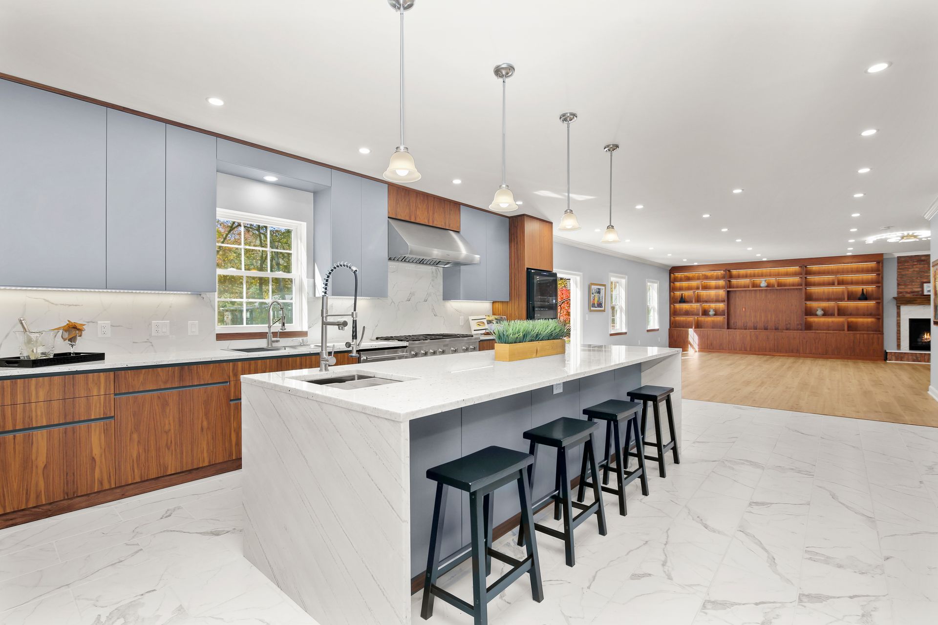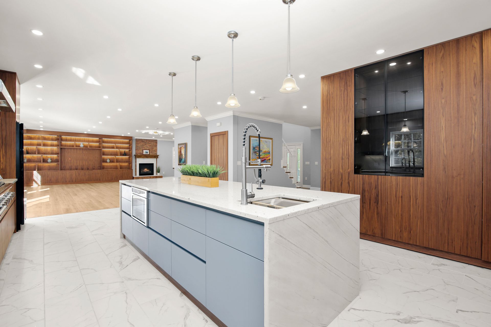 Upon arrival, the semi-circular driveway and bright 2-story foyer set the stage for the elegance within. The open living spaces are bathed in natural light, featuring European cabinetry, custom doors, and stunning built-ins. A grand great room with a fireplace, an elegant dining area, and a versatile flex room—perfect for a family room, artist studio, or home office—provide a range of possibilities. The flex room, complete with a separate entrance, fireplace, deck, and full bath, offers privacy and convenience for various lifestyle needs.