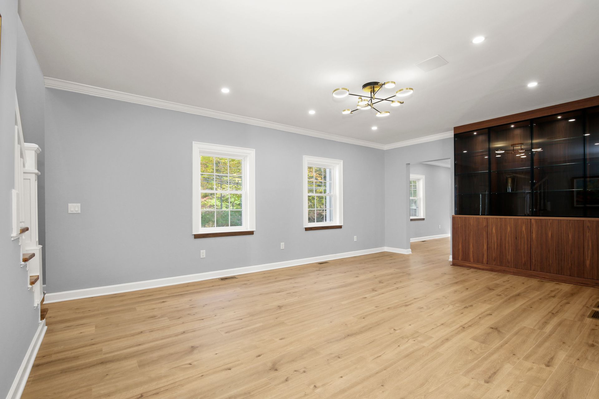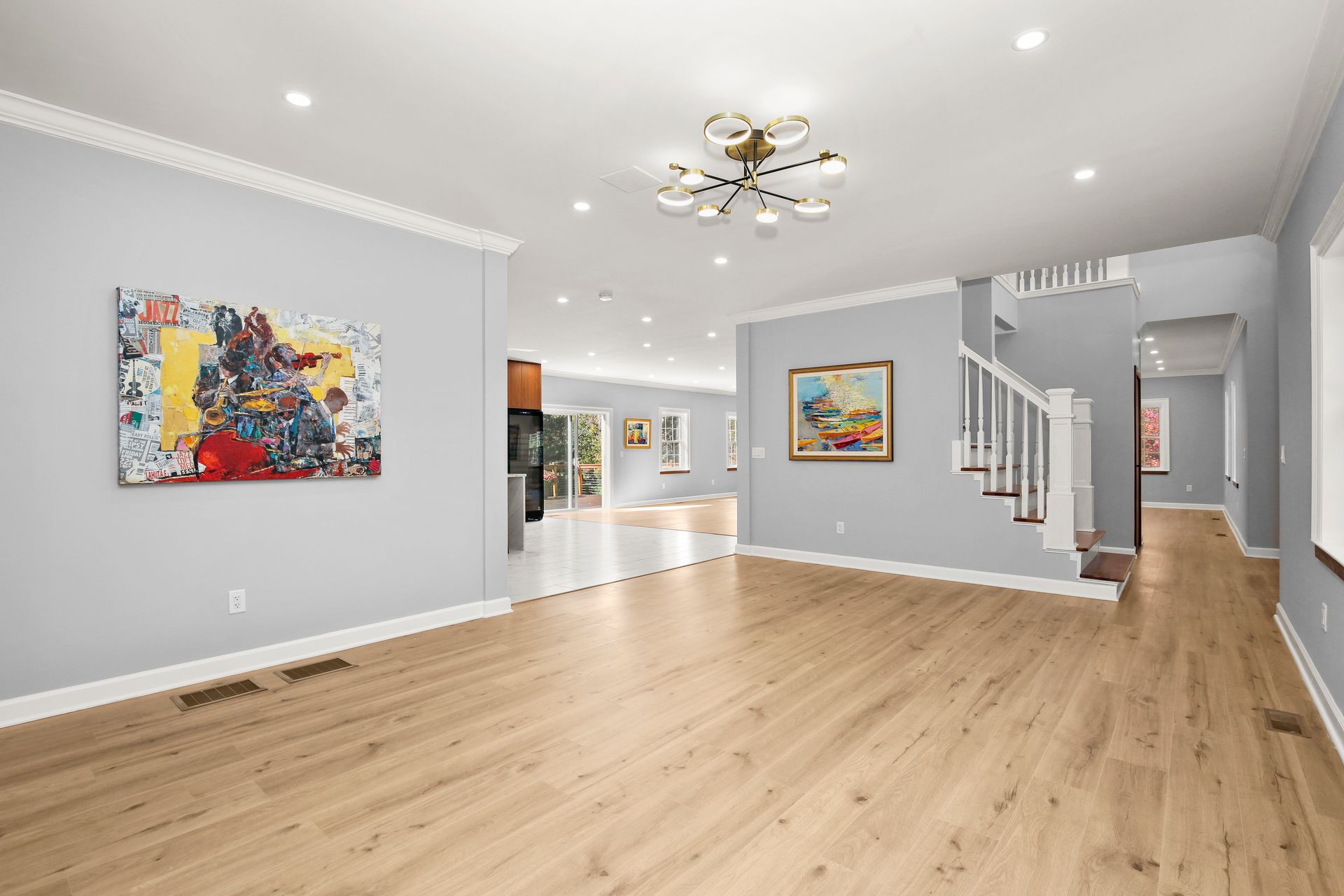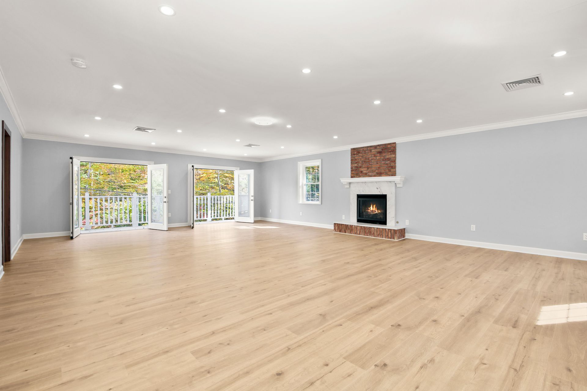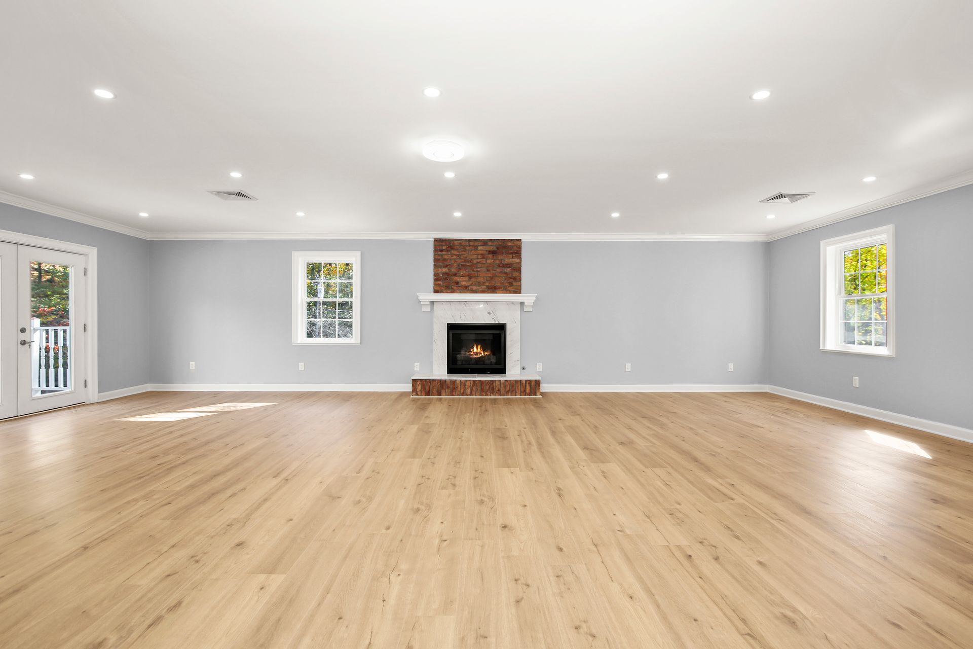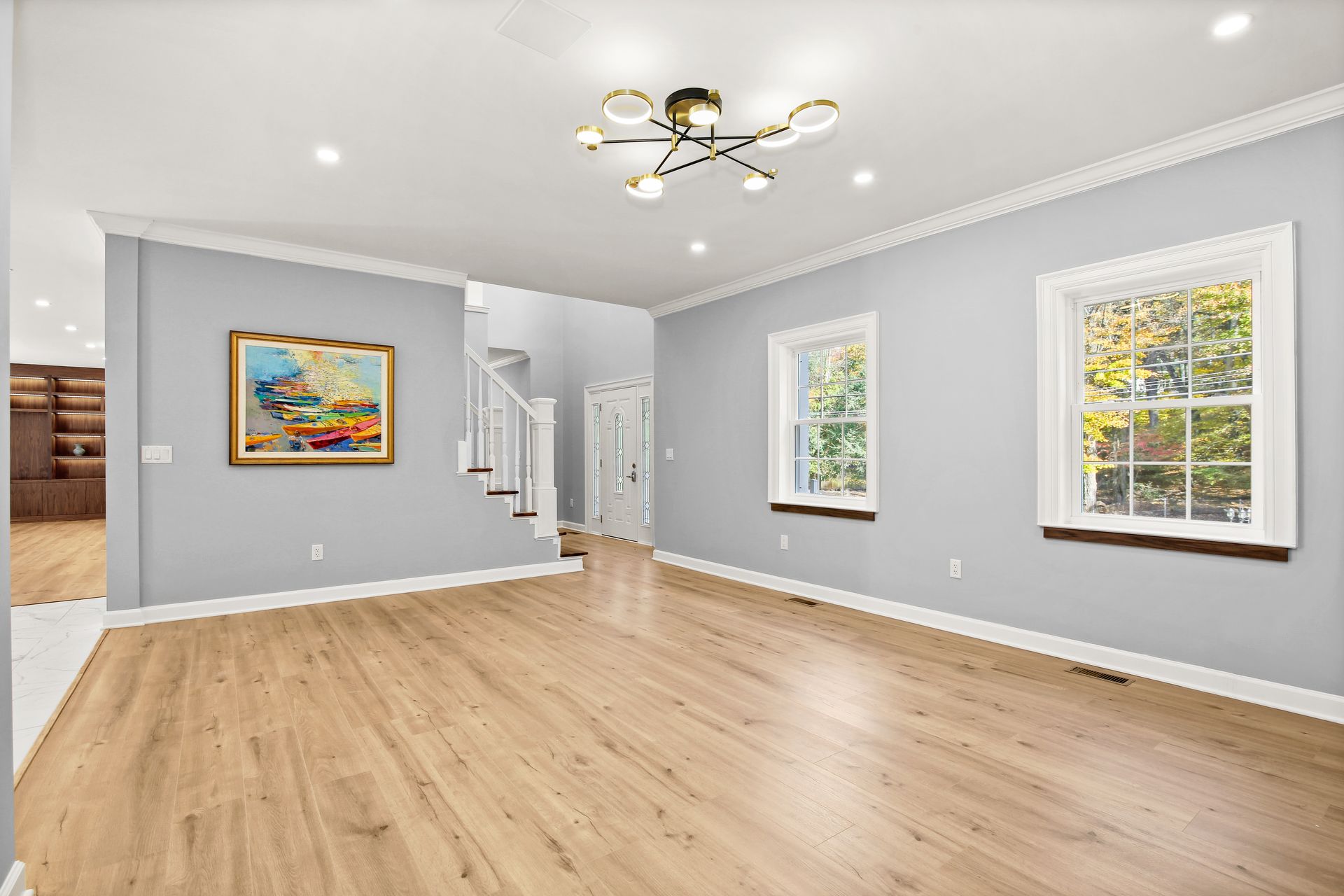 Upon arrival, the semi-circular driveway and bright 2-story foyer set the stage for the elegance within. The open living spaces are bathed in natural light, featuring European cabinetry, custom doors, and stunning built-ins. A grand great room with a fireplace, an elegant dining area, and a versatile flex room—perfect for a family room, artist studio, or home office—provide a range of possibilities. The flex room, complete with a separate entrance, fireplace, deck, and full bath, offers privacy and convenience for various lifestyle needs.