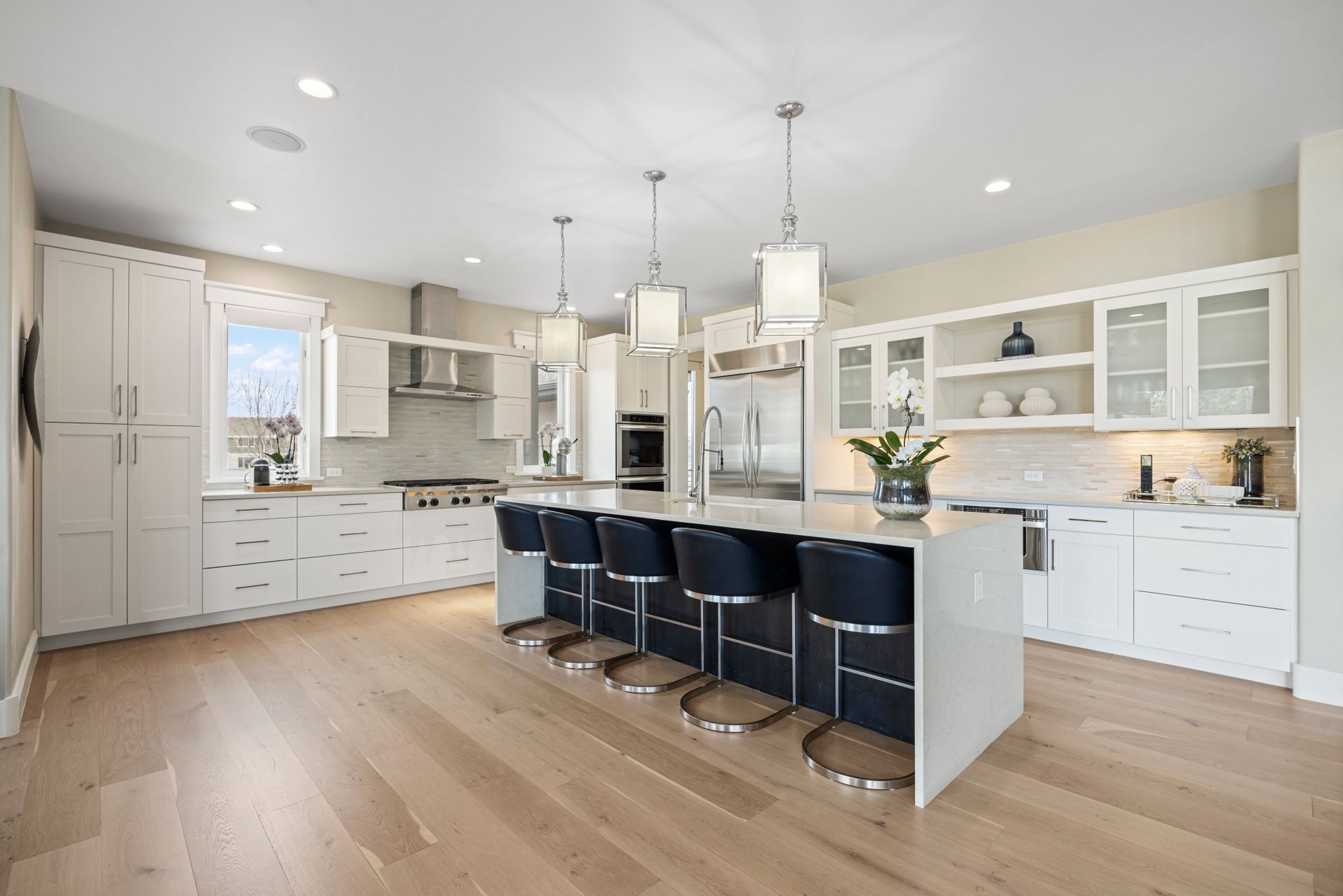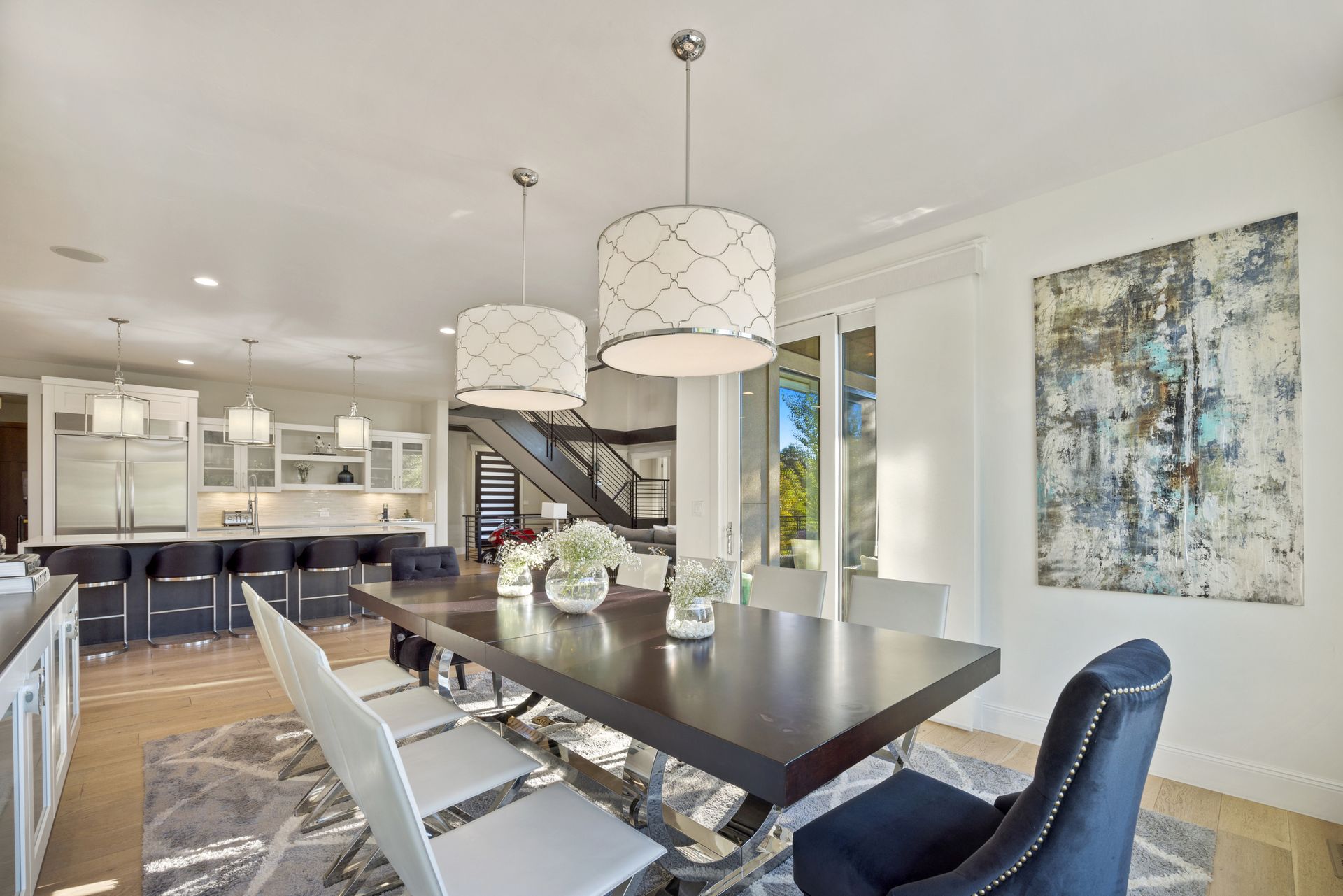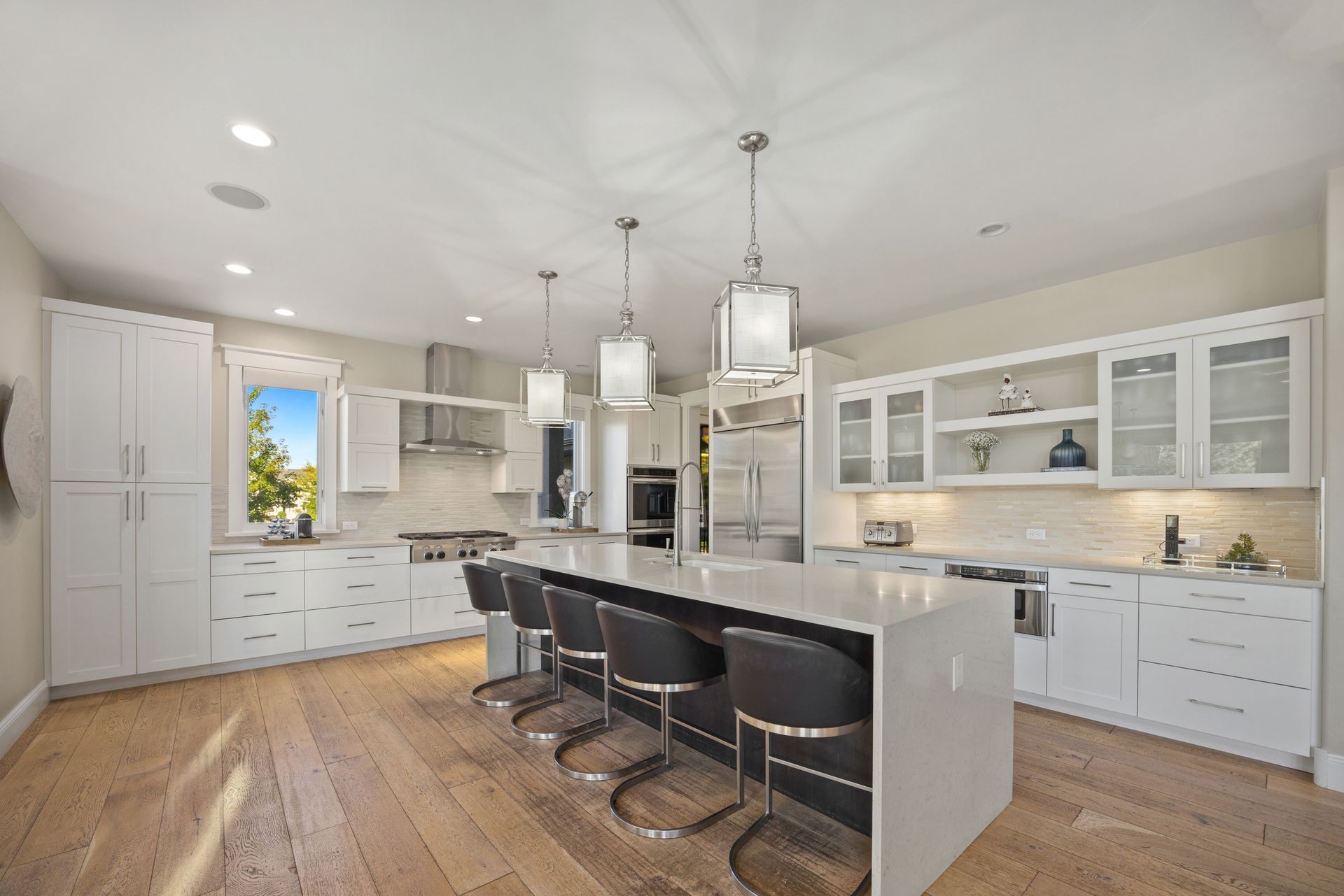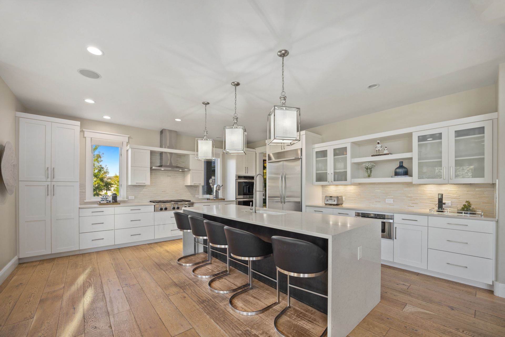 Expansive floor-to-ceiling windows and soaring ceilings fill the home with natural light, creating an open, airy ambiance. The gourmet chef’s kitchen is a showpiece, featuring top-of-the-line stainless steel appliances, custom Milarc cabinetry, and a spacious island—perfect for casual meals and elegant entertaining. The open-concept layout connects the kitchen, dining, and living areas, making every gathering feel effortless and inviting.