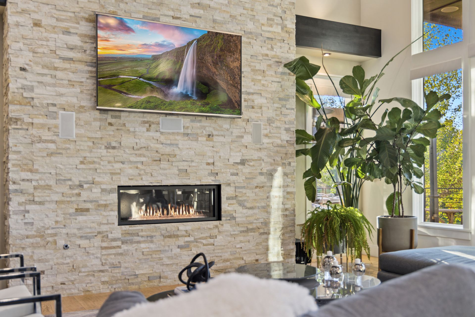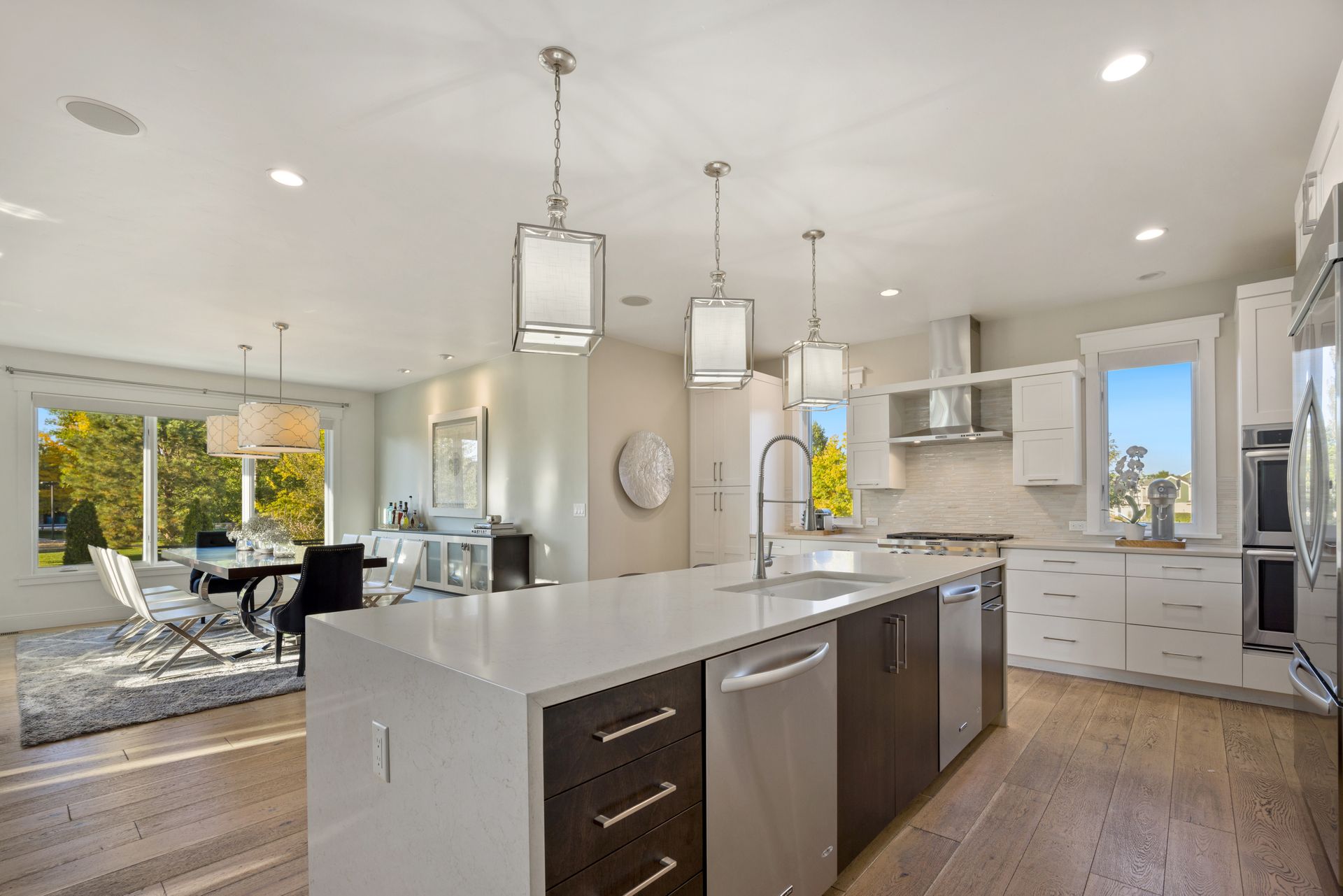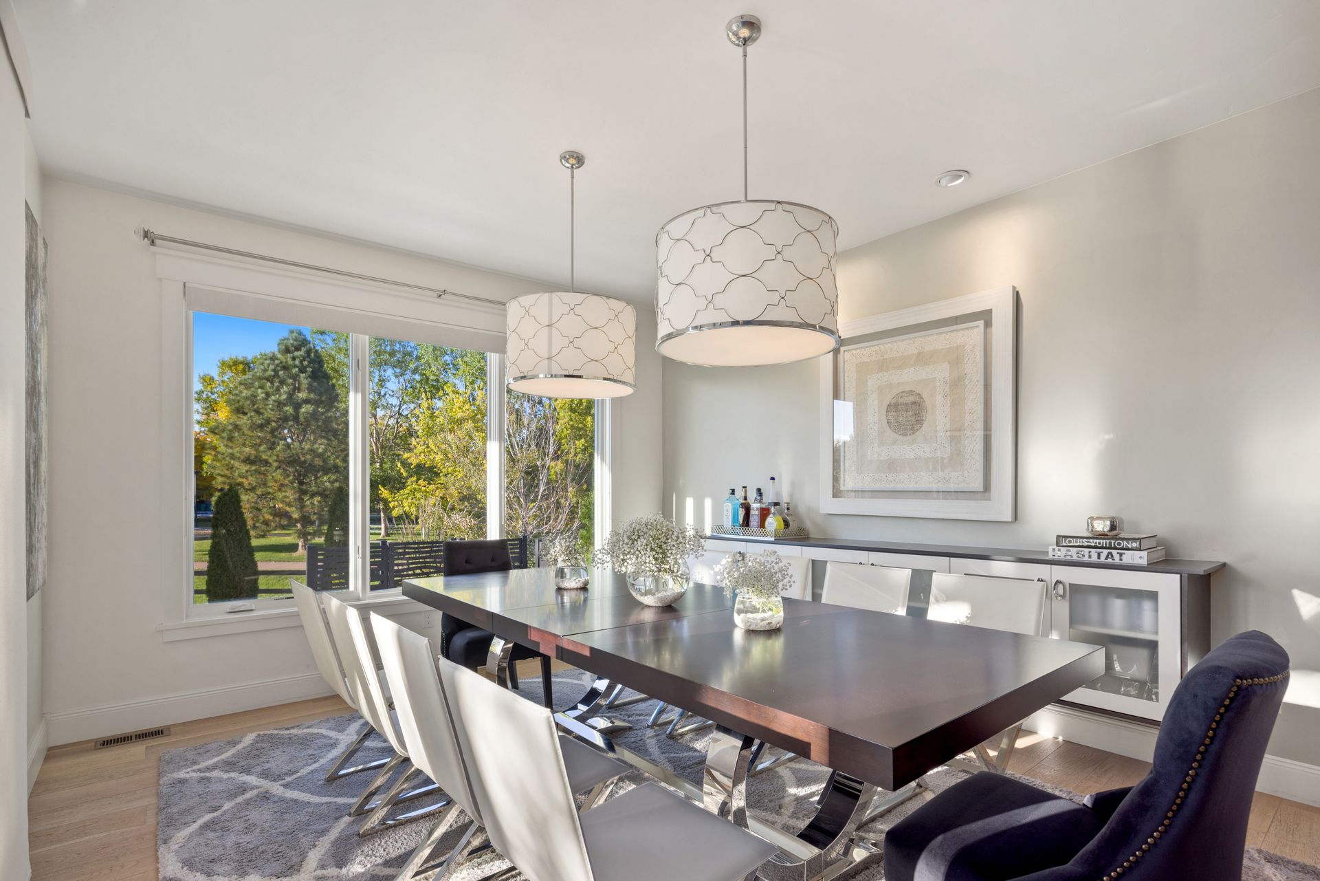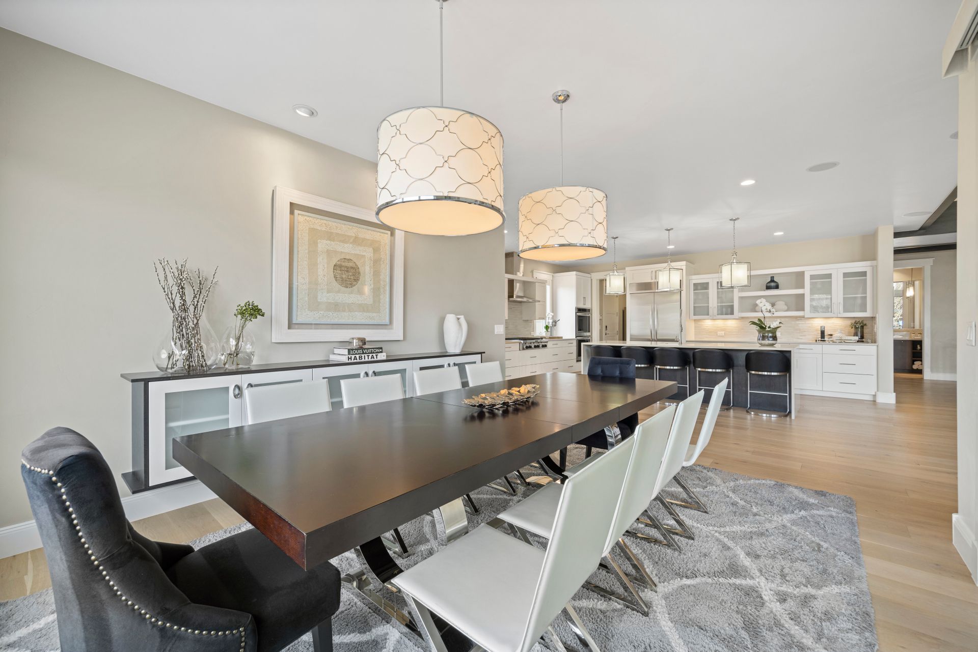 Expansive floor-to-ceiling windows and soaring ceilings fill the home with natural light, creating an open, airy ambiance. The gourmet chef’s kitchen is a showpiece, featuring top-of-the-line stainless steel appliances, custom Milarc cabinetry, and a spacious island—perfect for casual meals and elegant entertaining. The open-concept layout connects the kitchen, dining, and living areas, making every gathering feel effortless and inviting.