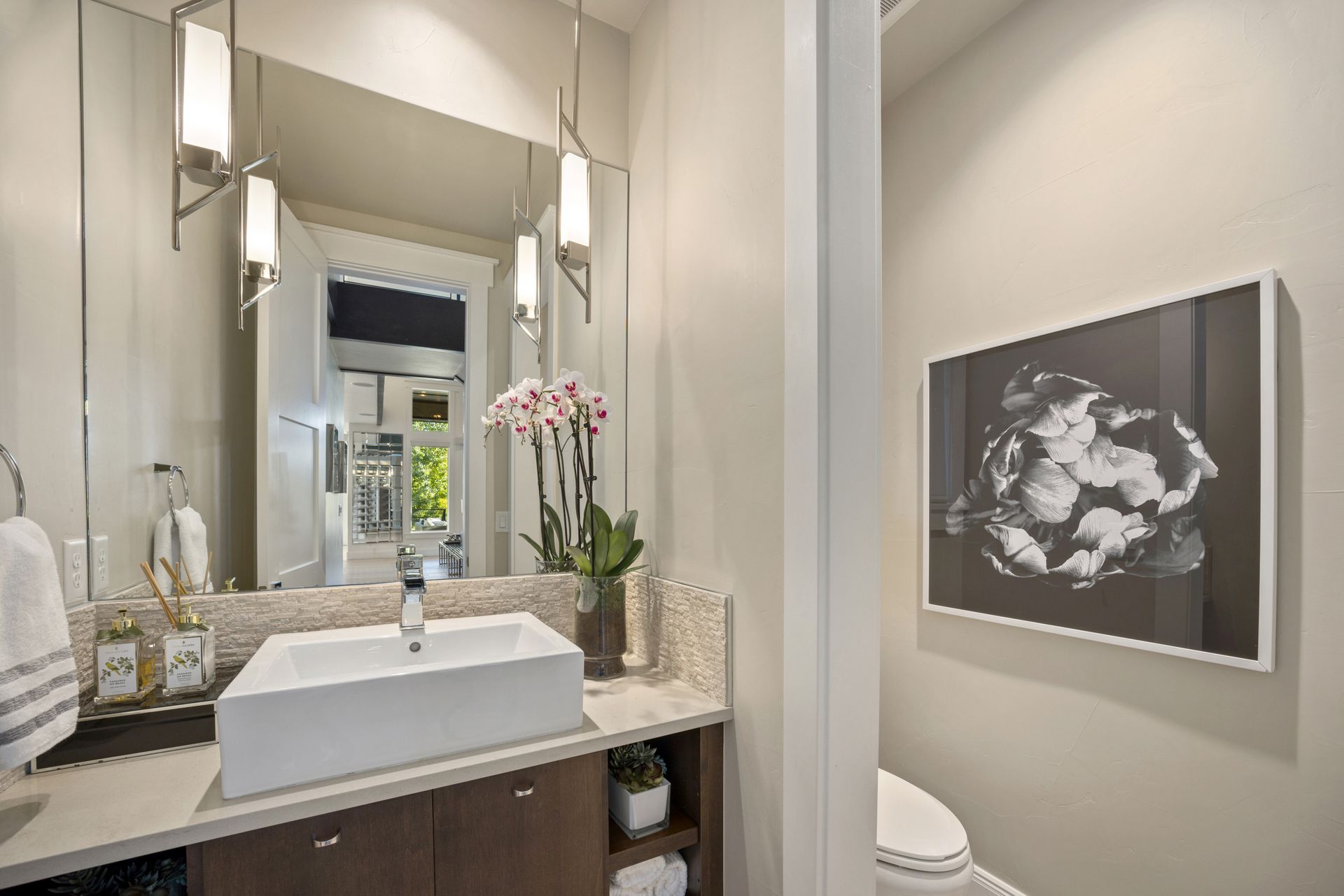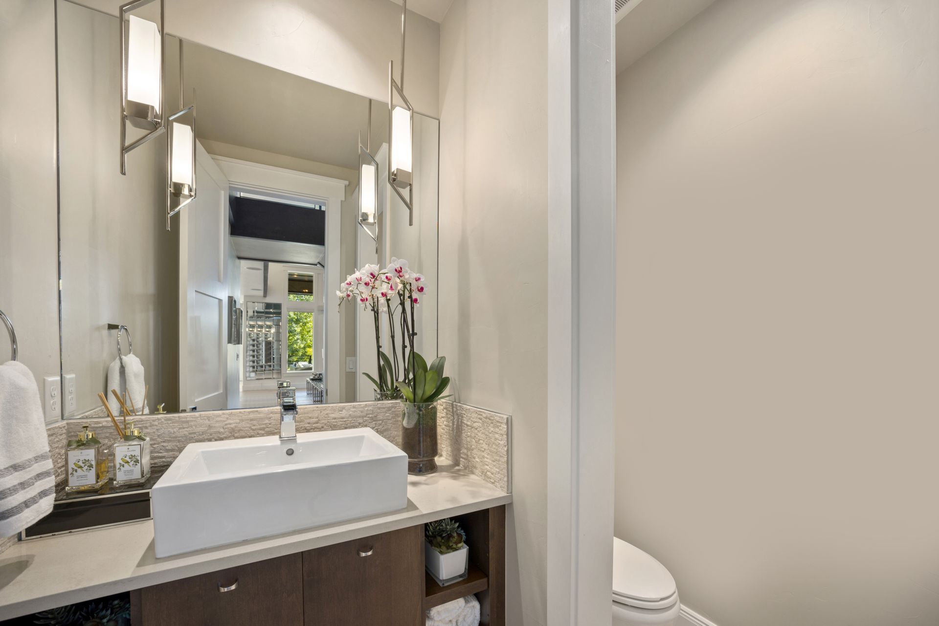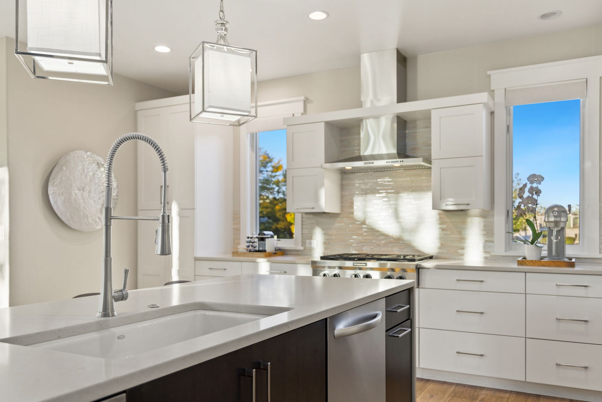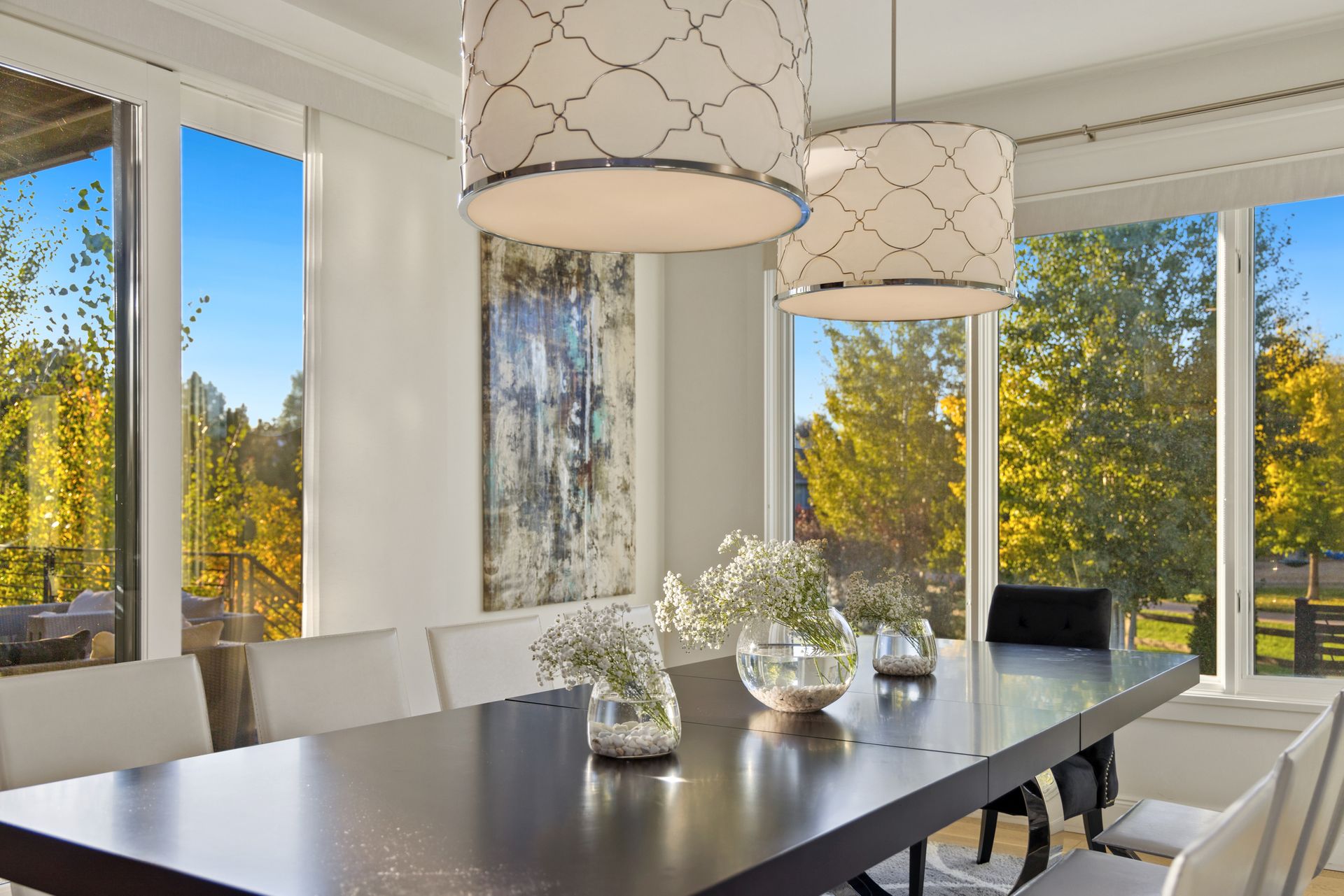 Expansive floor-to-ceiling windows and soaring ceilings fill the home with natural light, creating an open, airy ambiance. The gourmet chef’s kitchen is a showpiece, featuring top-of-the-line stainless steel appliances, custom Milarc cabinetry, and a spacious island—perfect for casual meals and elegant entertaining. The open-concept layout connects the kitchen, dining, and living areas, making every gathering feel effortless and inviting.