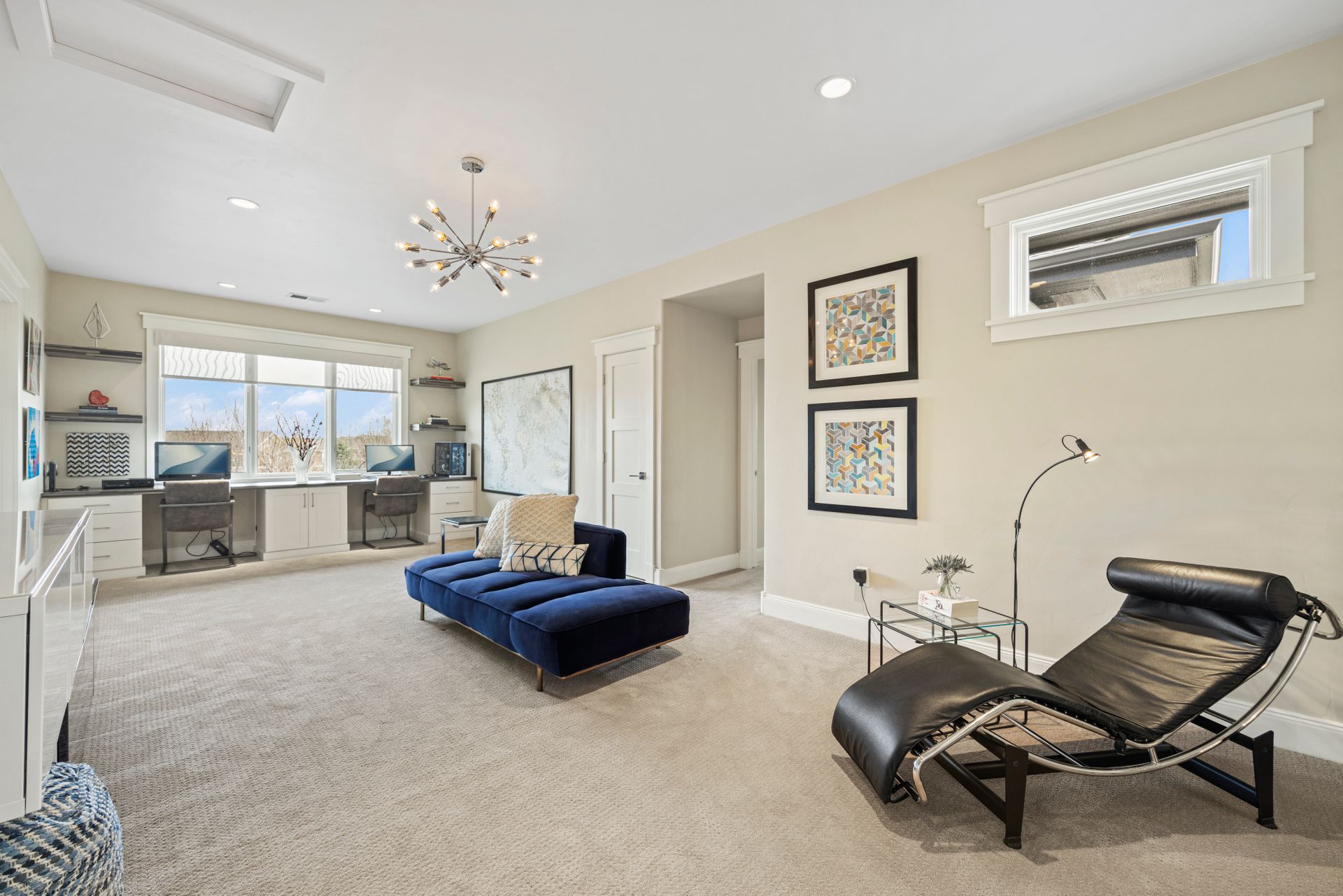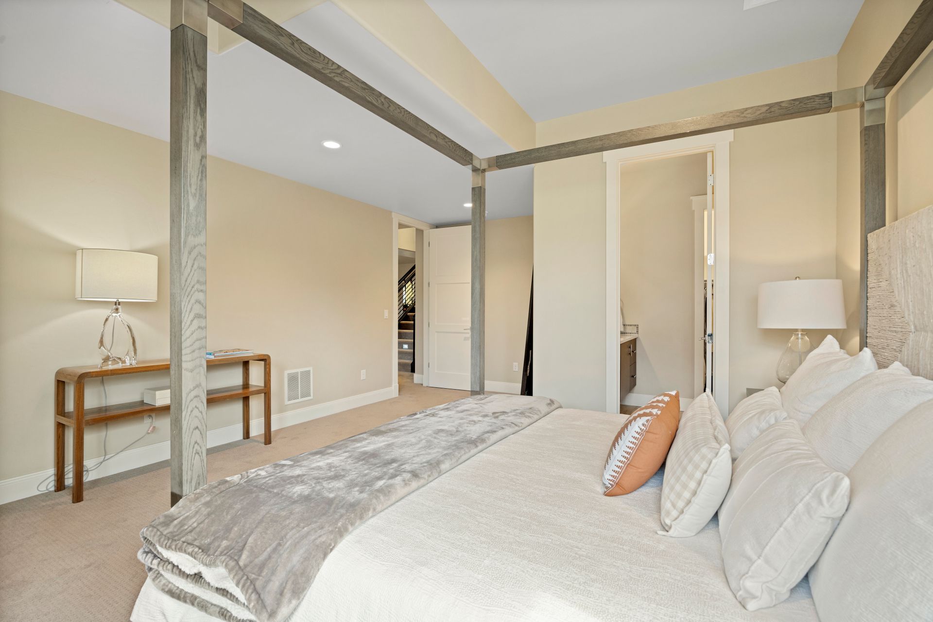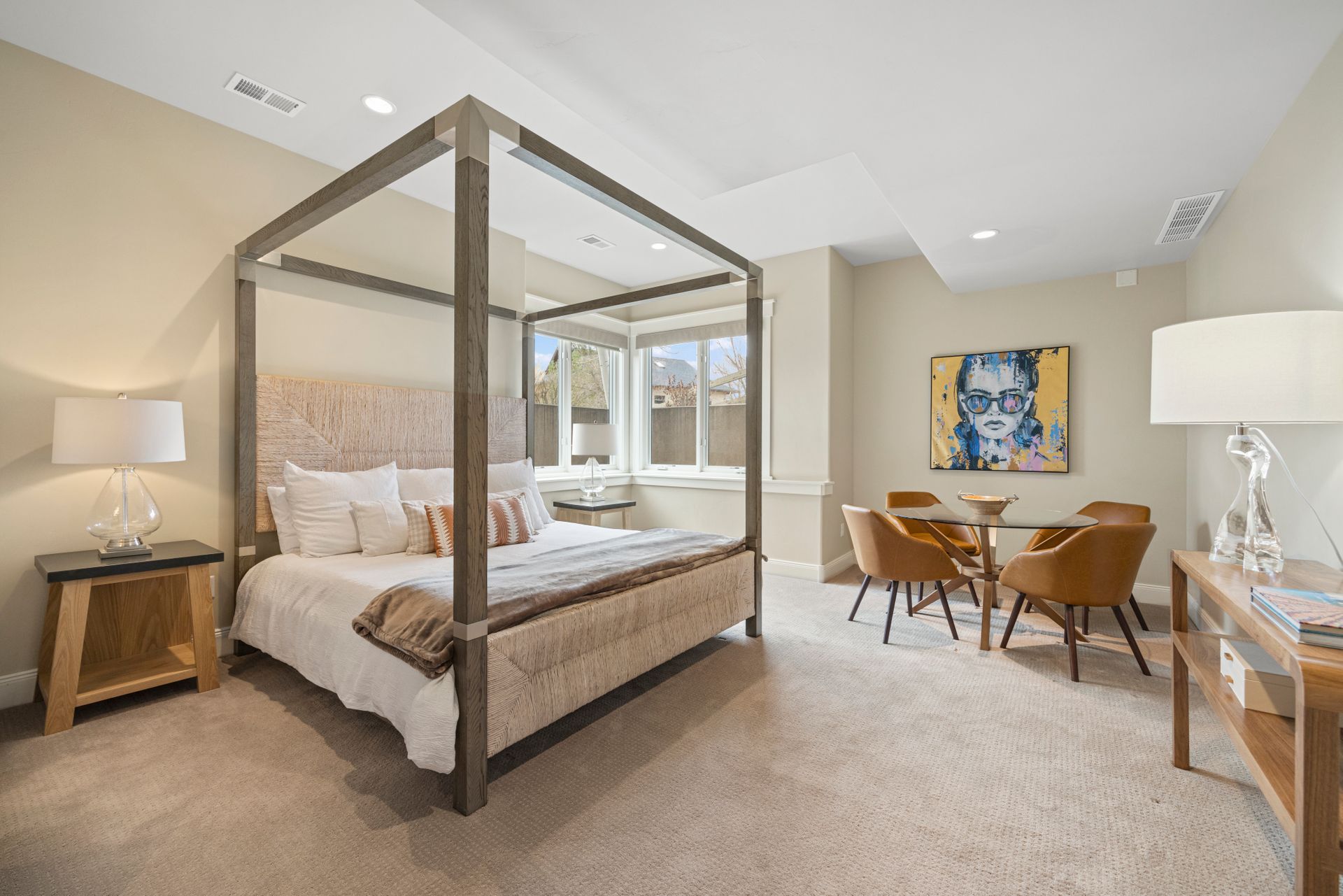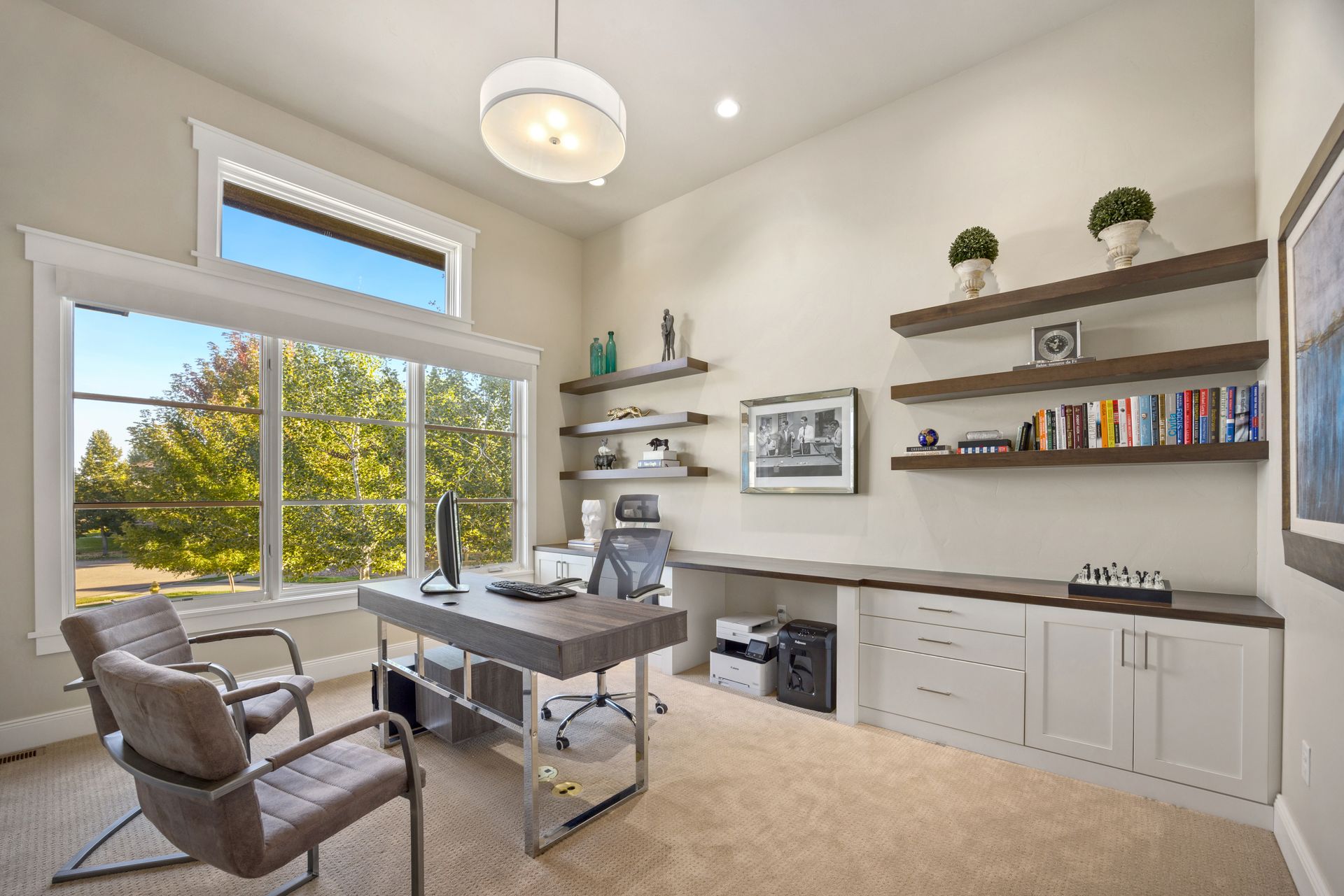 The luxurious primary suite features a spa-inspired en-suite bath and a custom walk-in closet with built-ins and a sitting area. Three additional en-suite bedrooms, each with its own bath and walk-in closet, ensure comfort and privacy for guests. A sophisticated executive office on the main level provides a refined workspace, while a loft area offers flexible living space.
