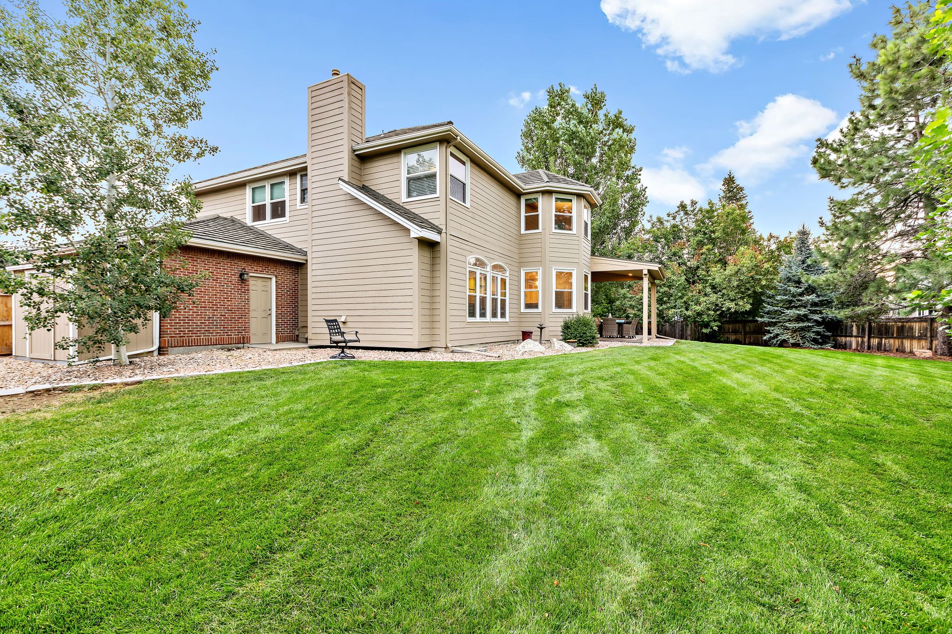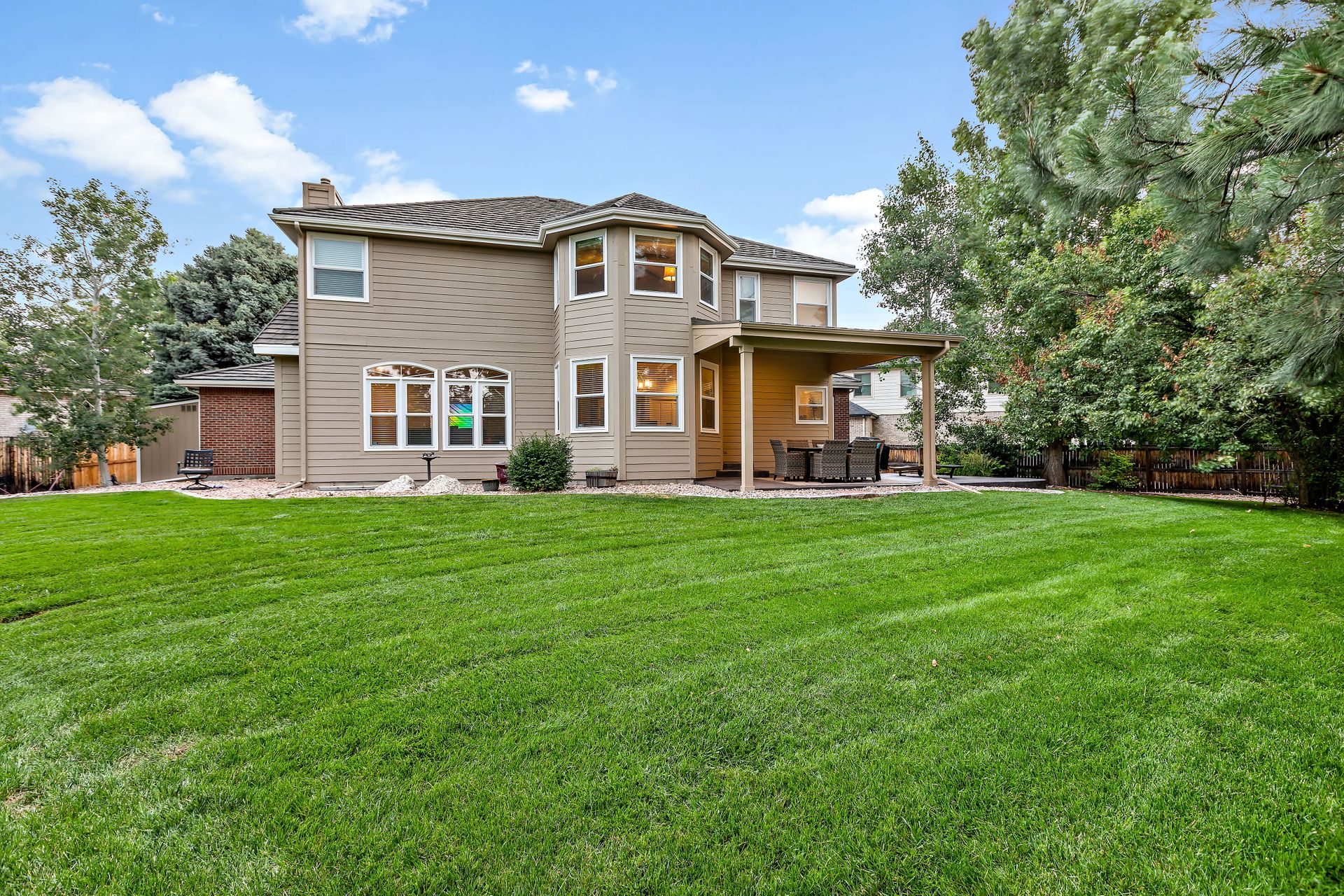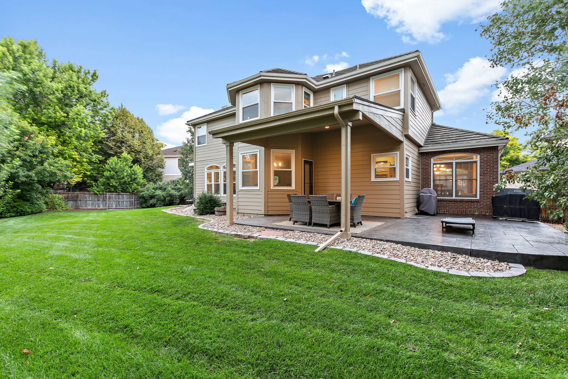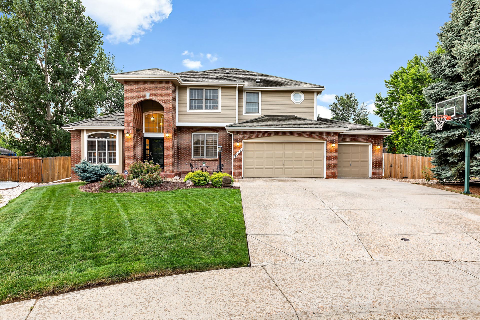 Welcome home to The Hills at Cherry Creek Vista East—a stunning retreat that seamlessly blends elegance and comfort. Step into the two-story foyer with its inviting open staircase. The updated kitchen opens to a charming family room with a gas fireplace and hardwood floors, while the main level offers a study, spacious living and dining rooms, and a fantastic mud/laundry room off the 3-car garage.With over 4,300 sq. feet of finished living space, including 4 upper-level bedrooms, there's no shortage of space! The large primary suite features a newly remodeled en-suite bathroom and three additional bedrooms, one boasting a private en-suite bathroom and the two others feature a shared full bath. The finished basement has a large recreation/family room space, a 5th bathroom, and plenty of storage which could easily be made into a 5th bedroom with full egress window already in place. This gorgeous home is nestled on a quiet cul-de-sac within the desirable Cherry Creek Vista community. Boasting a wonderful private backyard on a large 1/3-acre lot with a covered patio and lots of mature trees. All this, within walking distance to the Cherry Creek State Park, as well as Peakview playground/park, community basketball, tennis and Pickle-ball courts. Outstanding schools including the coveted Cottonwood Creek Elementary and Cherry Creek High School. Rarely available in this sought-after neighborhood, don't miss this beautiful property.