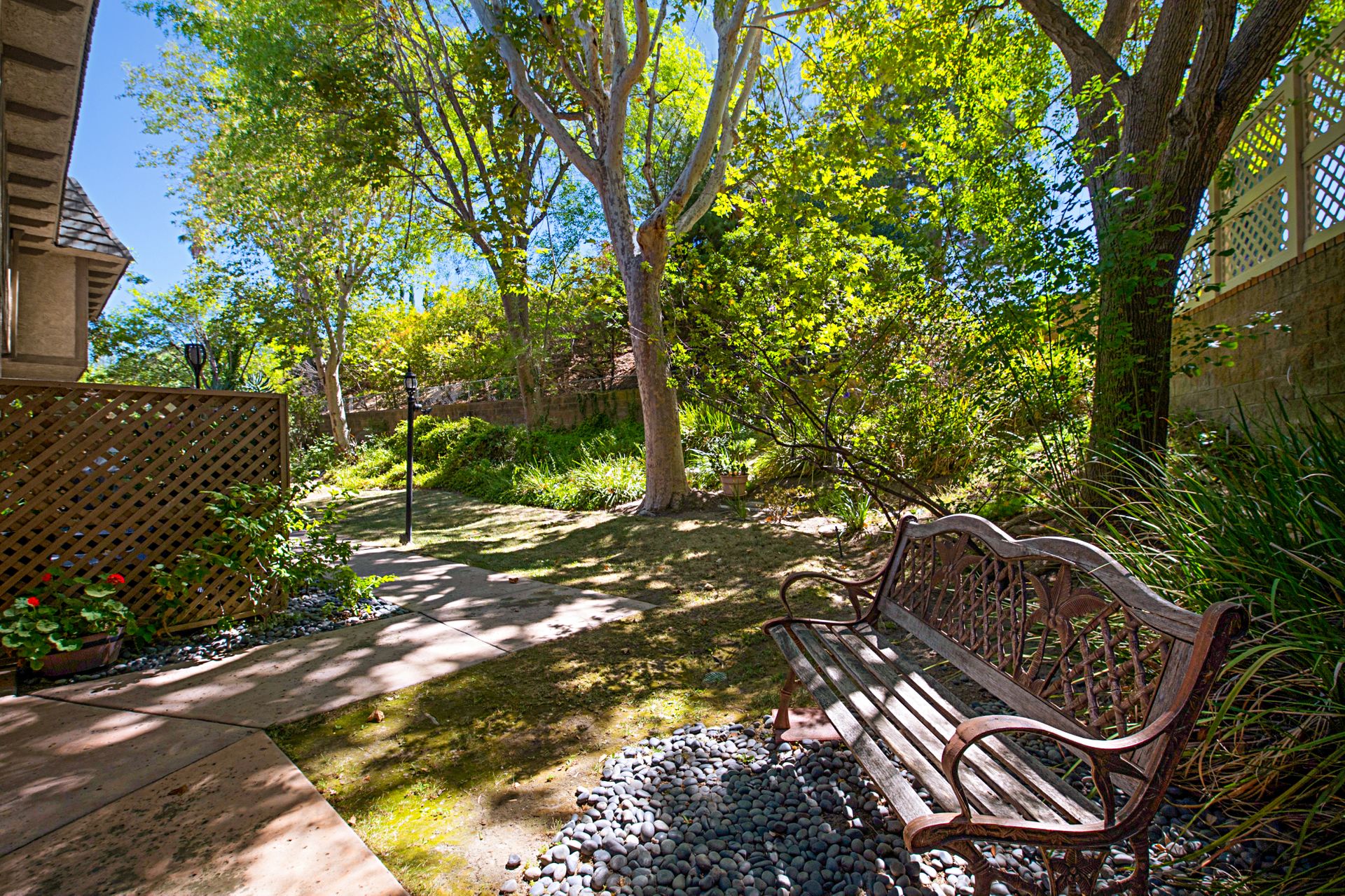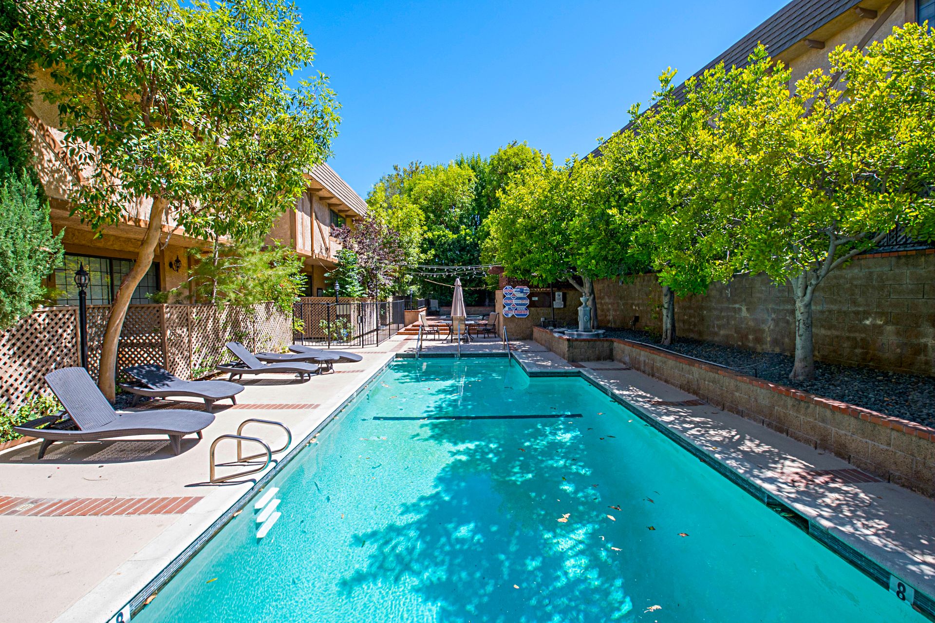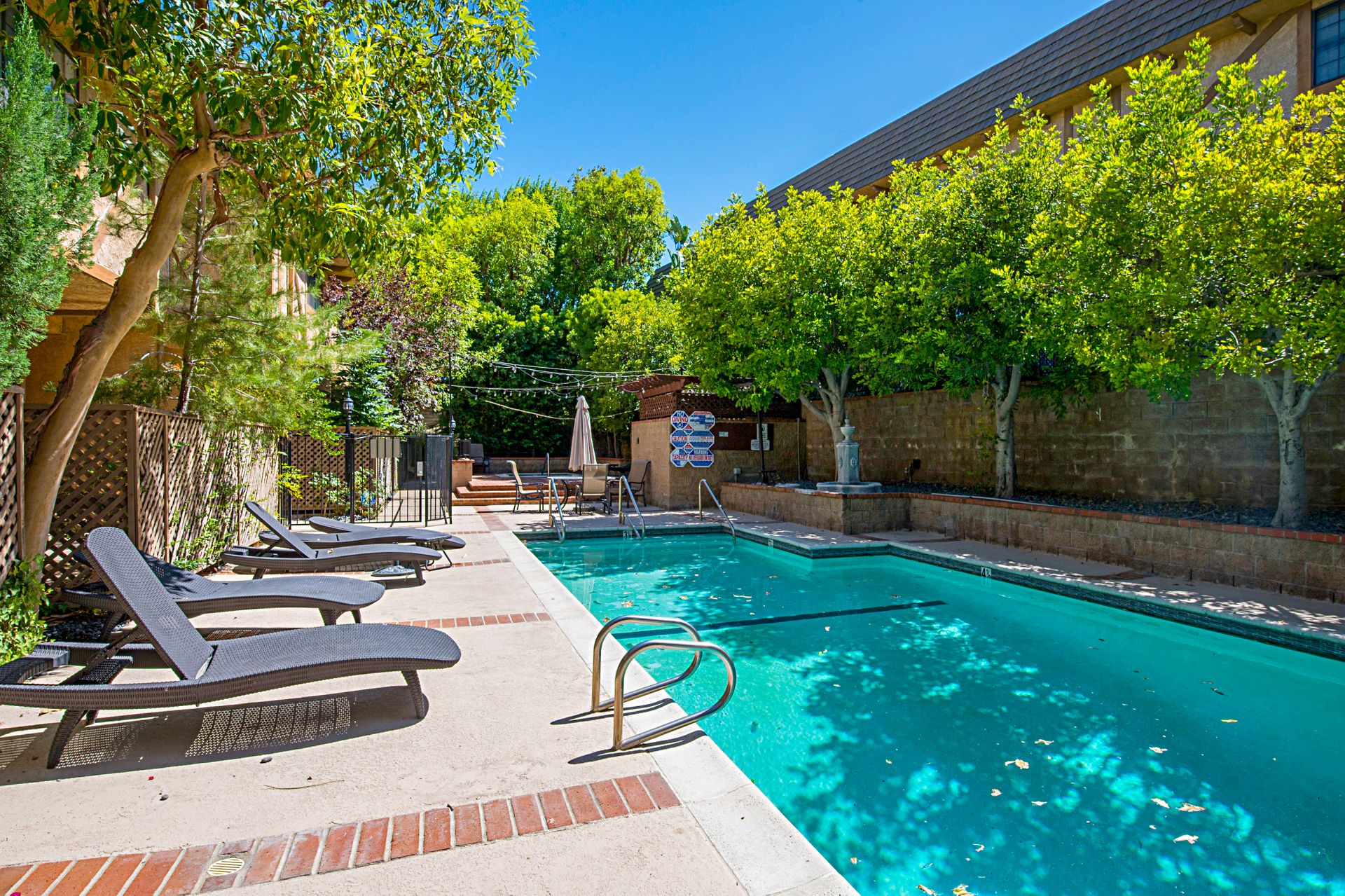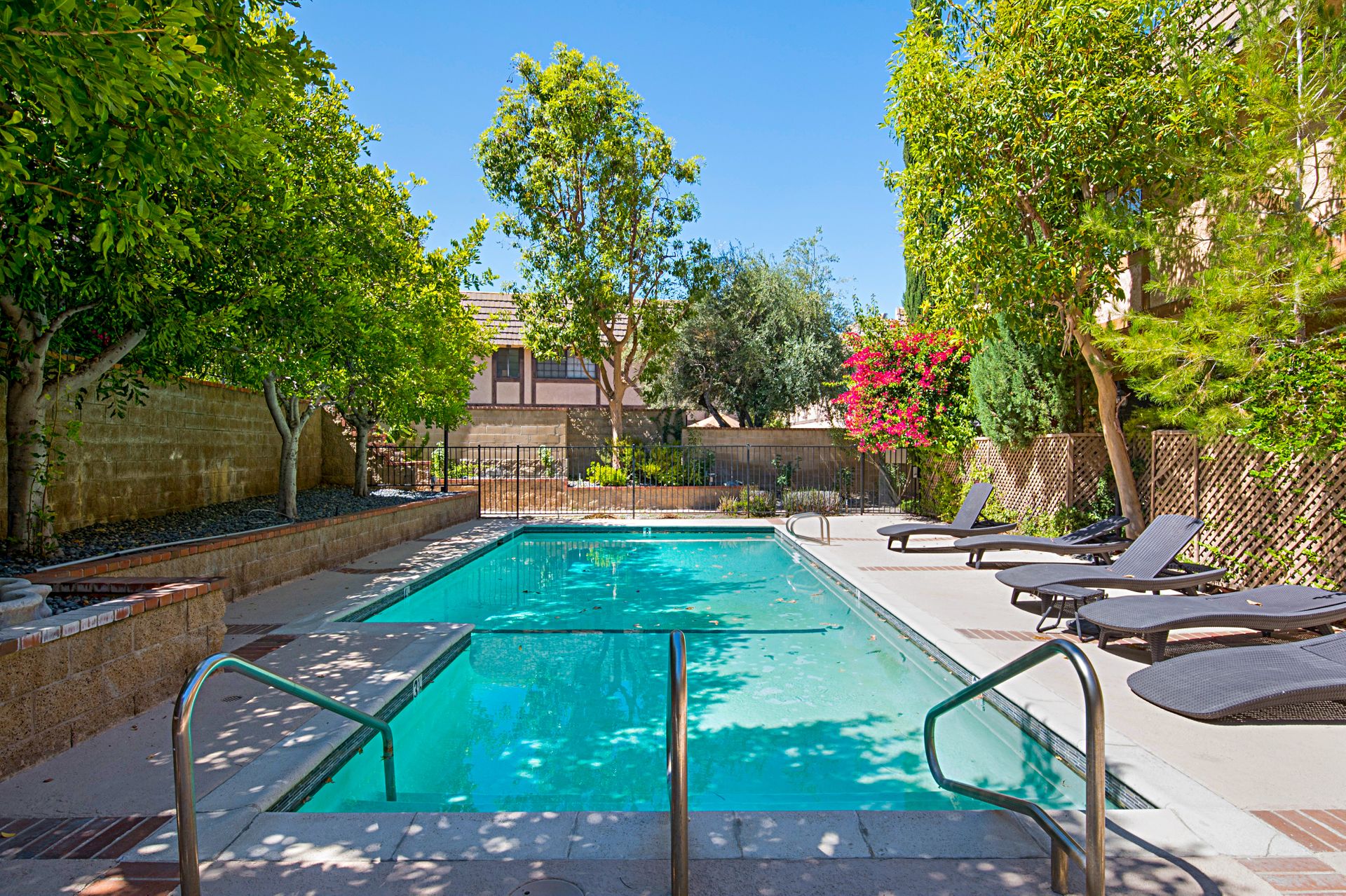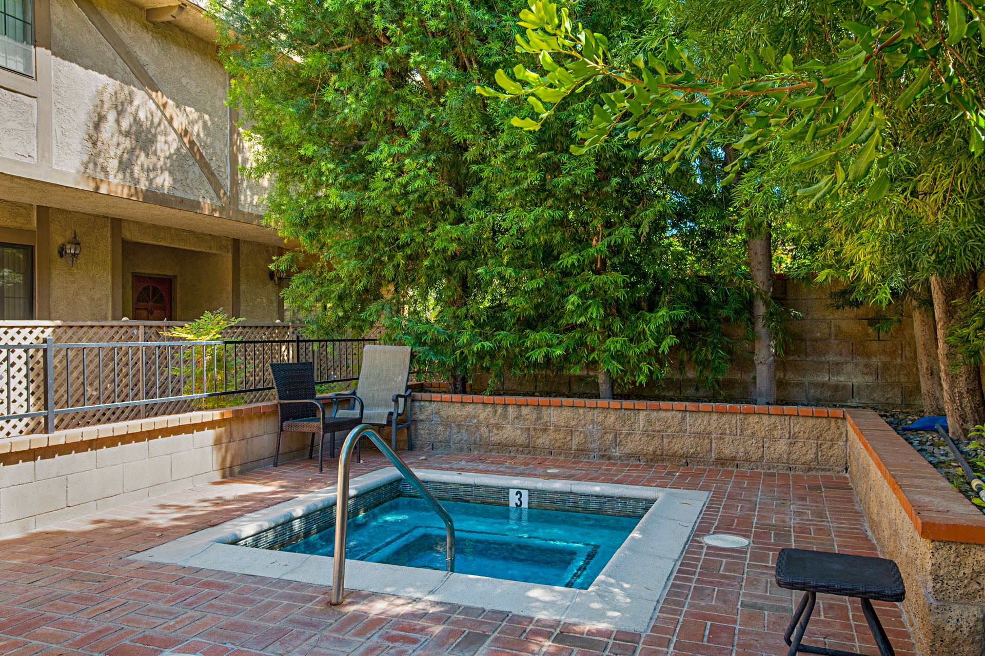 Welcome to this fantastic opportunity to live in beautiful Woodland Hills in this spacious three bedroom and two and one-half bathroom Townhome, with over 2,000 square-feet and an additional huge bonus room! Nestled in a desirable interior location by the sparkling community pool and spa in the heart of Valley Circle Townhomes! The formal entry has travertine flooring, high ceilings with recessed lighting and opens to the airy living room with beautiful hardwood flooring. Floor to ceiling sliders open to the relaxing private outdoor patio with artificial turf! The kitchen has granite countertops, a travertine backsplash with detailed inlay, a built-in wine rack, hardwood floors and stainless steel appliances including a KitchenAid dishwasher! The kitchen also includes a breakfast bar and opens to the family room complete with a fireplace, hardwood floors and plantation shutters. The light and bright dining room is separate and a great space for entertaining! Head upstairs to the oversized primary bedroom suite which boasts a luxurious closet as well as a separate built-in wardrobe and plantation shutters that open to mountaintop valley views. The en suite bathroom has double sinks, a soaking tub, a separate remodeled shower and remodeled tile flooring with decorative inlays. There are two other sizable bedrooms upstairs with vaulted ceilings, ceiling fans and plantation shutters! The hall bathroom upstairs has two sinks, tile floors and a remodeled shower with pebble flooring. A side-by-side laundry closet is conveniently located upstairs by the bedrooms! Head downstairs to the enormous bonus room which is not counted as part of the square-footage! Makes for a wonderful office, gym, playroom or storage area! Enjoy an oversized attached two-car garage, refurbished air conditioning and a newer water heater! Located in the El Camino School District, close to the Village, Warner Center, Calabasas and local parks and restaurants all with easy access to the 101 freeway.
