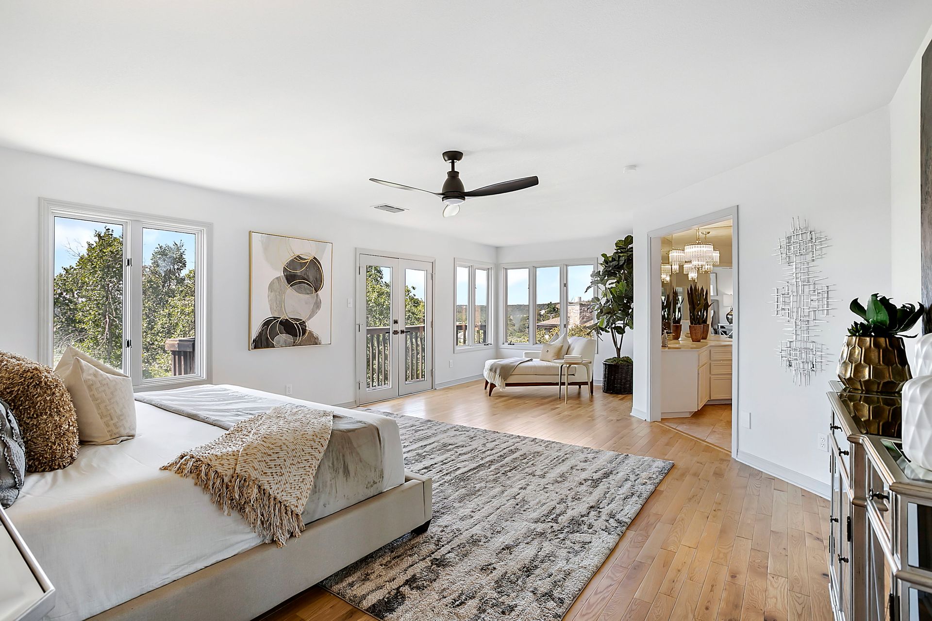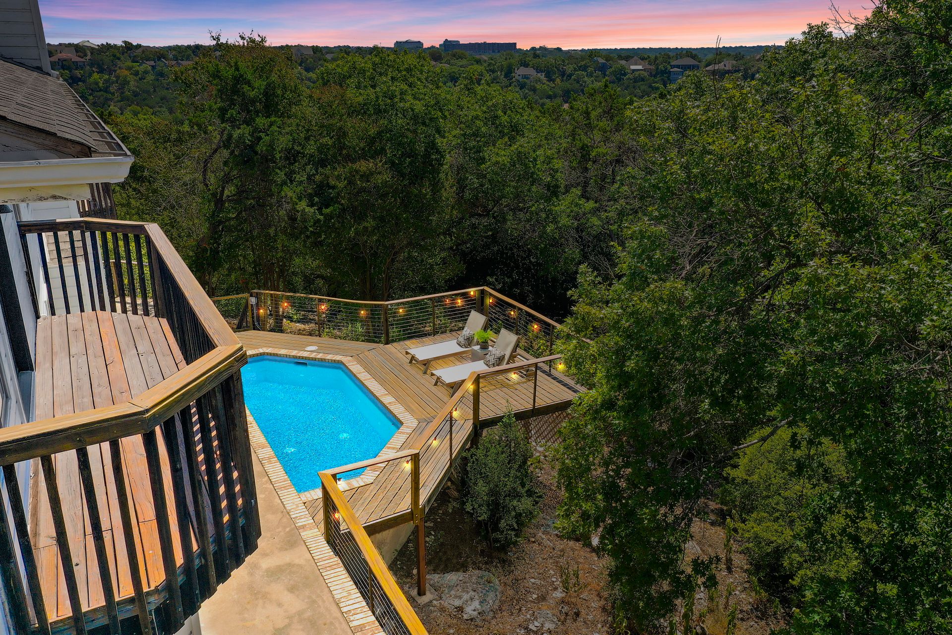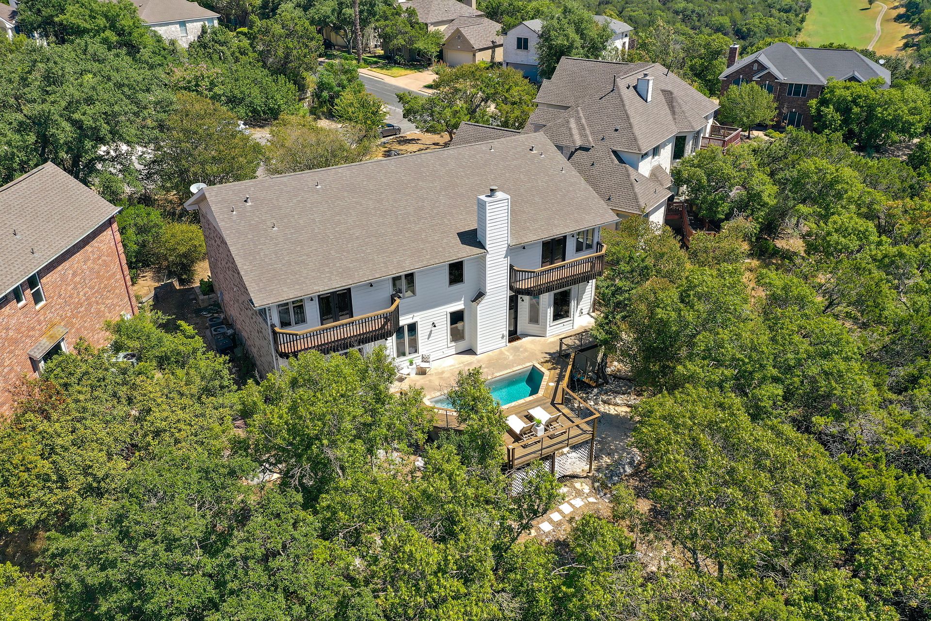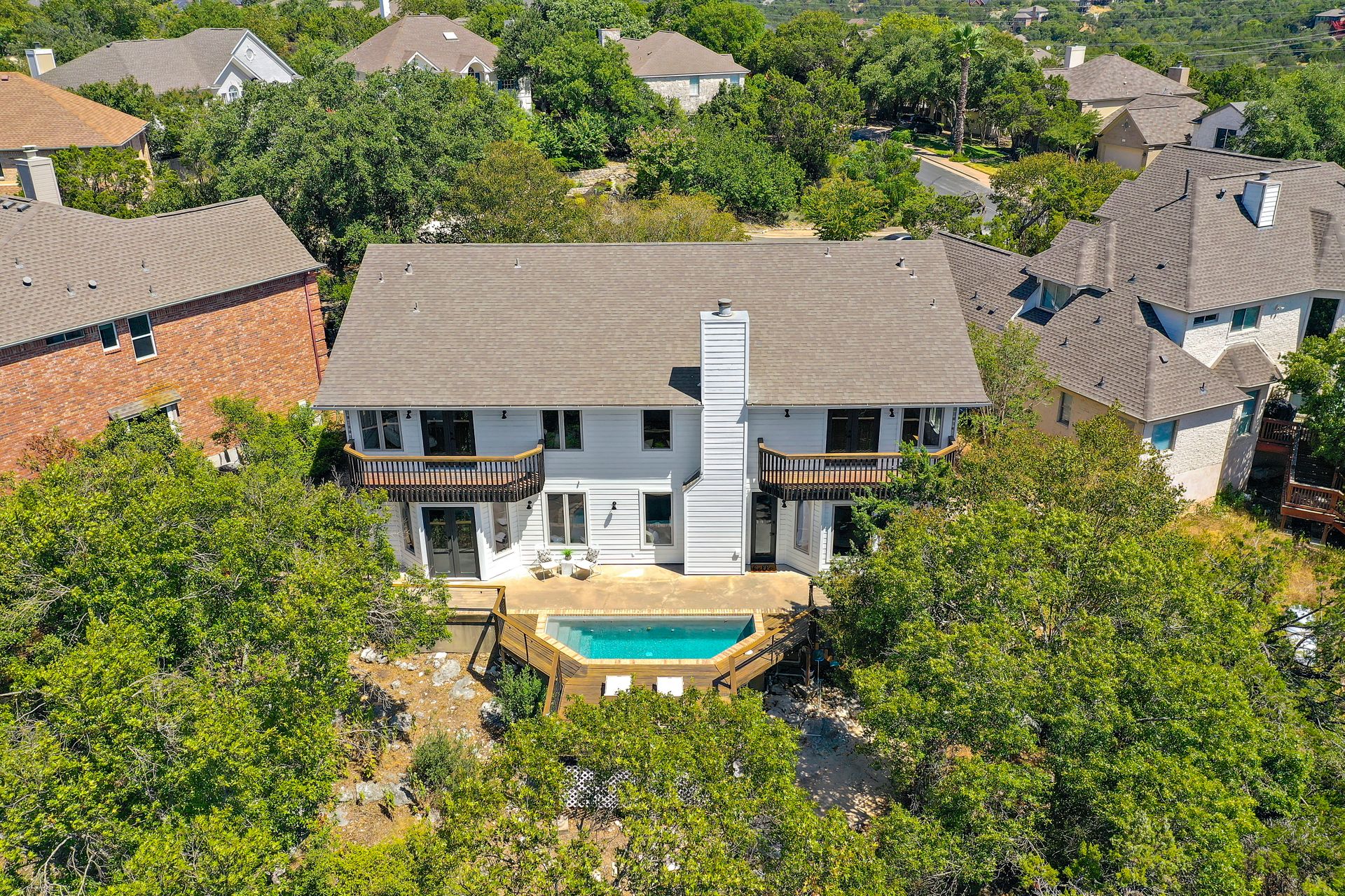 Nestled in tranquil Great Hills, this stunning five bedroom home rests on a quiet cul-de-sac, boasting two primary suites, three living areas, two dining spaces, four baths, three decks, a two-and-one-half-car garage, and a pool overlooking the greenbelt adorned with heritage oaks on a 1/3 acre lot. Panoramic hill country views fill light-filled spaces accentuated by floor-to-ceiling windows. The airy kitchen offers ample cabinetry, counter space, a pantry and an island. A guest suite on the main level caters to visitors or multi-generational living. Additional downstair highlights include two dining and two living spaces, along with a spacious indoor utility area with a sink. Ascending to the upper level reveals another primary bedroom with stunning views, a bath with double vanities, a jetted tub, a walk-in shower, and two expansive closets. A vast flex space with sweeping views and three more bedrooms (one transformed into a dance studio with a ballet bar and soundproofed wood floors) cater to artistic pursuits. The expansive backyard deck and pool create a tranquil retreat overlooking the Greenbelt and Bull Creek Nature Preserve. Convenient highway access(183, Mopac,360) leads to Tech Corridor, Arboretum, Gateway, and The Domain for dining and shopping. The community offers a private pool, playground, and dog park. Close-by trails, water holes, horse farms, and private country clubs enrich the unique Austin lifestyle. The home is part of AISD and the esteemed Hill/Murchison/Anderson trifecta, with A-rated schools. There's potential to apply to the highly regarded LASA High School, ranked #1 in Austin, #4 in Texas, and #34 in the US by 2022 U.S. News and World Report. Alternatively, renowned RRISD schools, including nearby Laurel Mountain Elementary, have open out-of-district enrollment.Info deemed reliable, buyer to independently verify all information including but not limited to square footage, lot size, year built, zoning, restrictions, taxes, schools, etc.