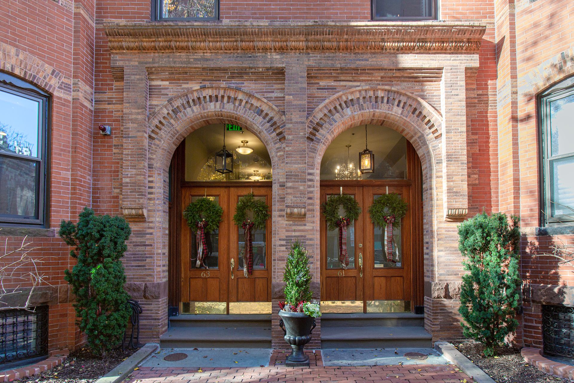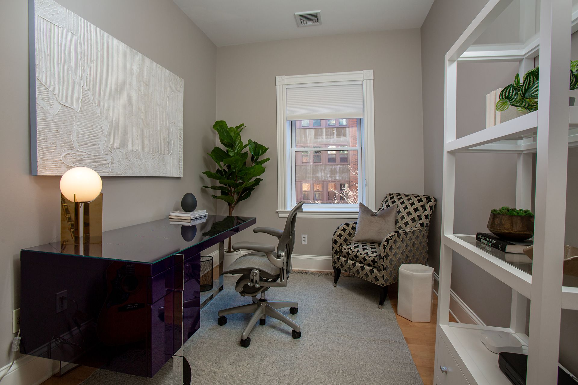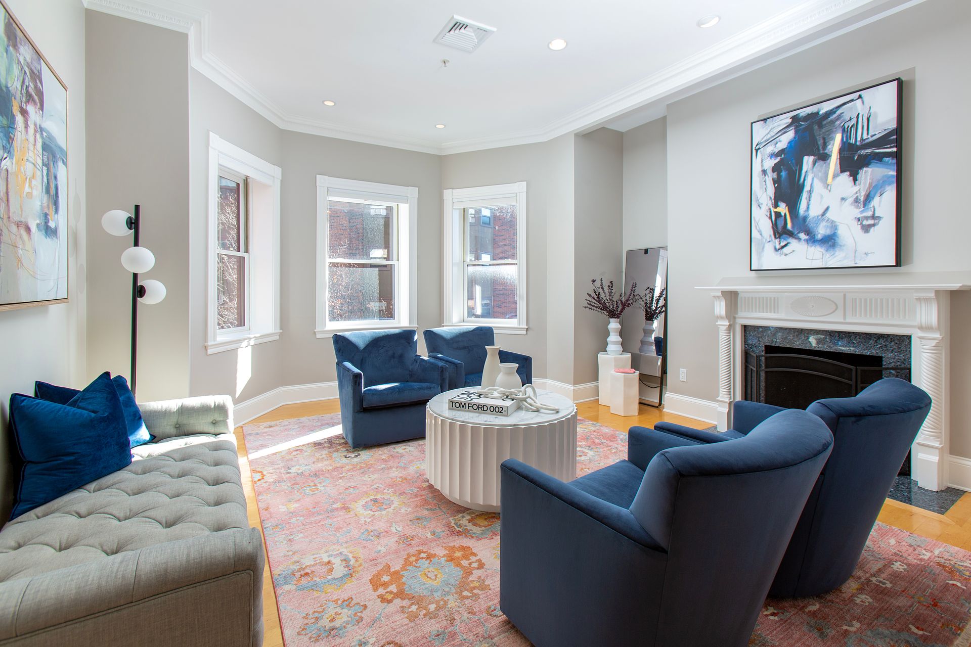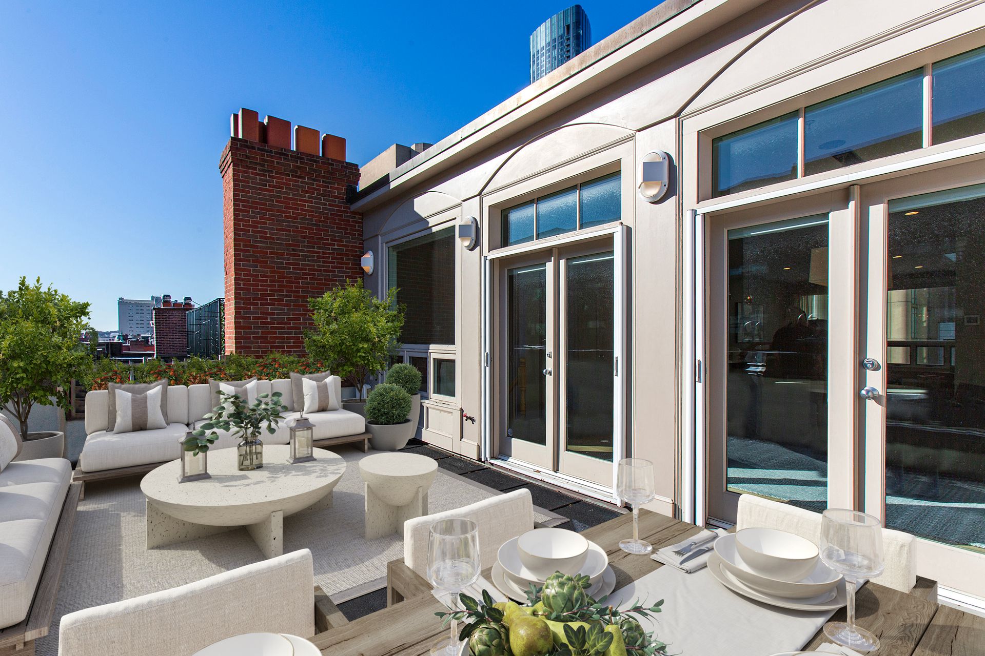 Spacious contemporary PENTHOUSE on the coveted St Botolph Street. Two levels of sun-filled luxurious living with a private 337 sq ft +/- south facing walk out terrace with spectacular city views. Enter on the bedroom level with three generously sized bedrooms, two newly renovated elegant bathrooms with Donna Venegas vanities, a cozy den with fireplace and home office. The upper floor features a wall of windows and an open floor plan with eat-in-kitchen, dining room, living room and powder room. The spacious living room has two skylights, a gas fireplace and a new wet bar with an 18 bottle Marvel wine refrigerator. The stylish skylit Donna Venegas kitchen with a large island, high end appliances, gorgeous new counters and back splash and pantry with plug for your Dyson. Private back door leads to your locked storage closet and deeded parking space. Just steps to Copley Place, The Prudential Mall, the T, countless restaurants and several parks. Enjoy the vibrancy of the city and all that it has to offer.