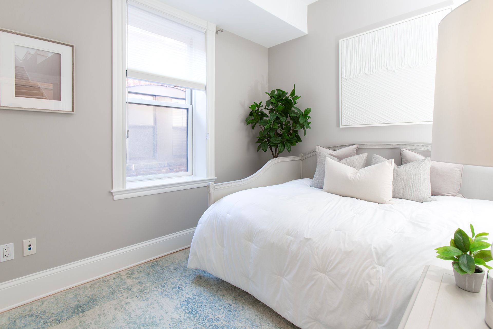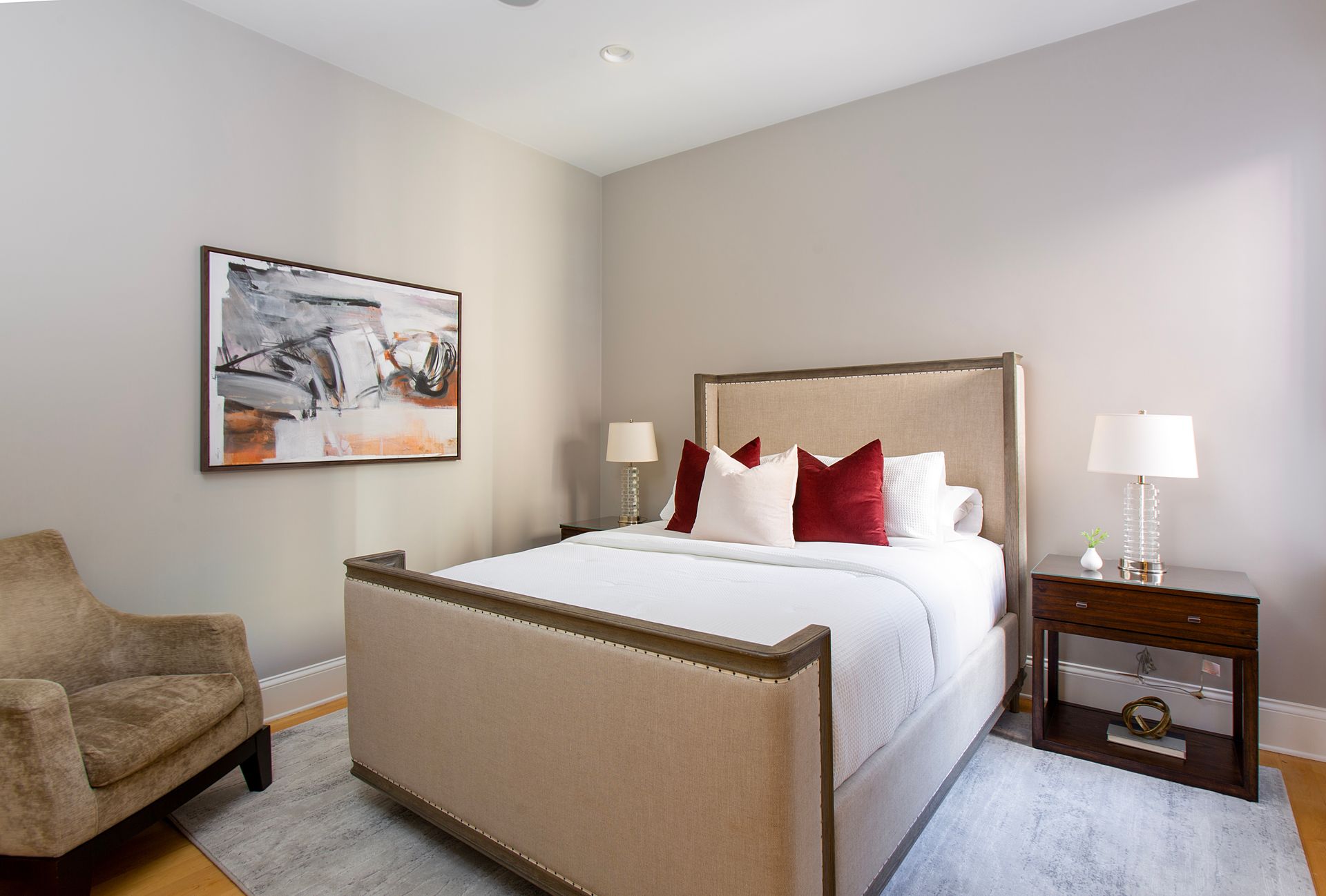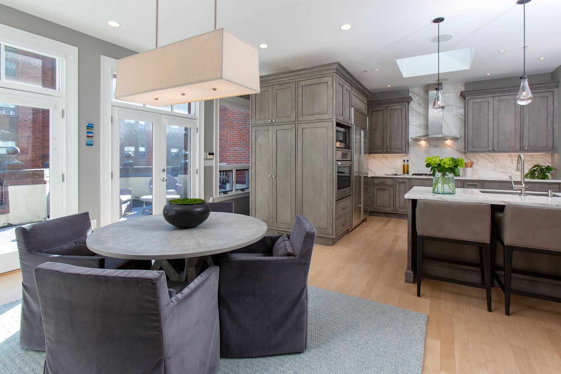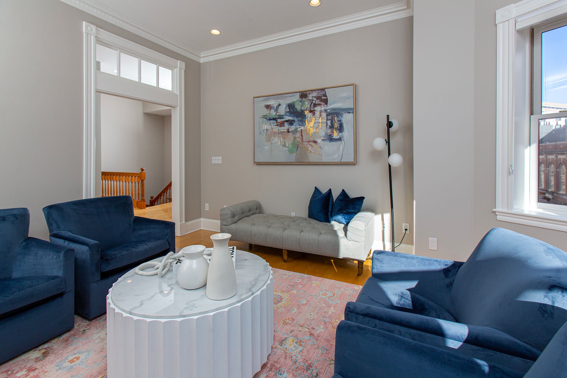 Spacious contemporary PENTHOUSE on the coveted St Botolph Street. Two levels of sun-filled luxurious living with a private 337 sq ft +/- south facing walk out terrace with spectacular city views. Enter on the bedroom level with three generously sized bedrooms, two newly renovated elegant bathrooms with Donna Venegas vanities, a cozy den with fireplace and home office. The upper floor features a wall of windows and an open floor plan with eat-in-kitchen, dining room, living room and powder room. The spacious living room has two skylights, a gas fireplace and a new wet bar with an 18 bottle Marvel wine refrigerator. The stylish skylit Donna Venegas kitchen with a large island, high end appliances, gorgeous new counters and back splash and pantry with plug for your Dyson. Private back door leads to your locked storage closet and deeded parking space. Just steps to Copley Place, The Prudential Mall, the T, countless restaurants and several parks. Enjoy the vibrancy of the city and all that it has to offer.