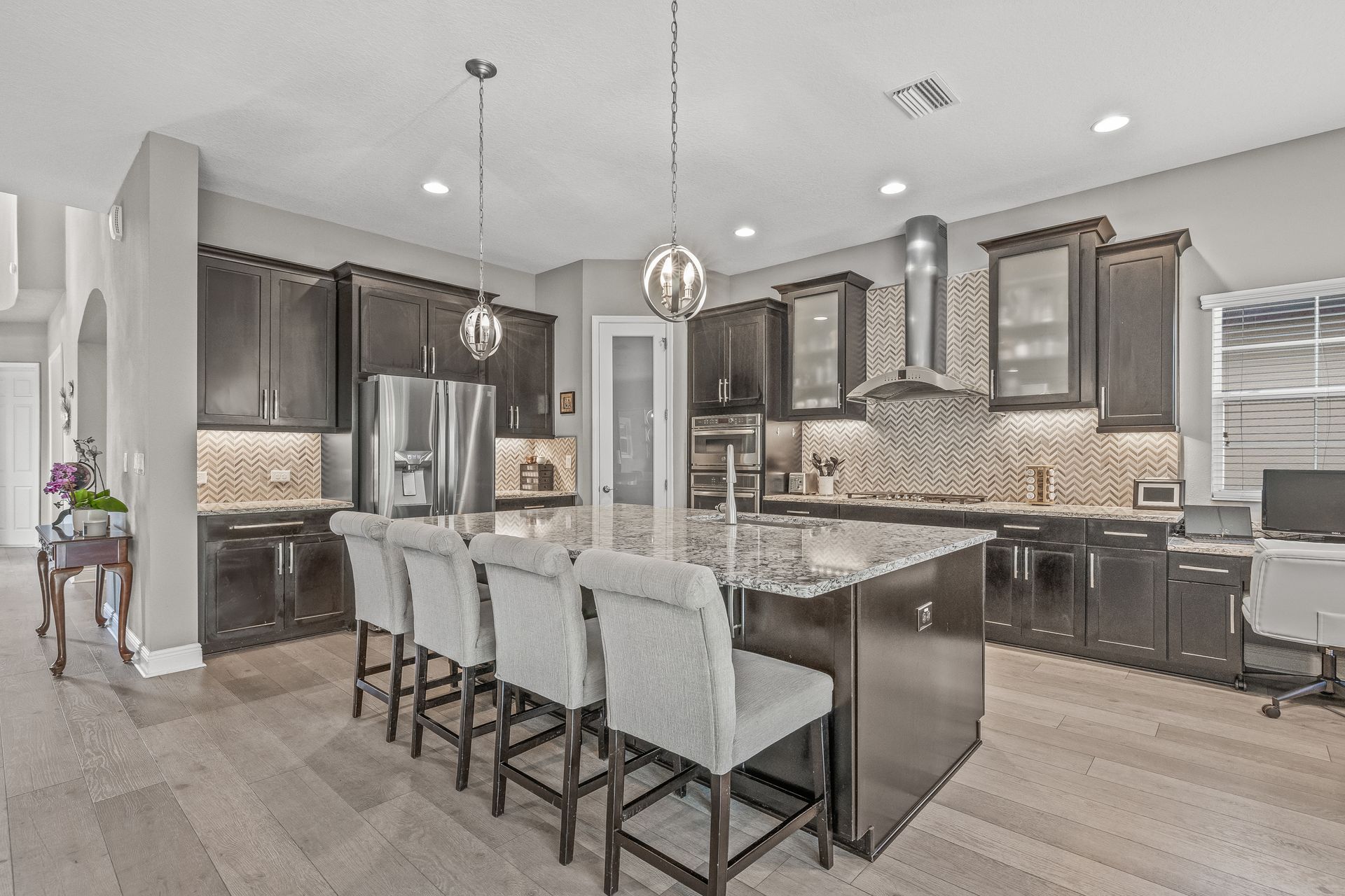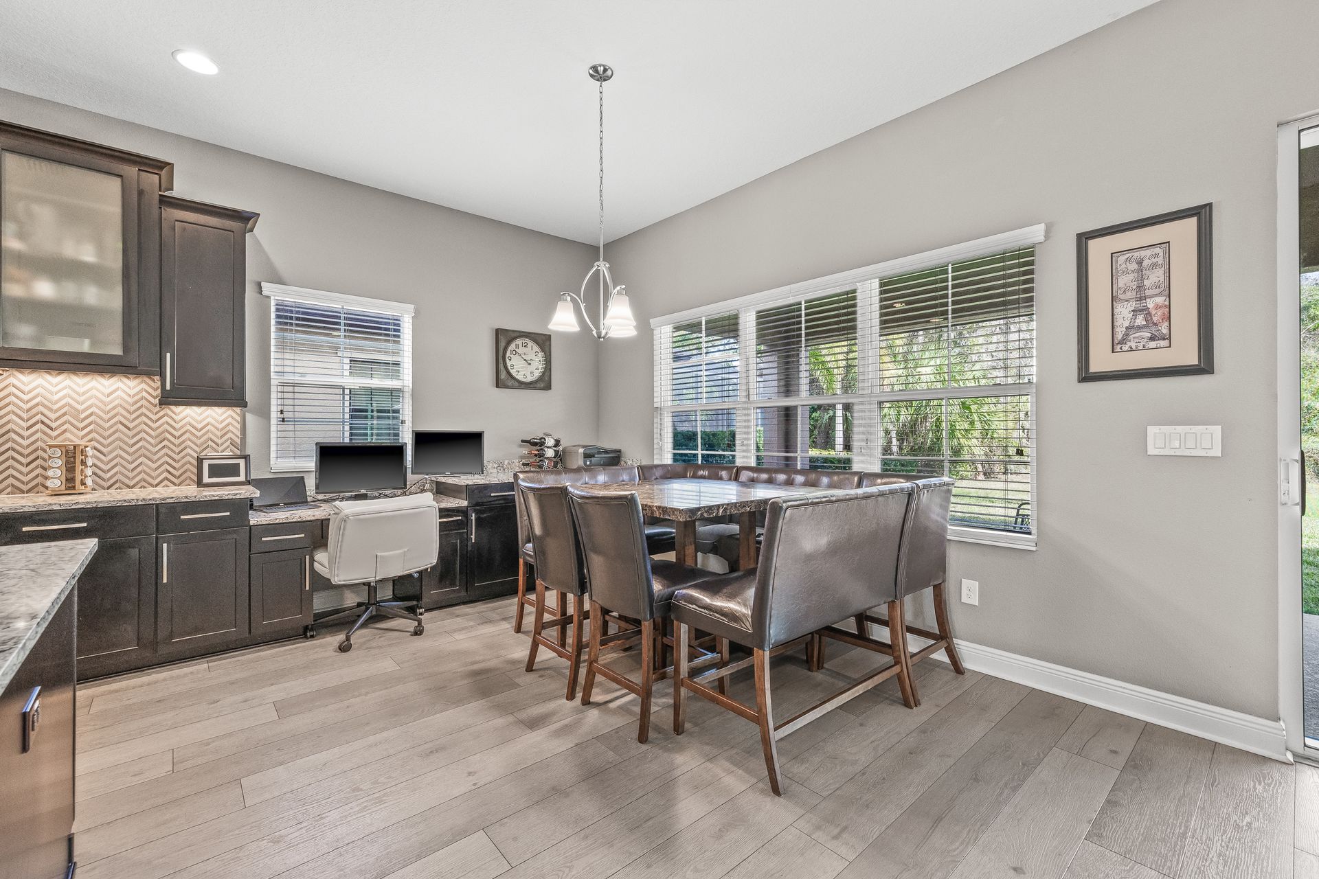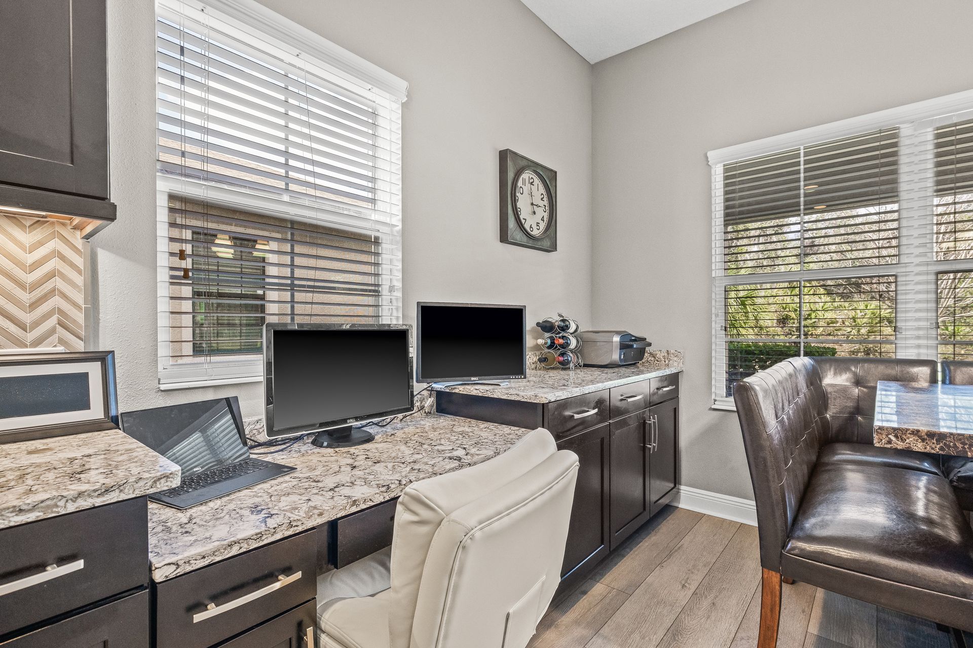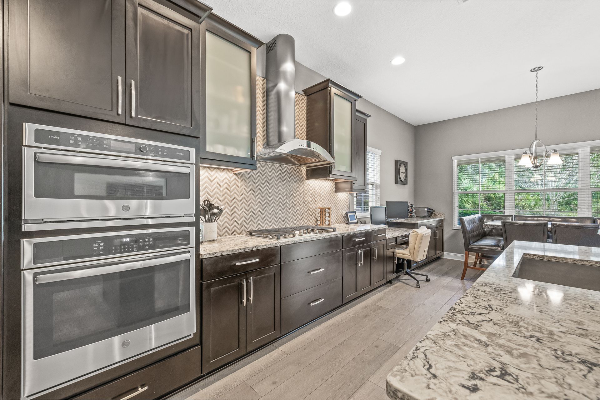 The heart of the home is the gorgeous gourmet kitchen, boasting granite countertops, 42” upper cabinets with crown molding, a stunning tile backsplash, stainless steel appliances—including a gas cooktop, wall oven, oversized island with storage and seating, and a custom built-in desk perfect for home office workstation with additional cabinets for extra storage space. Adjacent is the expansive family room, featuring built-in surround sound, casual dining space, and sliding glass doors that open to a lanai with pre-plumbing for your dream outdoor kitchen—all with breathtaking conservation views and privacy.