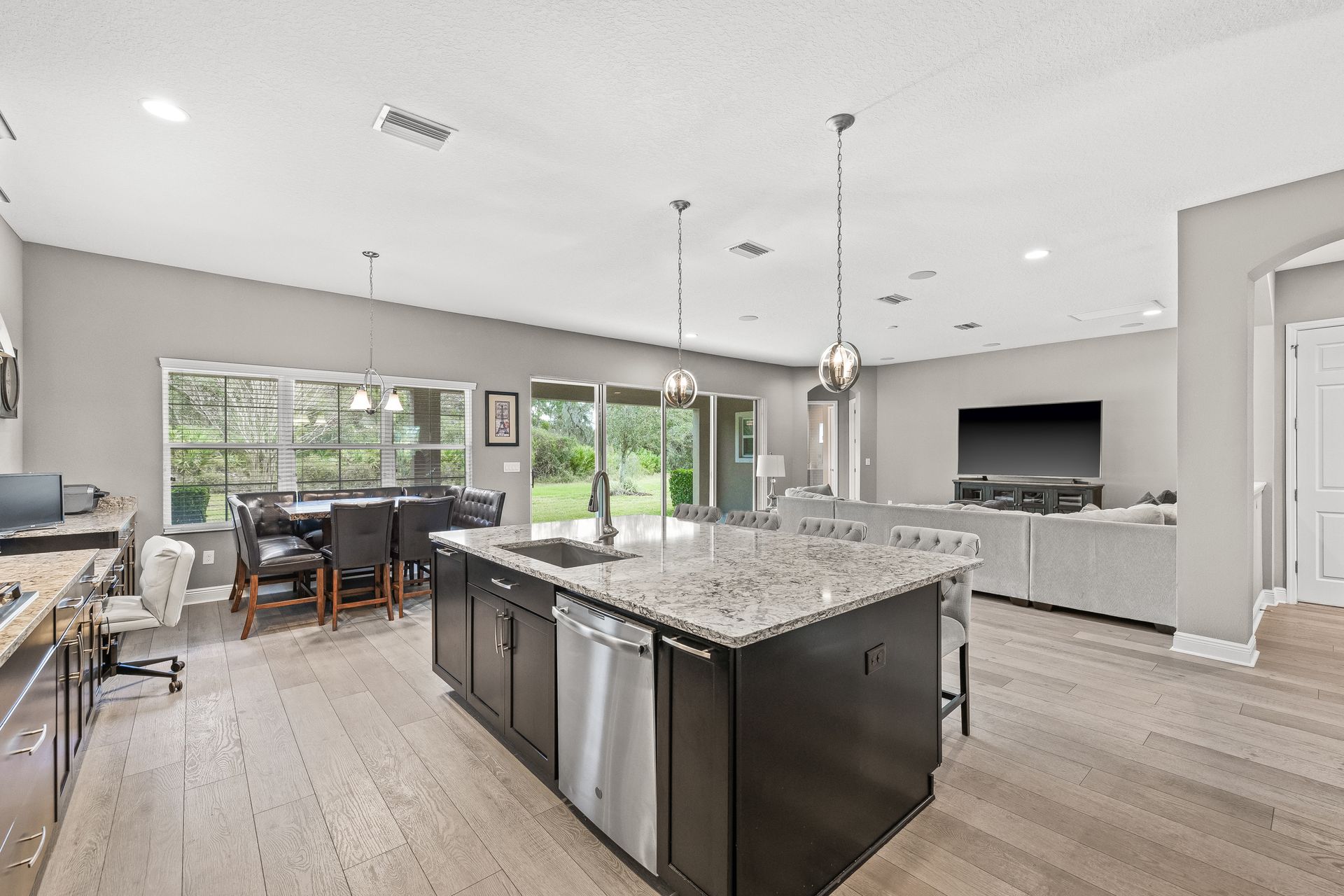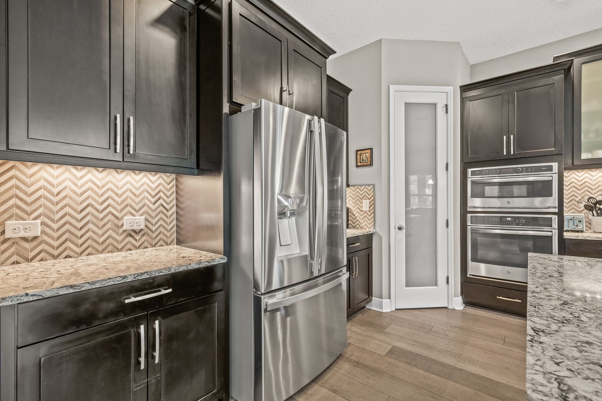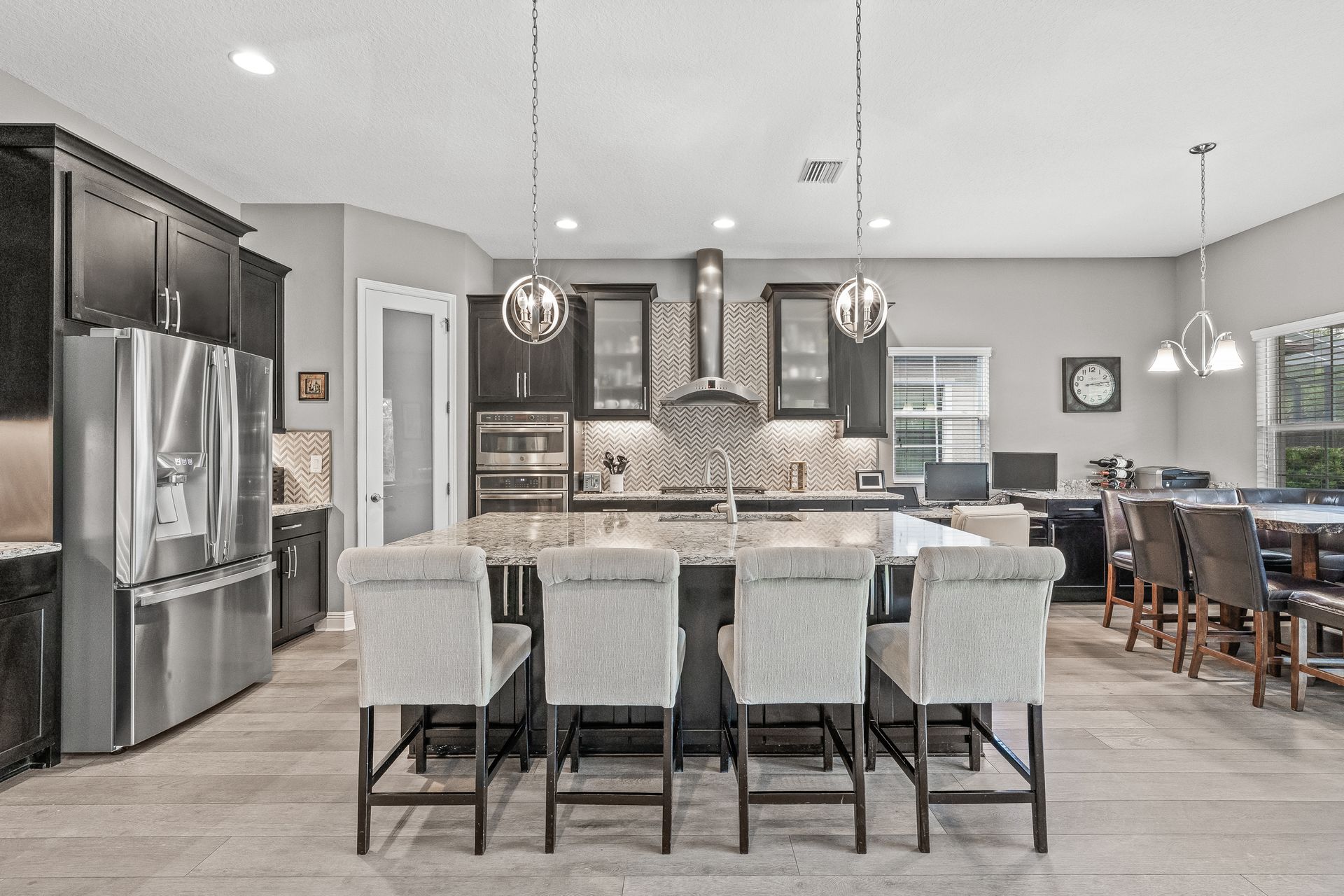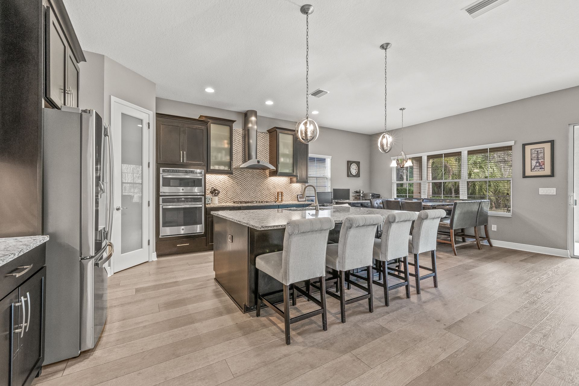 The heart of the home is the gorgeous gourmet kitchen, boasting granite countertops, 42” upper cabinets with crown molding, a stunning tile backsplash, stainless steel appliances—including a gas cooktop, wall oven, oversized island with storage and seating, and a custom built-in desk perfect for home office workstation with additional cabinets for extra storage space. Adjacent is the expansive family room, featuring built-in surround sound, casual dining space, and sliding glass doors that open to a lanai with pre-plumbing for your dream outdoor kitchen—all with breathtaking conservation views and privacy.