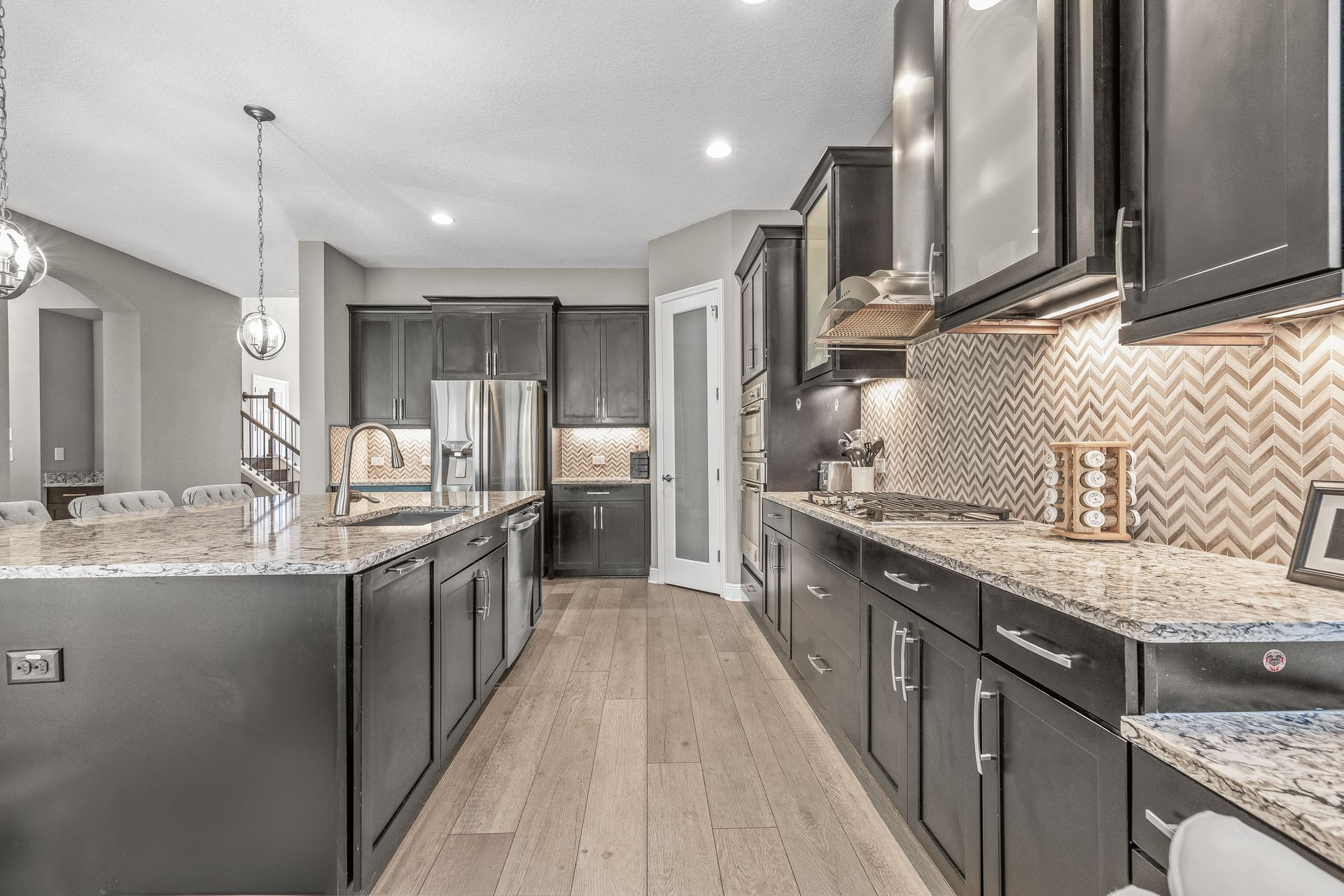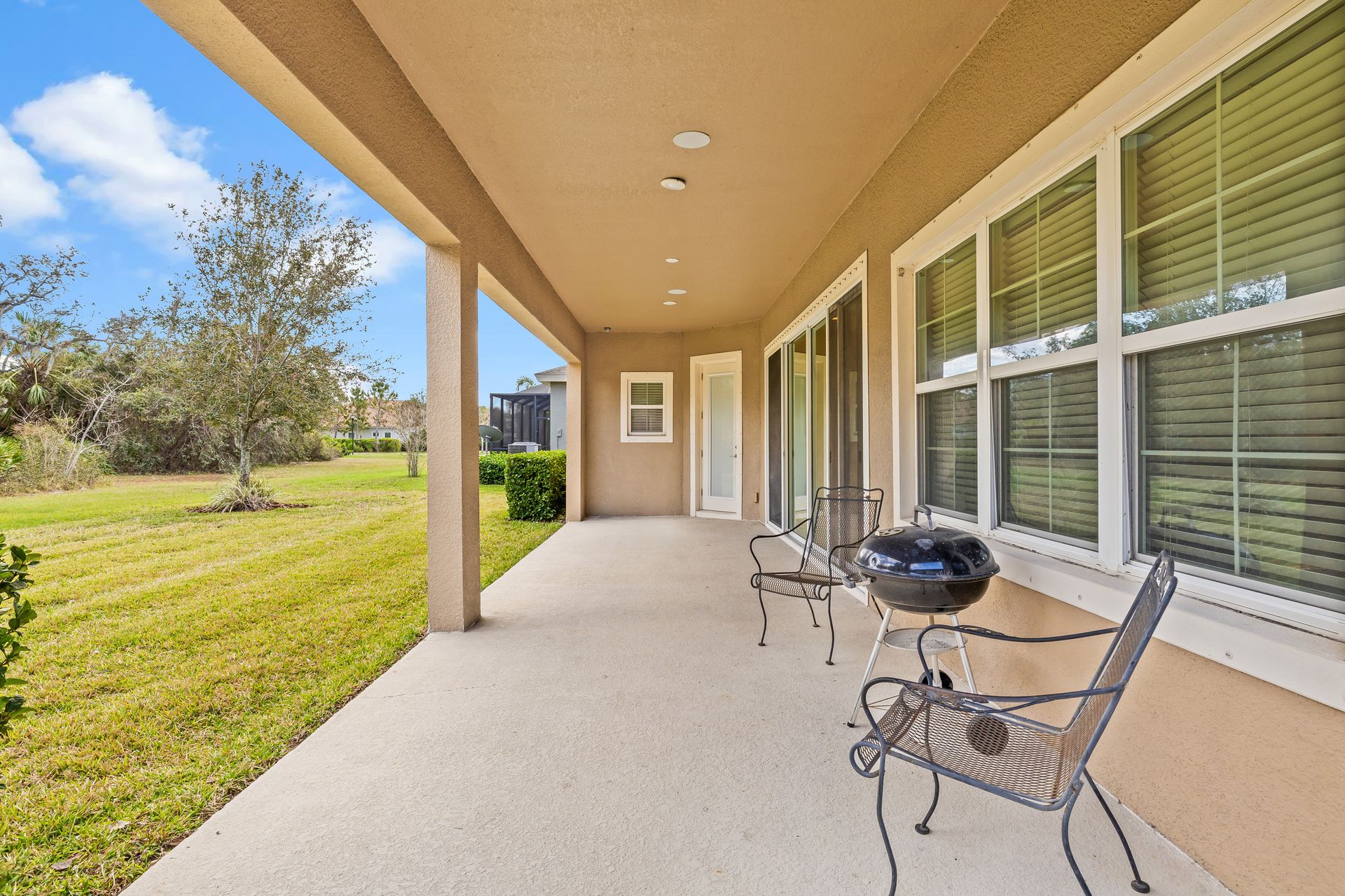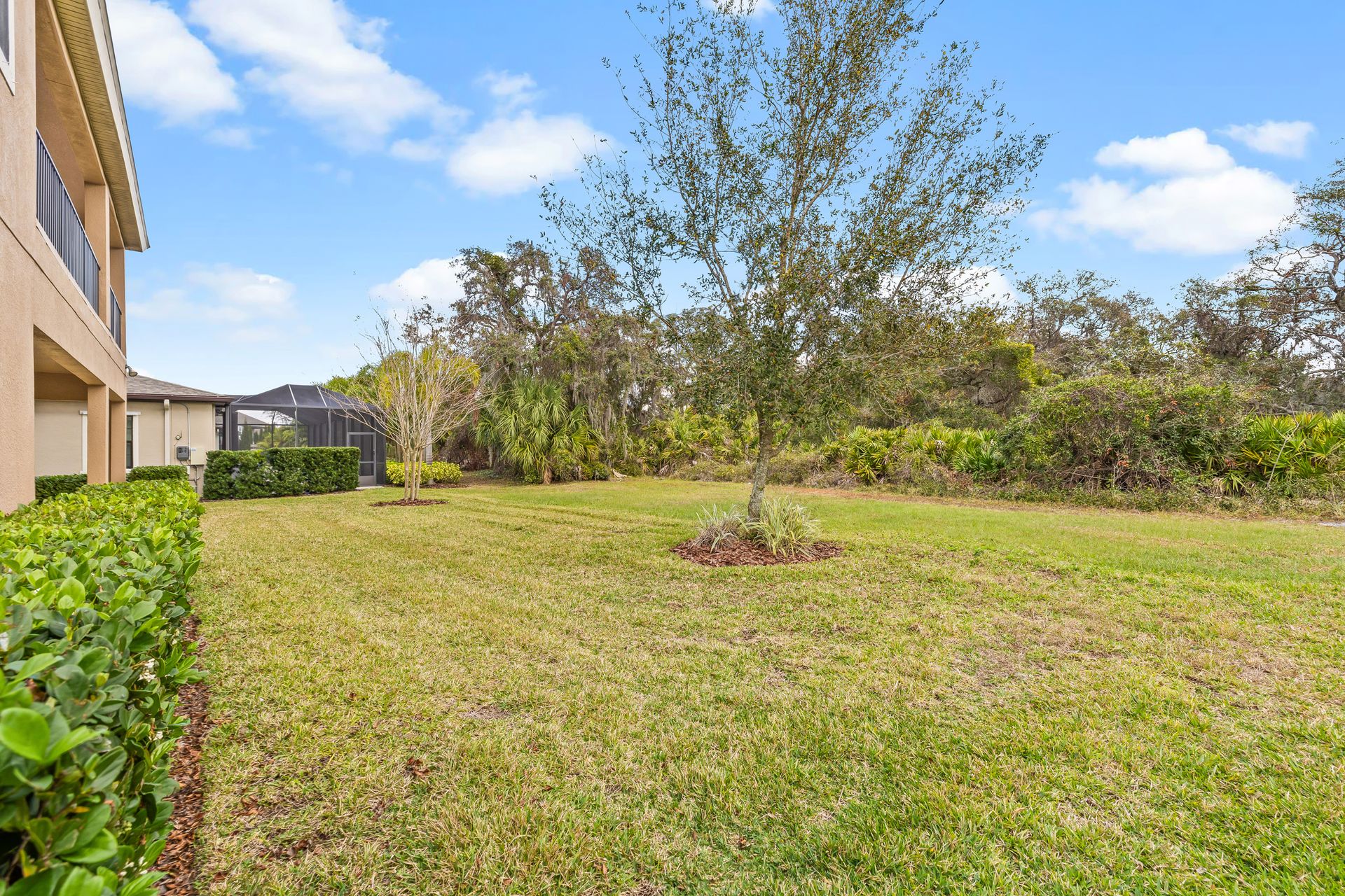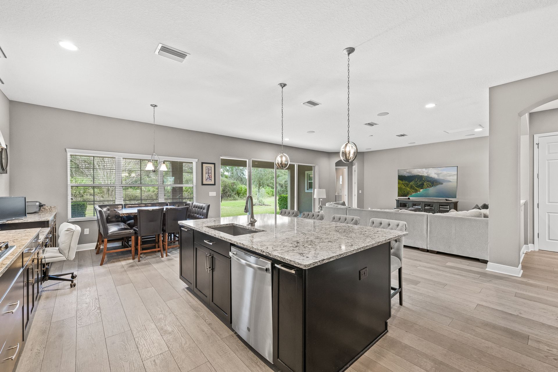 The heart of the home is the gorgeous gourmet kitchen, boasting granite countertops, 42” upper cabinets with crown molding, a stunning tile backsplash, stainless steel appliances—including a gas cooktop, wall oven, oversized island with storage and seating, and a custom built-in desk perfect for home office workstation with additional cabinets for extra storage space. Adjacent is the expansive family room, featuring built-in surround sound, casual dining space, and sliding glass doors that open to a lanai with pre-plumbing for your dream outdoor kitchen—all with breathtaking conservation views and privacy.