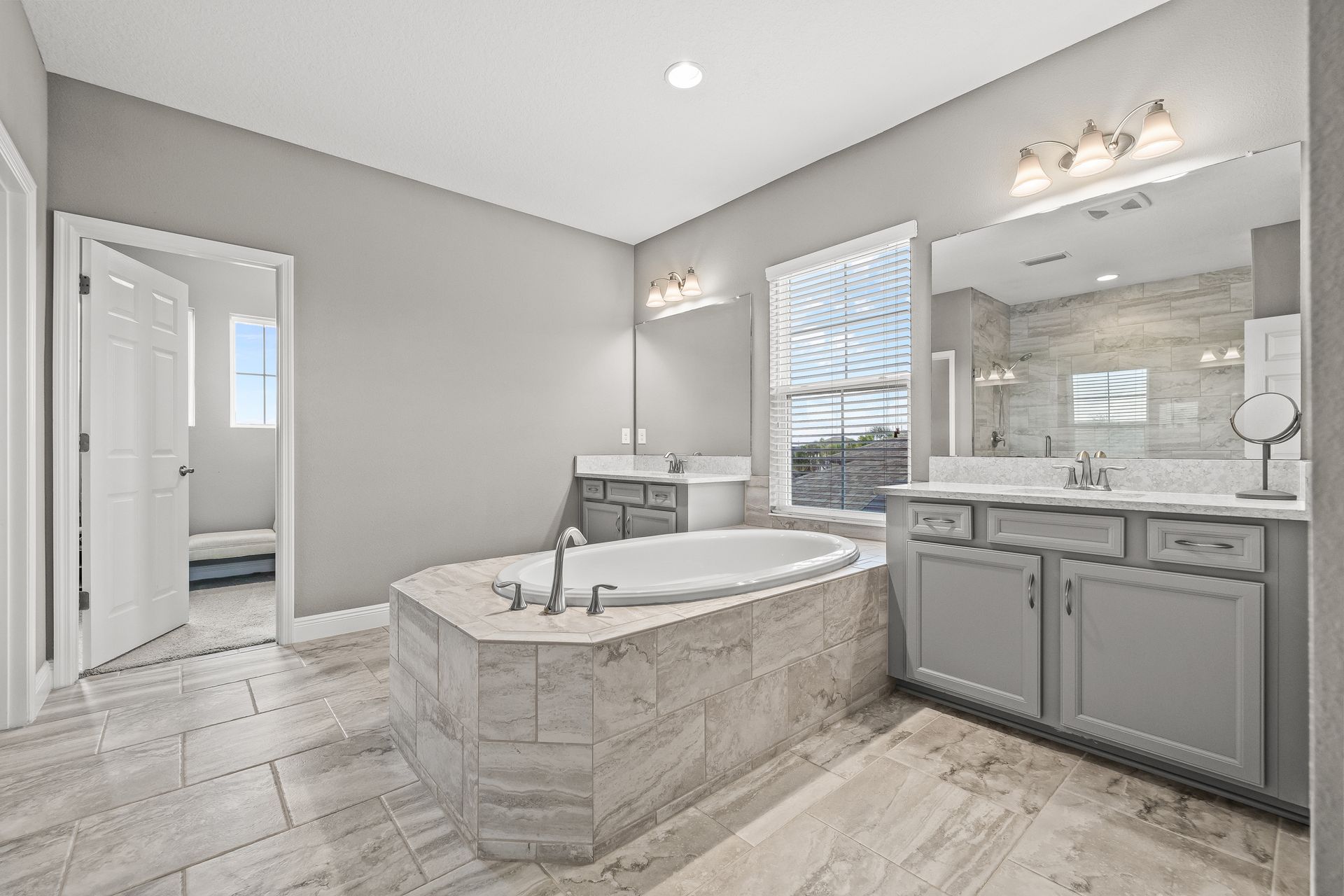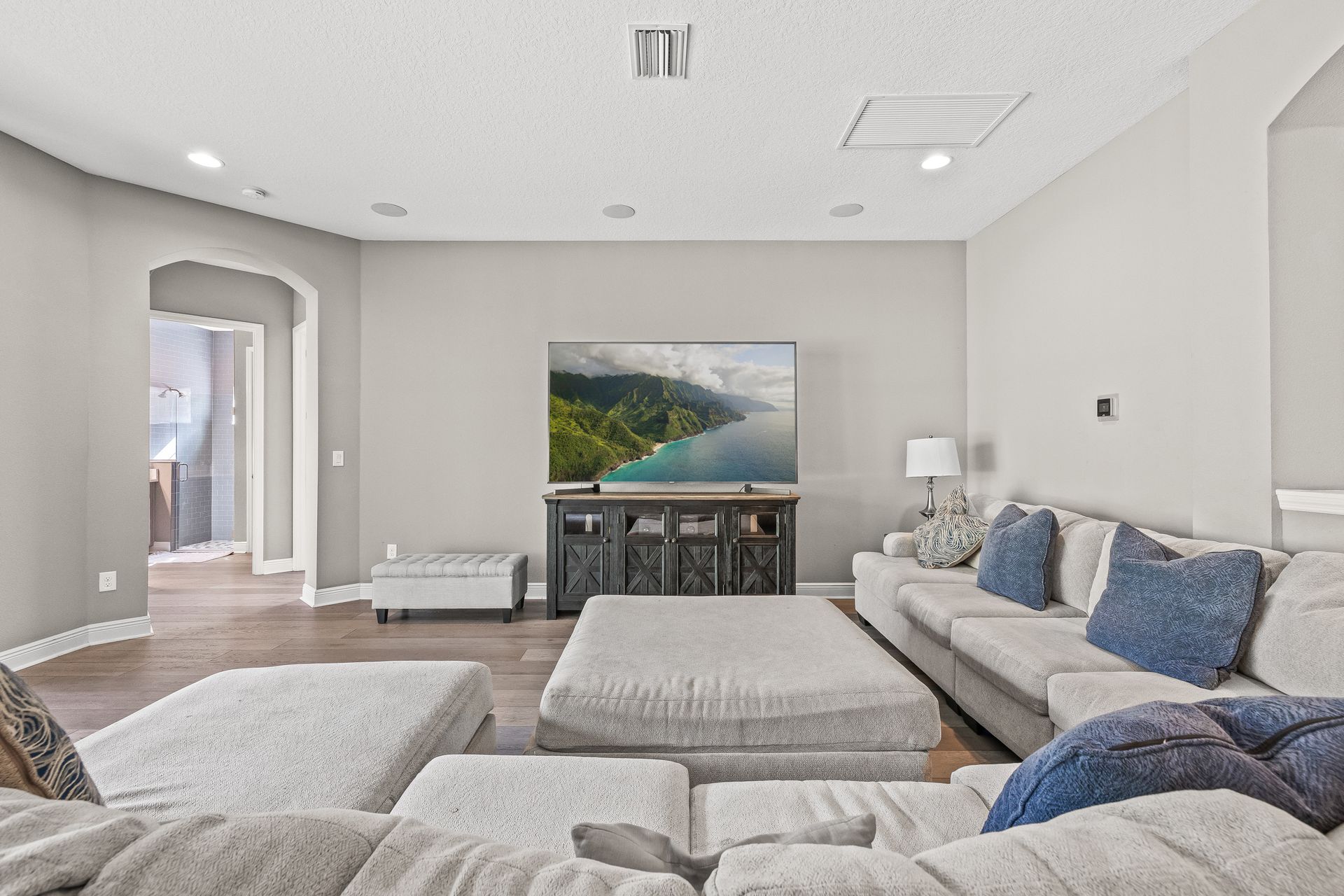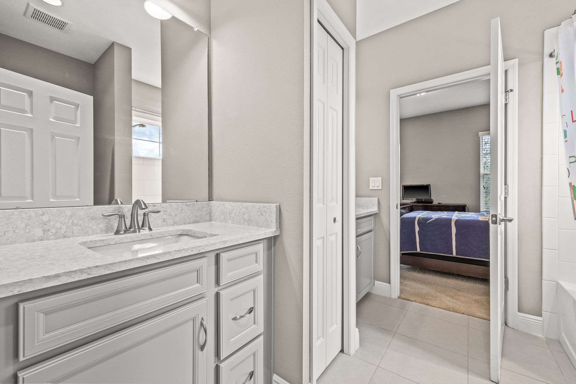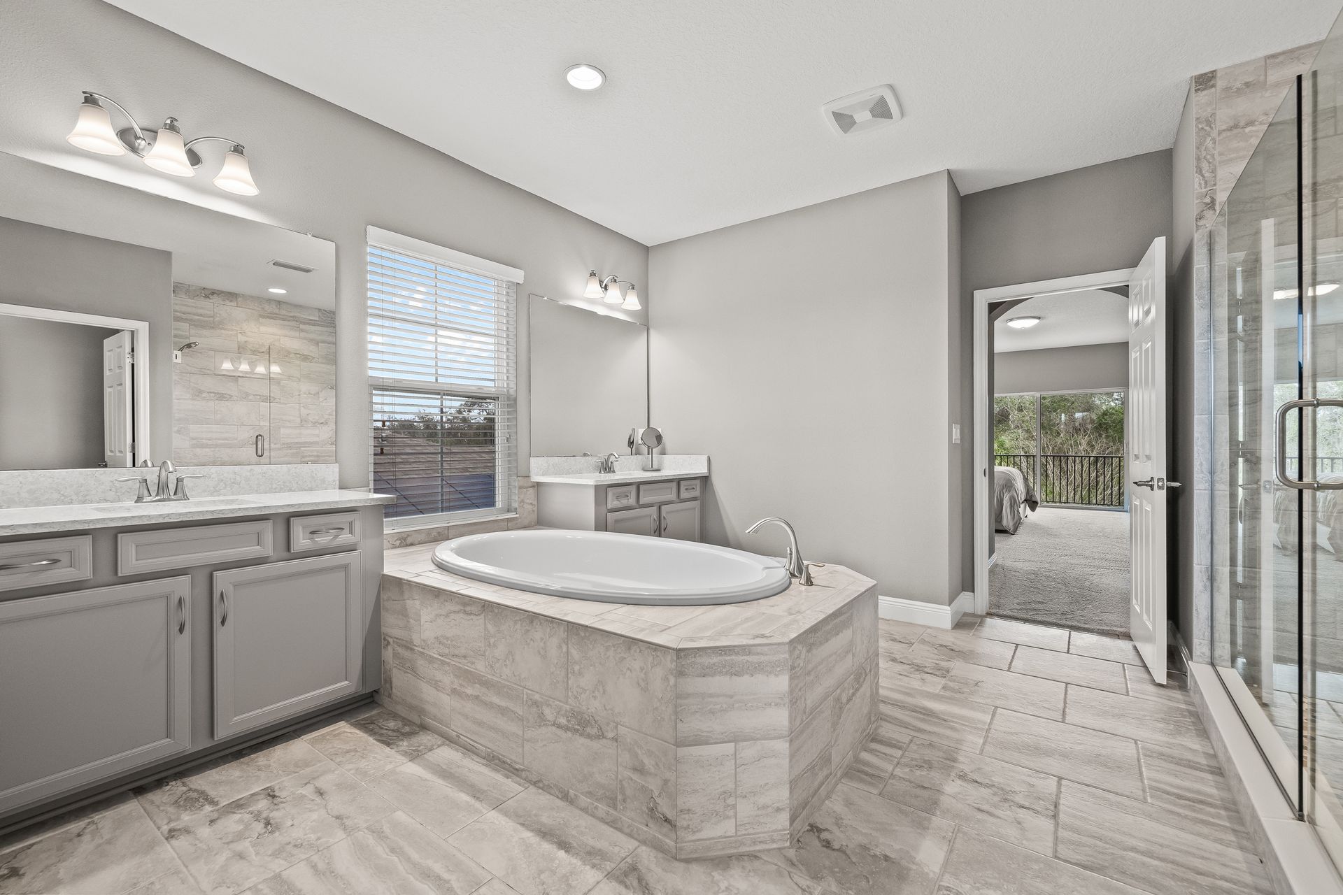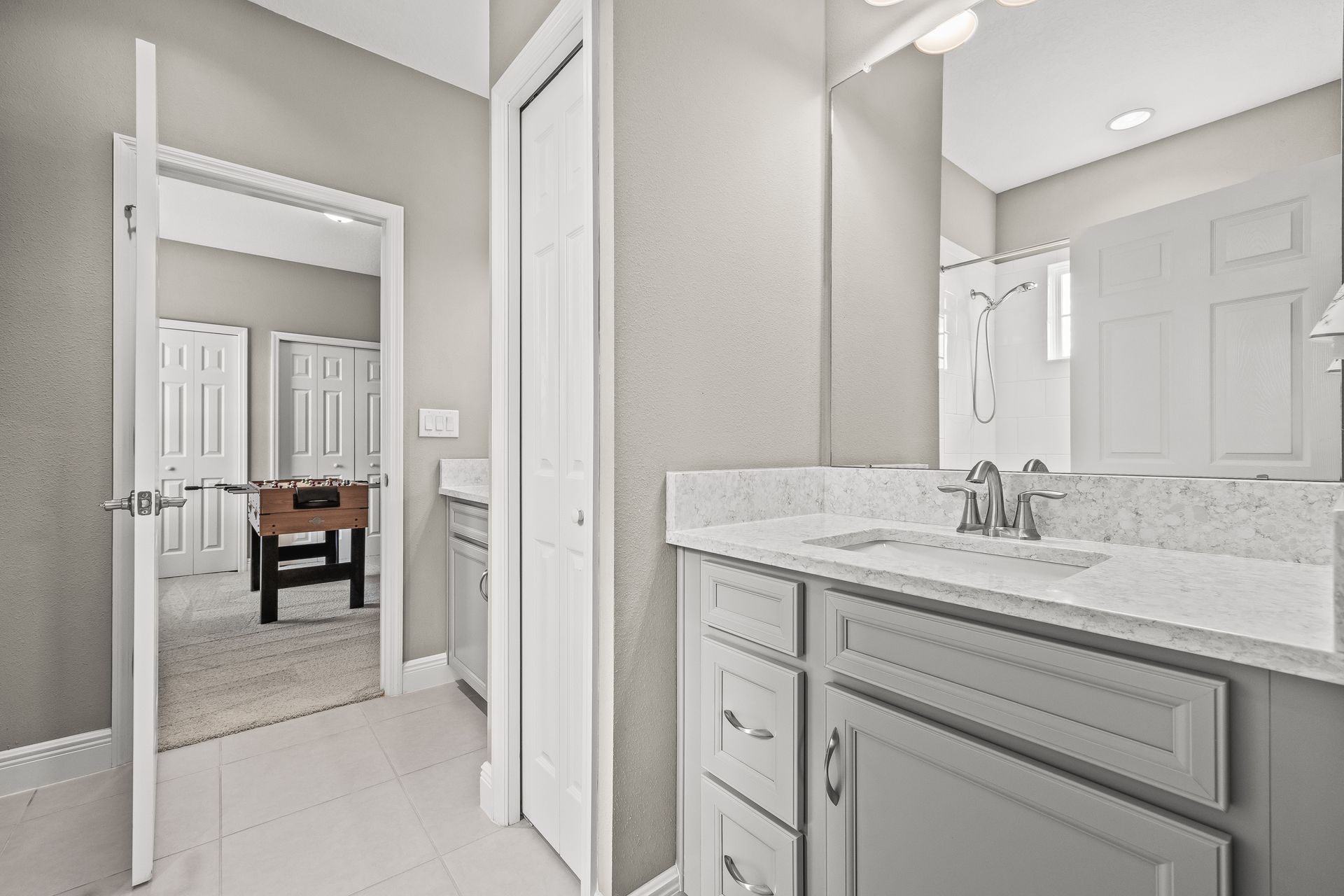 A first-floor guest suite offers a lanai access, and a bright bathroom with a walk-in shower and granite countertops, making it perfect for guests. Upstairs, a massive bonus room leads to a covered balcony, ideal for relaxing or entertaining. The primary suite is a private sanctuary with balcony access, soundproof walls, two walk-in closets, and a spa-like bathroom featuring a Jacuzzi tub, dual vanities, and a rain shower with decorative tile. The home also offers dual garages with ample storage space including plenty of room for your golf cart!