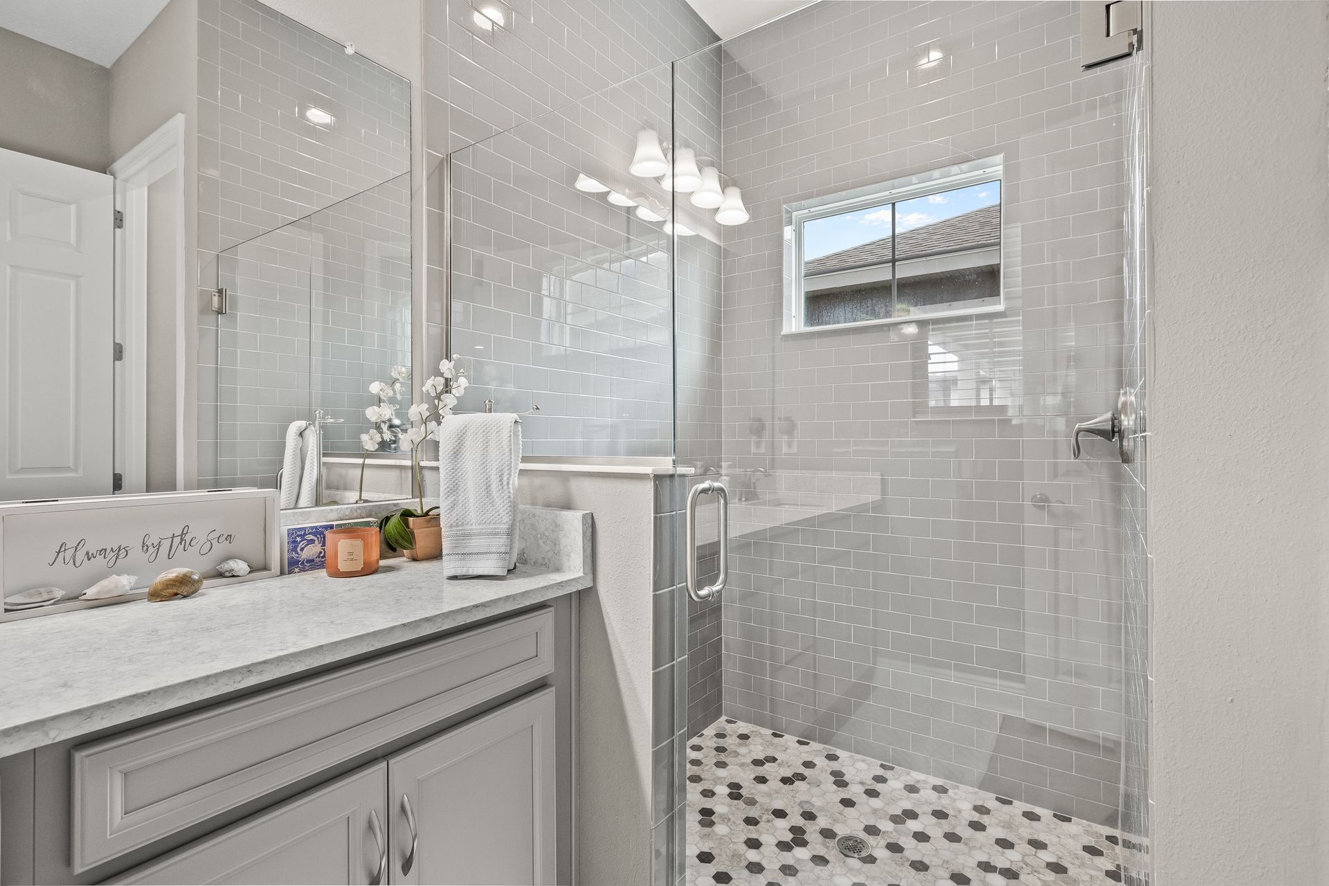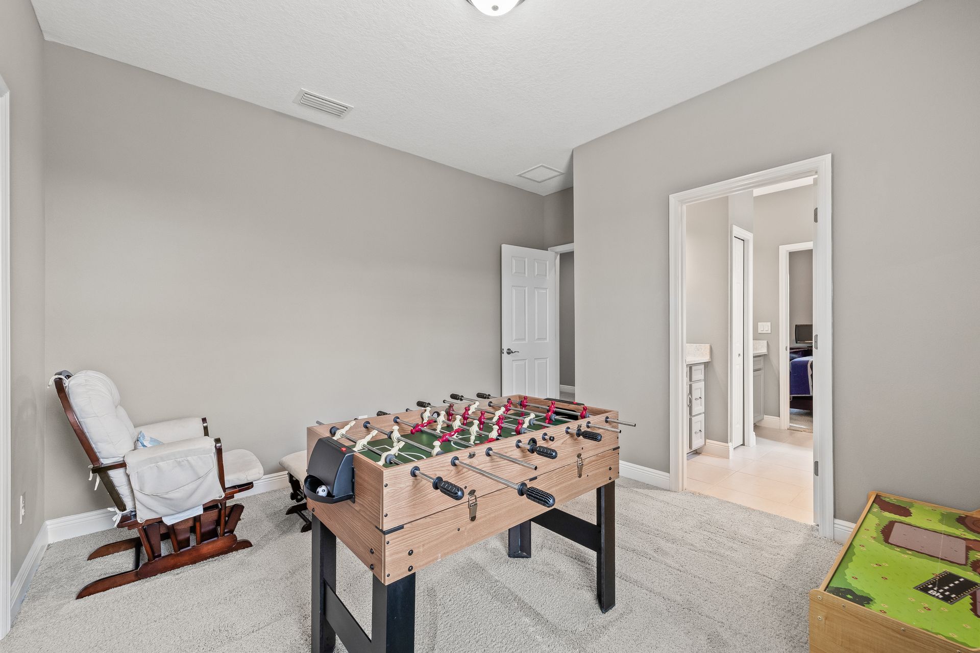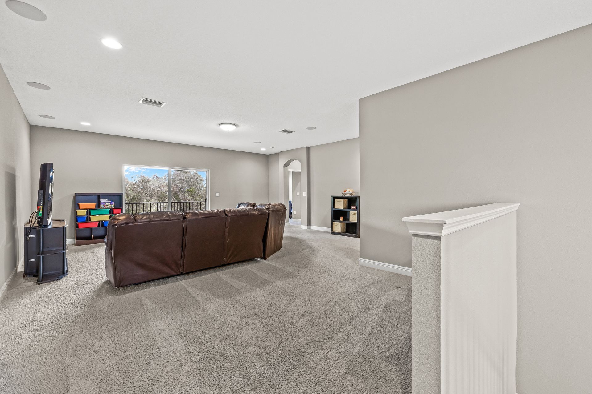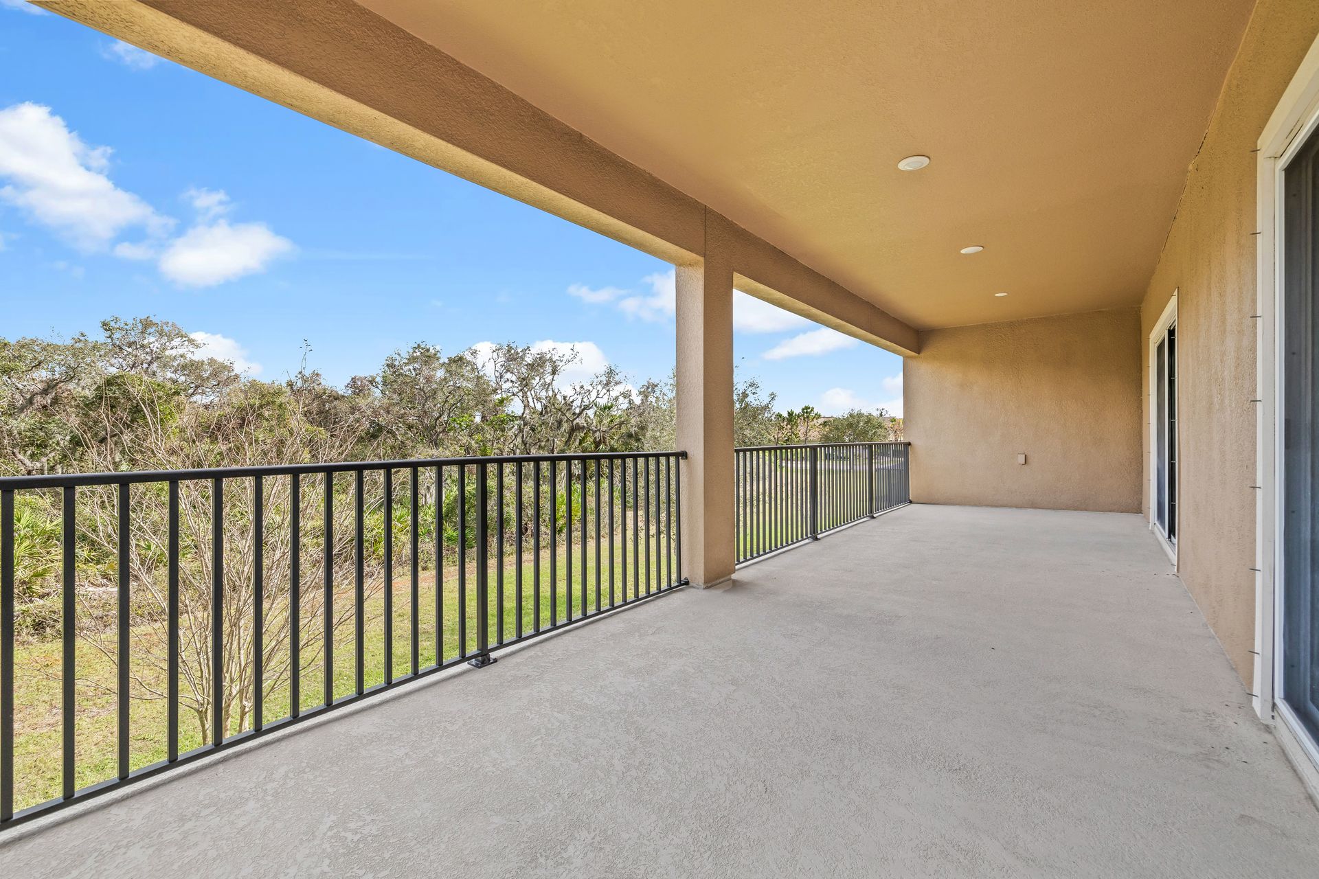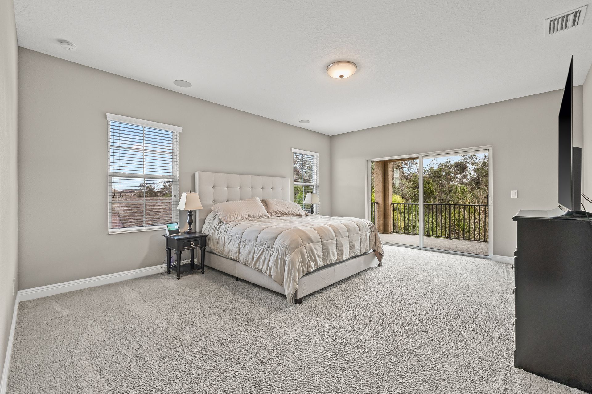 A first-floor guest suite offers a lanai access, and a bright bathroom with a walk-in shower and granite countertops, making it perfect for guests. Upstairs, a massive bonus room leads to a covered balcony, ideal for relaxing or entertaining. The primary suite is a private sanctuary with balcony access, soundproof walls, two walk-in closets, and a spa-like bathroom featuring a Jacuzzi tub, dual vanities, and a rain shower with decorative tile. The home also offers dual garages with ample storage space including plenty of room for your golf cart!