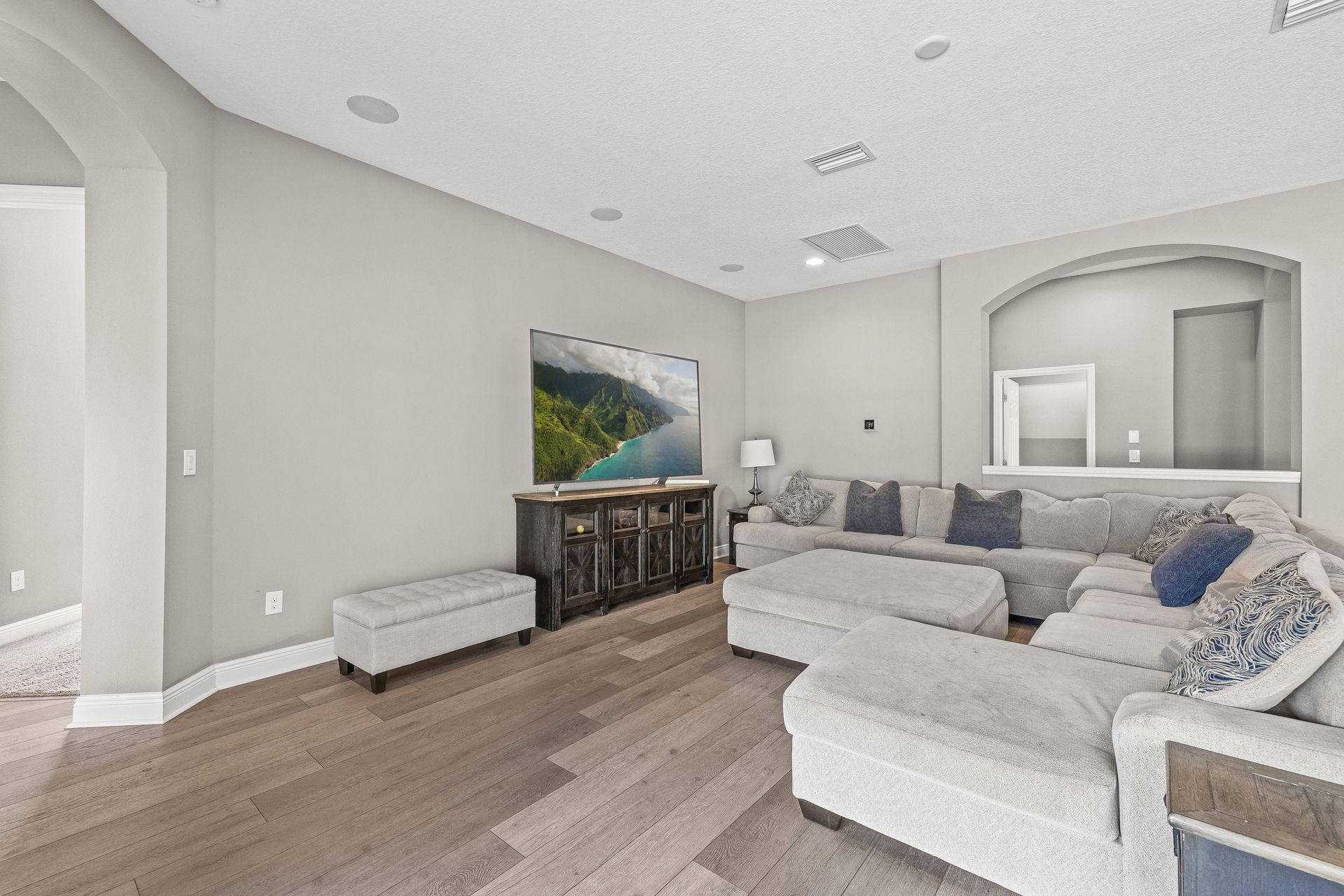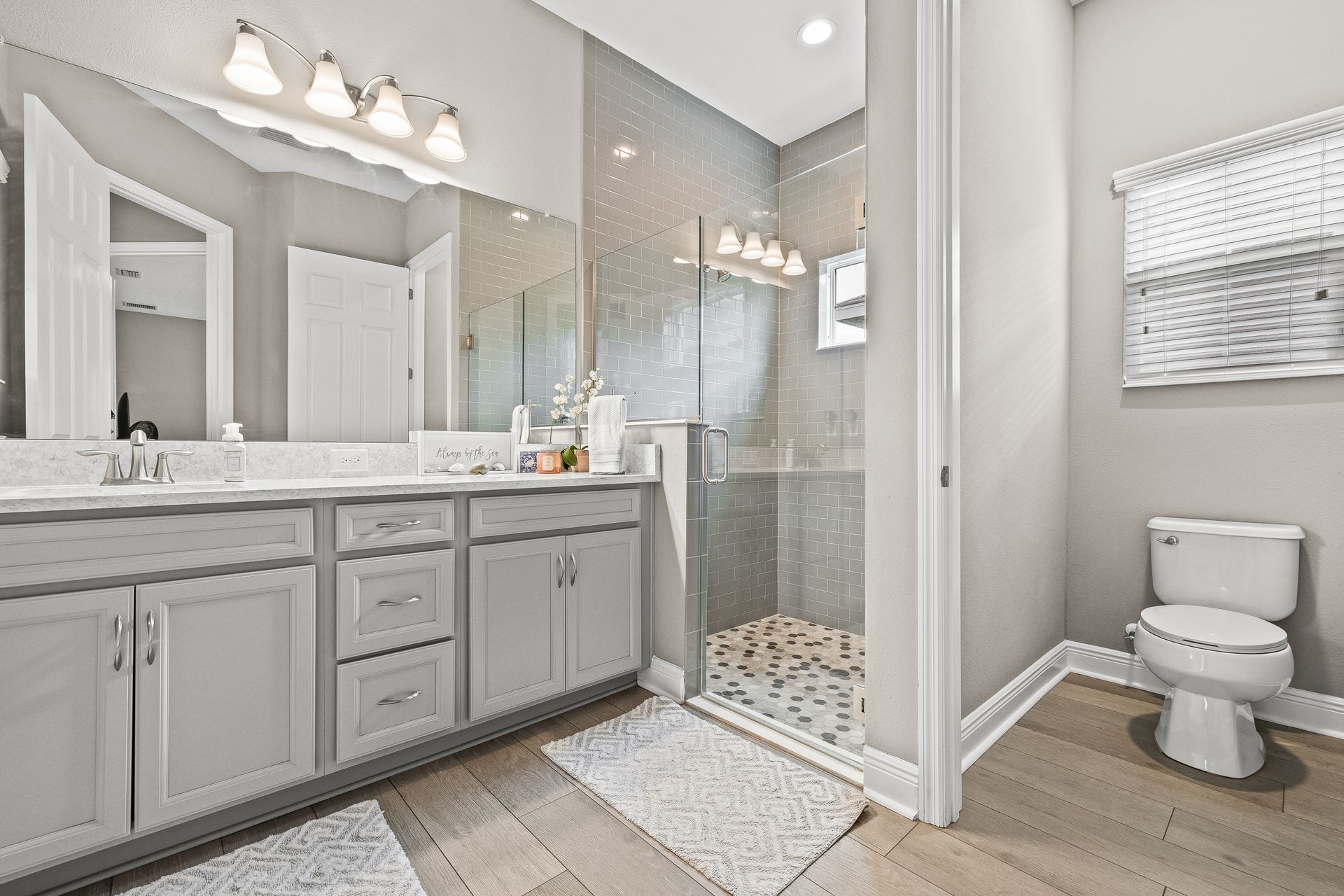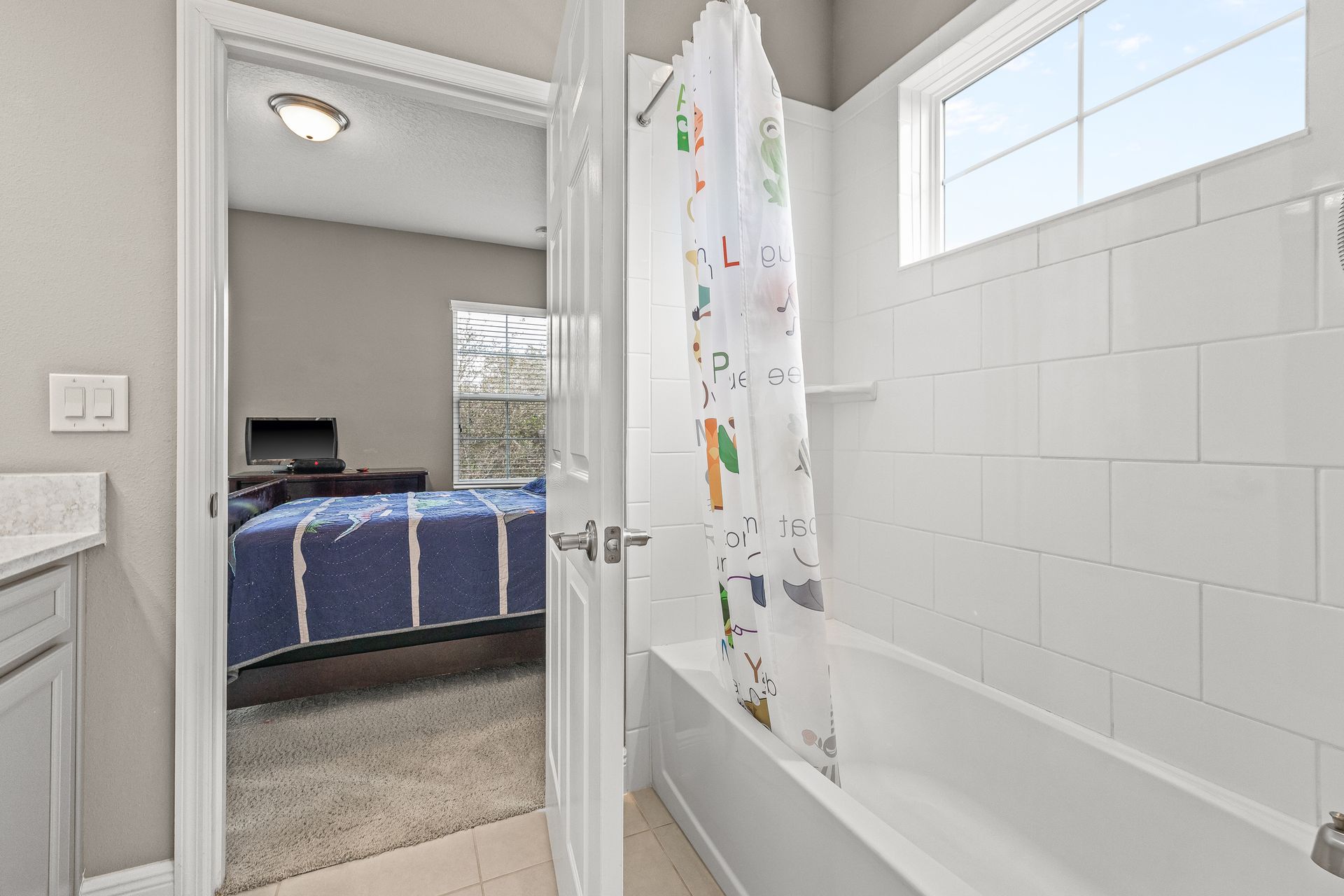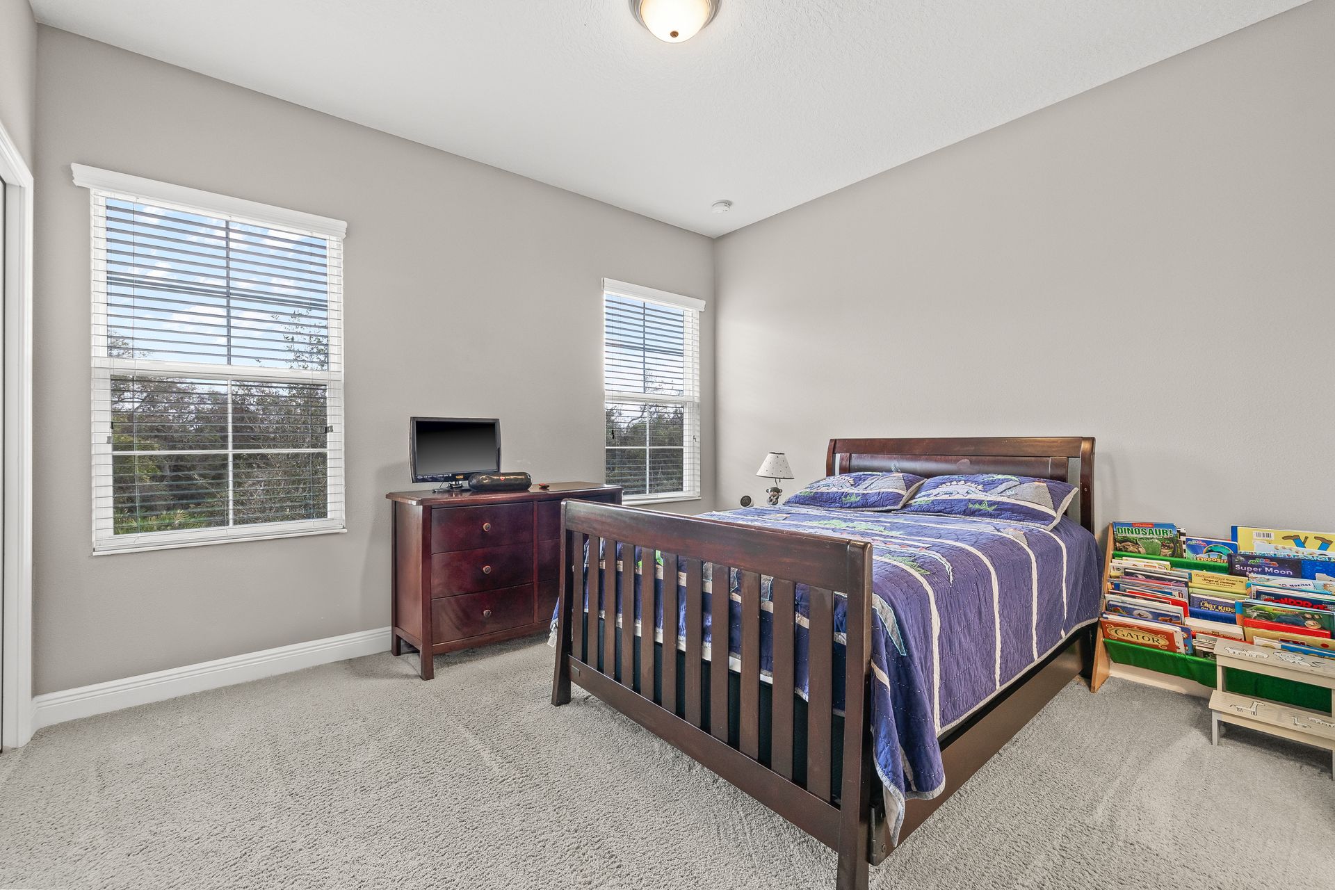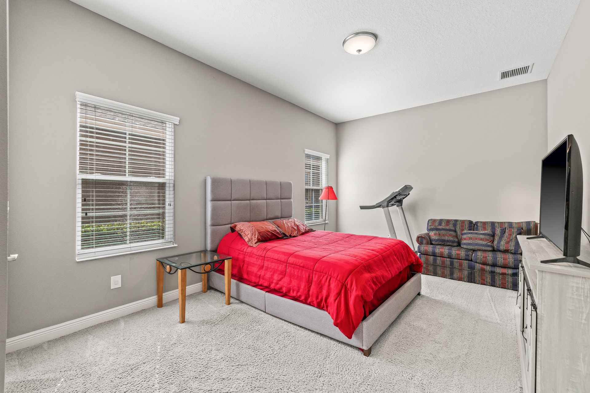 A first-floor guest suite offers a lanai access, and a bright bathroom with a walk-in shower and granite countertops, making it perfect for guests. Upstairs, a massive bonus room leads to a covered balcony, ideal for relaxing or entertaining. The primary suite is a private sanctuary with balcony access, soundproof walls, two walk-in closets, and a spa-like bathroom featuring a Jacuzzi tub, dual vanities, and a rain shower with decorative tile. The home also offers dual garages with ample storage space including plenty of room for your golf cart!