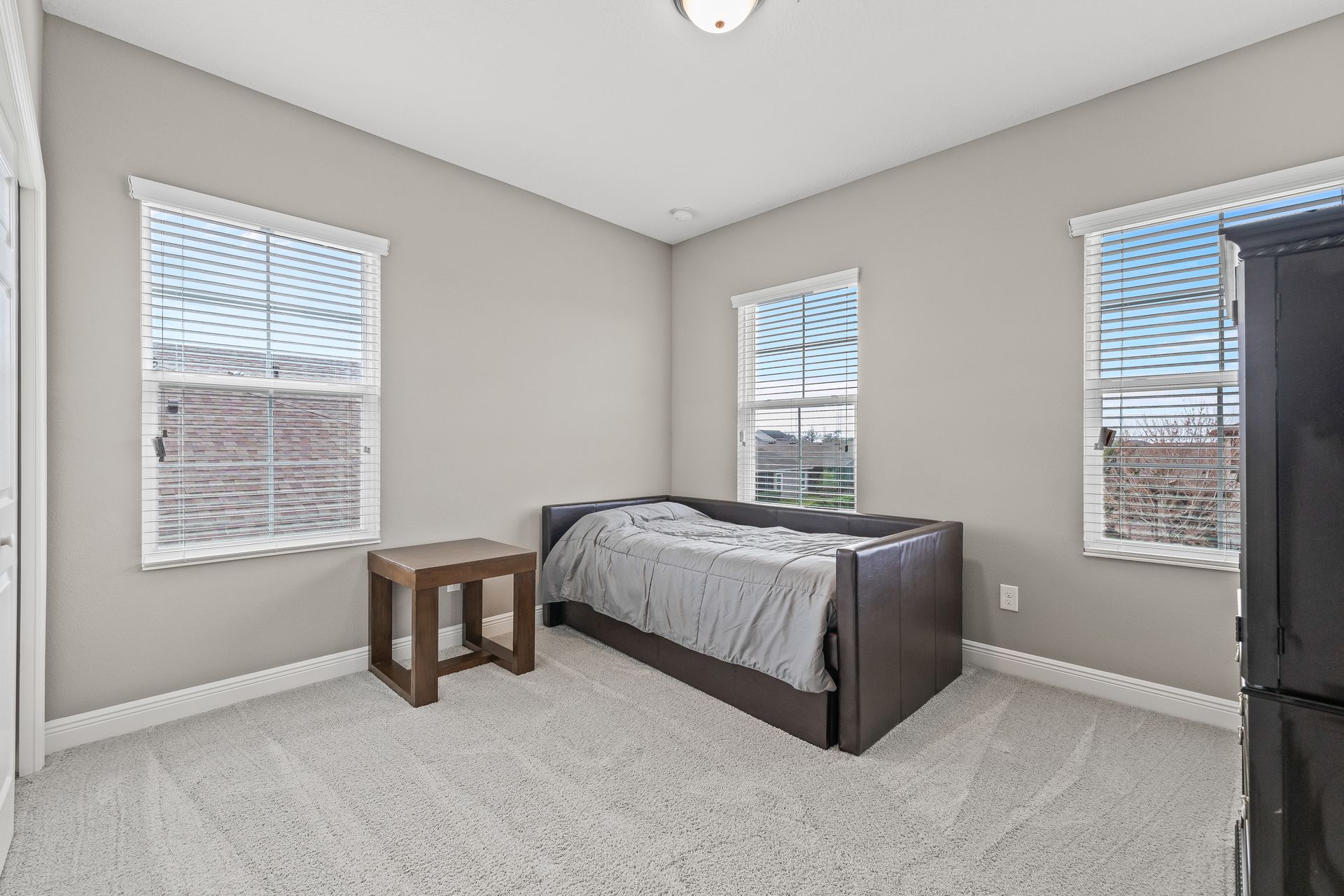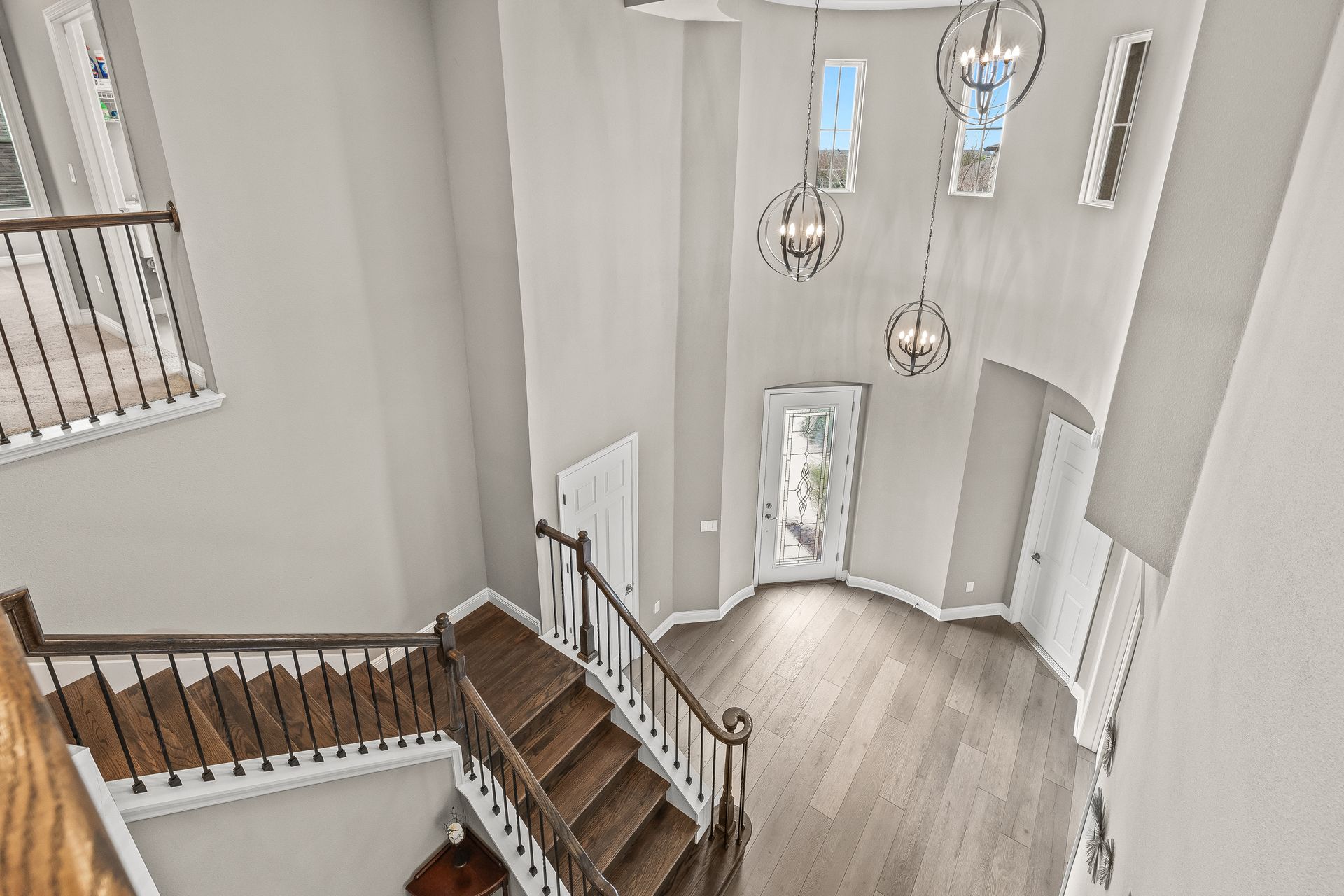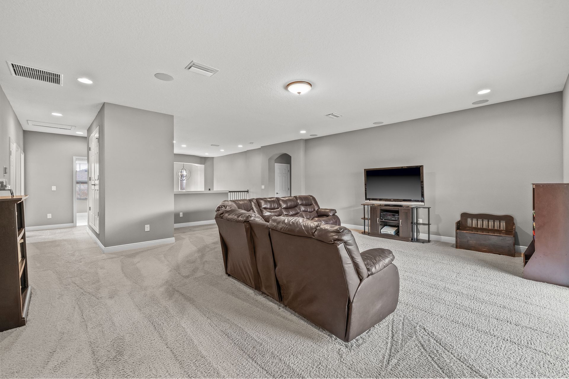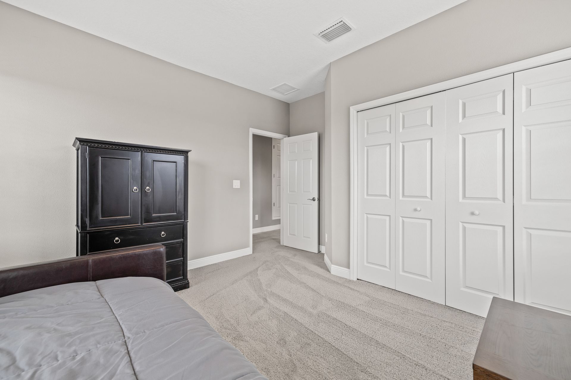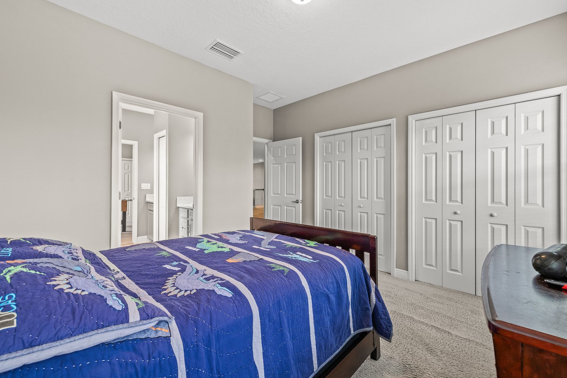A first-floor guest suite offers a lanai access, and a bright bathroom with a walk-in shower and granite countertops, making it perfect for guests. Upstairs, a massive bonus room leads to a covered balcony, ideal for relaxing or entertaining. The primary suite is a private sanctuary with balcony access, soundproof walls, two walk-in closets, and a spa-like bathroom featuring a Jacuzzi tub, dual vanities, and a rain shower with decorative tile. The home also offers dual garages with ample storage space including plenty of room for your golf cart!