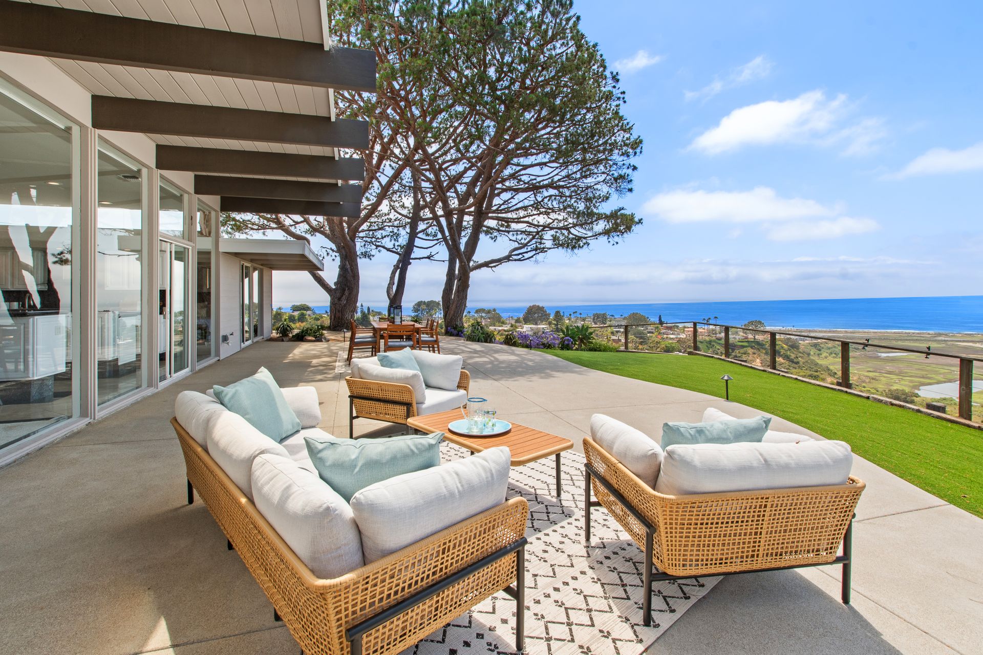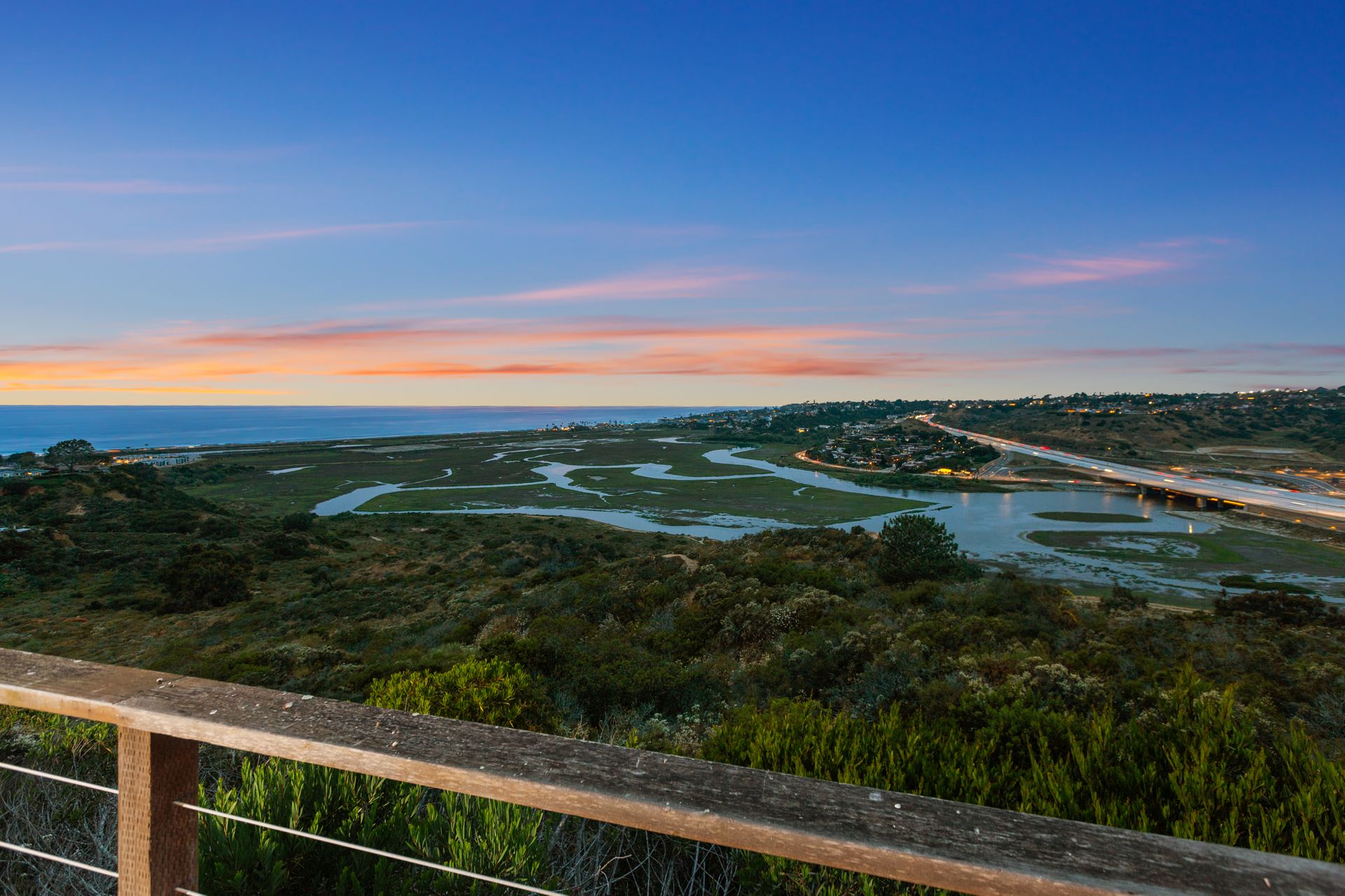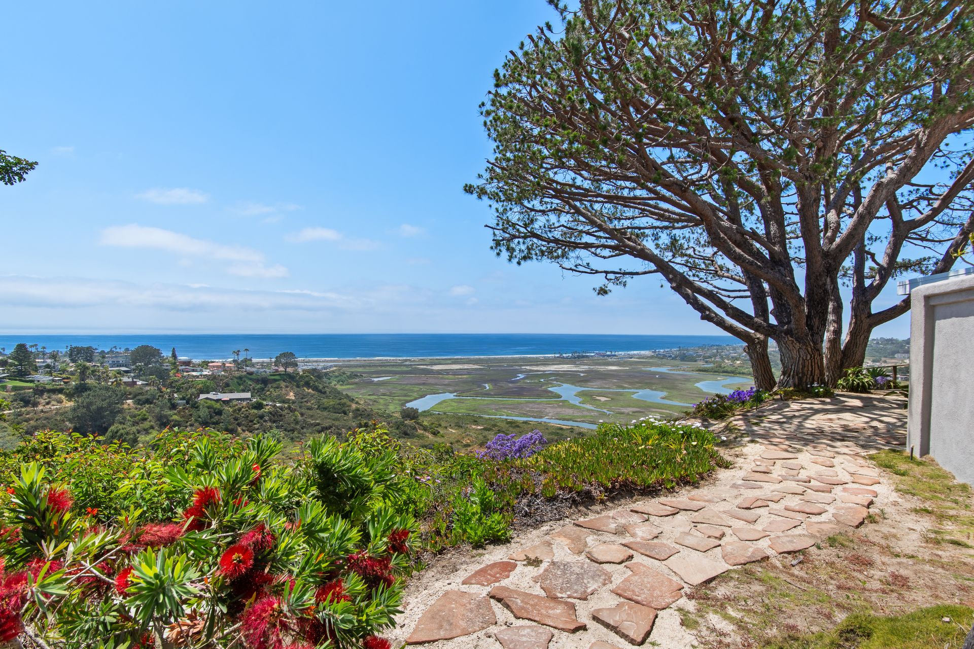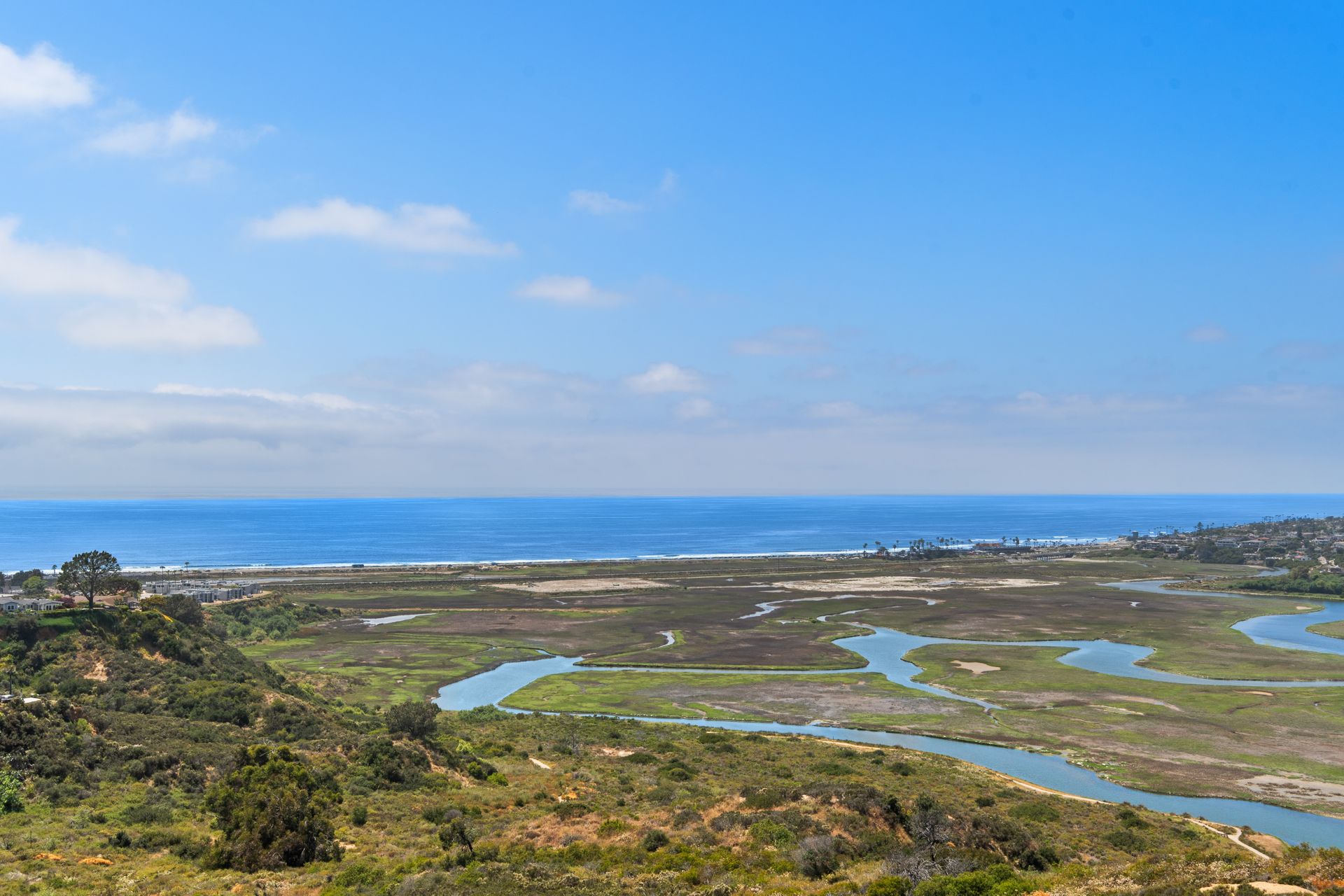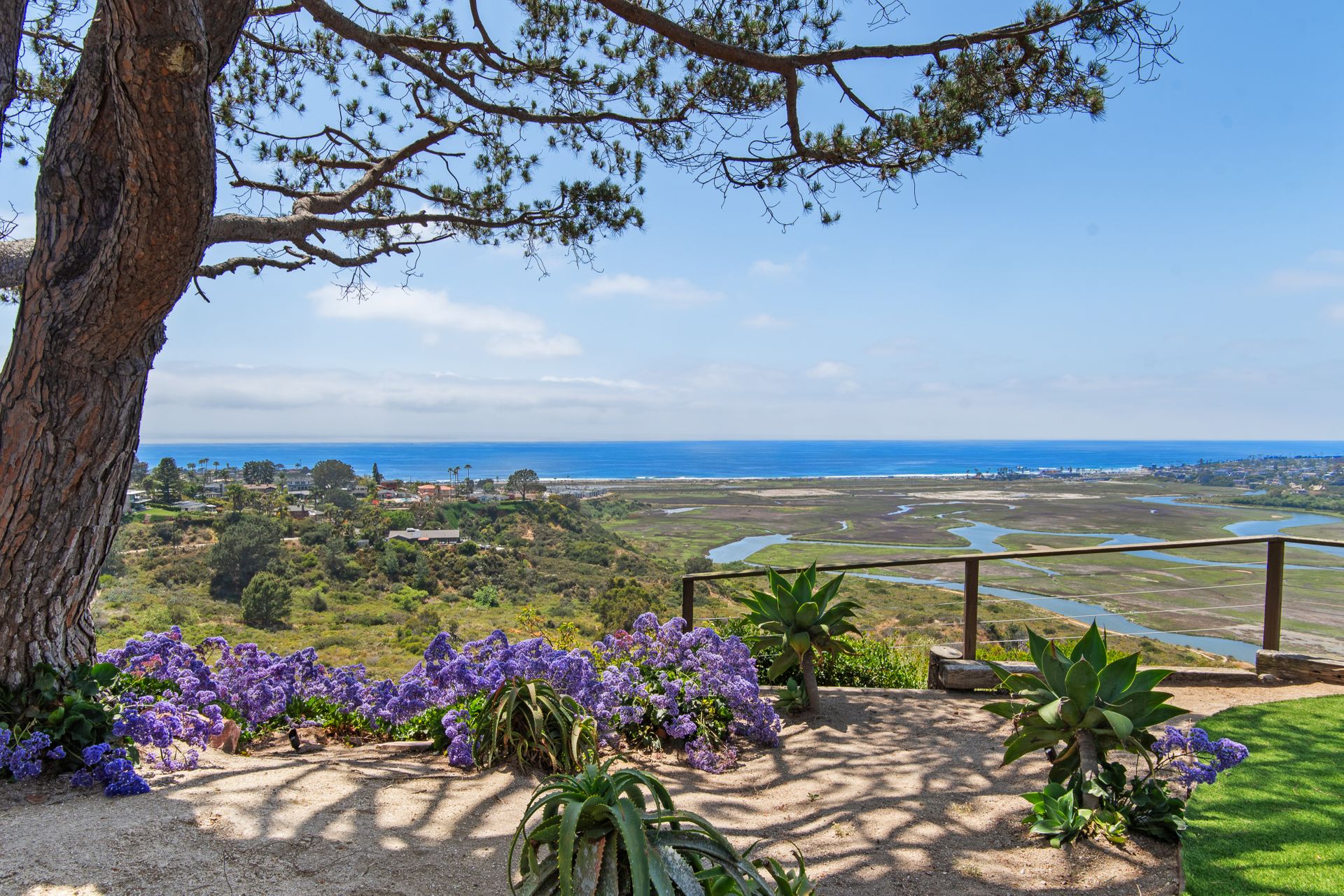Properties like this are rarely available – combining an exceptional location, expansive land, and breathtaking views. Perched high on a hill west of the 5 freeway in highly sought-after Solana Beach, experience unobstructed whitewater views of Cardiff State Beach and the San Elijo Lagoon from every room in this single level home. The expansive lot is one of the largest along the coast at 1.28 acres, with a slope down toward the canyon and land that border the lagoon. The protected green space down below provides the ultimate in tranquility and FOREVER VIEWS. Enjoy effortless outdoor living with two distinct patios – one off the kitchen with panoramic views from the ocean to the mountains, and one off the living room that offers exceptional privacy and ocean views. Inside, the home is flooded with natural light from the floor-to-ceiling windows and new skylights. The gourmet kitchen comes equipped with new stainless-steel appliances (premium refrigerator, wine fridge, compactor and dishwasher), a double oven, gas cooktop with grill, high quality cabinets, a walk-in pantry, and granite counters. The views continue in the family room with fireplace and built-in cabinetry, and from the great room with dining and living areas. You’ll find two spacious bedrooms, each with their own en-suite bathroom, abundant closet space, and a wall of windows facing the ocean and lagoon. Other valuable improvements on the property include a new roof, beautiful new Luxury Vinyl Plank and carpet, new A/C units and furnaces, LED recessed lighting throughout, new interior and exterior paint, new concrete patio and turf in the backyard, new low-voltage lighting outside, and 2 new 40-gal water heaters. The time is now. Don’t miss your chance to own this stunning property.