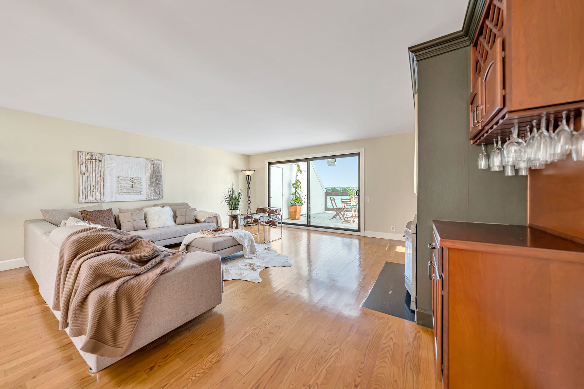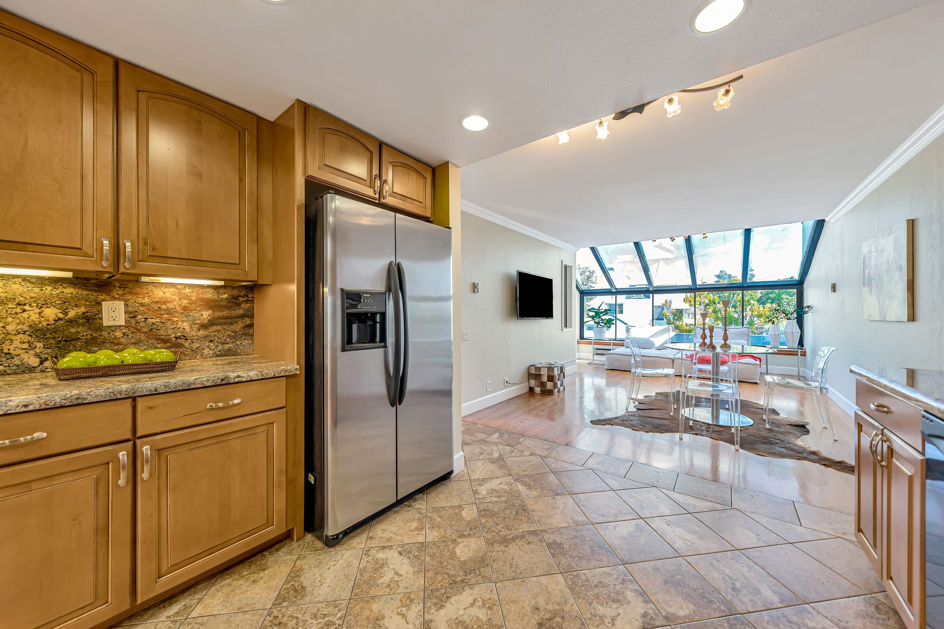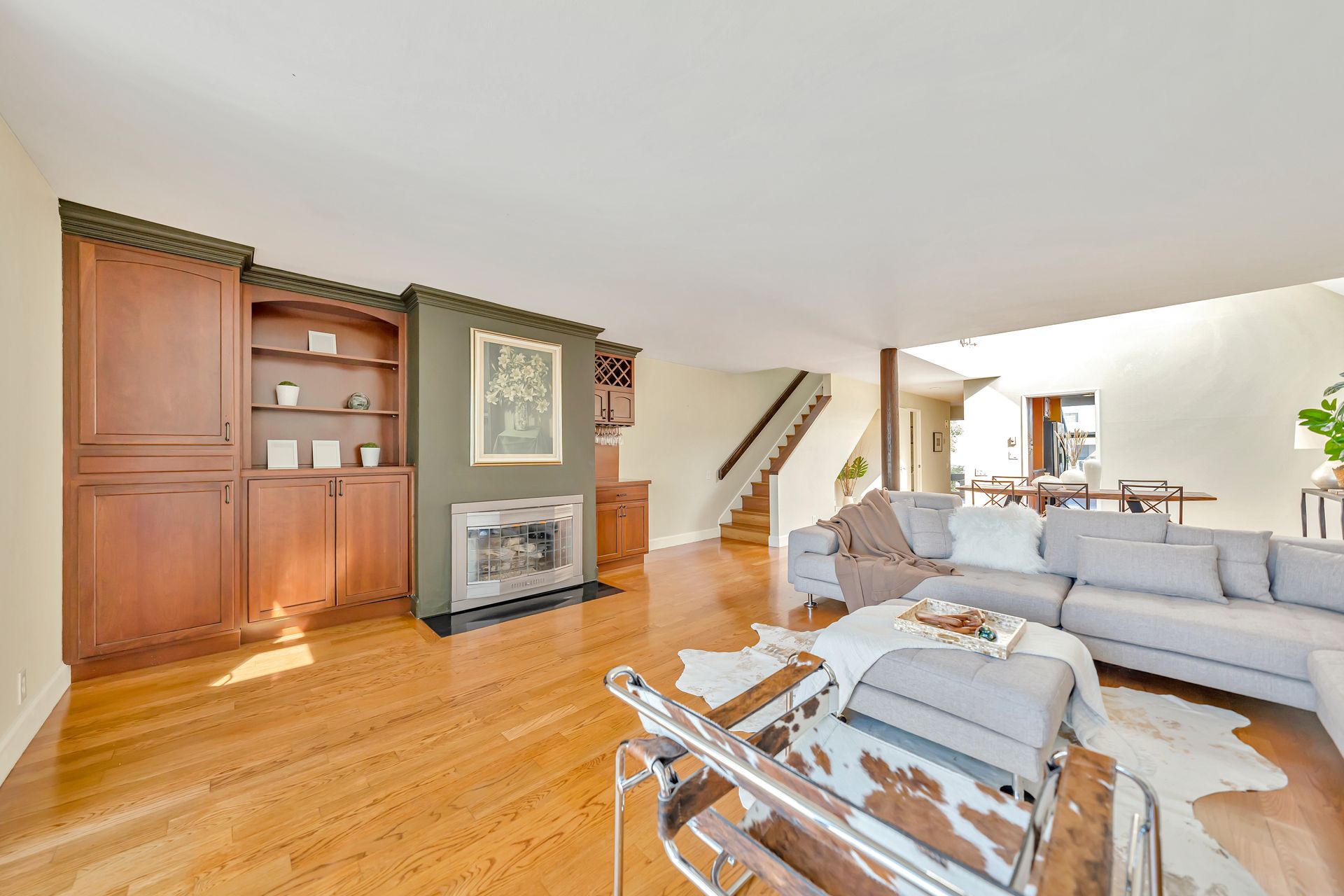 The living room features high ceilings, hardwood floors, a gas fireplace and built-in cabinetry with bar area! From the living room, you can exit out to the large balcony and enjoy the serene wide water views-a great place to relax and entertain, perhaps even catch some events happening on the water! There is also access to the water from the balcony! The kitchen features granite counters, beautiful cabinets, and stainless-steel appliances. There is an eat-in area/den right off the kitchen with amazing light!
