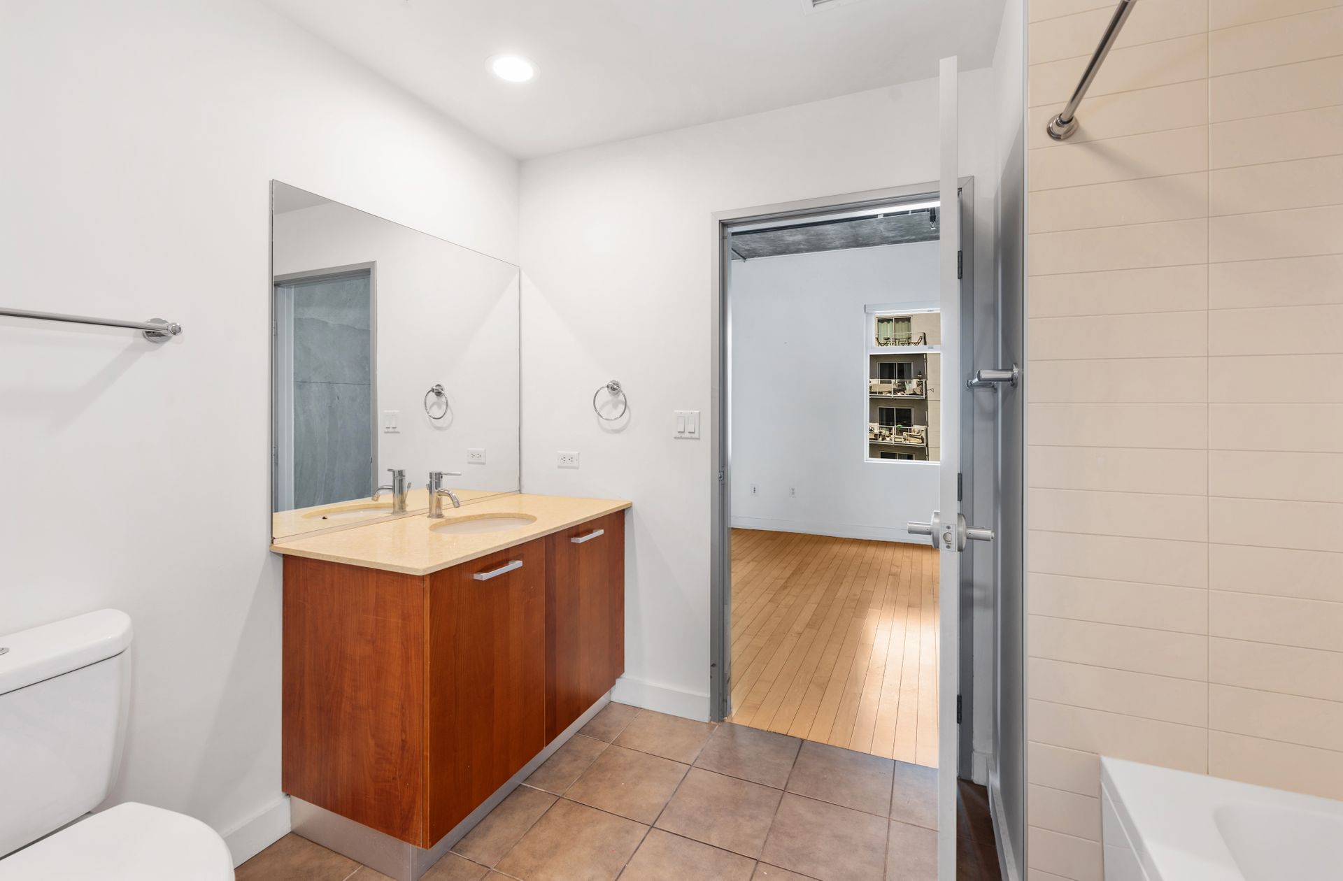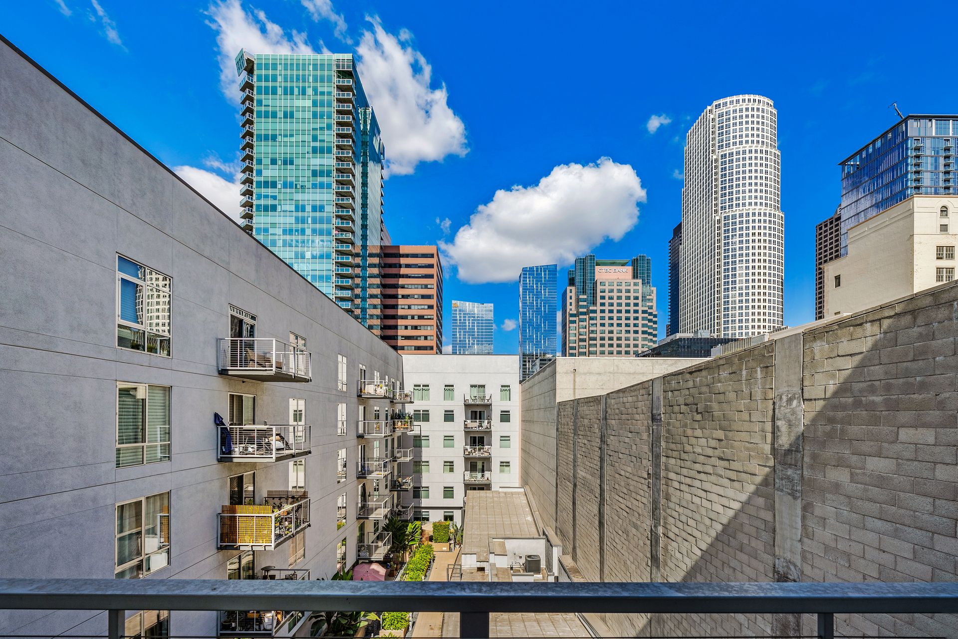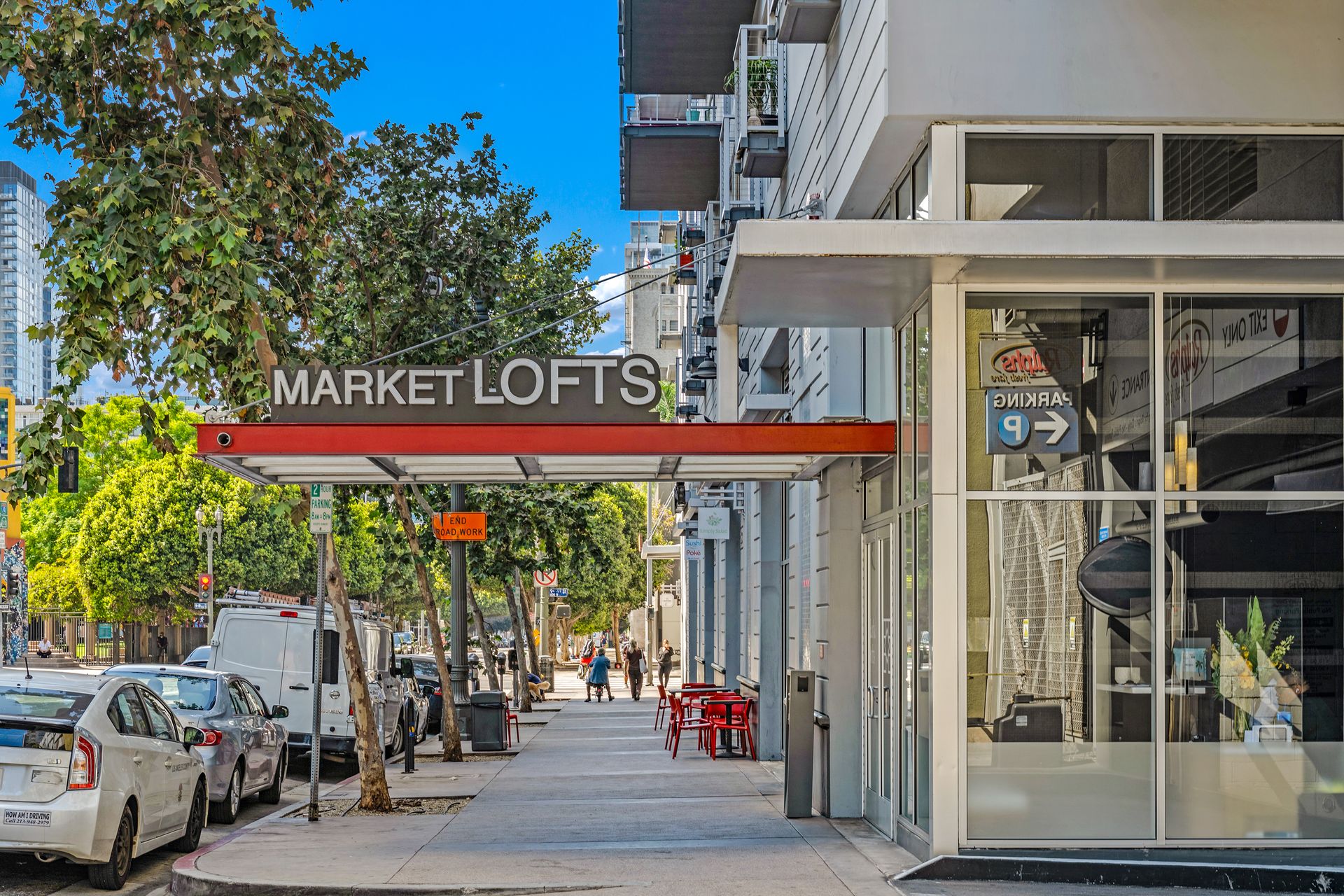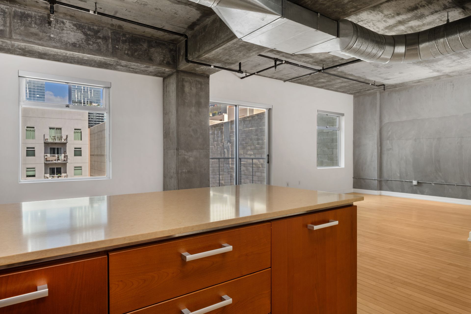 Welcome to the Market Lofts in DTLA! This contemporary-style condominium offers an open floor plan that creates an inviting atmosphere, allowing for natural light to flow throughout the living areas. It's an end unit with no shared walls and offers tons of privacy. The unit comes with hardwood floors, in-unit combo washer/dryer, two bedrooms areas with designated bathrooms, two spacious closets, and a private balcony. The kitchen is equipped with stainless steel appliances and a breakfast bar, providing a modern and functional cooking environment. The private balcony offers views of DTLA, offering a unique and visually appealing perspective. The overall design of the condominium prioritizes functionality and livability, making it an ideal living space for those seeking a comfortable and well-appointed home.