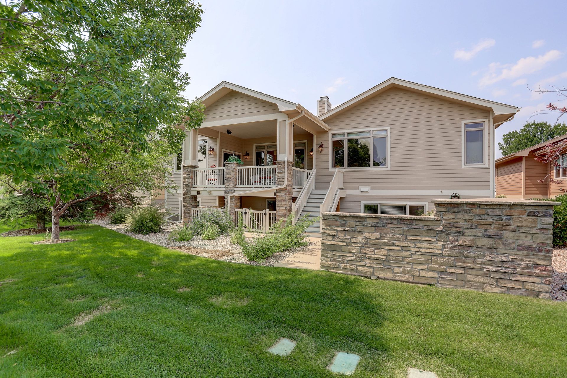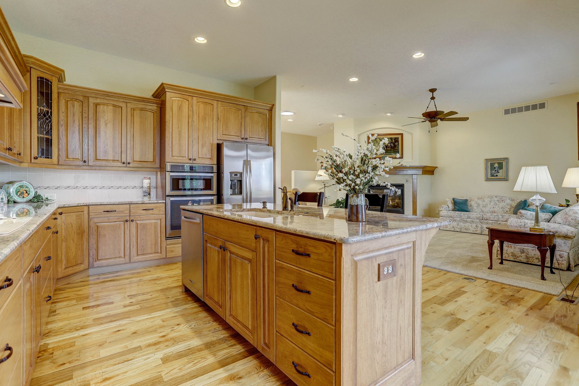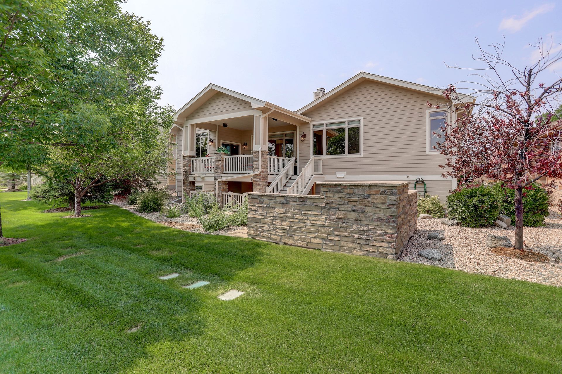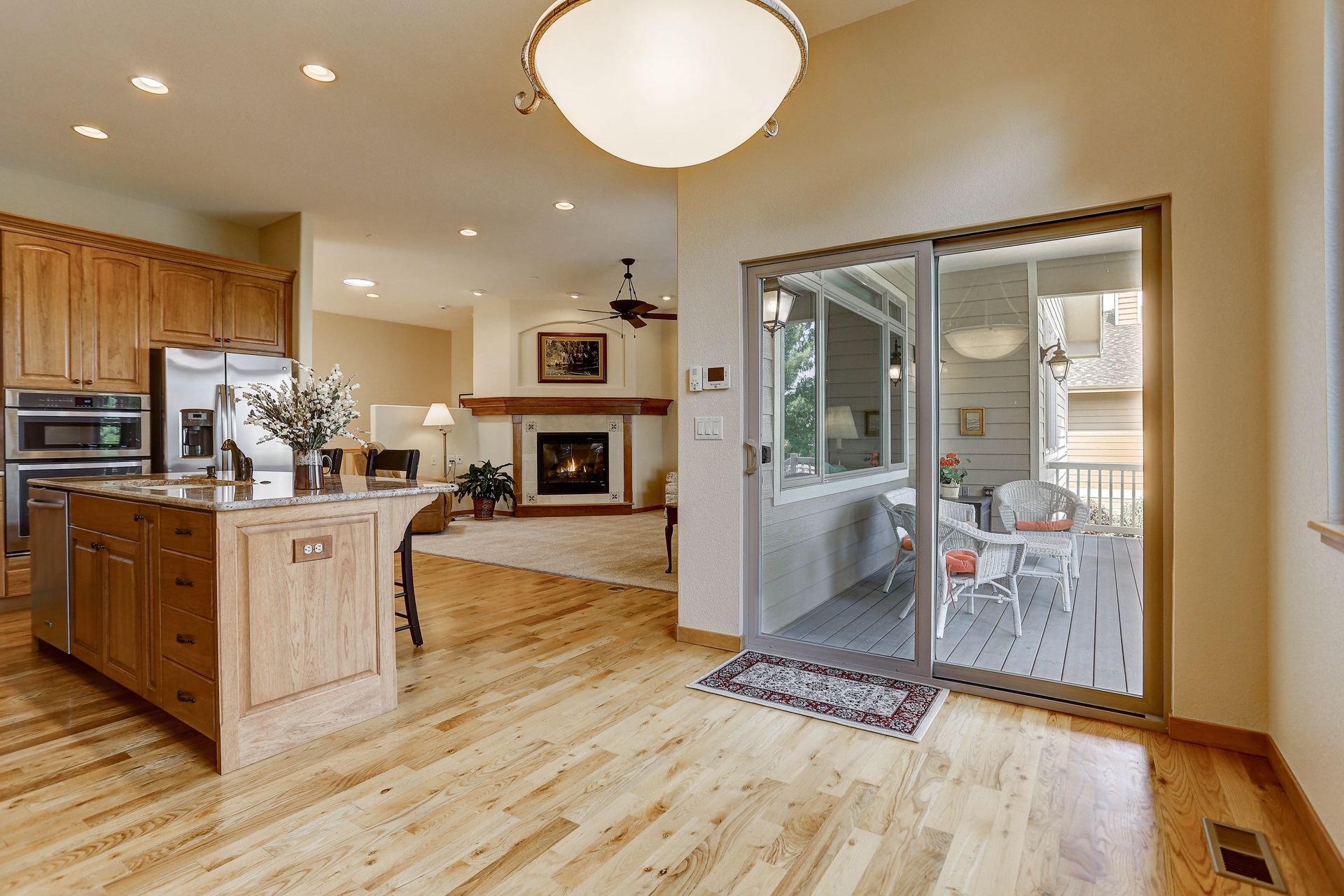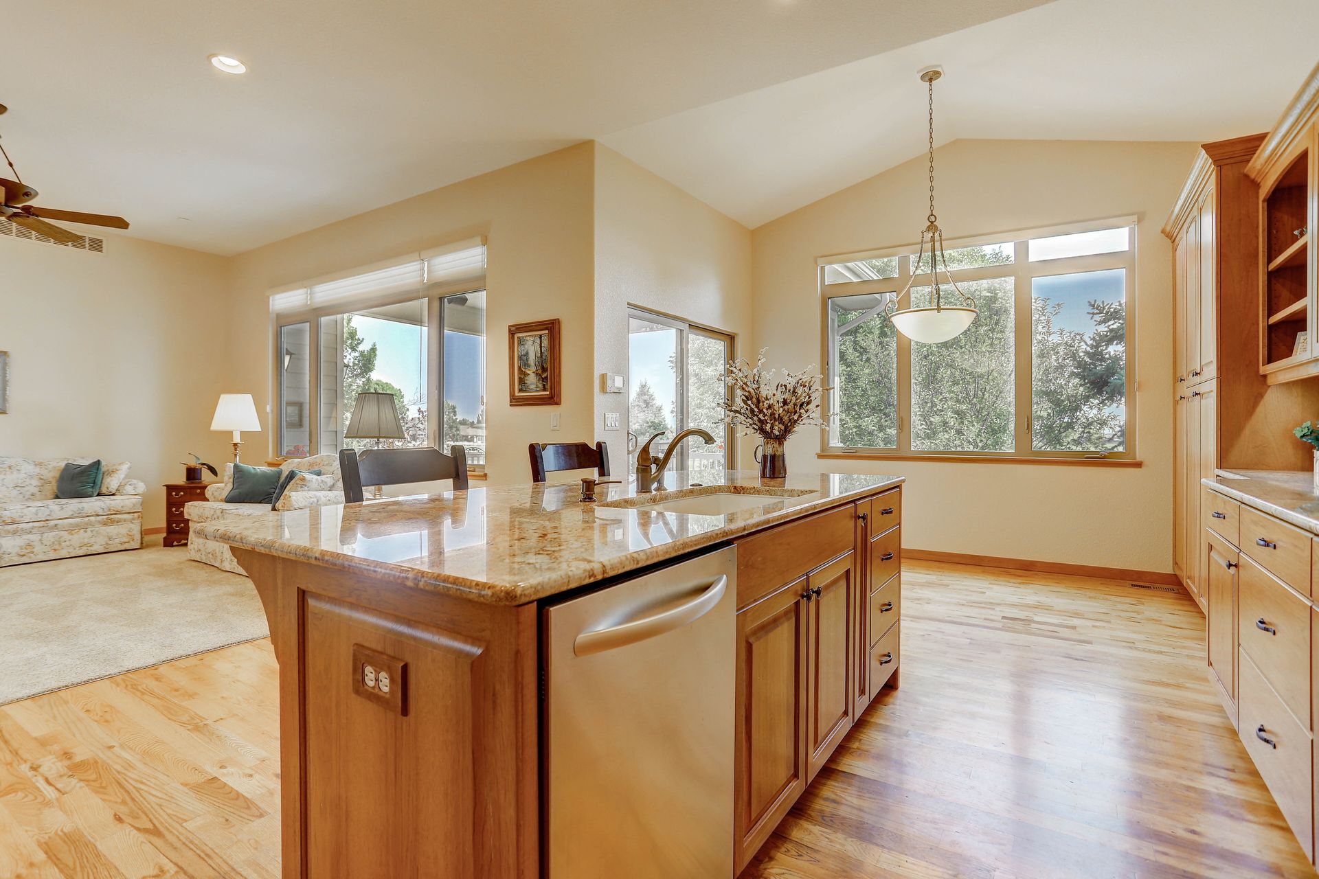 Welcoming ranch offers an open and flowing floor plan, abundant light, and peaceful views. Entertaining is easy in the updated kitchen with hickory cabinets and thoughtful storage. You'll find granite counters, SS appliances, an island, and a pleasant nook. Wood floors flow throughout most of the main level including the dining room, guest suite and office. Owner’s suite offers a spacious 5-piece bath, raised vanities, jetted tub, and walk-in closet. Notice the solar tubes that add an abundance of light! Main level guest suite includes a private full bath. The laundry room has a sink, cabinets, and large pantry/closet. Enjoy the finished daylight basement offers a family room with fireplace, bright rec room, two additional bedrooms, and bath. Still, there is plenty of storage space too! Relax and enjoy the covered 16’ x 17’ deck that leads to the 16’ x 14’ patio with a privacy wall and fireplace. It’s a peaceful setting overlooking private green belt and the golf course.