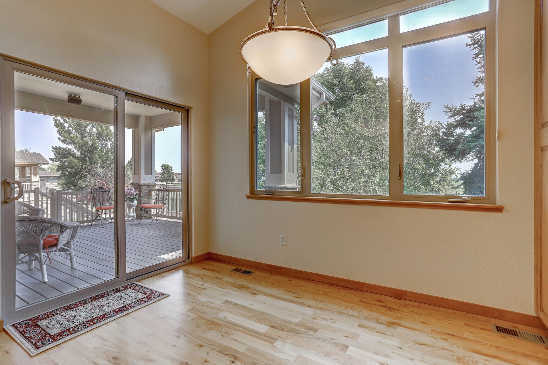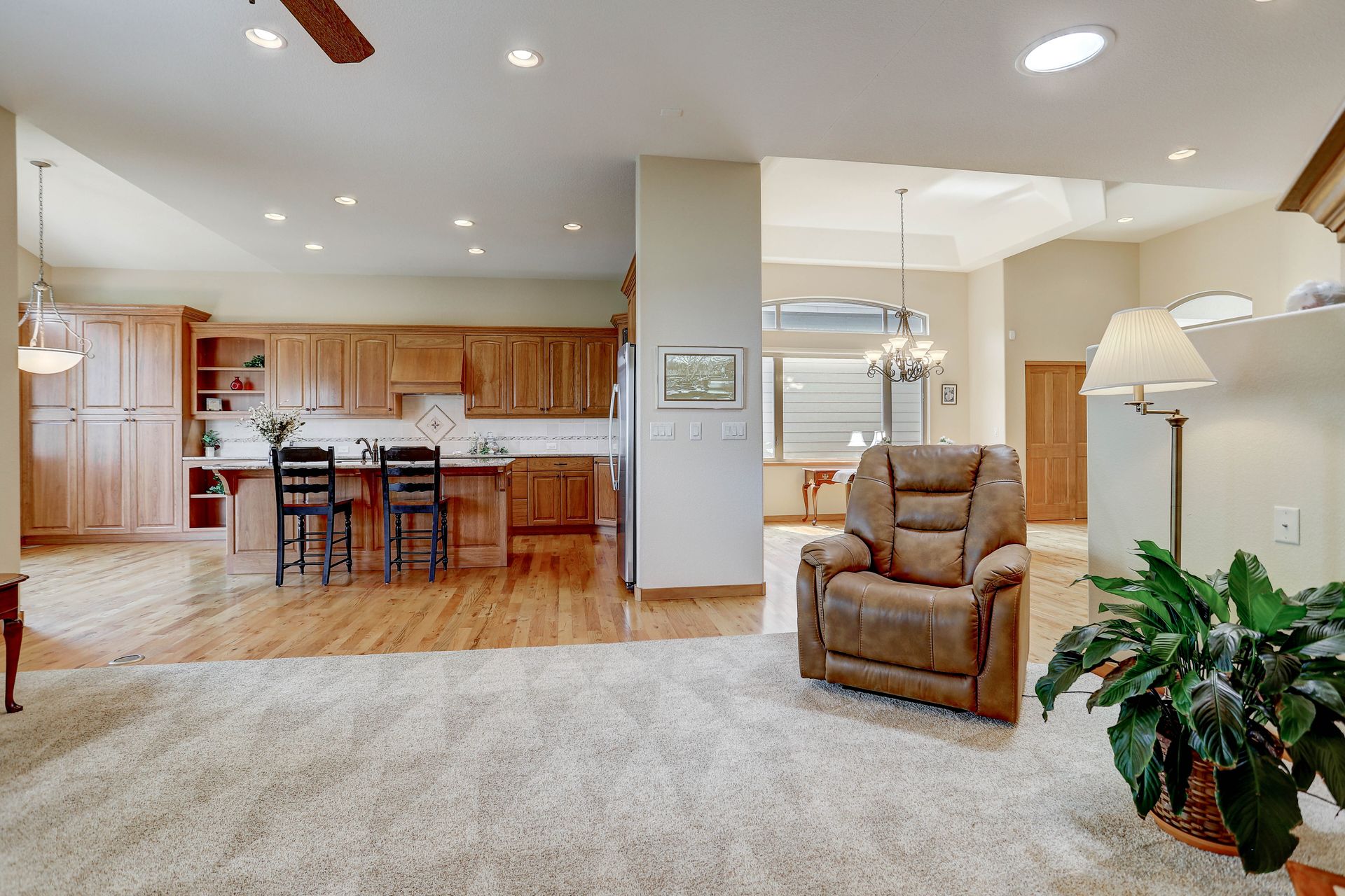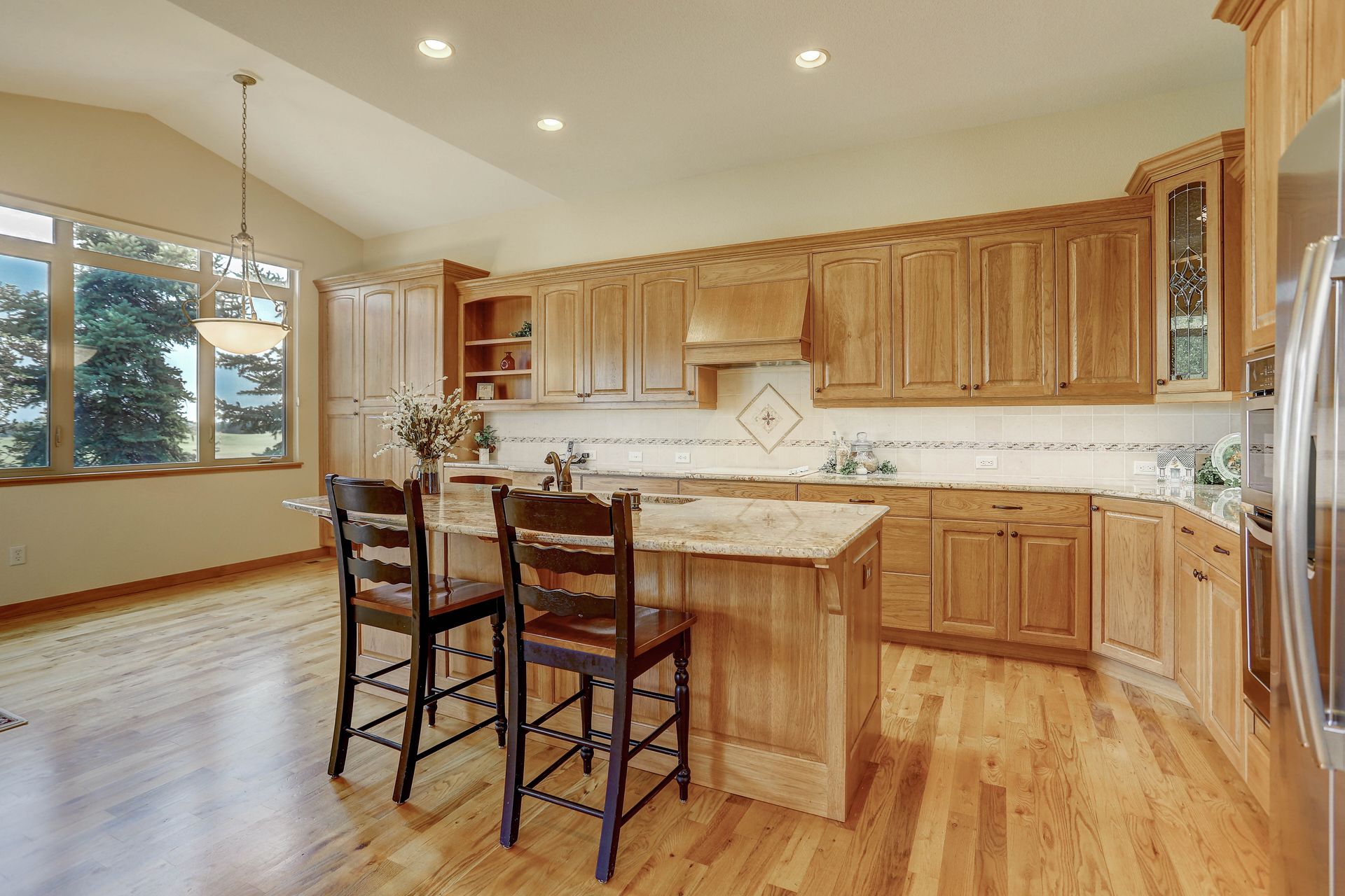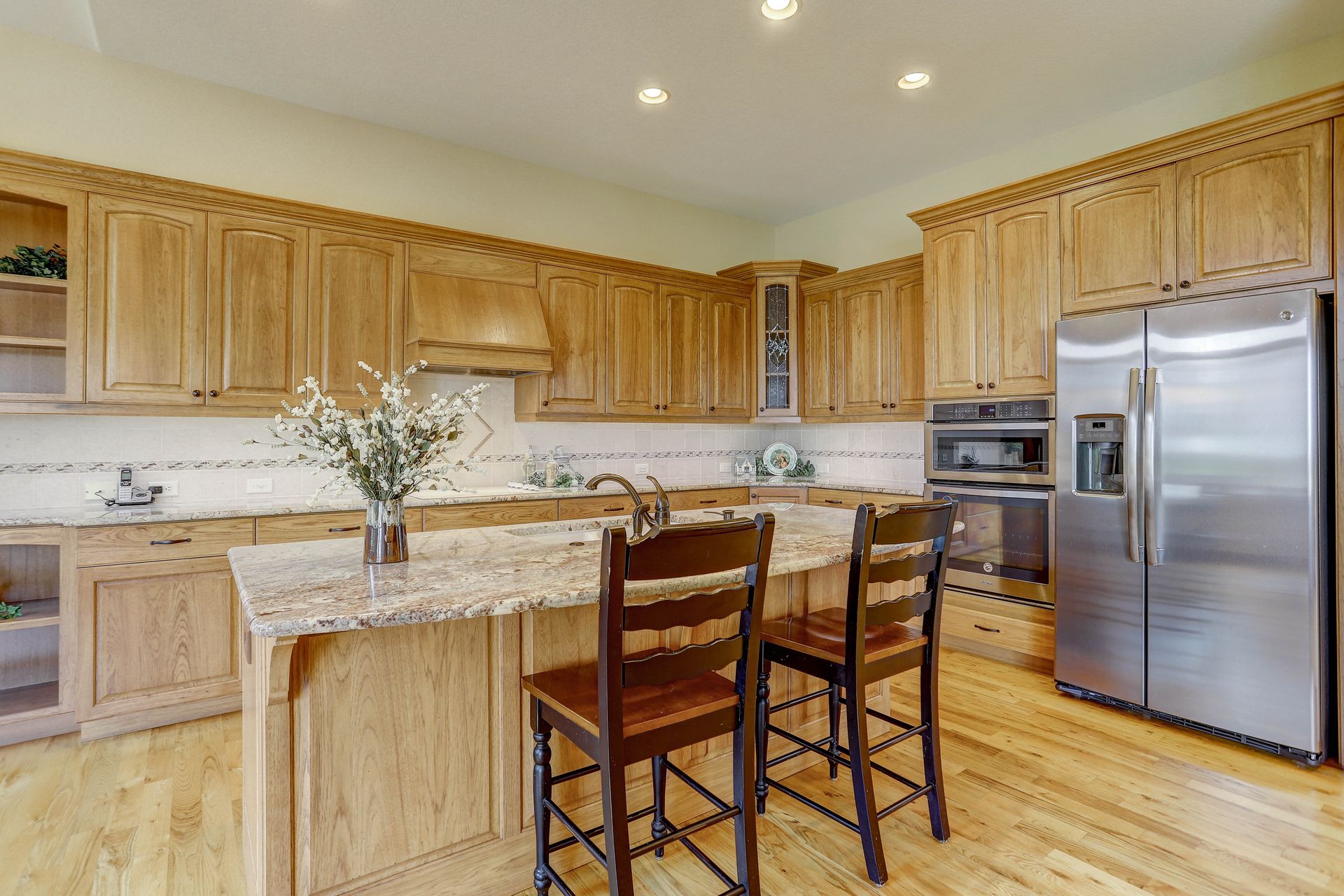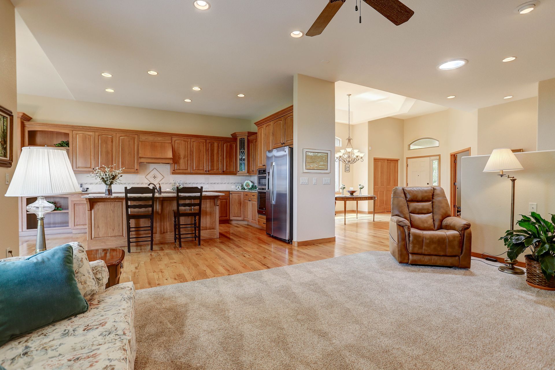 Welcoming ranch offers an open and flowing floor plan, abundant light, and peaceful views. Entertaining is easy in the updated kitchen with hickory cabinets and thoughtful storage. You'll find granite counters, SS appliances, an island, and a pleasant nook. Wood floors flow throughout most of the main level including the dining room, guest suite and office. Owner’s suite offers a spacious 5-piece bath, raised vanities, jetted tub, and walk-in closet. Notice the solar tubes that add an abundance of light! Main level guest suite includes a private full bath. The laundry room has a sink, cabinets, and large pantry/closet. Enjoy the finished daylight basement offers a family room with fireplace, bright rec room, two additional bedrooms, and bath. Still, there is plenty of storage space too! Relax and enjoy the covered 16’ x 17’ deck that leads to the 16’ x 14’ patio with a privacy wall and fireplace. It’s a peaceful setting overlooking private green belt and the golf course.