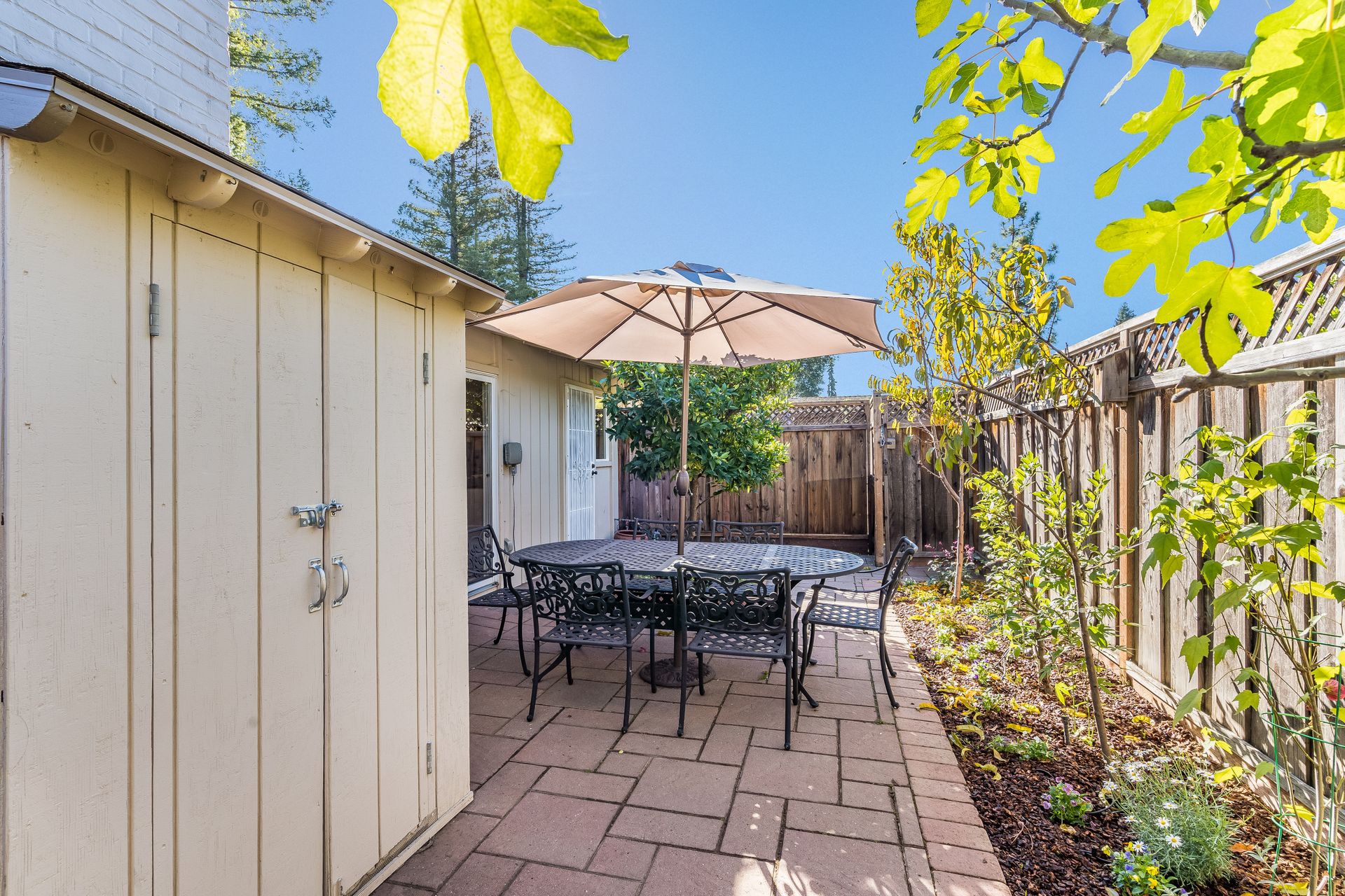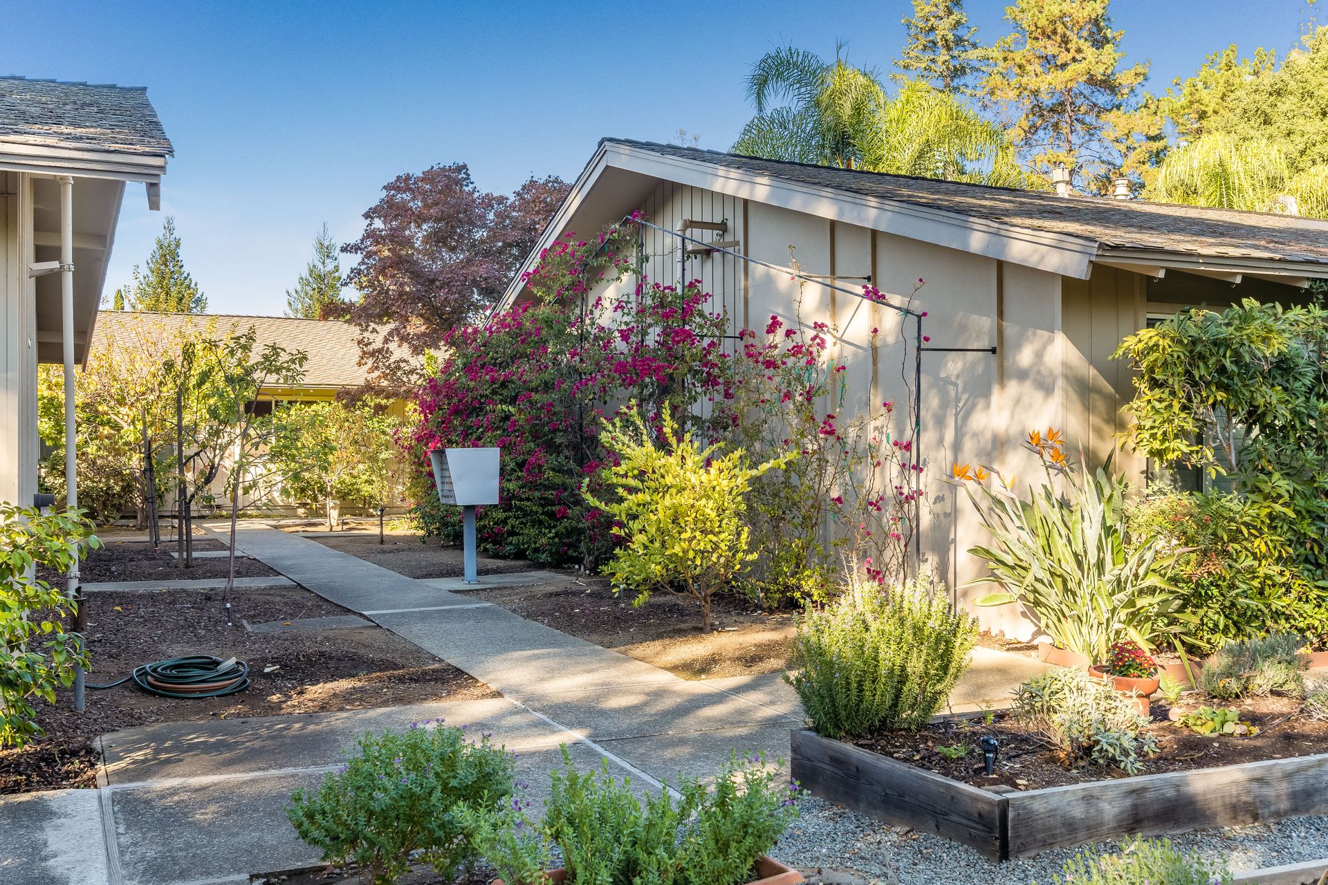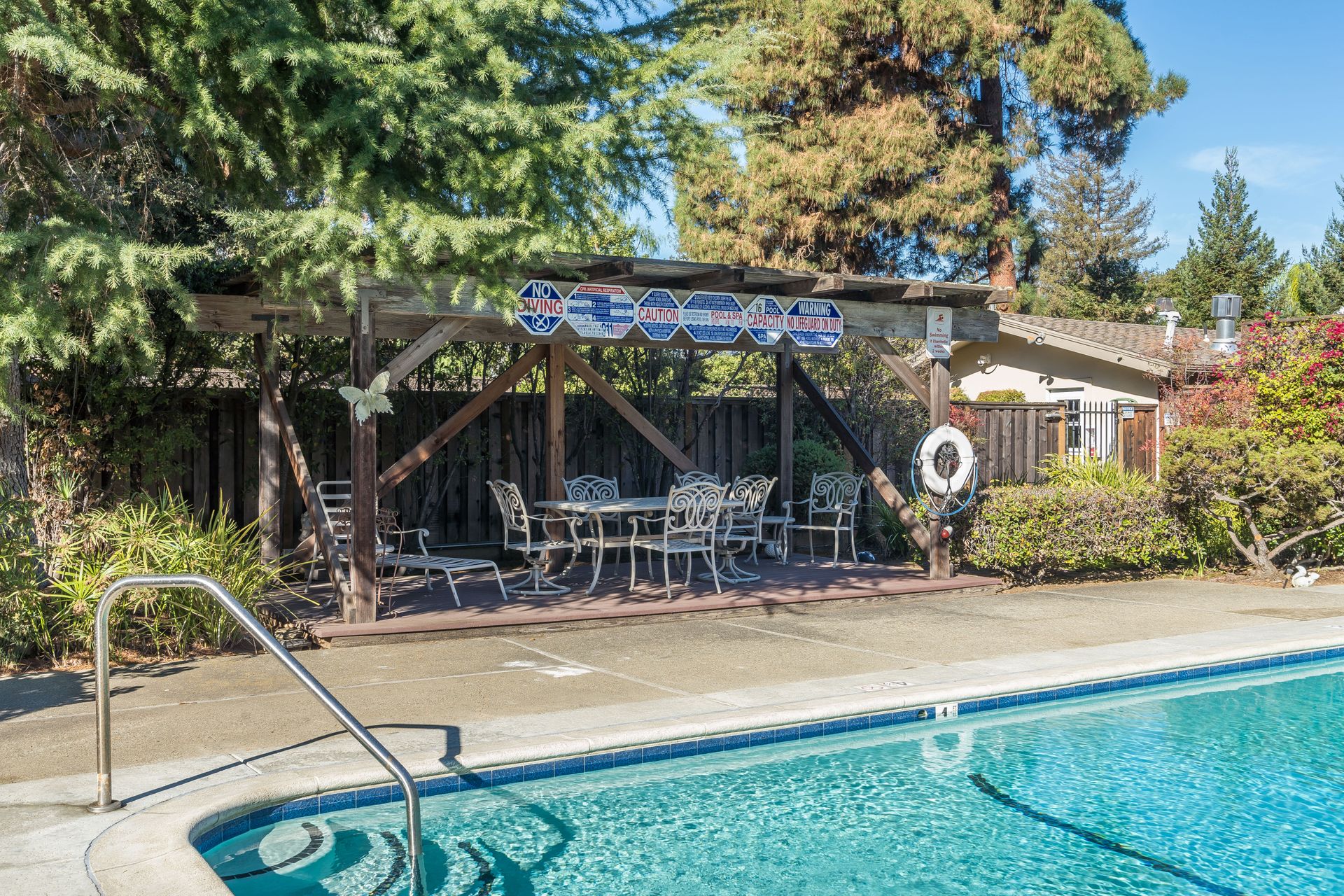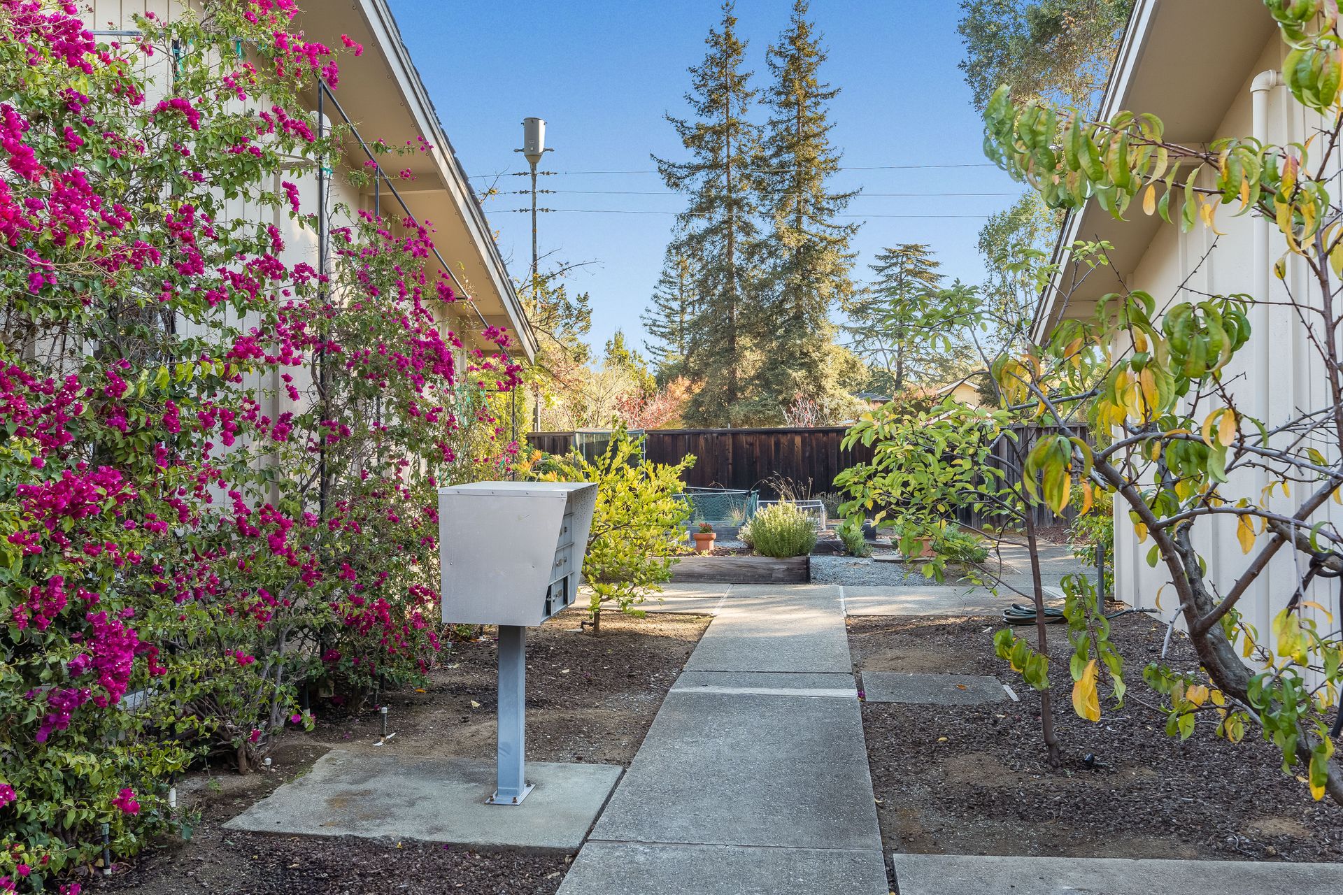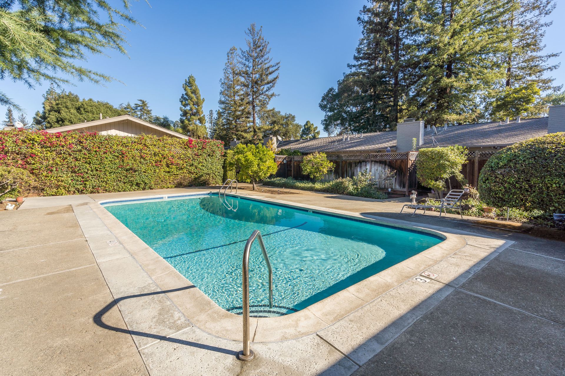This sparkling, one-story two bedroom, two bath condominium in the Mark Twain complex is convenient to shops and restaurants in downtown Los Altos as well as to San Antonio Center. The formal entry includes built-in shelves and cabinets and two entry closets. The kitchen has Corian counters with pass through to the dining area, tile floor, loads of storage and newly installed stainless steel appliances including a double oven, vent hood, refrigerator, dishwasher and induction range. The separate kitchen door opens to the patio. Enjoy the living-dining room combination with a sliding glass door opening to the spacious paver patio with a custom shed and mature fruit trees. Hardwood floors can be found throughout the livable areas and the bedrooms. The master bedroom includes a newer stall shower, toilet and a luxury vinyl tile floor. The hall bath has a pedestal sink, tub and newer medicine cabinet. There is a laundry area in the master suite with newer flooring as well. The complex includes a swimming pool, community garden, carport and open parking.