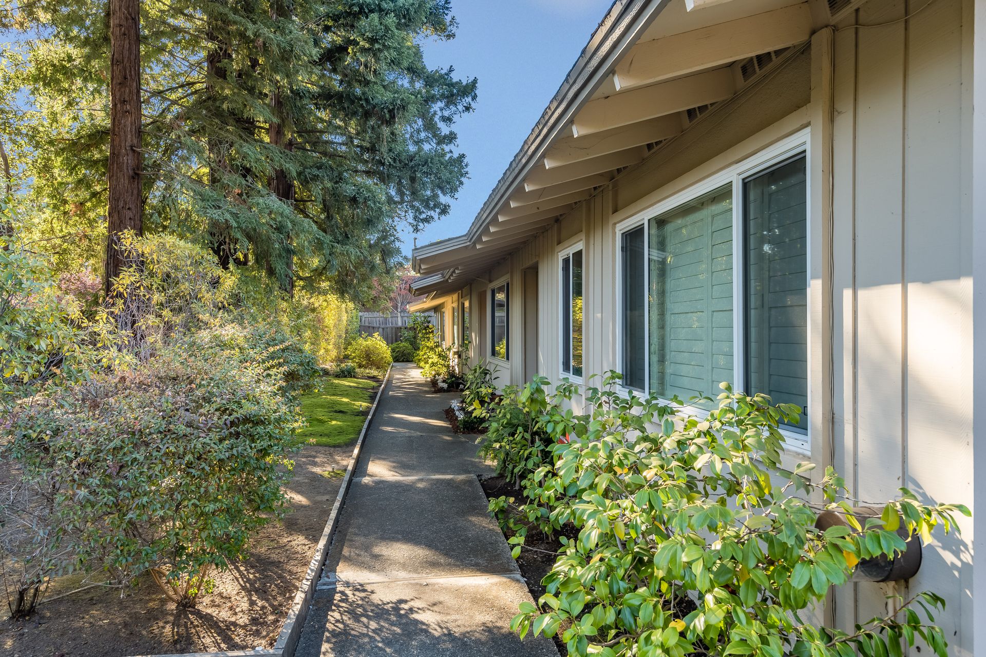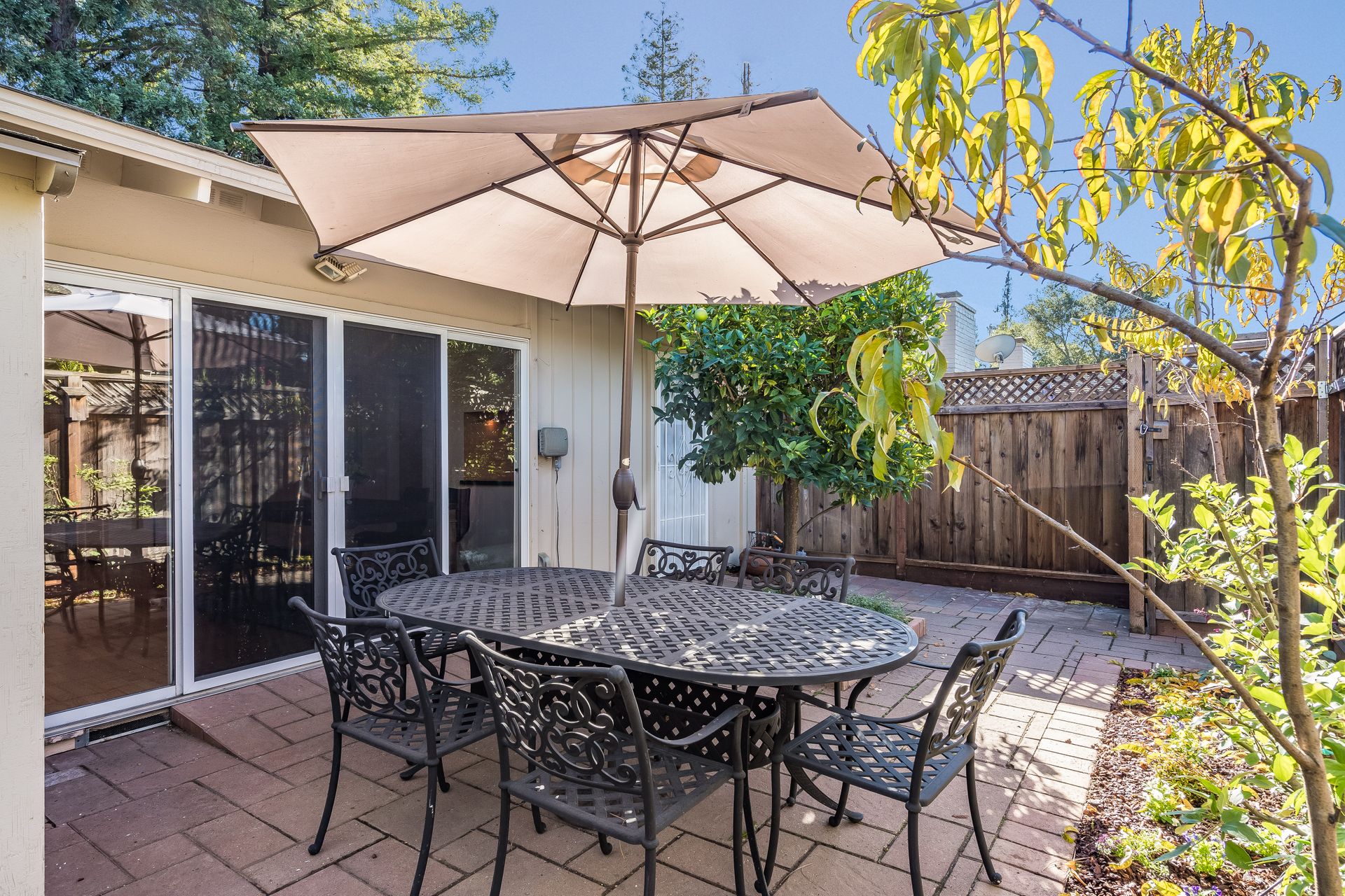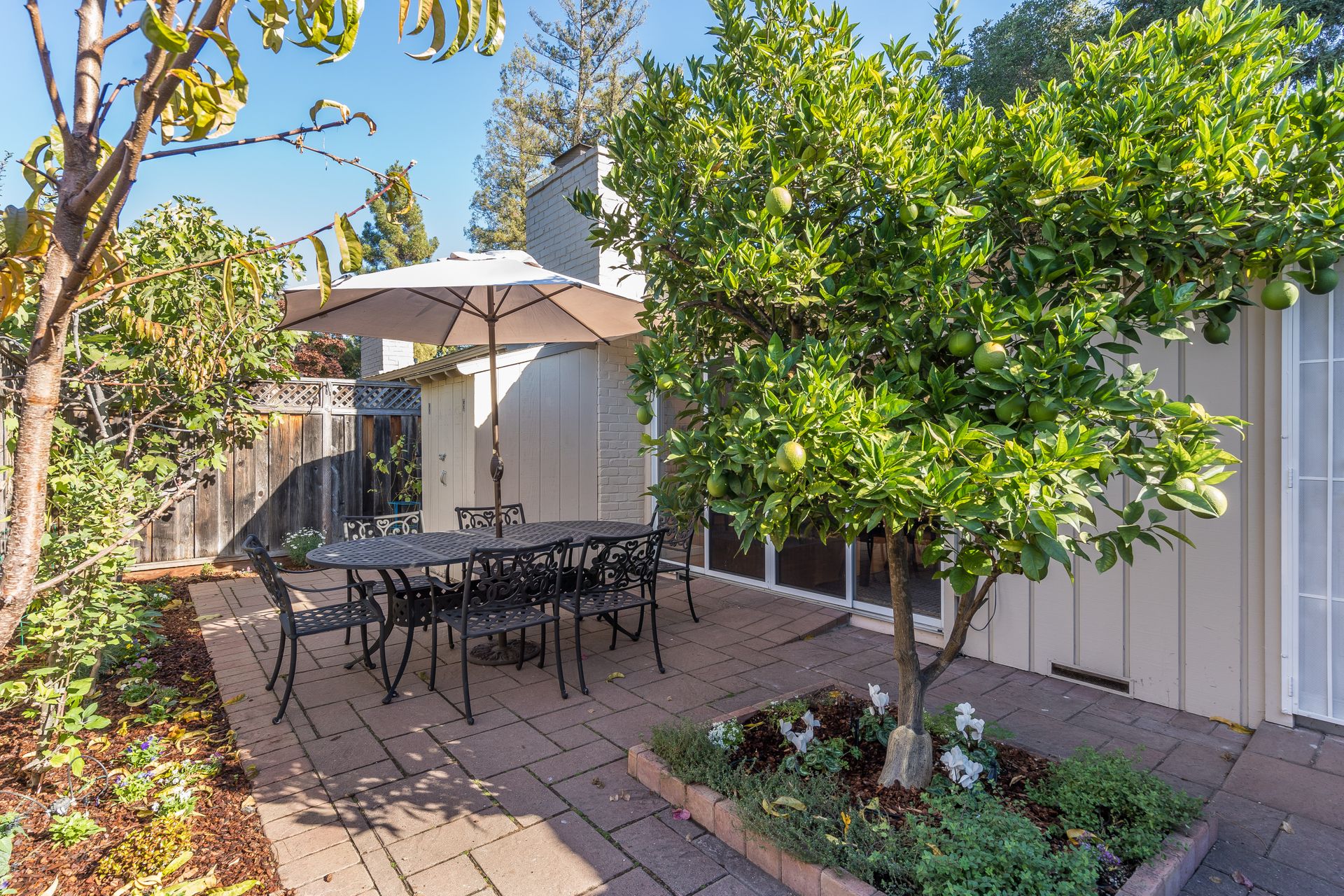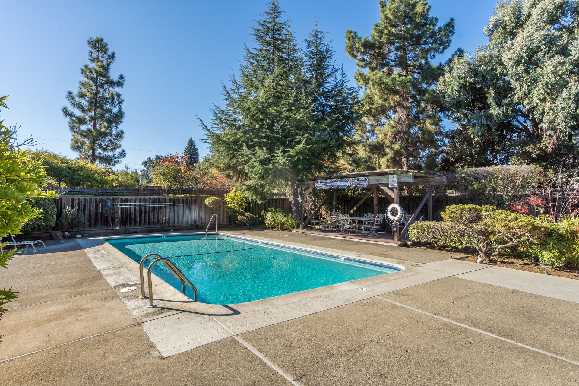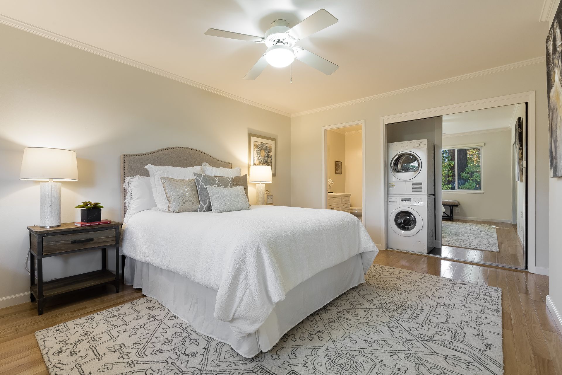 This sparkling, one-story two bedroom, two bath condominium in the Mark Twain complex is convenient to shops and restaurants in downtown Los Altos as well as to San Antonio Center. The formal entry includes built-in shelves and cabinets and two entry closets. The kitchen has Corian counters with pass through to the dining area, tile floor, loads of storage and newly installed stainless steel appliances including a double oven, vent hood, refrigerator, dishwasher and induction range. The separate kitchen door opens to the patio. Enjoy the living-dining room combination with a sliding glass door opening to the spacious paver patio with a custom shed and mature fruit trees. Hardwood floors can be found throughout the livable areas and the bedrooms. The master bedroom includes a newer stall shower, toilet and a luxury vinyl tile floor. The hall bath has a pedestal sink, tub and newer medicine cabinet. There is a laundry area in the master suite with newer flooring as well. The complex includes a swimming pool, community garden, carport and open parking.